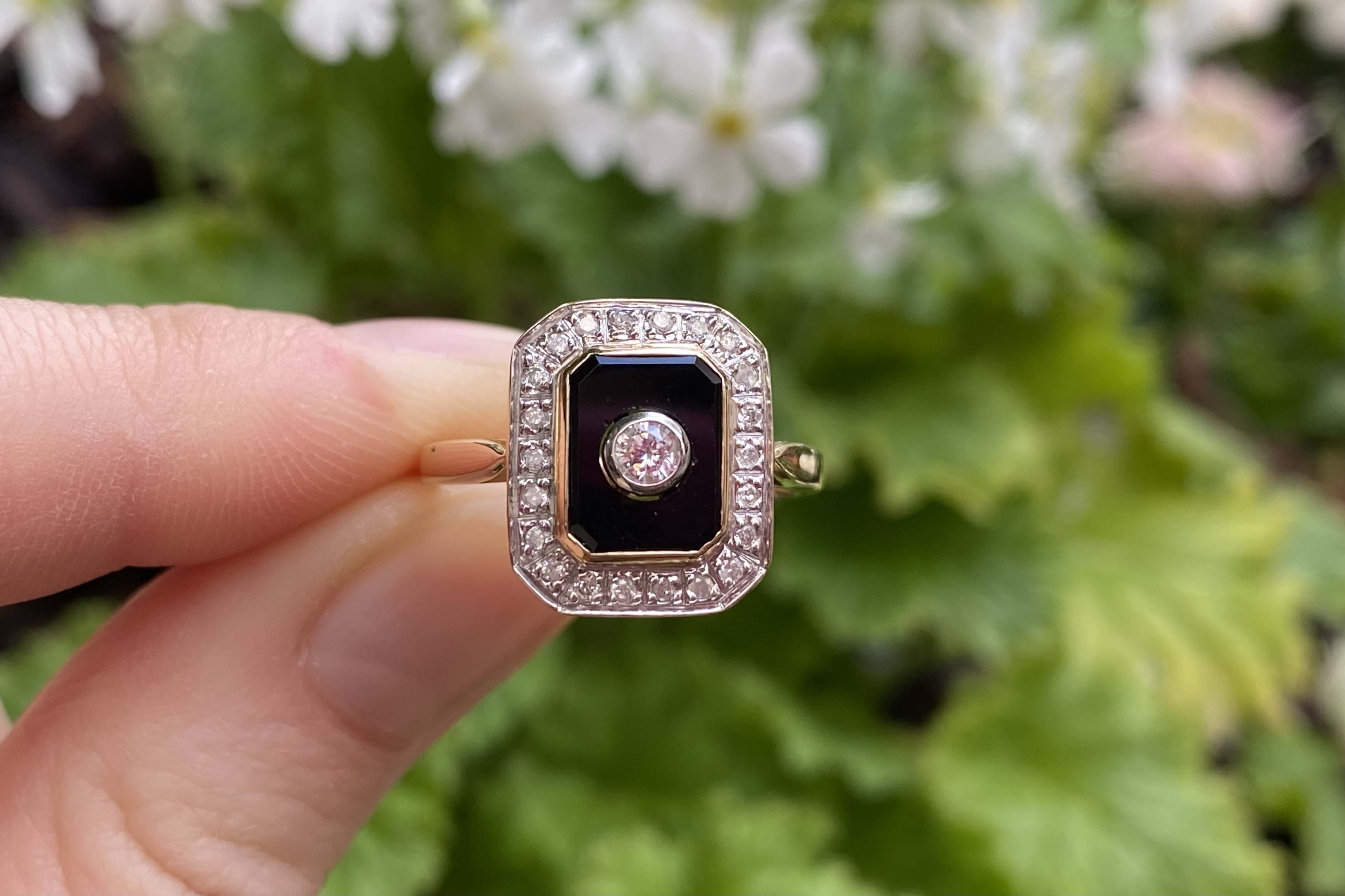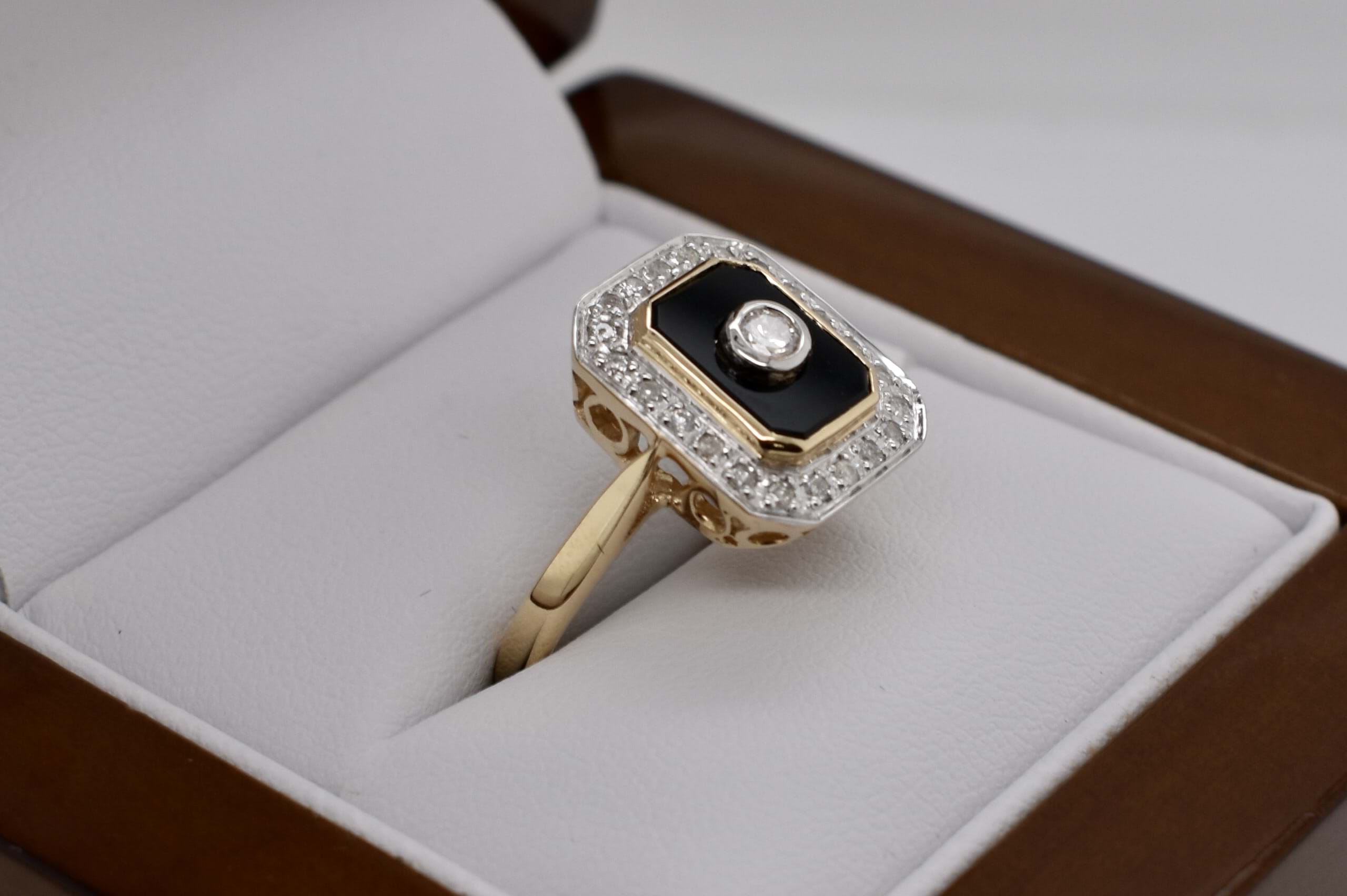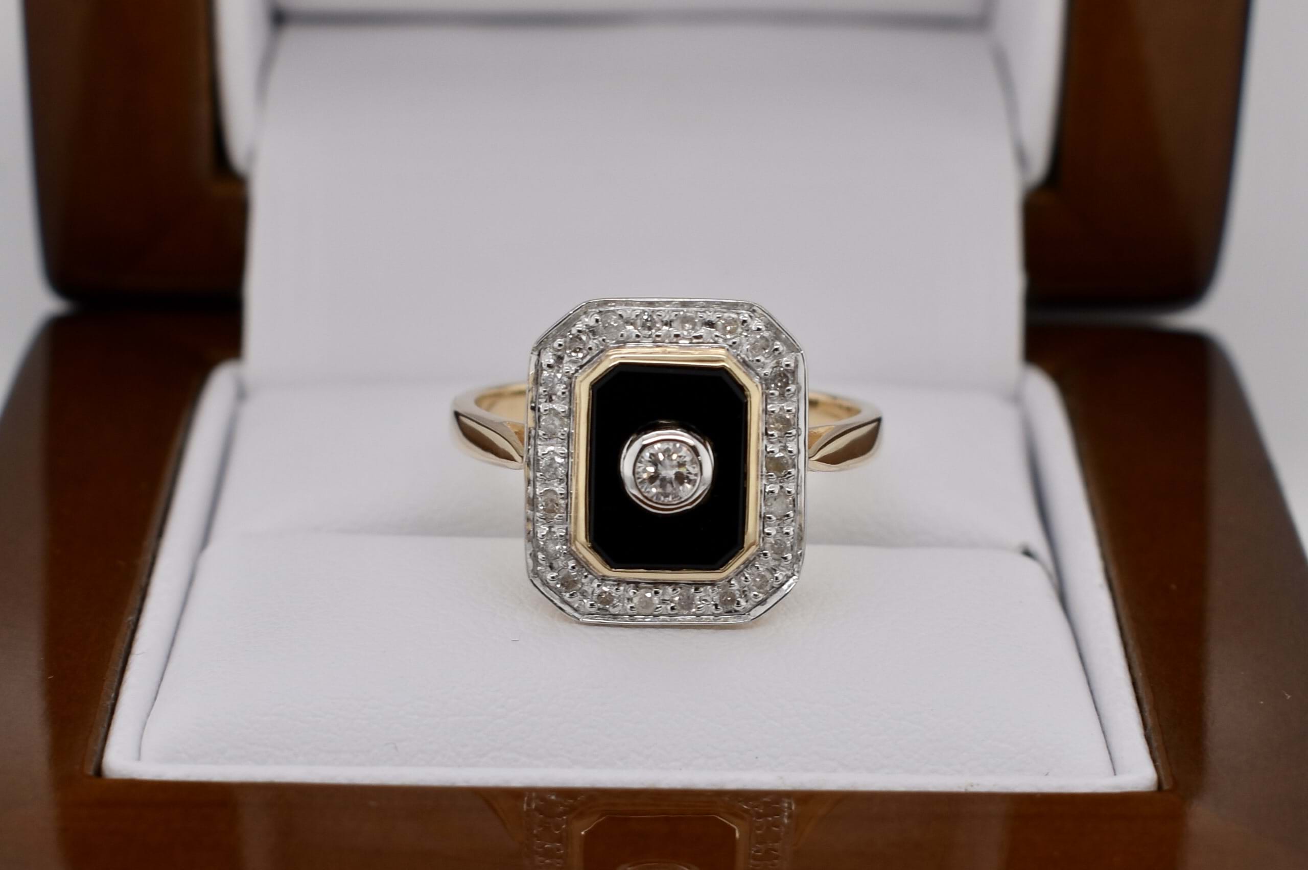 Beautiful emerald cut onyx ring, crafted in 9ct yellow gold, featuring one centre 2.60mm round brilliant cut diamond, equalling 0.07ct G/SI. This ring also includes another 0.13ct (GH/P1) of 22 round brilliant cut 1.10mm diamonds as a border surrounding the onyx, these are grain set. Completed with a plain gold band. Finger size N. Independent Valuation Supplied