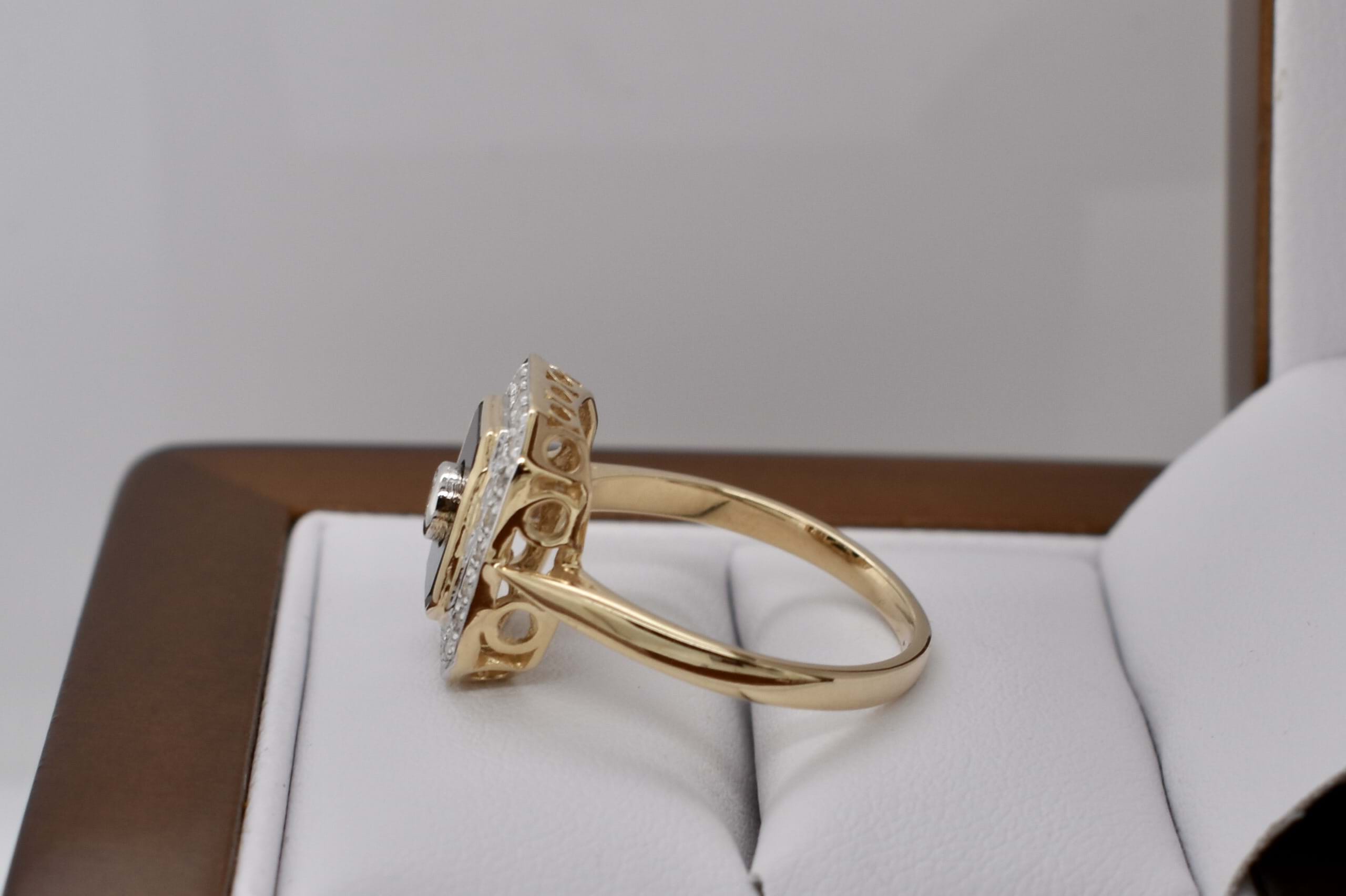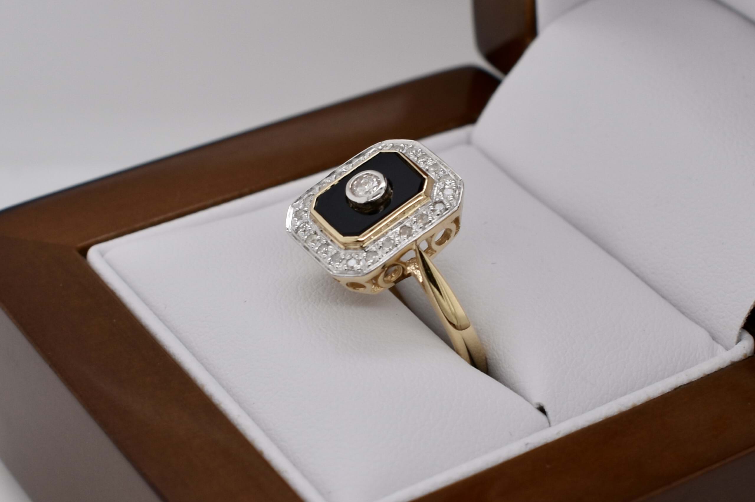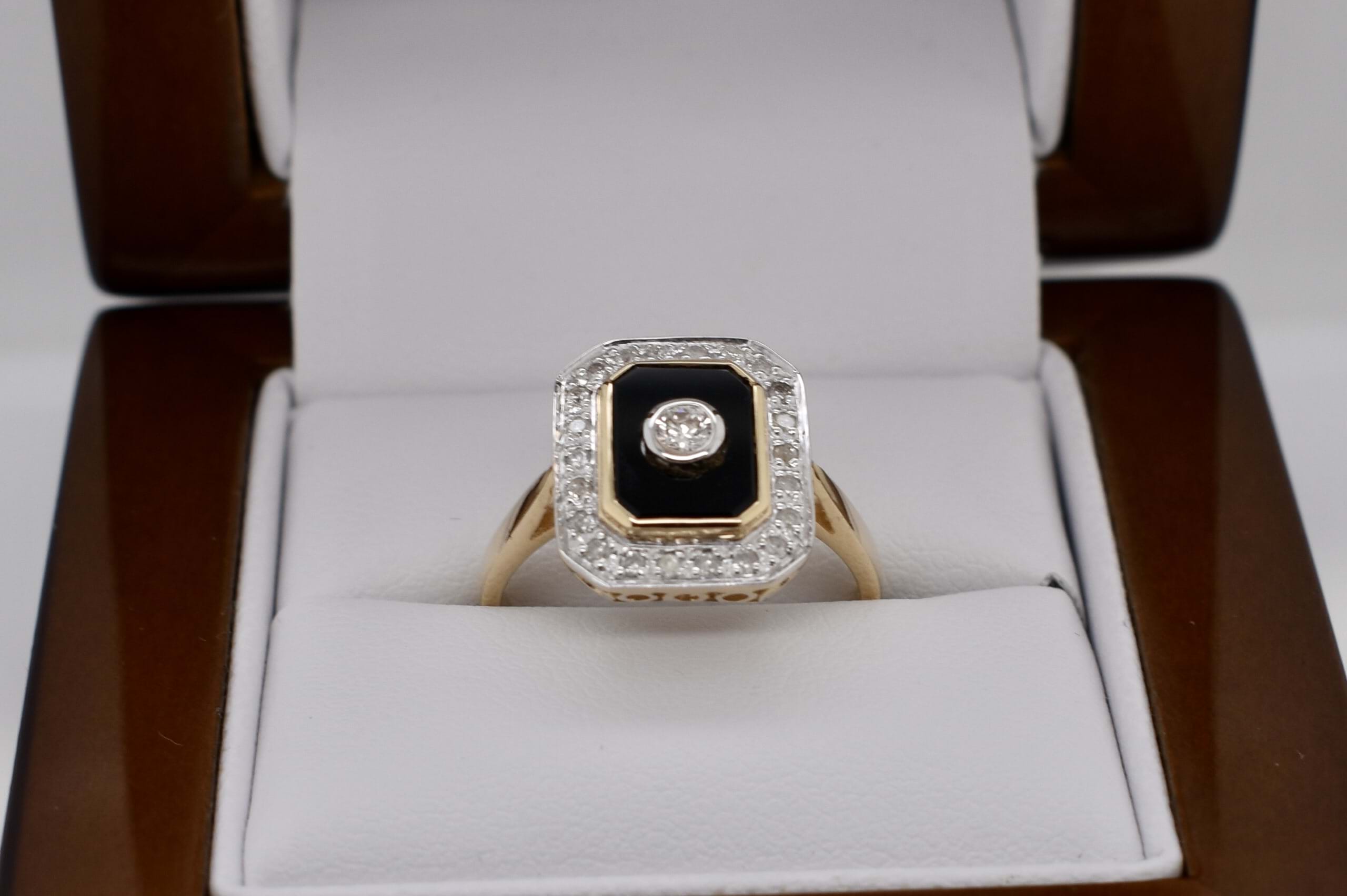 Beautiful emerald cut onyx ring, crafted in 9ct yellow gold, featuring one centre 2.60mm round brilliant cut diamond, equalling 0.07ct G/SI. This ring also includes another 0.13ct (GH/P1) of 22 round brilliant cut 1.10mm diamonds as a border surrounding the onyx, these are grain set. Completed with a plain gold band. Finger size N. Independent Valuation Supplied