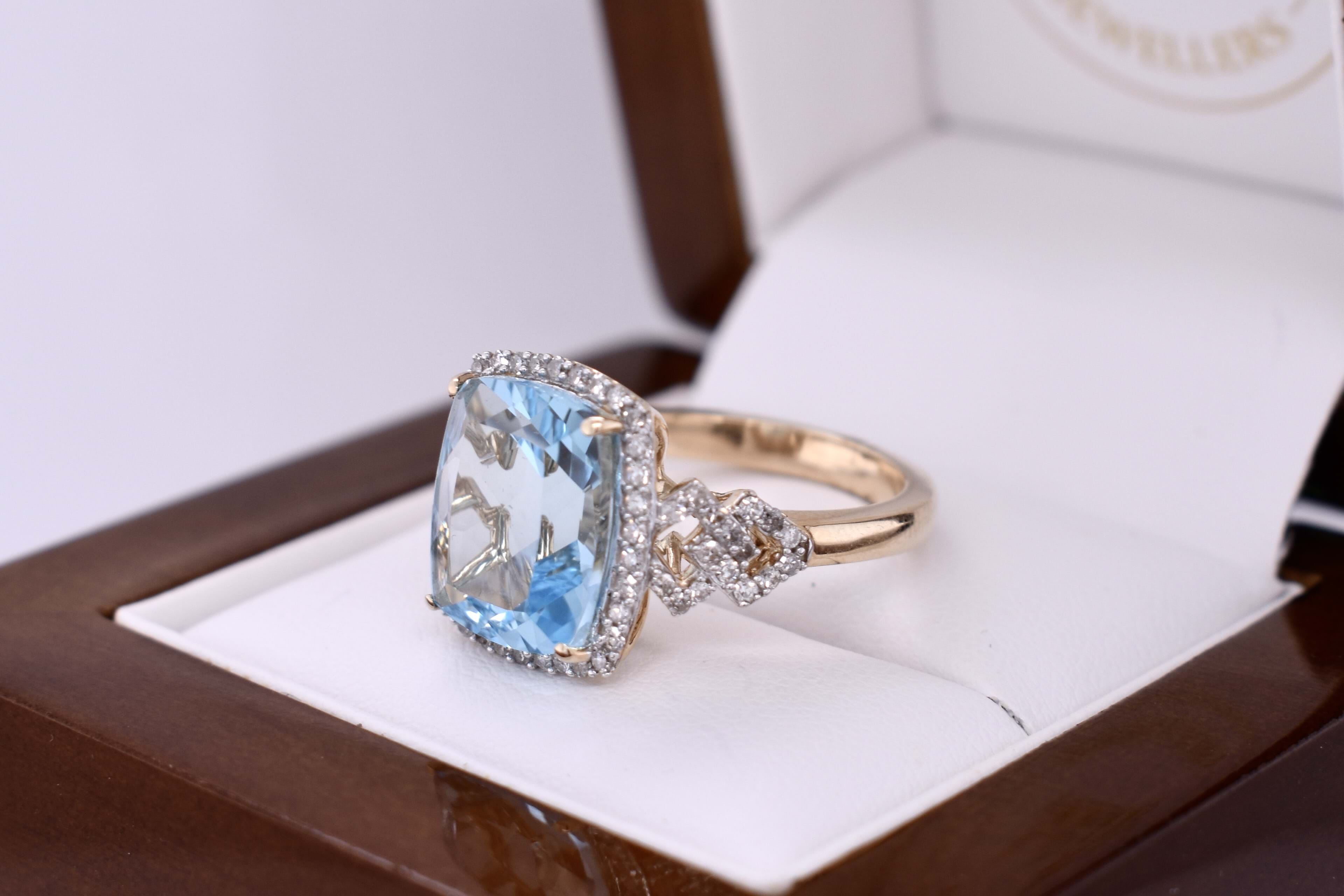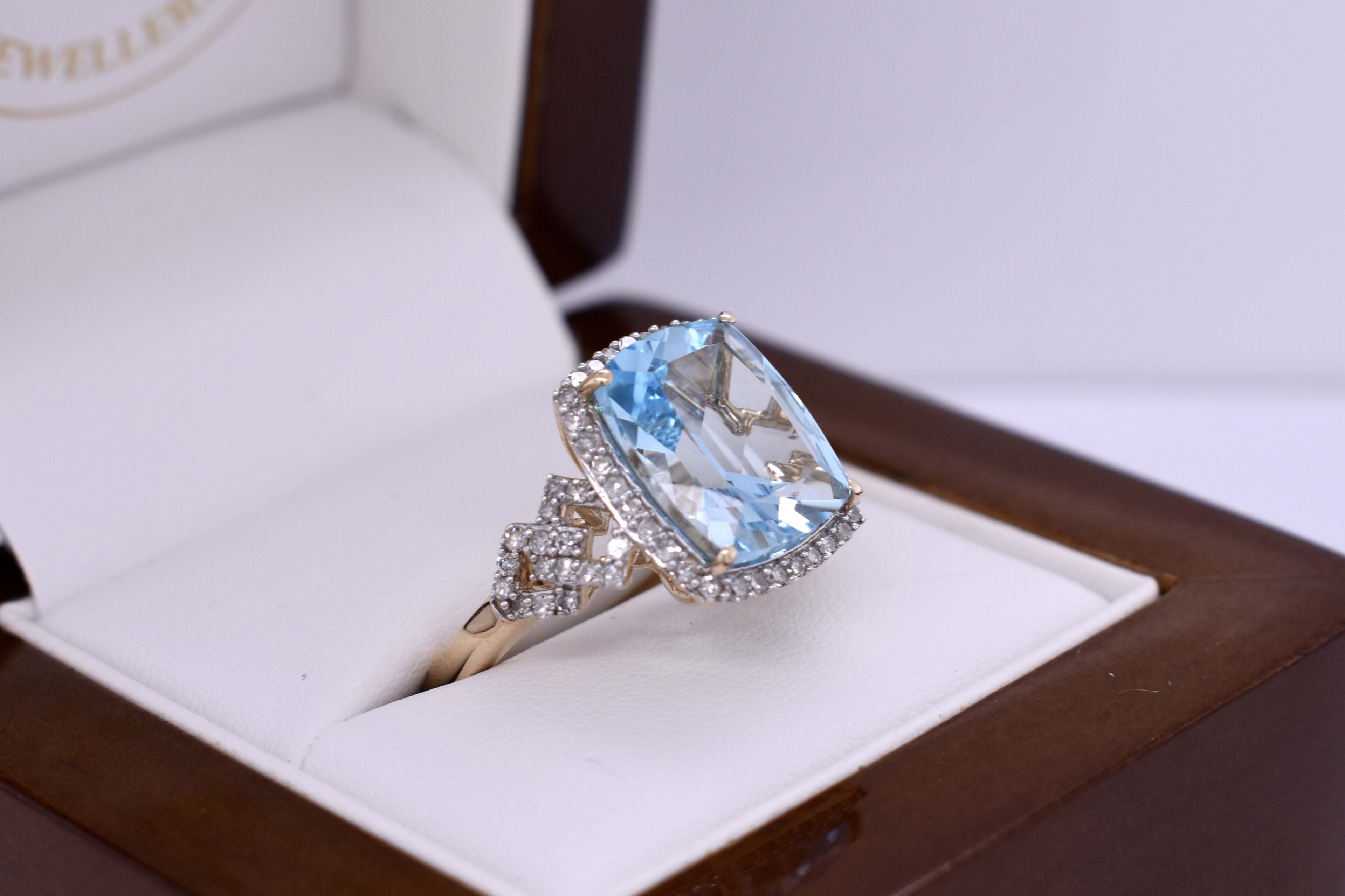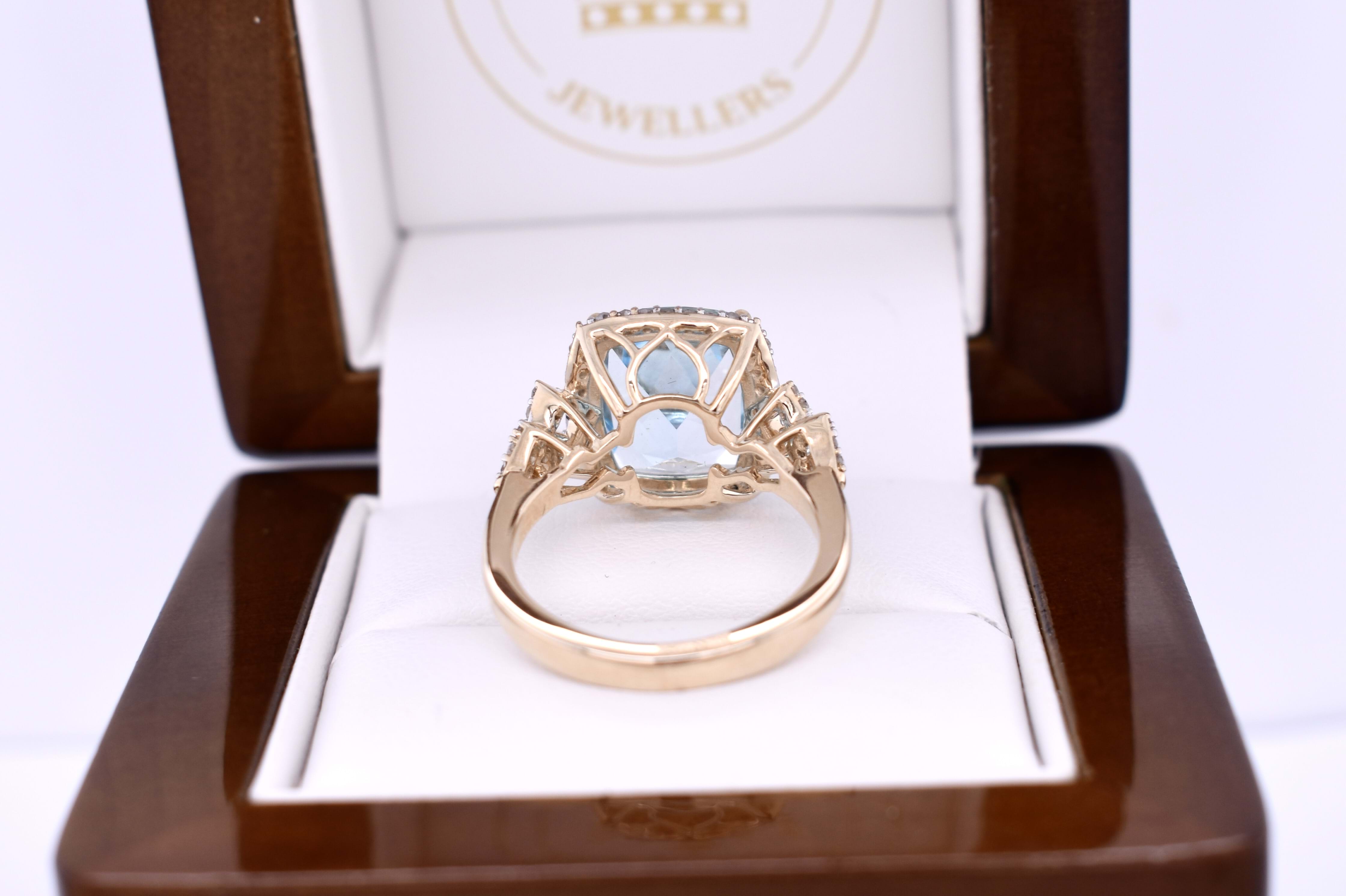 This stunning ring features a dazzling 6.20ct cushion cut sky blue topaz, measuring approx. 12x10mm, four claw set into 9ct yellow gold. The stone is framed by a white gold claw set delicate diamond halo and complimented by geometric diamond set shoulders. Total diamond weight 0.42ct GH SI. Finger size M. Complete the matching set with 20394424 and 20394431.