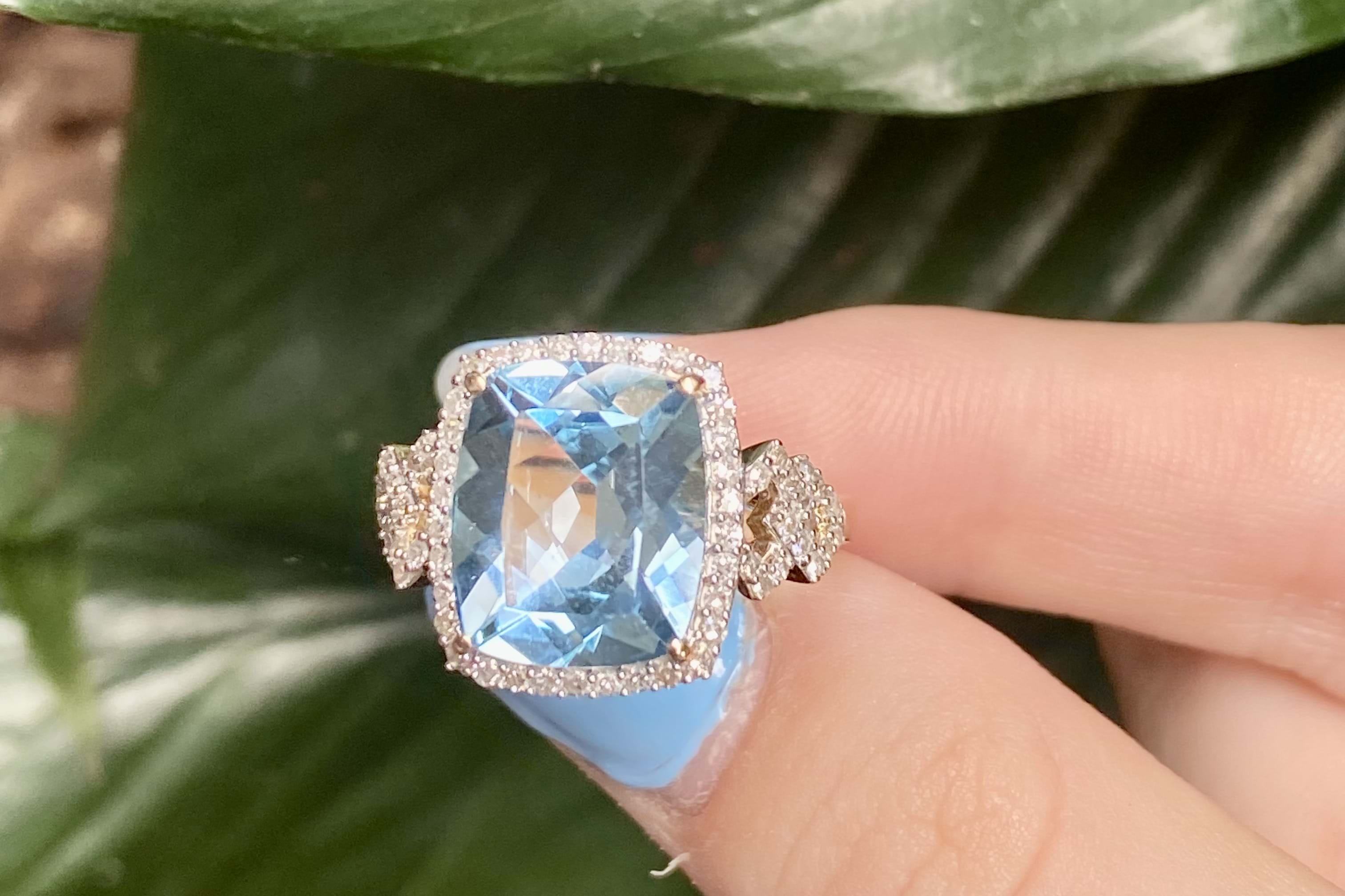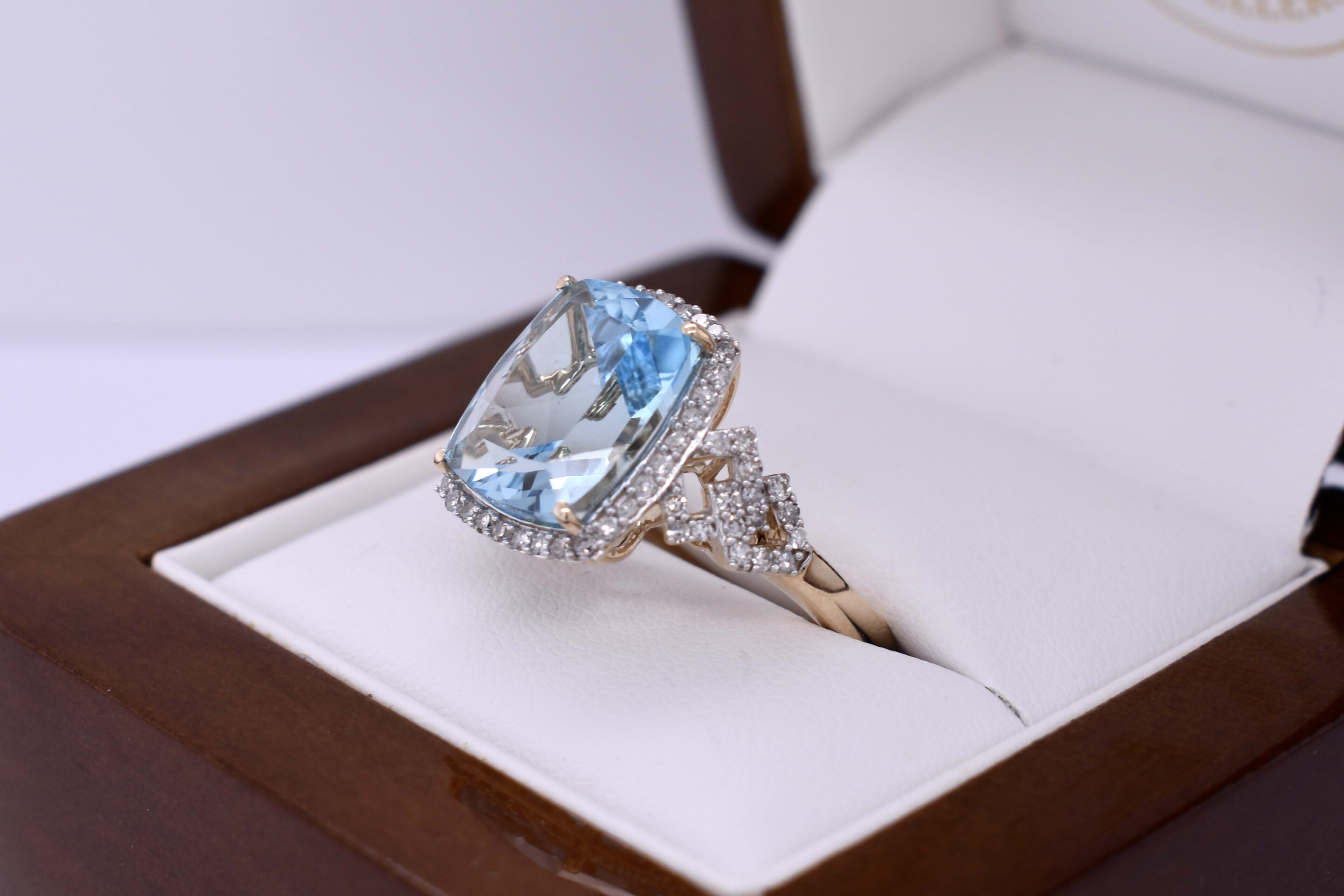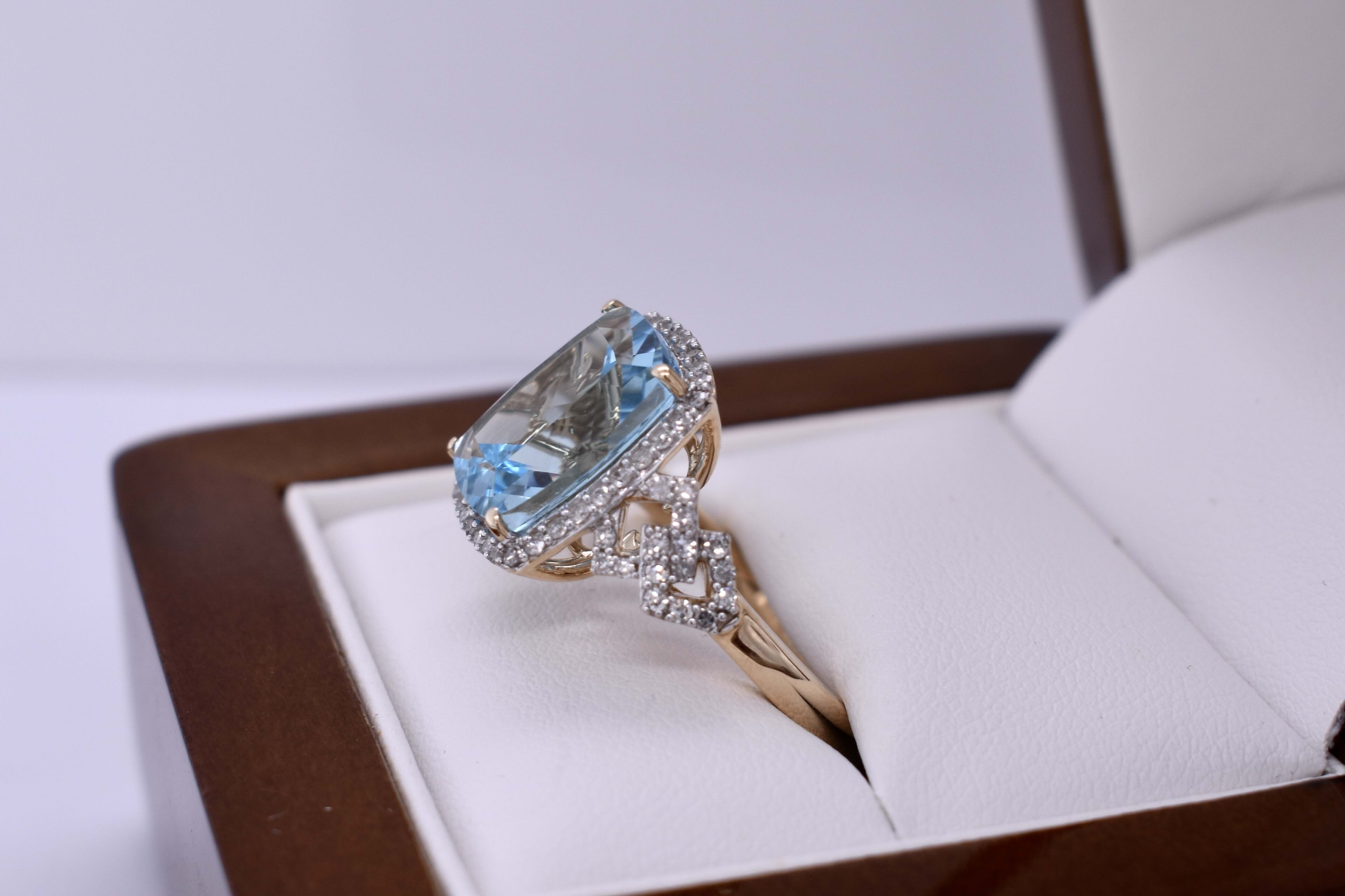 This stunning ring features a dazzling 6.20ct cushion cut sky blue topaz, measuring approx. 12x10mm, four claw set into 9ct yellow gold. The stone is framed by a white gold claw set delicate diamond halo and complimented by geometric diamond set shoulders. Total diamond weight 0.42ct GH SI. Finger size M. Complete the matching set with 20394424 and 20394431.