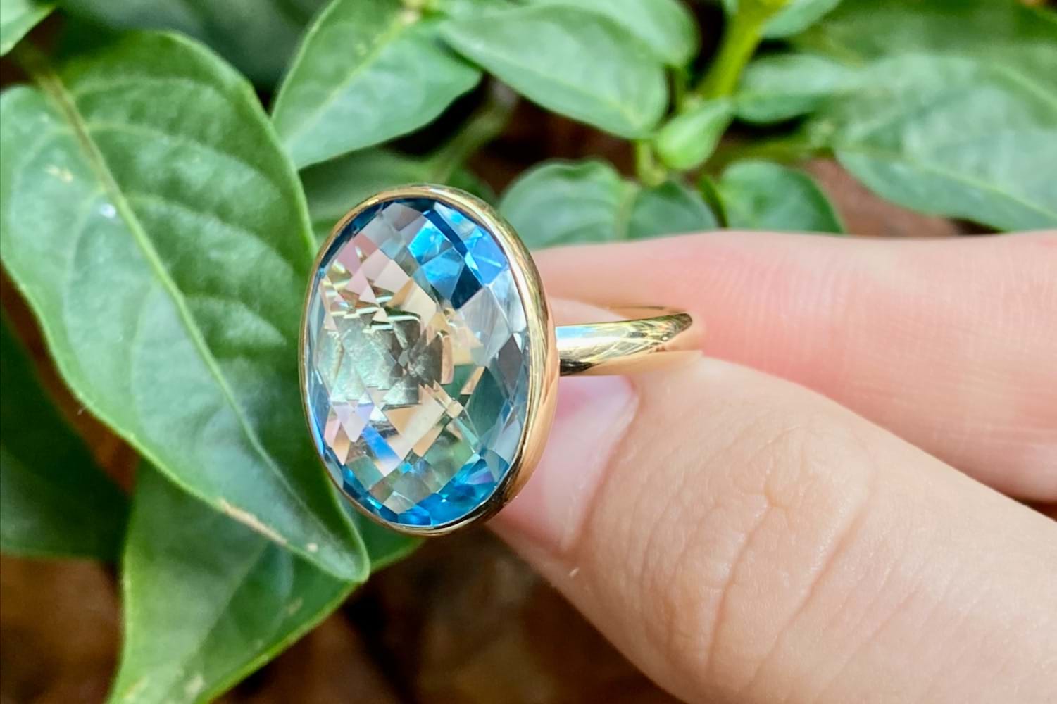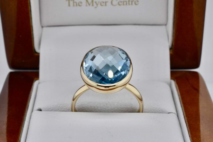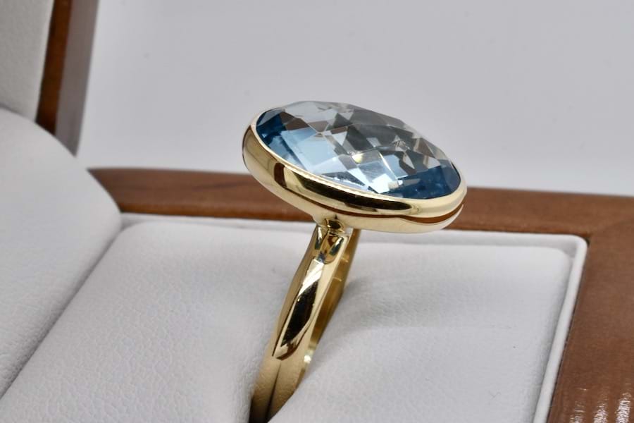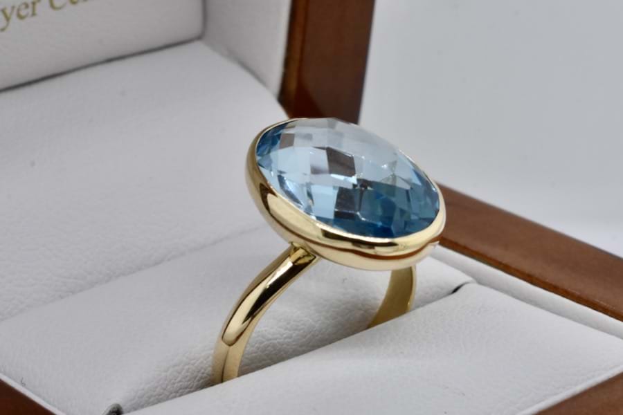 This lovely handmade 9ct yellow gold ring is set with a beautiful oval shape 10ct sky blue topaz with chequerboard faceting which sparkles in the light, in a fine bezel setting with plain band. Finger size O.Independent Valuation Supplied