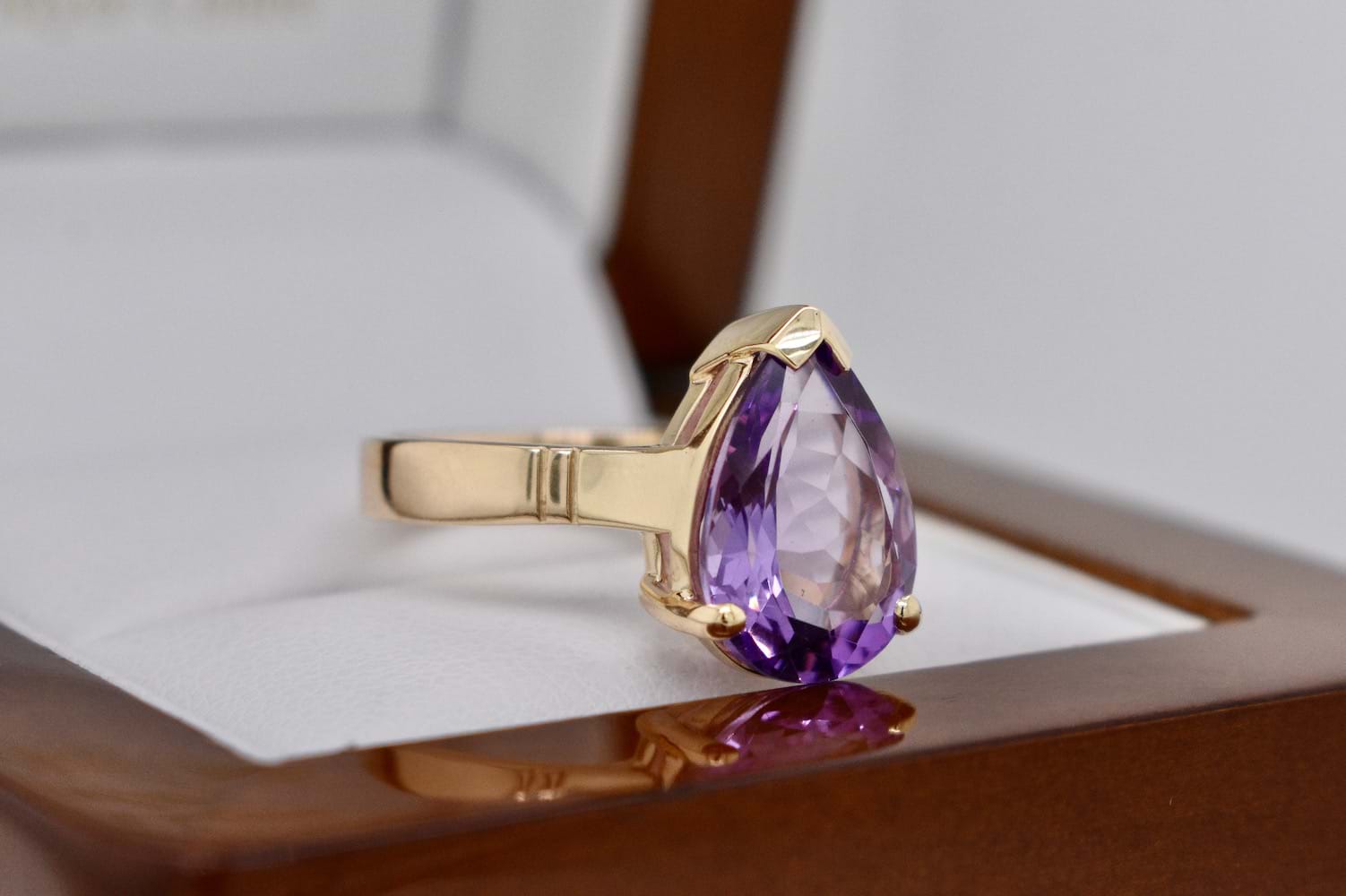 This sweet handmade 9ct yellow gold ring features an elegant 3.15ct pearshape amethyst measuring approximately 13 x 9mm, set in a v cap and two claws with a plain flat band. Finger size N. Independent Valuation Supplied