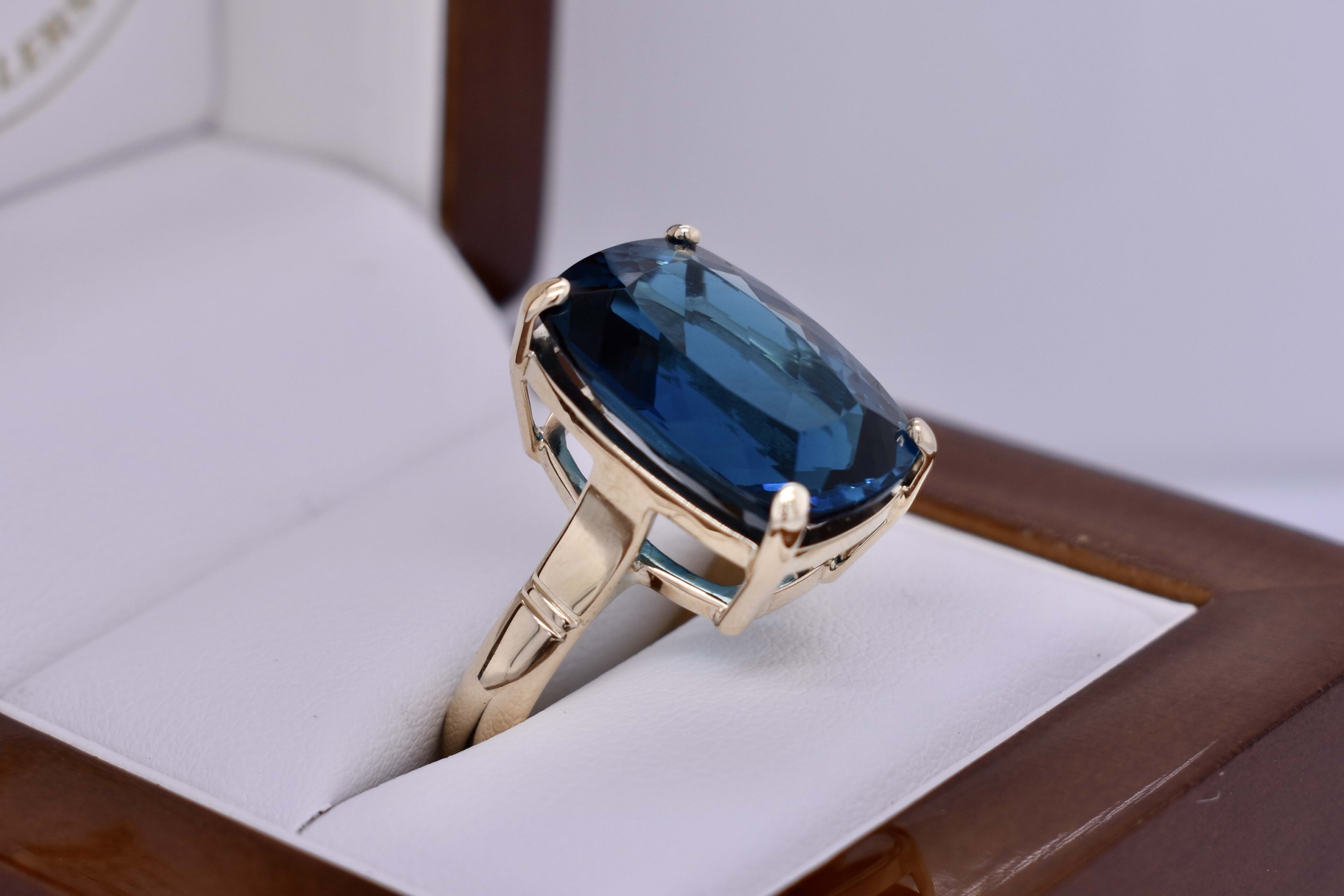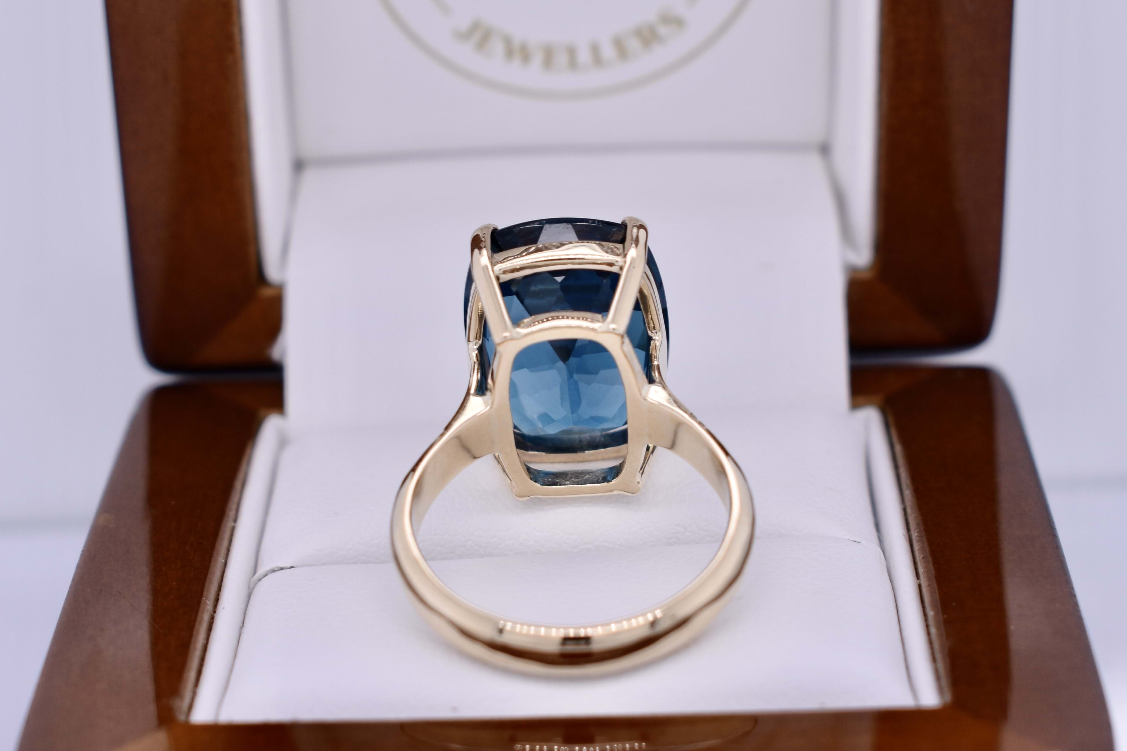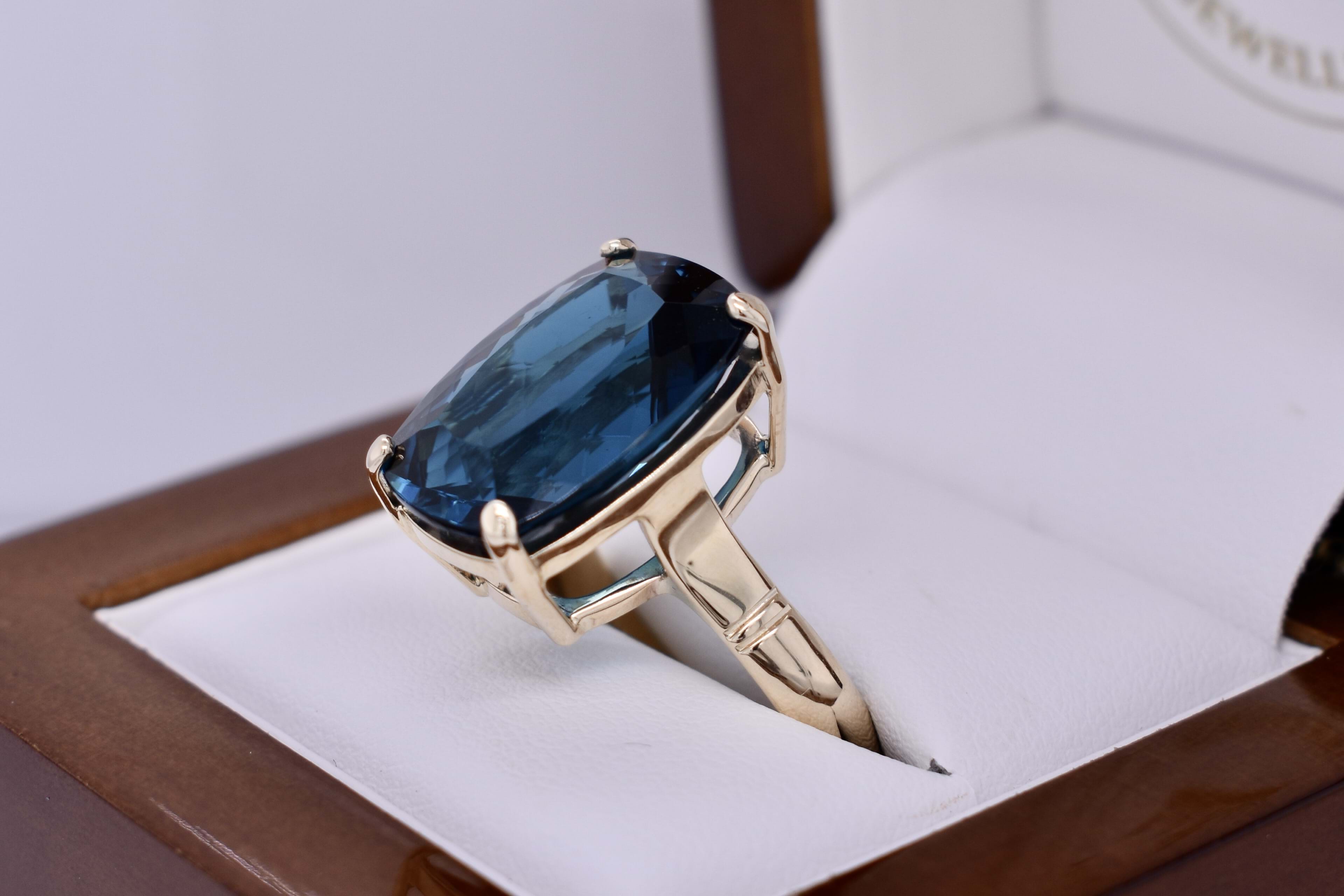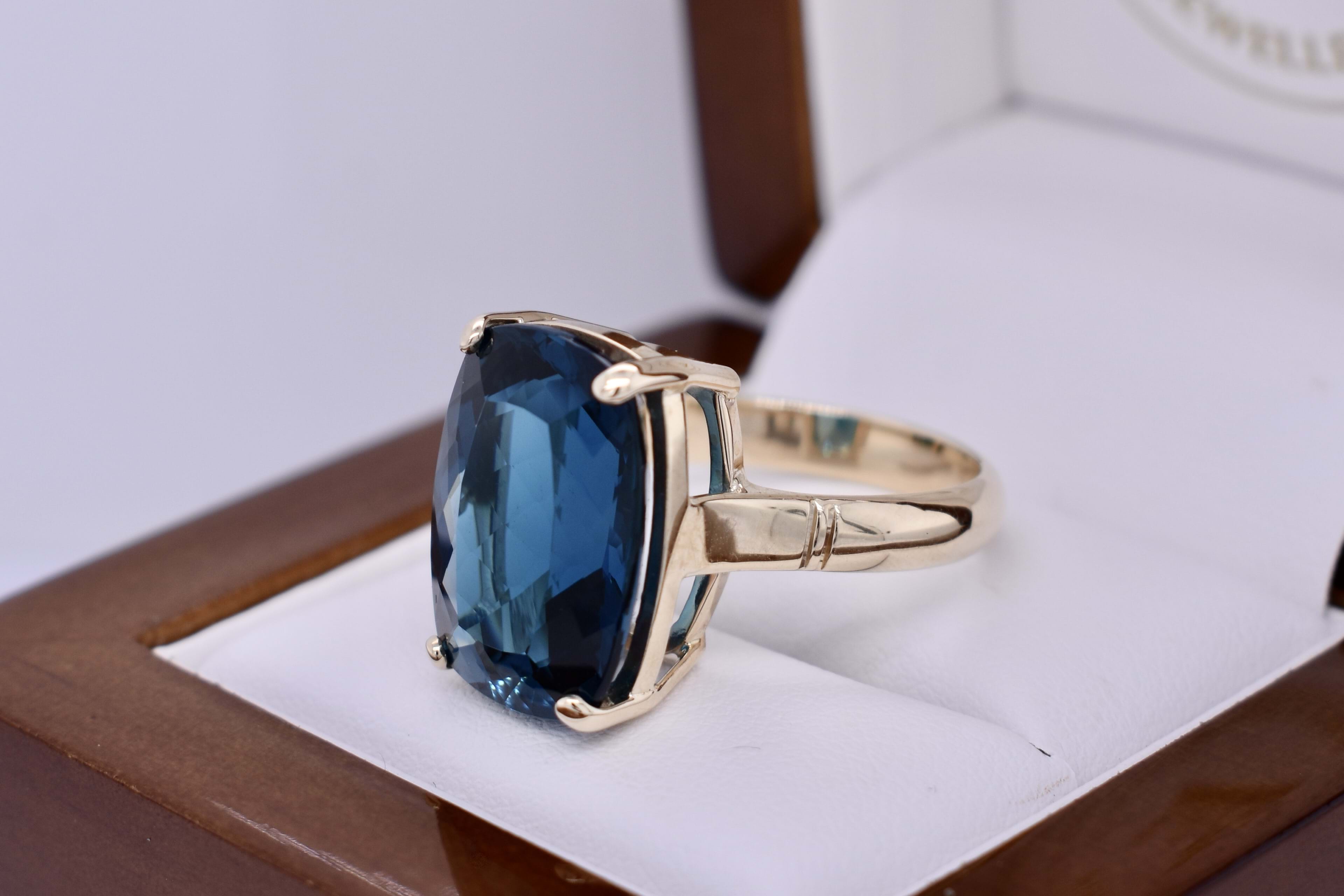 This lovely handmade 9ct yellow gold ring is set with a beautiful elongated cushion cut London blue topaz, measuring 17.80x12.85x8.65mm and equalling 14.5ct. Completed with a plain grooved band. 8.06 grams. Finger size R. Independent Valuation Supplied