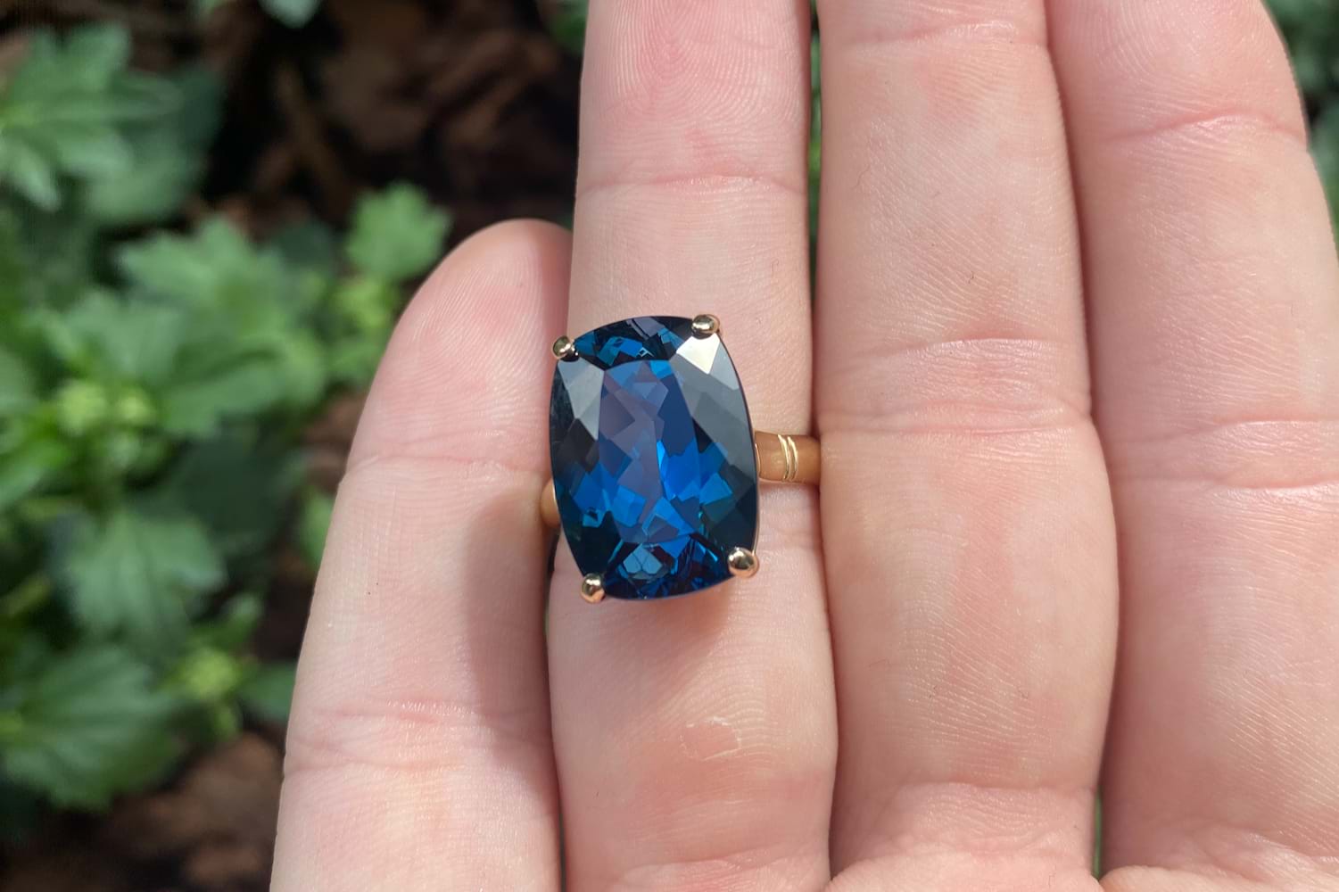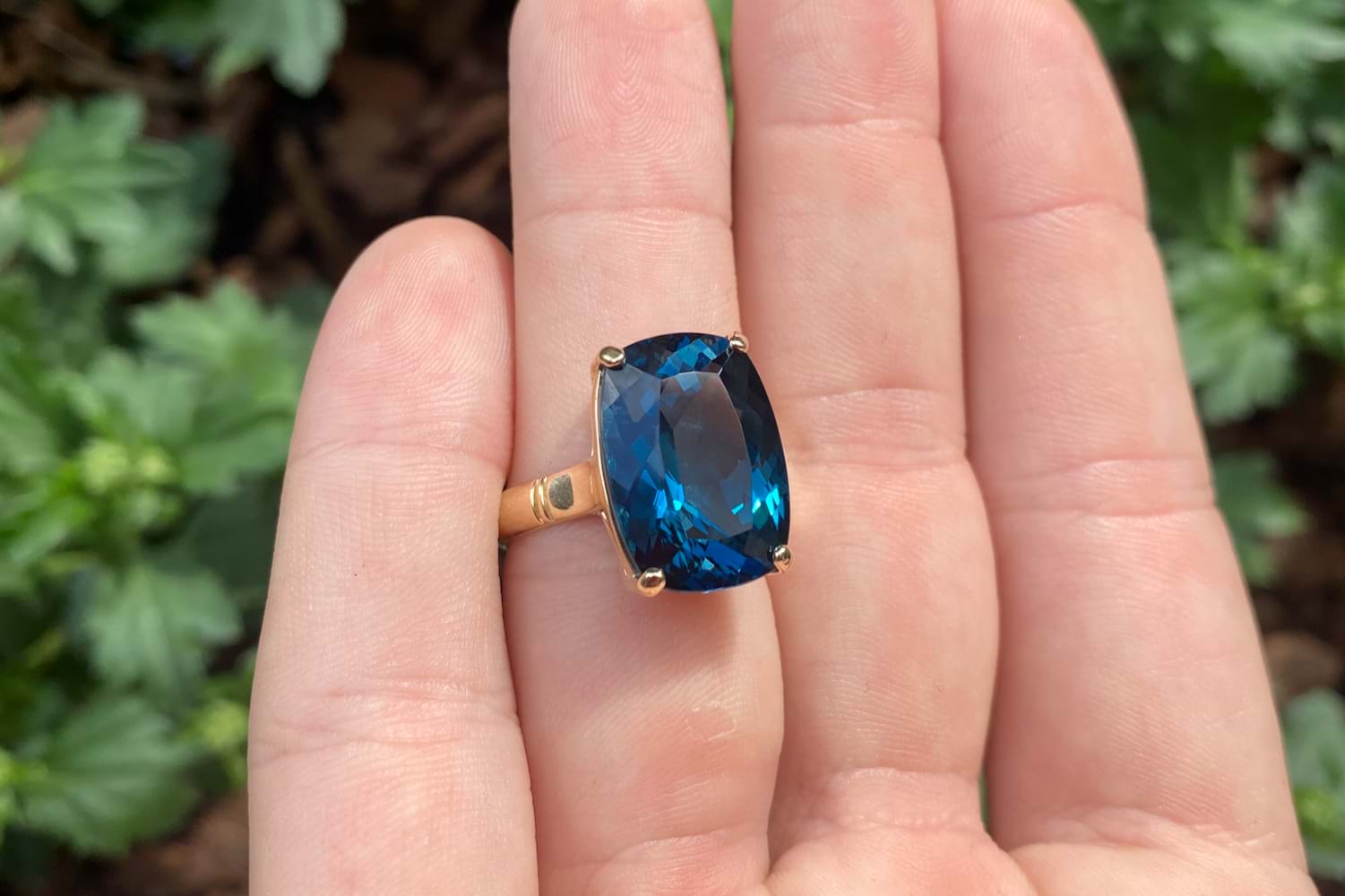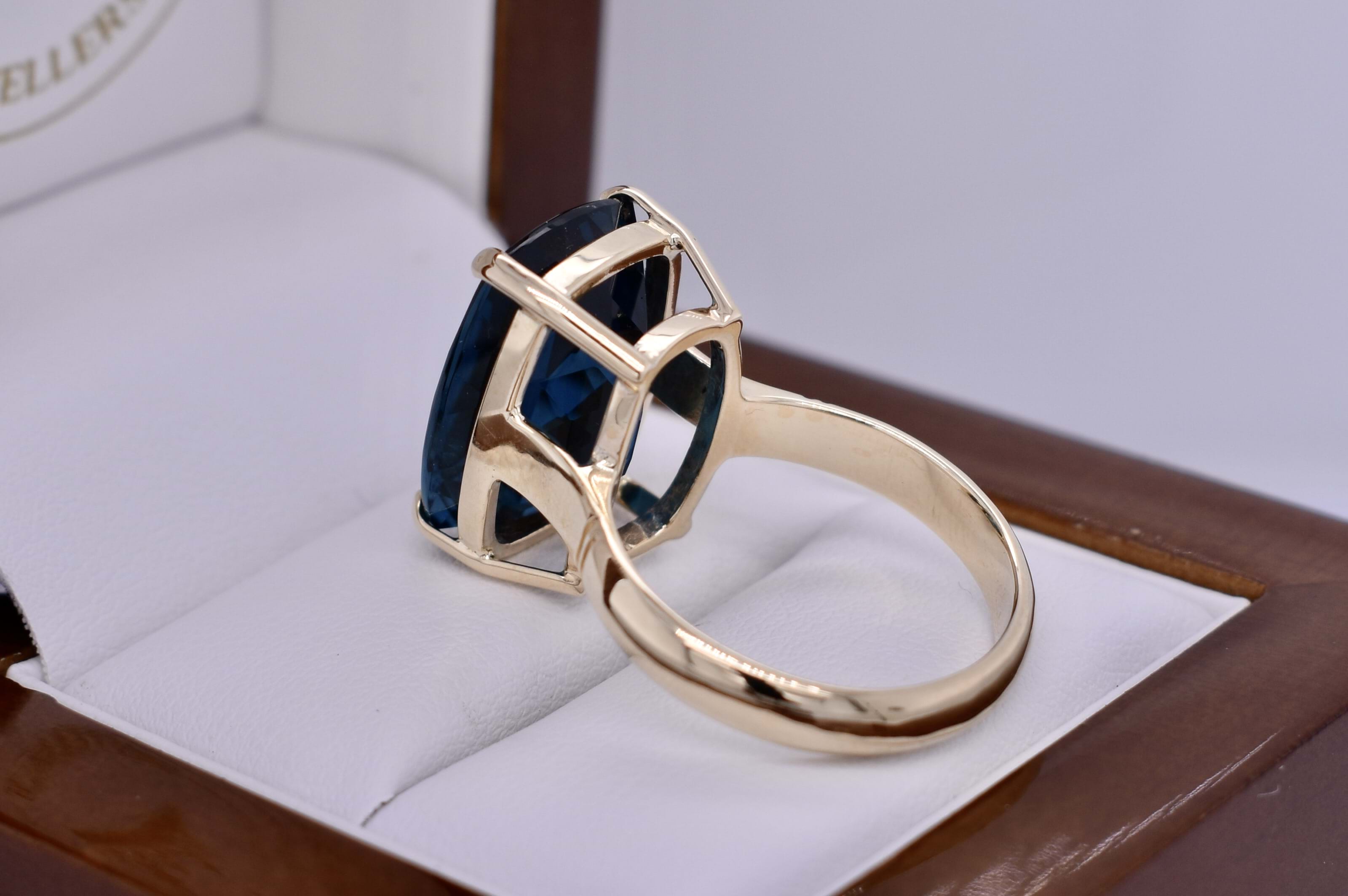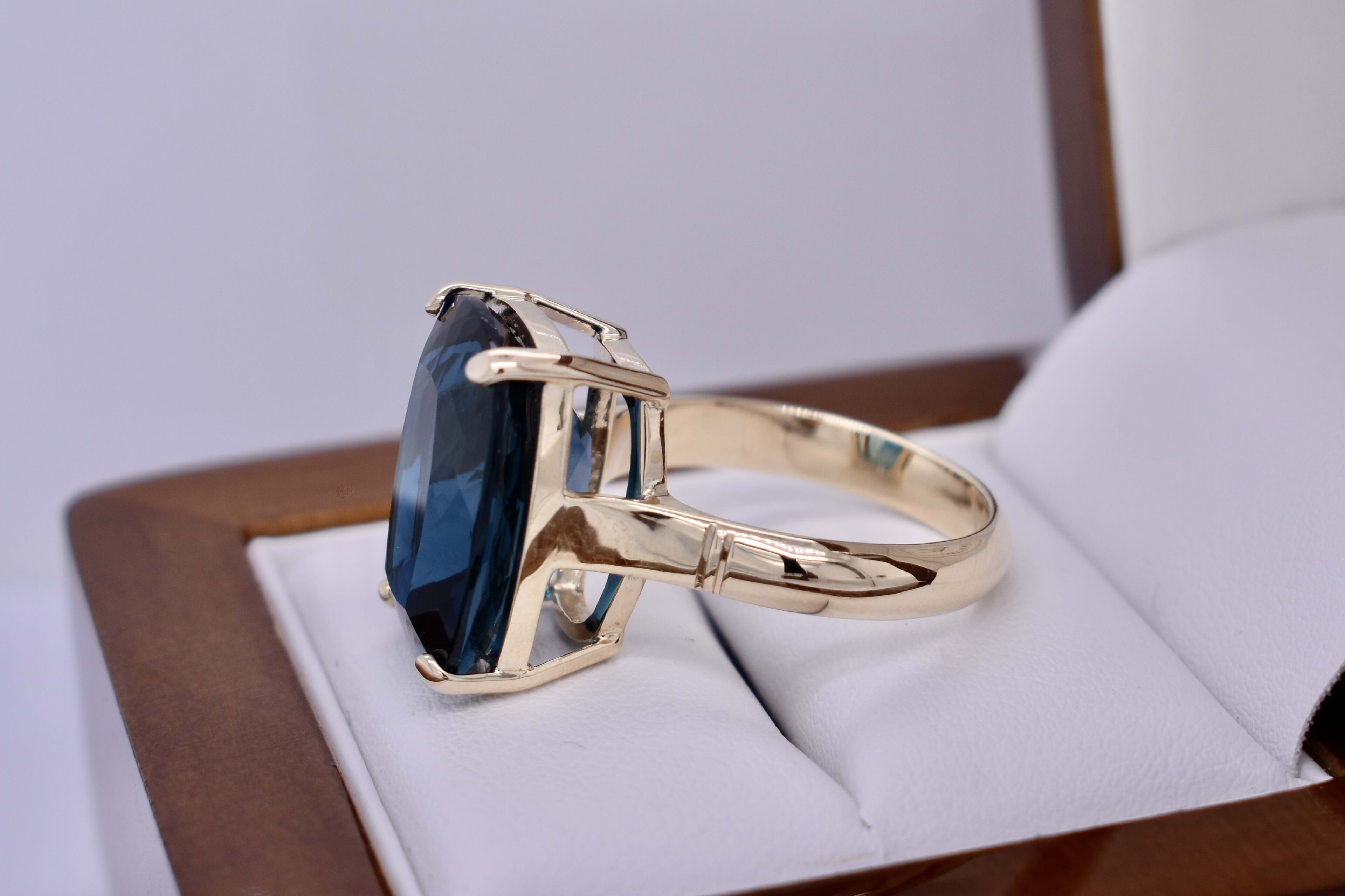 This lovely handmade 9ct yellow gold ring is set with a beautiful elongated cushion cut London blue topaz, measuring 17.80x12.85x8.65mm and equalling 14.5ct. Completed with a plain grooved band. 8.06 grams. Finger size R. Independent Valuation Supplied