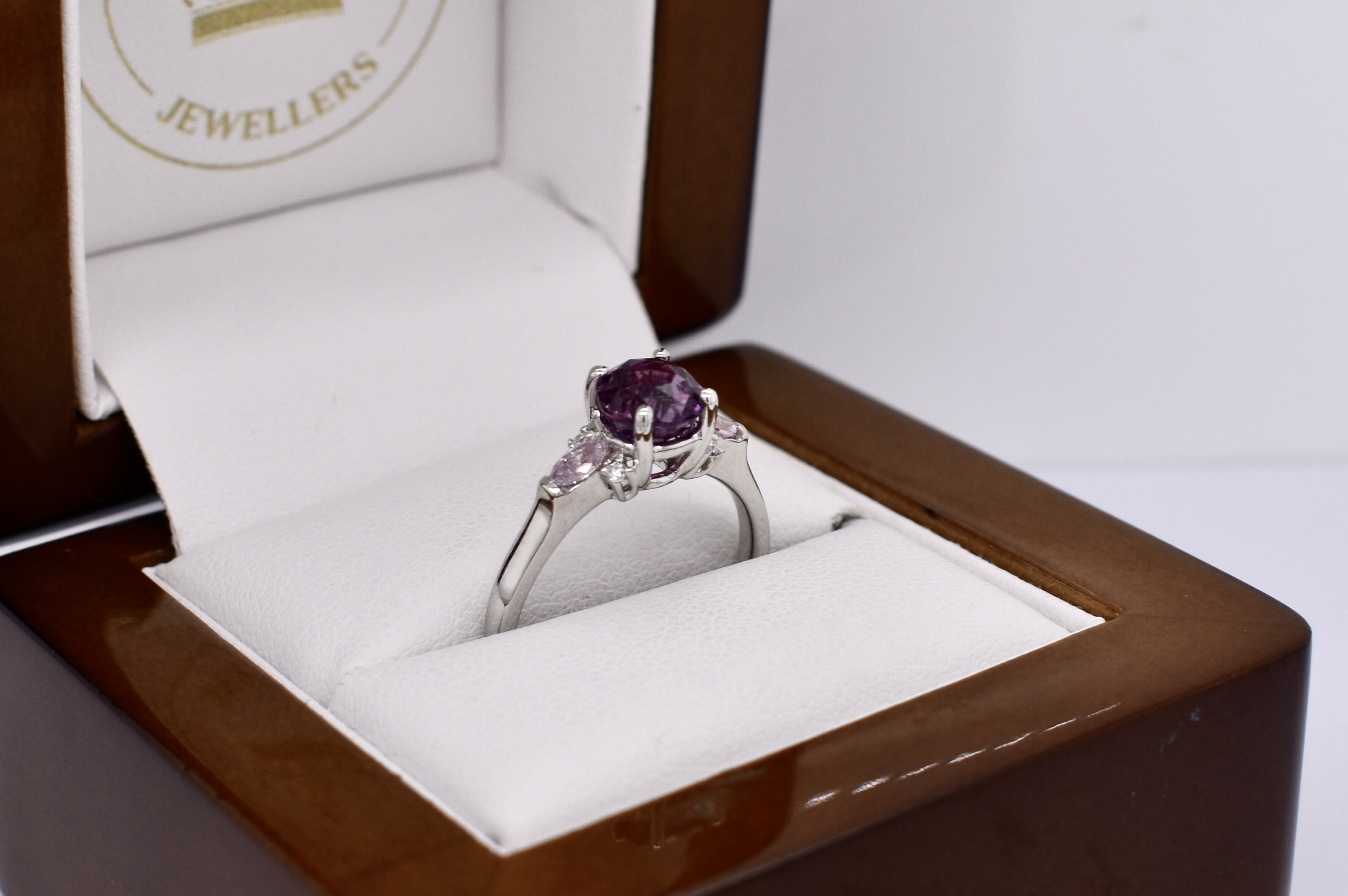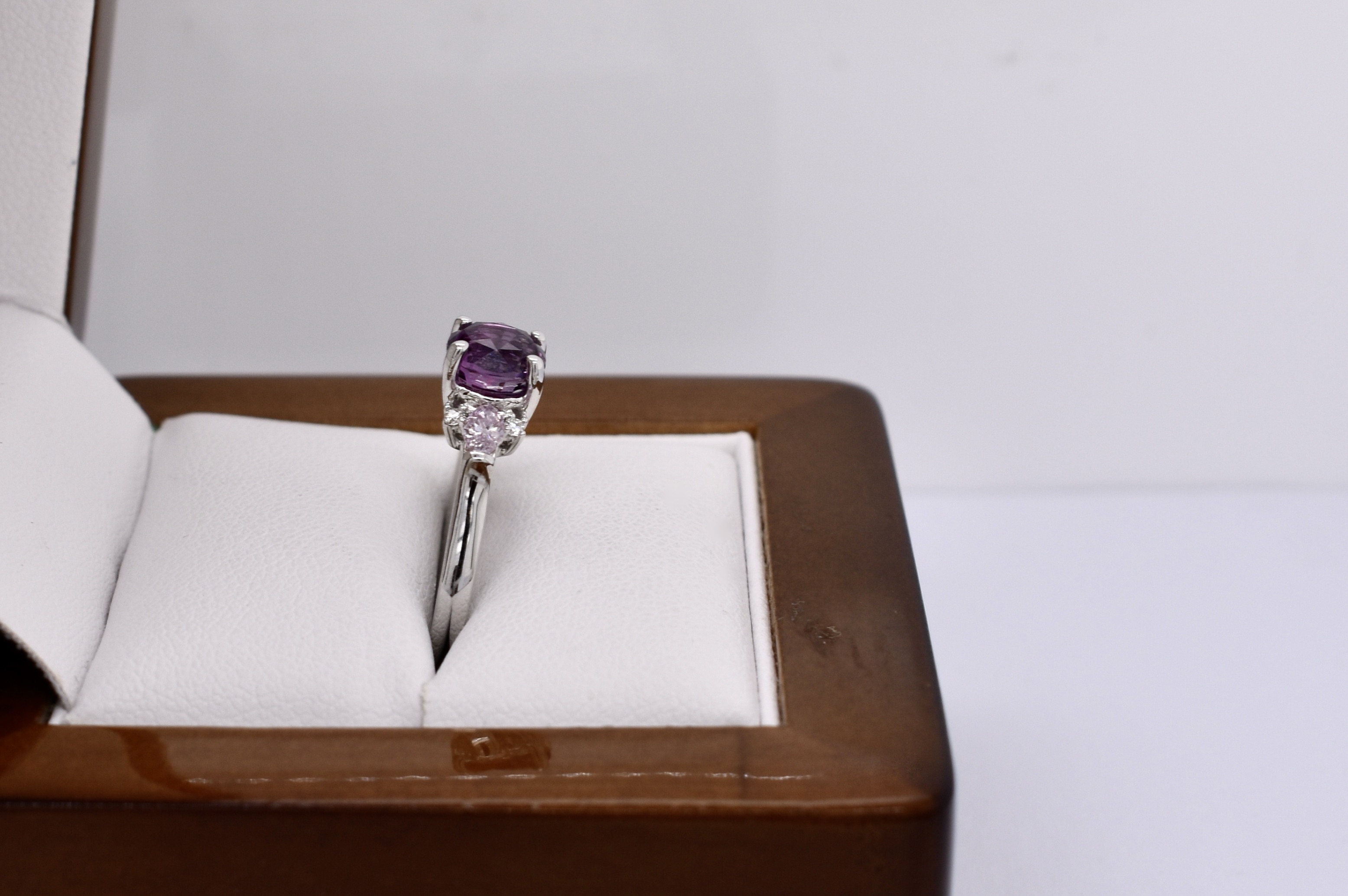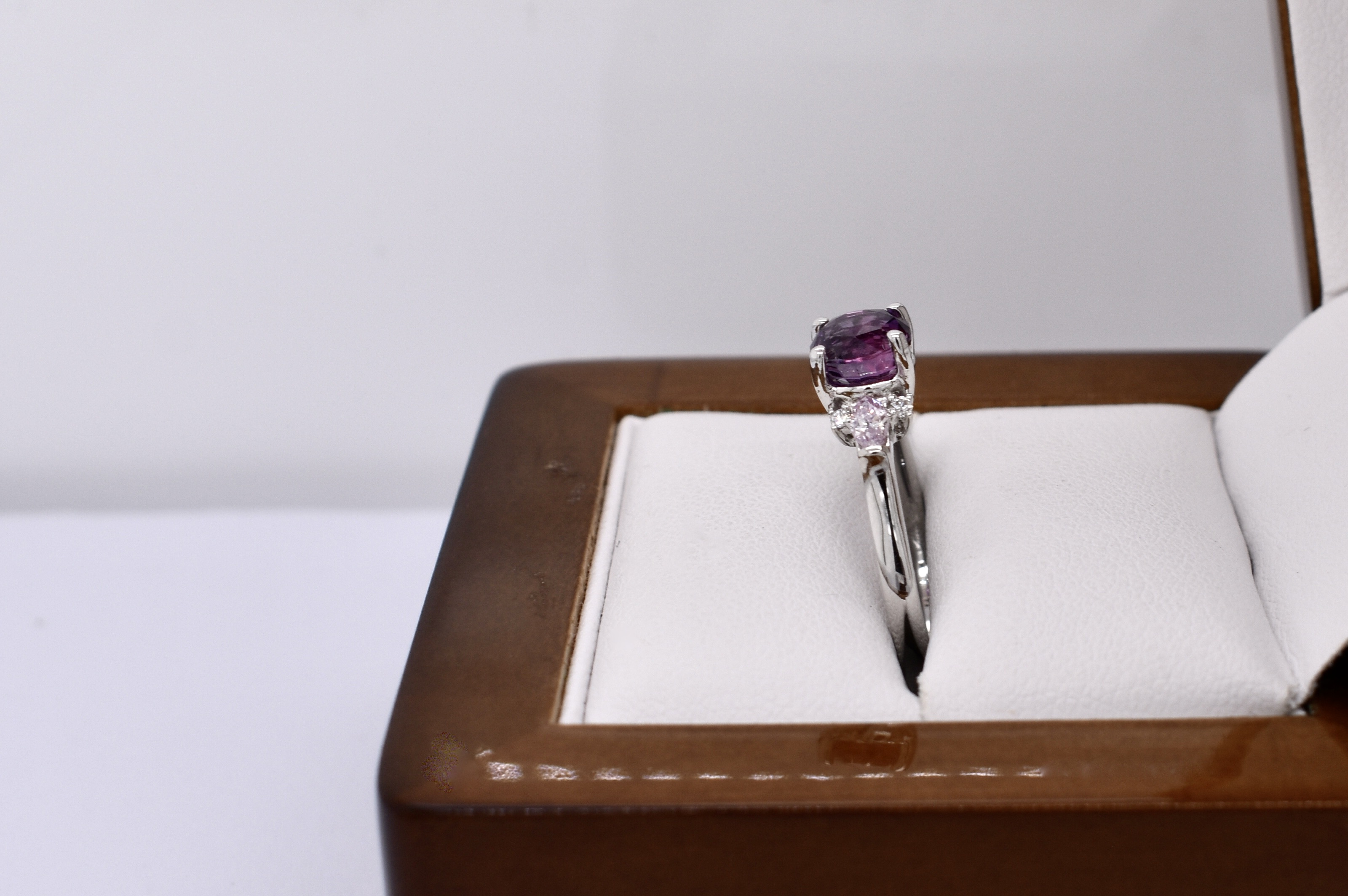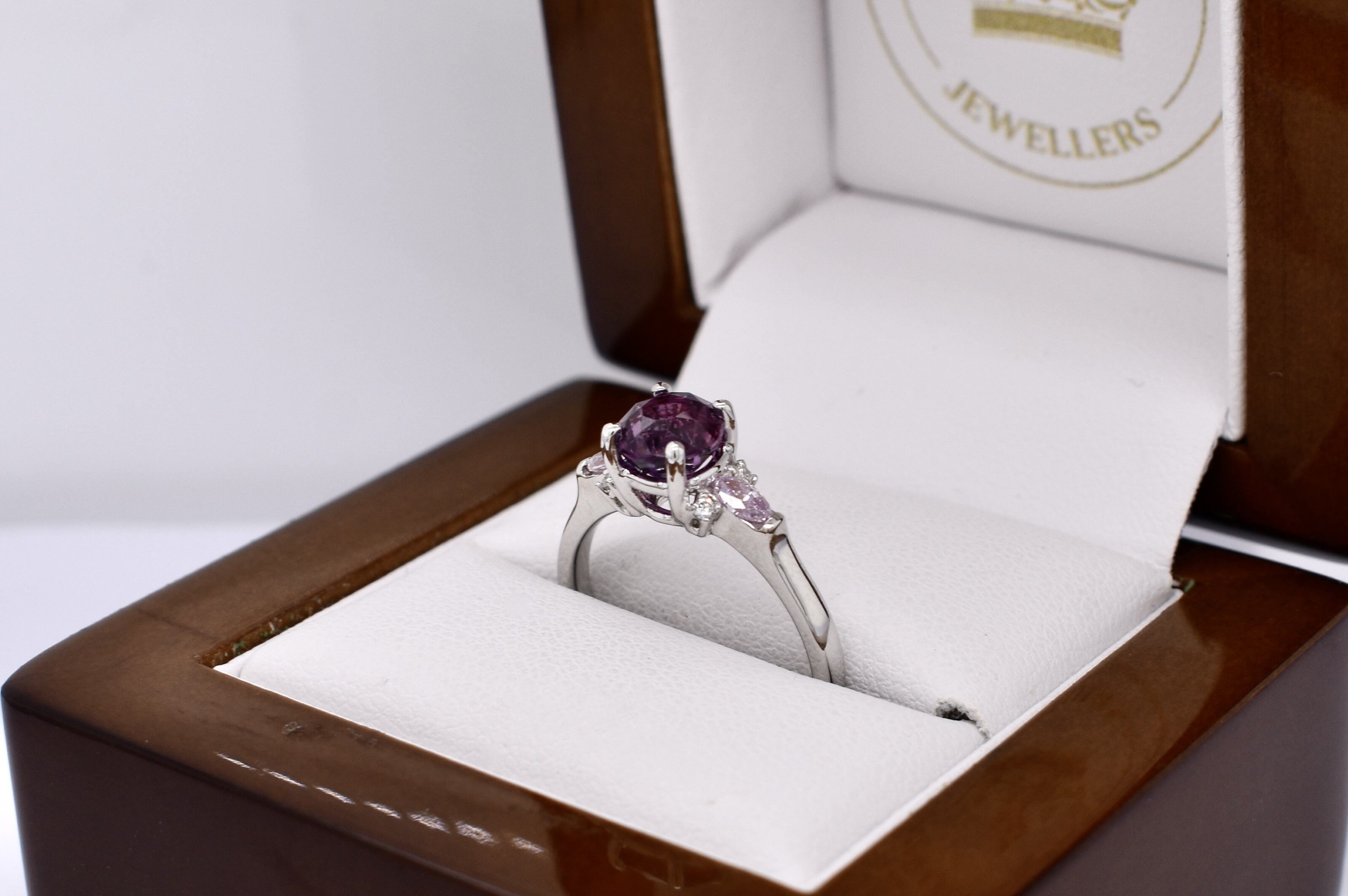 A beautiful and elegant piece, this ring has been crafted in 18ct white gold and is set with a stunning centre deep purplish pink round sapphire of 1.68ct, measuring 6.20x6.20x5.06mm, from Madagascar. Four claw set with two marquise 3.90x2.20mm fancy purplish pink diamonds, end claw set, totalling 0.22ct P2. Also with a further two round brilliant cut 1.30mm diamonds each side, four total equalling 0.04ct G SI. Completed with swept up shoulders on a tapered 1/4 round 1.98mm band. Finger size M+. Independent Valuation Supplied.
