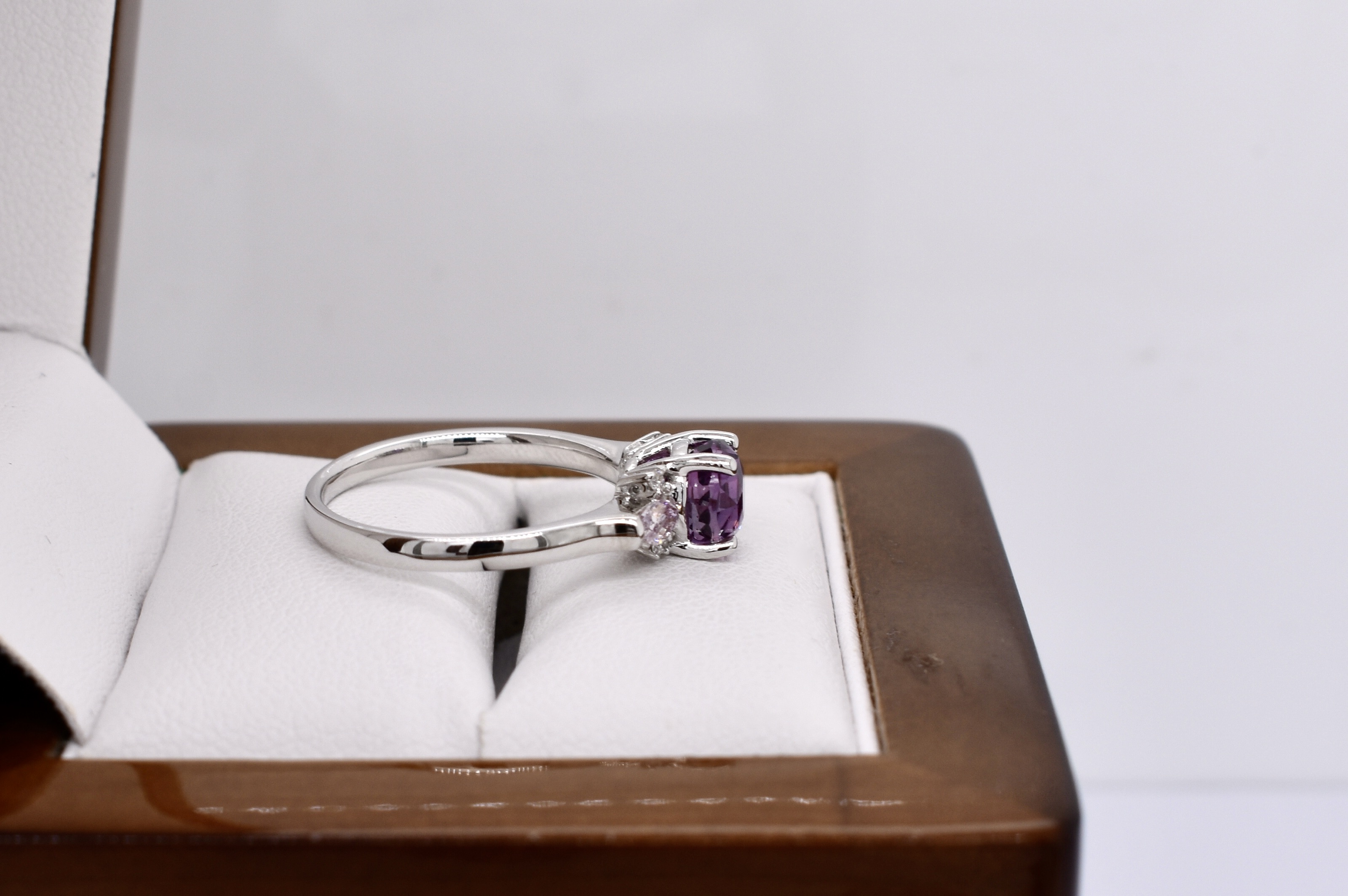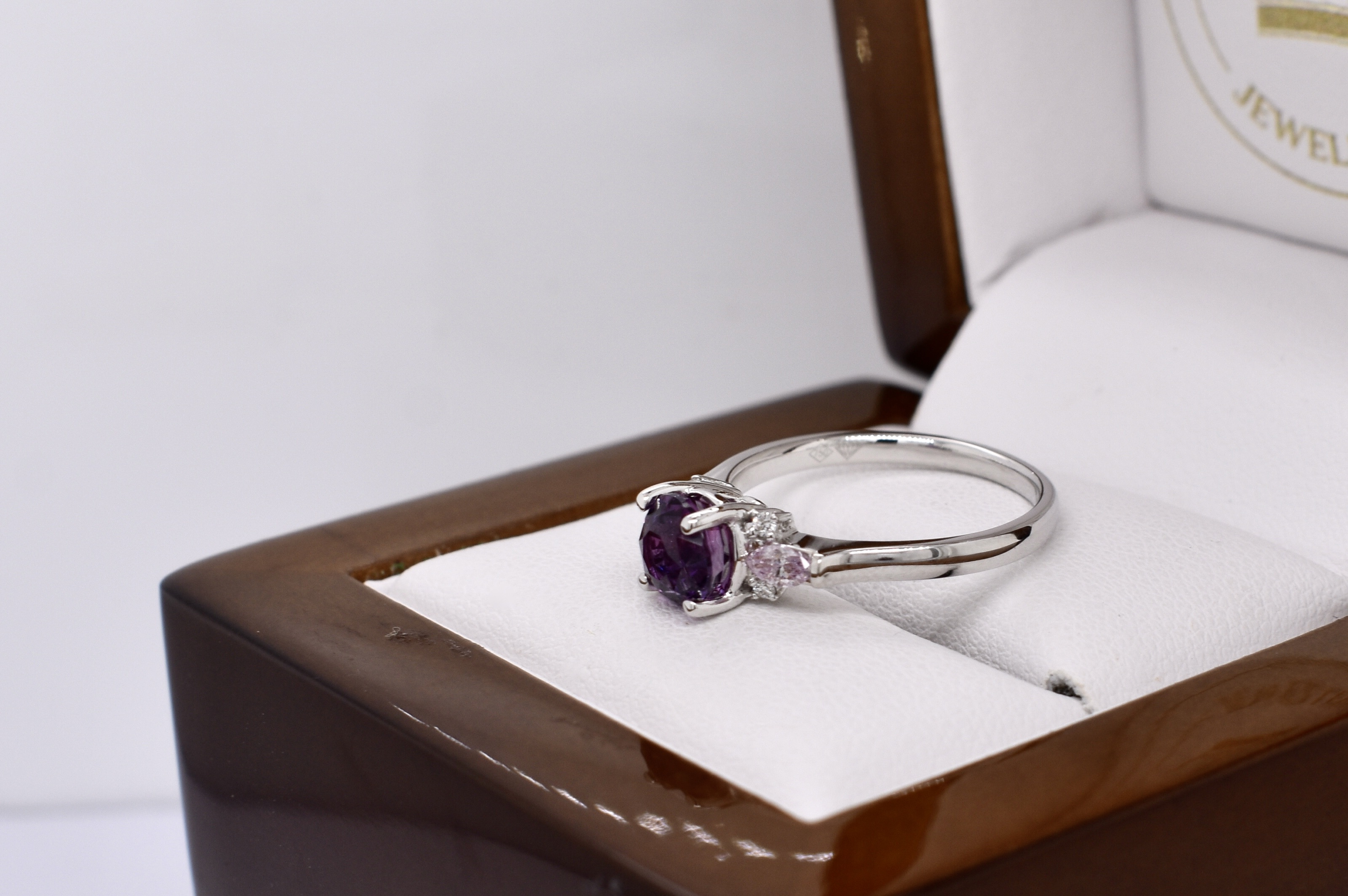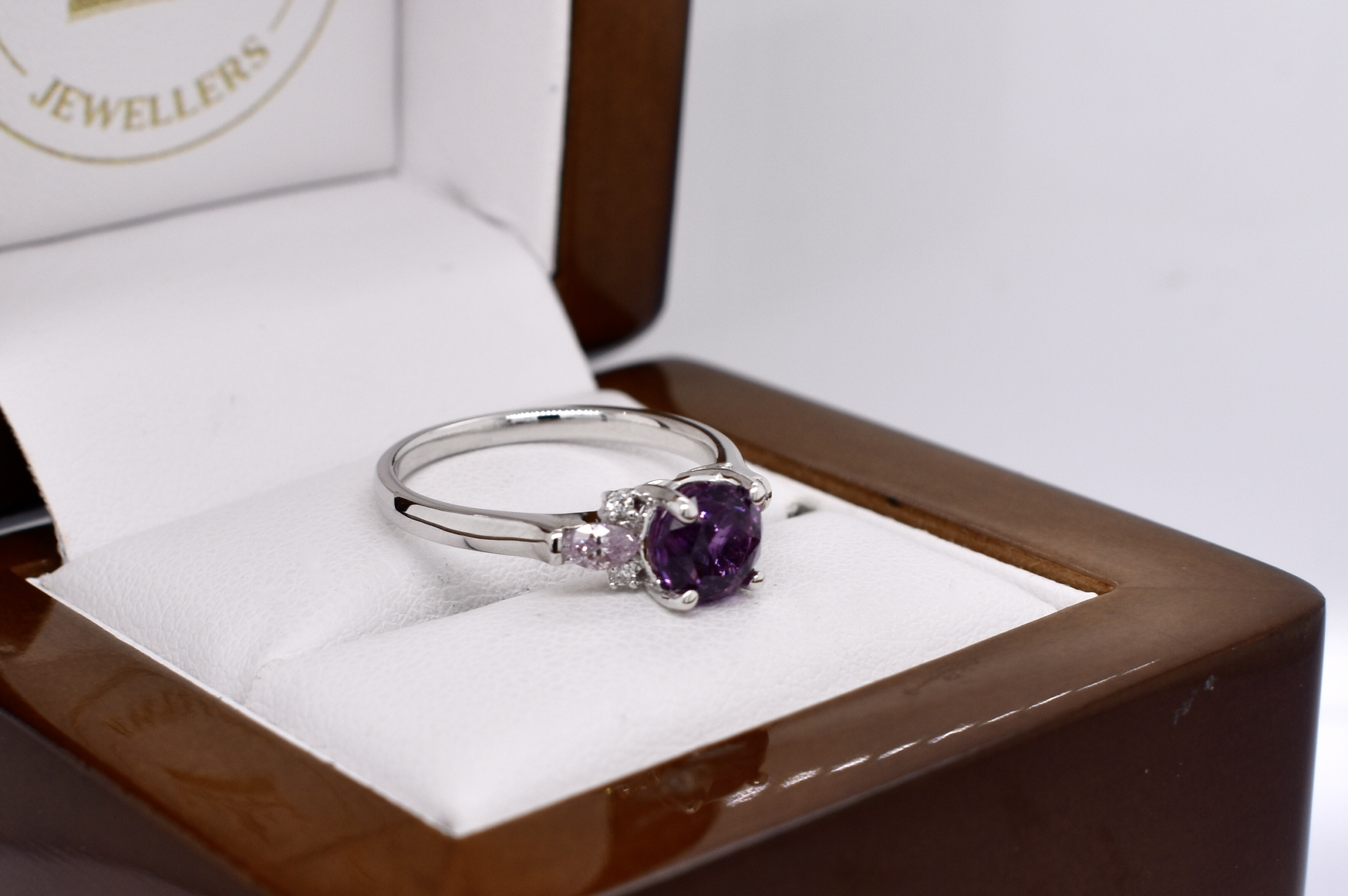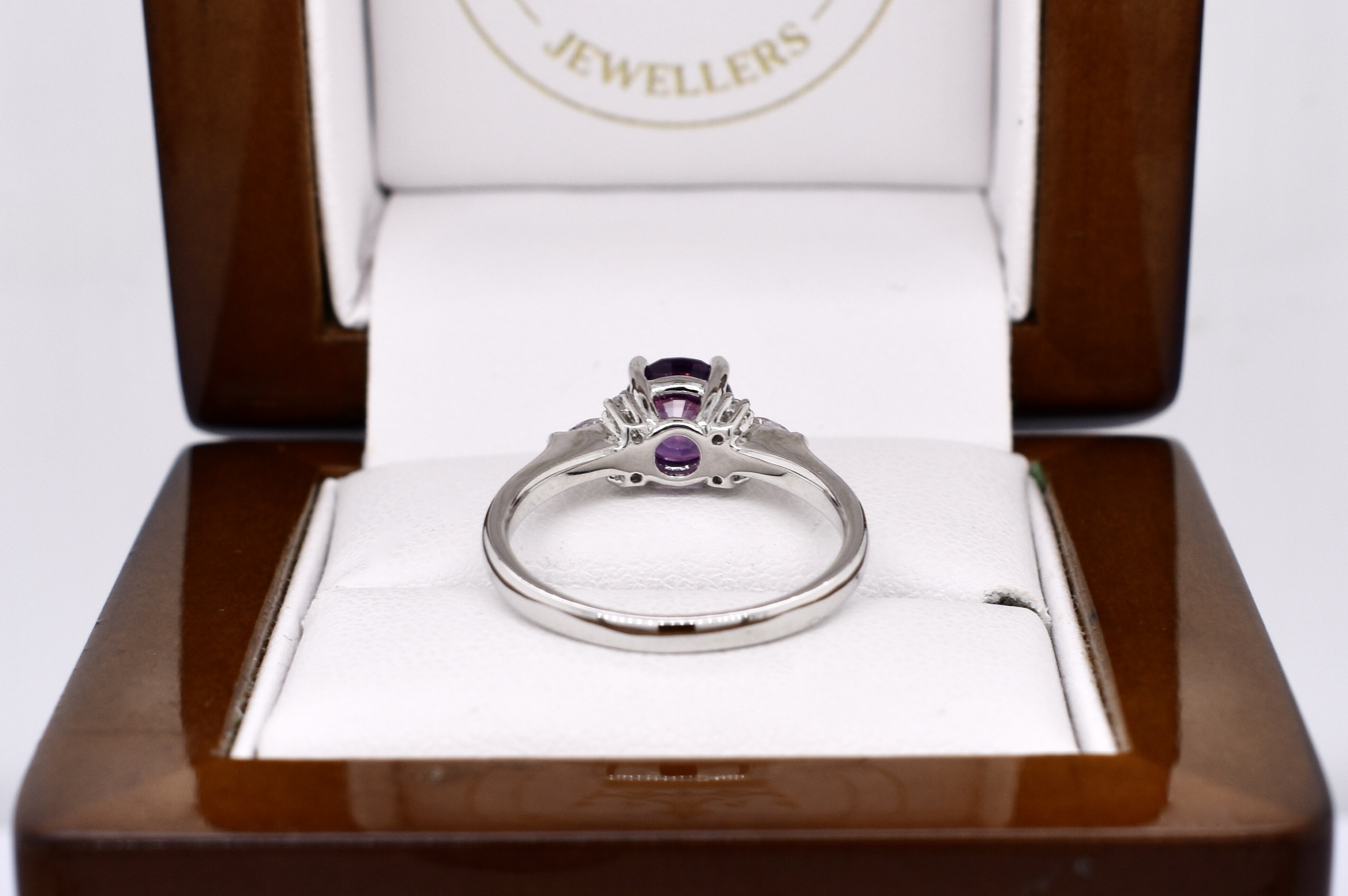 A beautiful and elegant piece, this ring has been crafted in 18ct white gold and is set with a stunning centre deep purplish pink round sapphire of 1.68ct, measuring 6.20x6.20x5.06mm, from Madagascar. Four claw set with two marquise 3.90x2.20mm fancy purplish pink diamonds, end claw set, totalling 0.22ct P2. Also with a further two round brilliant cut 1.30mm diamonds each side, four total equalling 0.04ct G SI. Completed with swept up shoulders on a tapered 1/4 round 1.98mm band. Finger size M+. Independent Valuation Supplied.