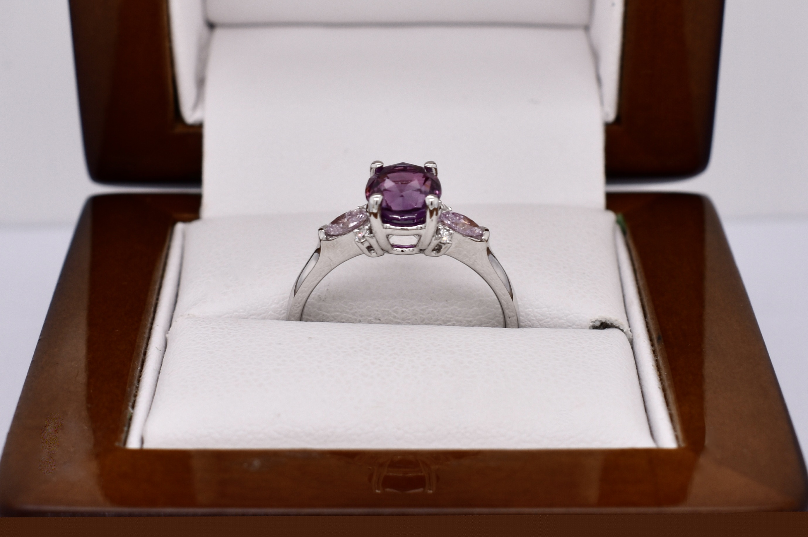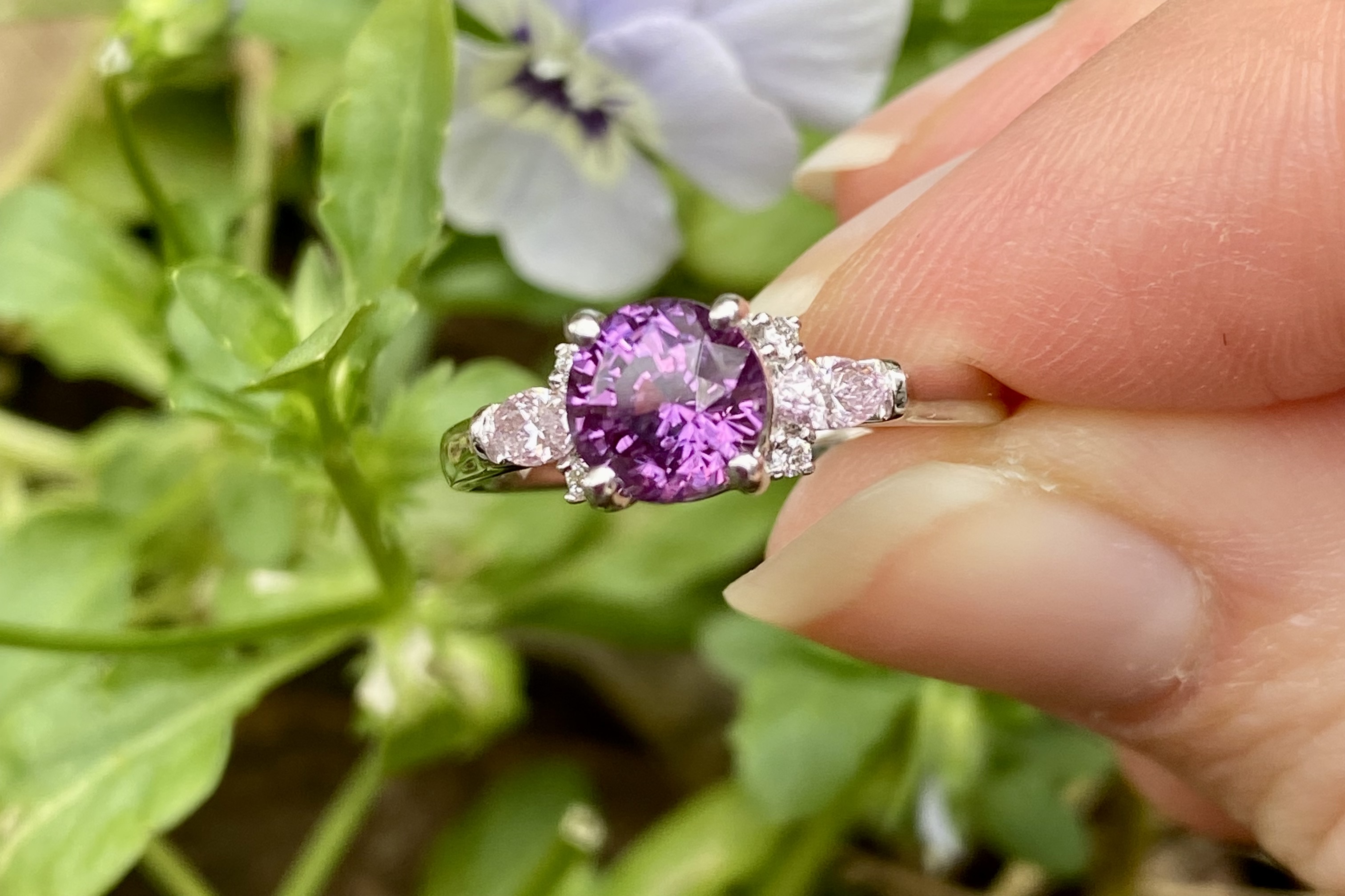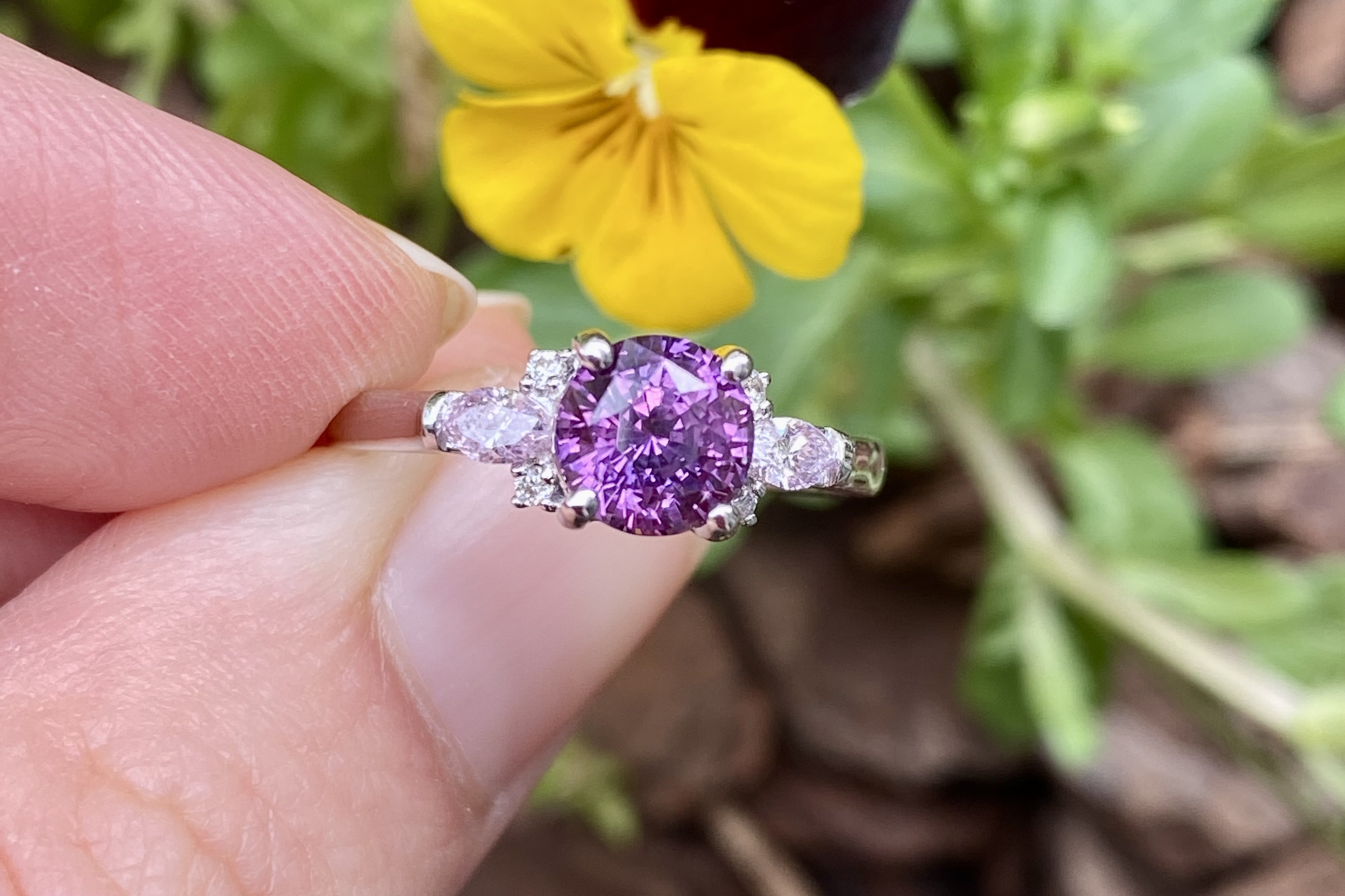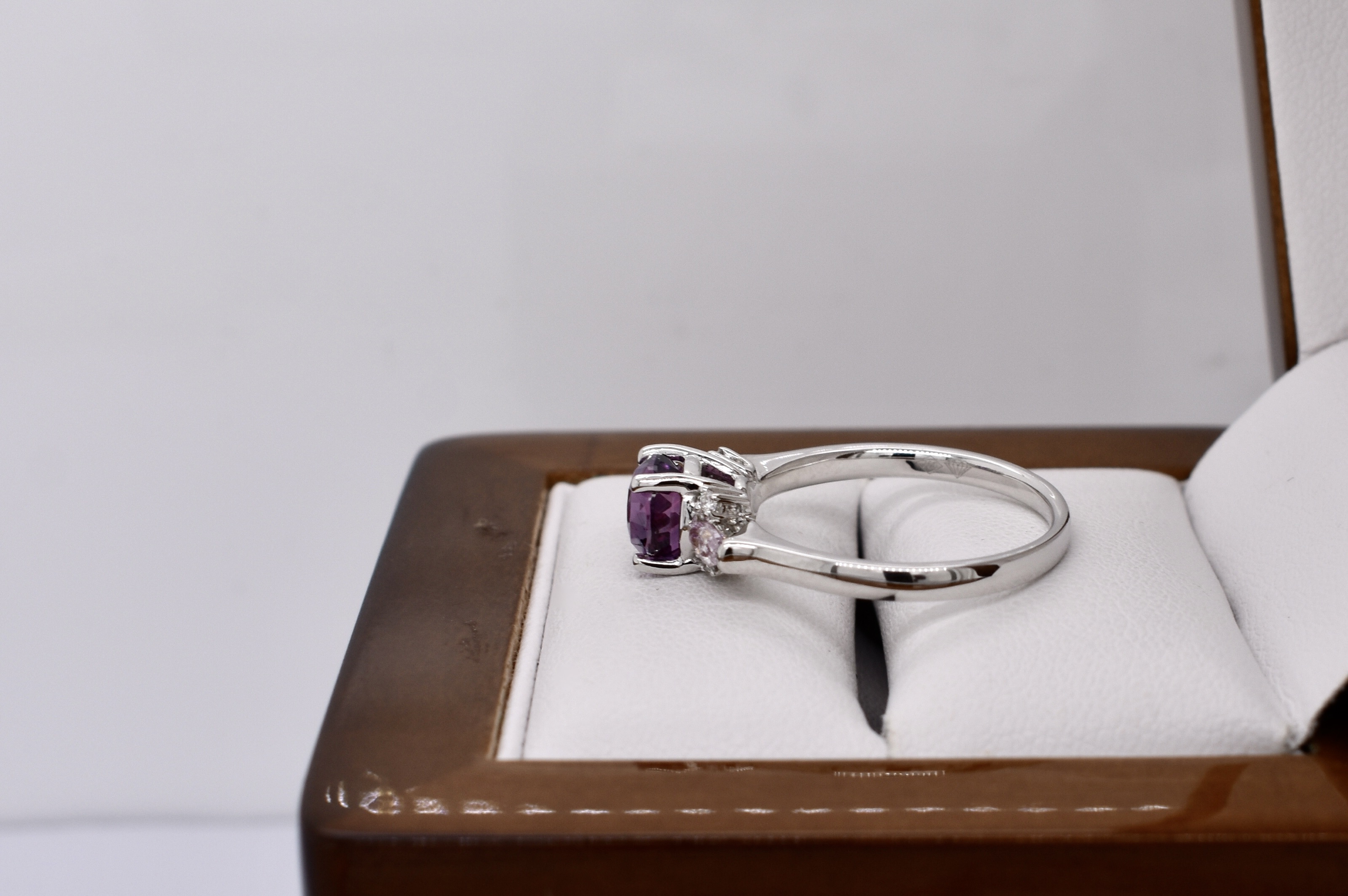 A beautiful and elegant piece, this ring has been crafted in 18ct white gold and is set with a stunning centre deep purplish pink round sapphire of 1.68ct, measuring 6.20x6.20x5.06mm, from Madagascar. Four claw set with two marquise 3.90x2.20mm fancy purplish pink diamonds, end claw set, totalling 0.22ct P2. Also with a further two round brilliant cut 1.30mm diamonds each side, four total equalling 0.04ct G SI. Completed with swept up shoulders on a tapered 1/4 round 1.98mm band. Finger size M+. Independent Valuation Supplied.