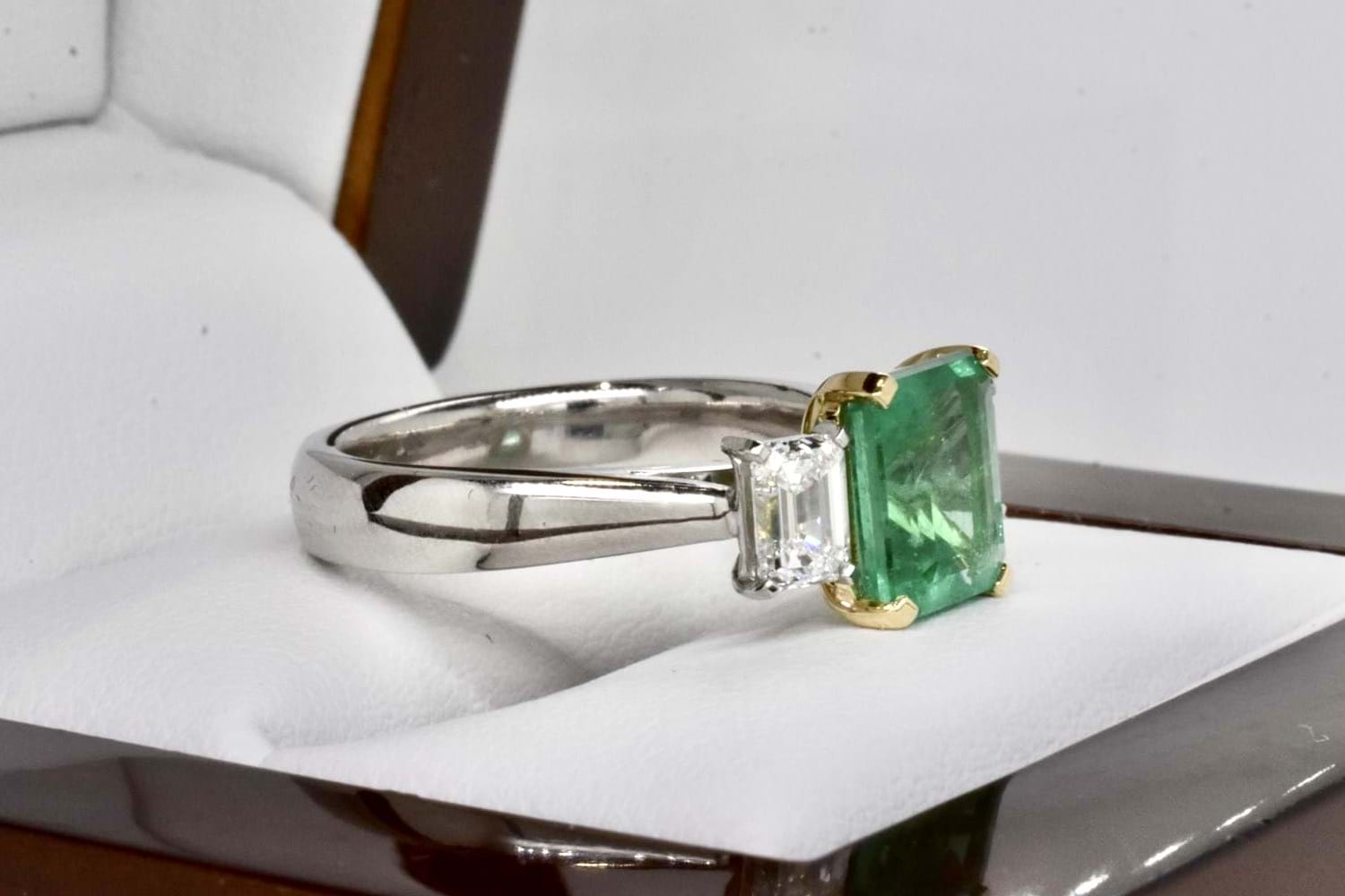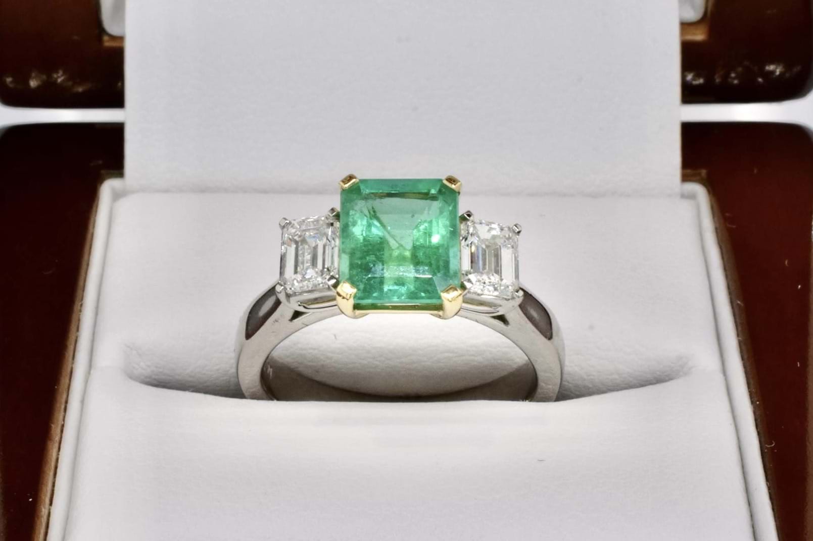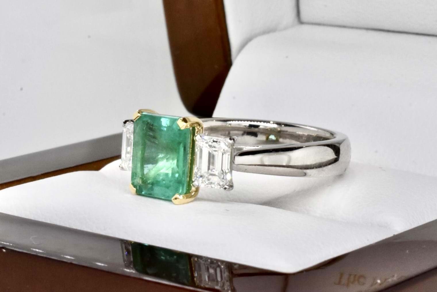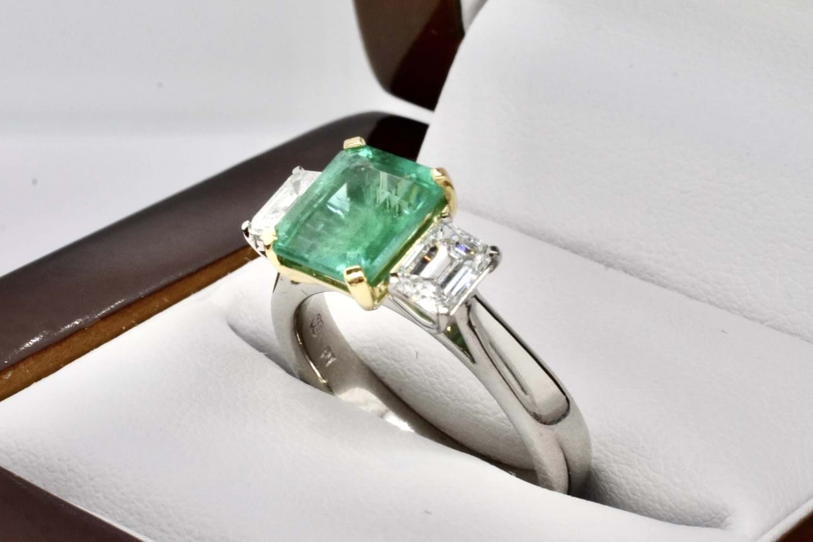 An absolutely stunning ring crafted in platinum, featuring a spectacular 1.90ct emerald cut Colombian emerald, 4 claw set in 18ct yellow gold with a sparkling, white EF/VS emerald cut diamond on either side (2 equalling 0.80ct) with a thick, plain tapered platinum band. Finger size M. Independent Valuation Supplied