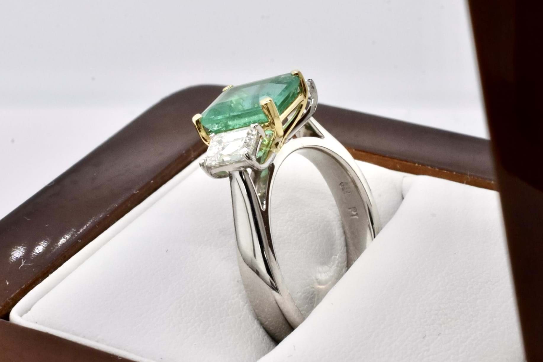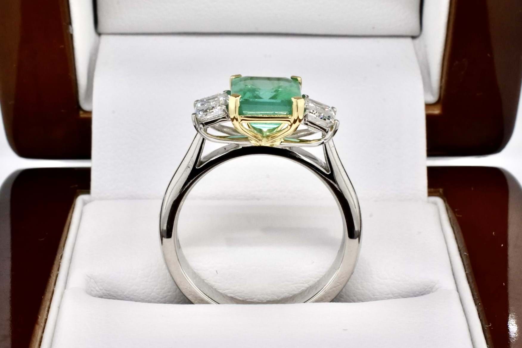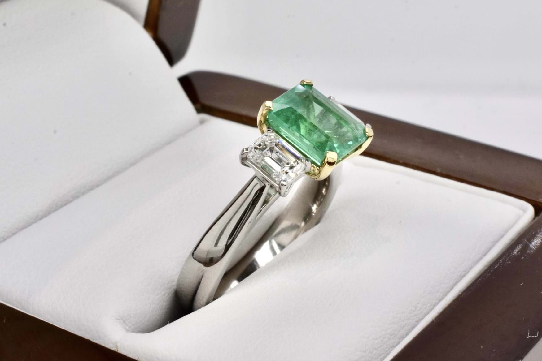 An absolutely stunning ring crafted in platinum, featuring a spectacular 1.90ct emerald cut Colombian emerald, 4 claw set in 18ct yellow gold with a sparkling, white EF/VS emerald cut diamond on either side (2 equalling 0.80ct) with a thick, plain tapered platinum band. Finger size M. Independent Valuation Supplied
