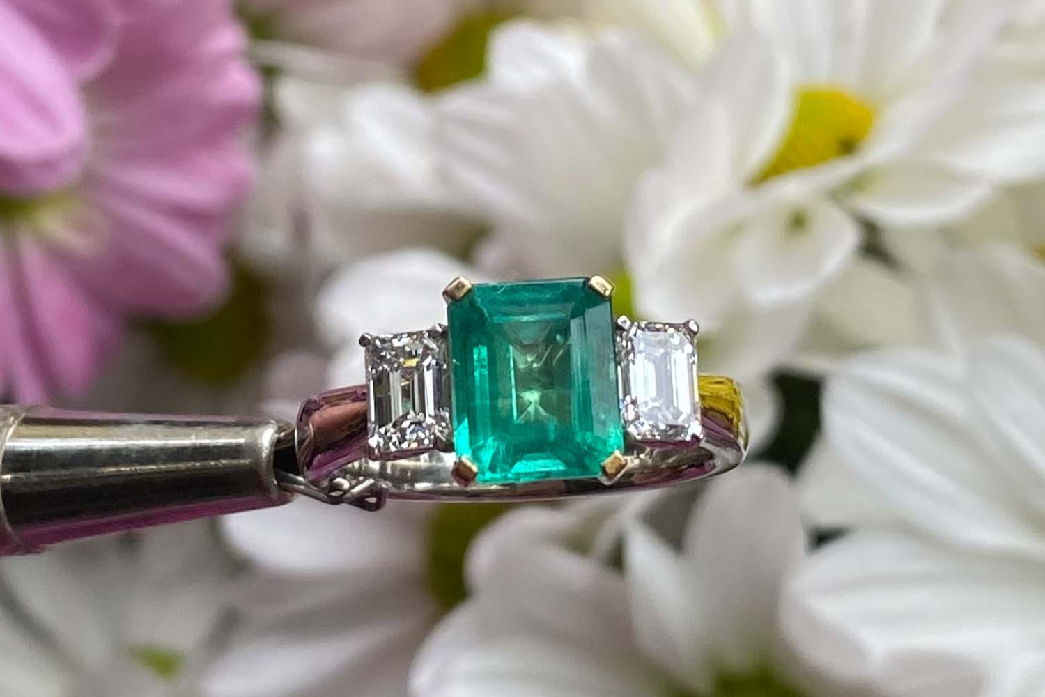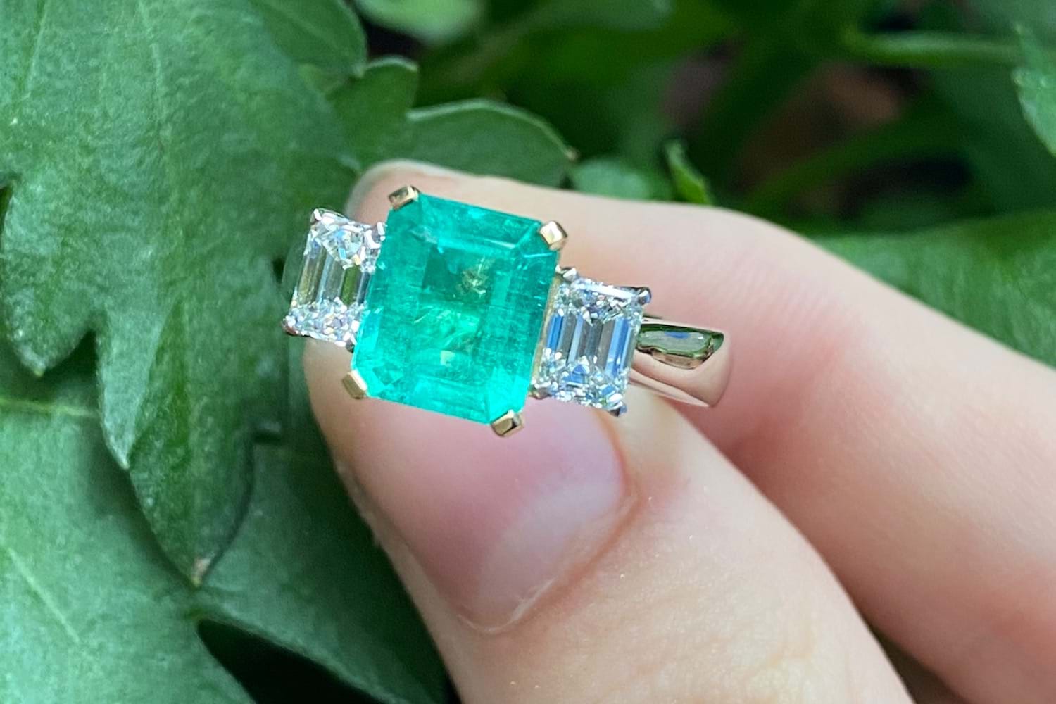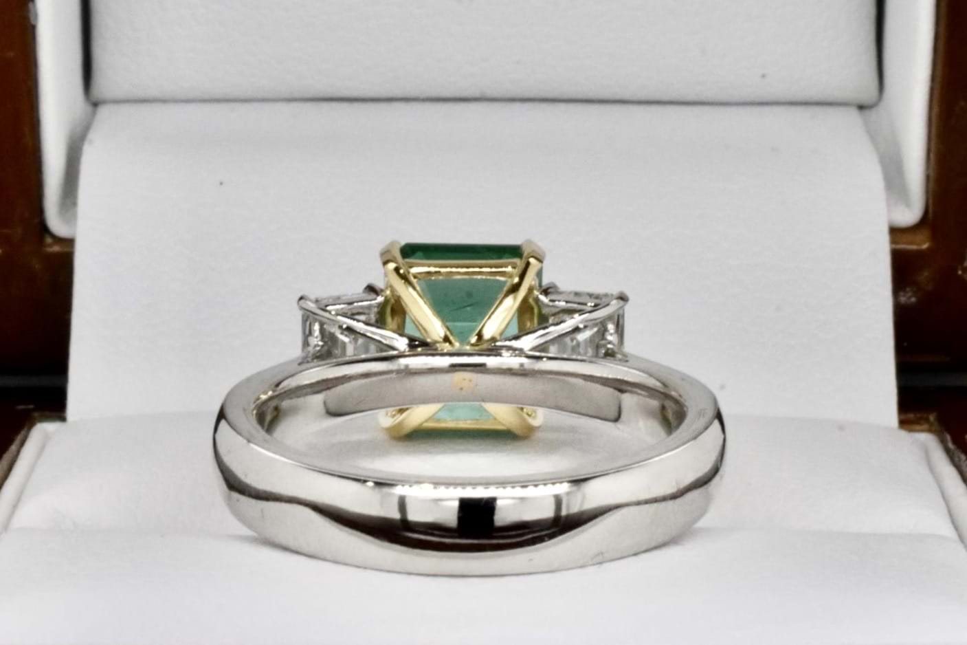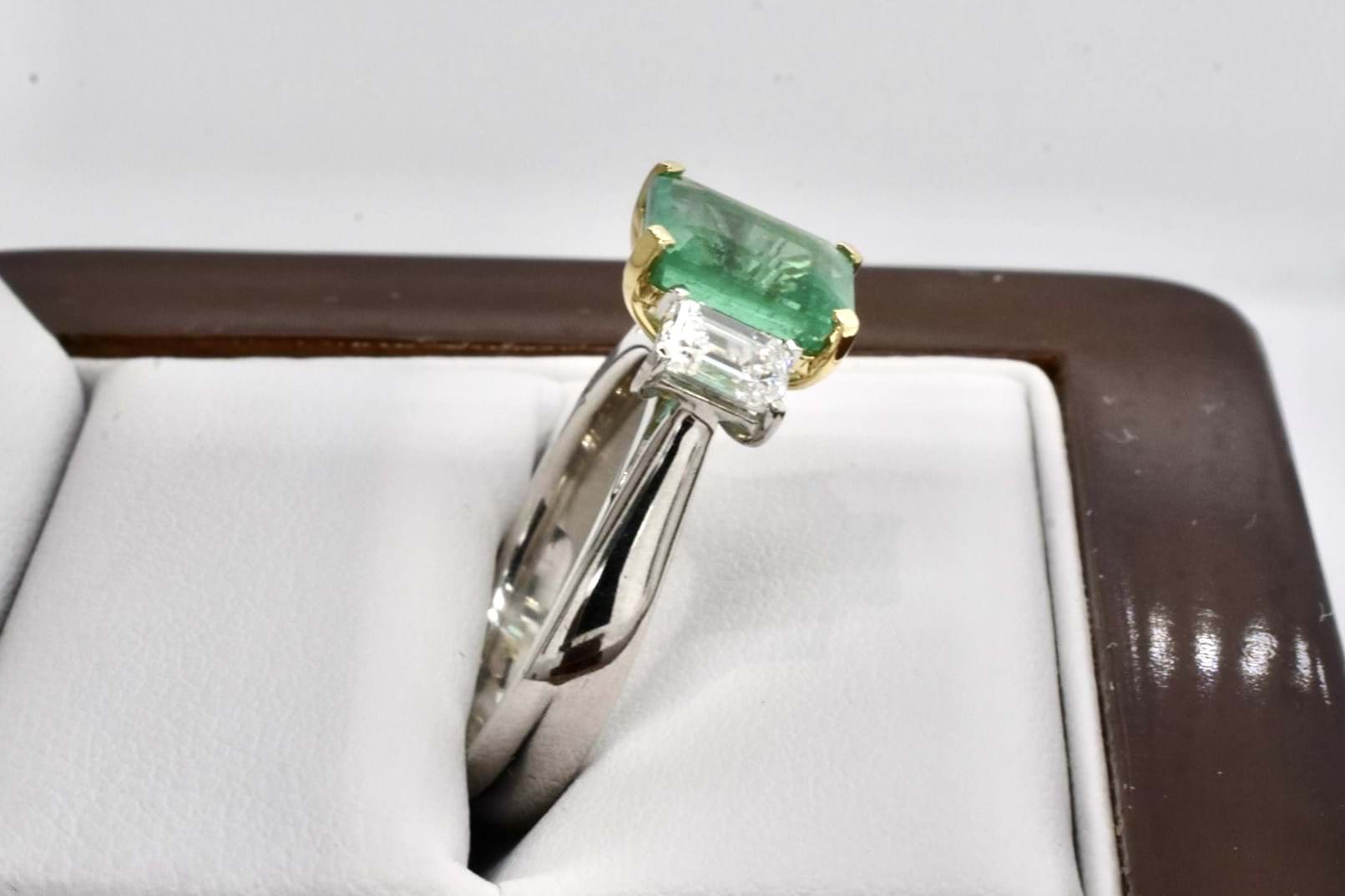 An absolutely stunning ring crafted in platinum, featuring a spectacular 1.90ct emerald cut Colombian emerald, 4 claw set in 18ct yellow gold with a sparkling, white EF/VS emerald cut diamond on either side (2 equalling 0.80ct) with a thick, plain tapered platinum band. Finger size M. Independent Valuation Supplied