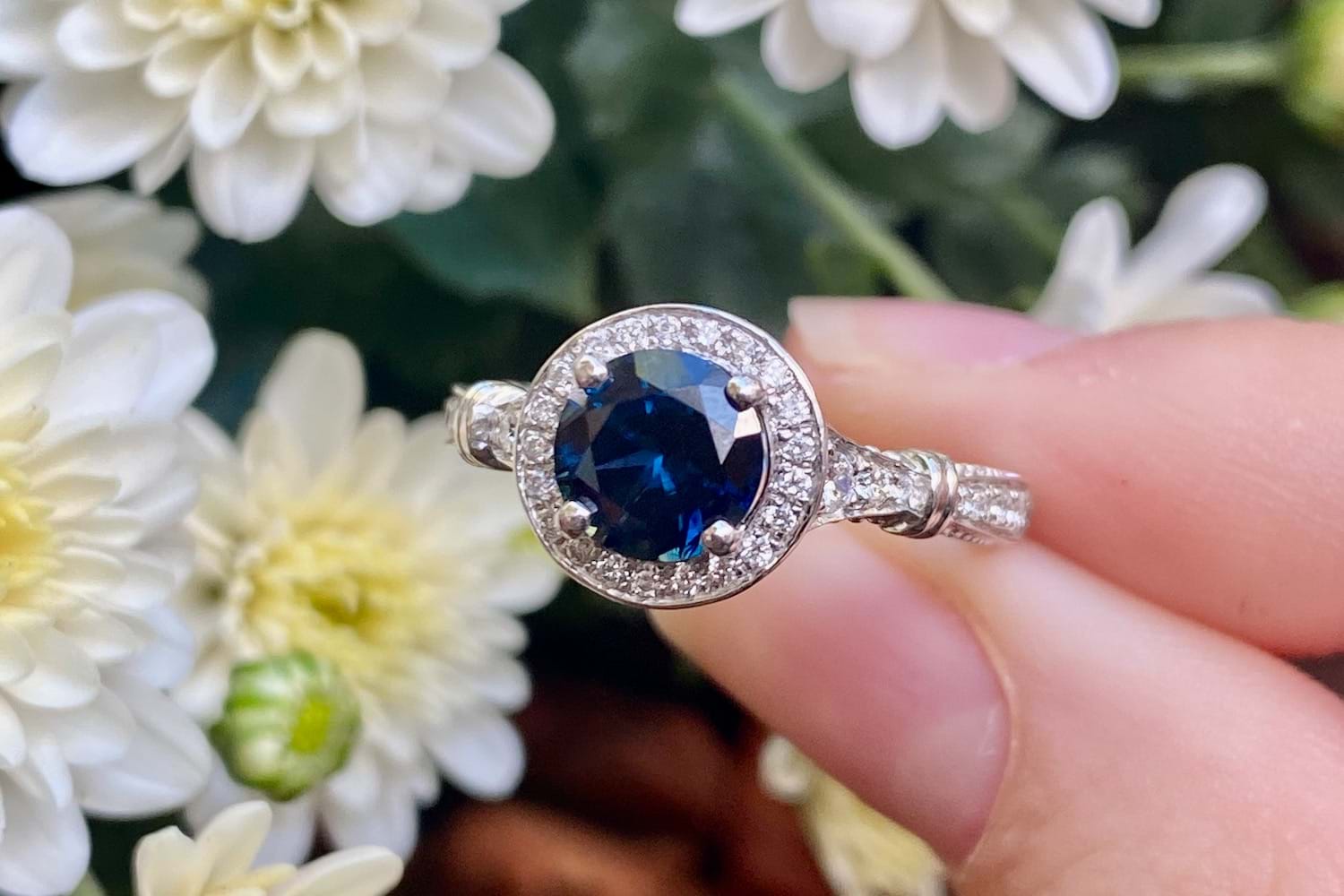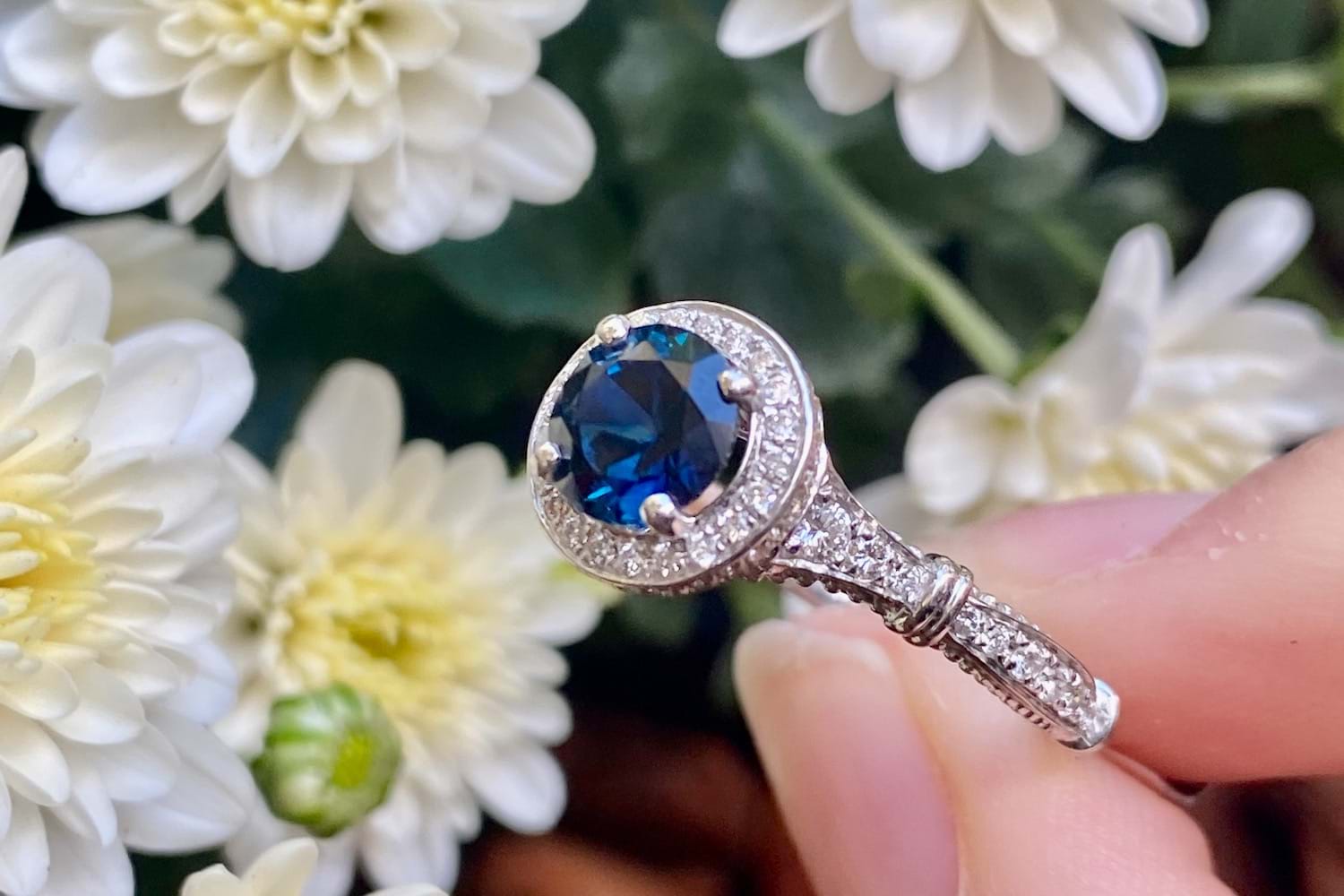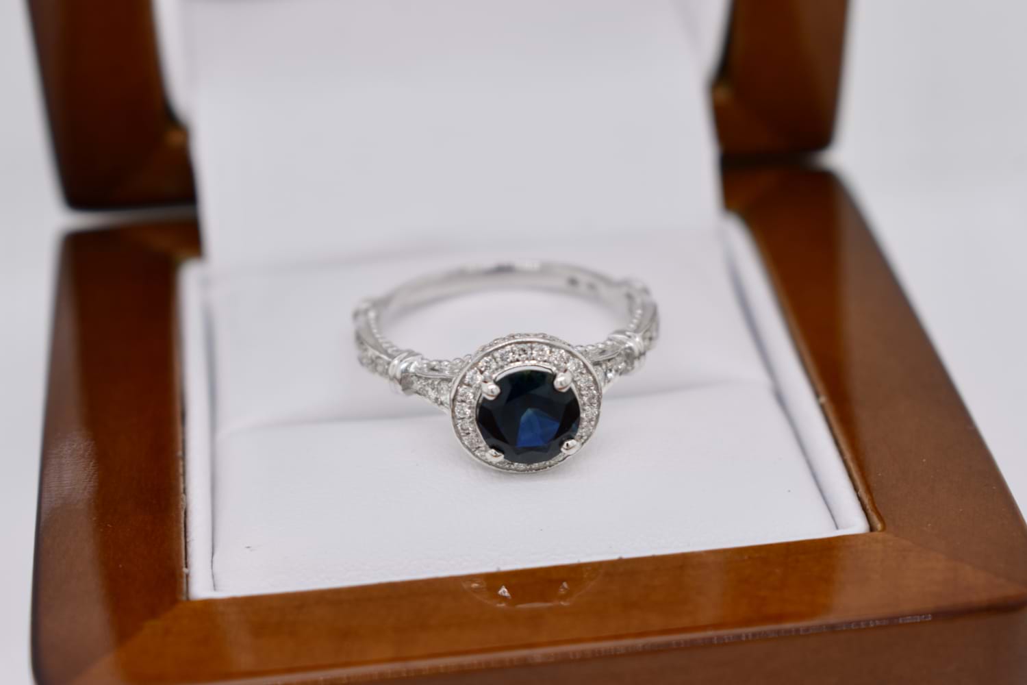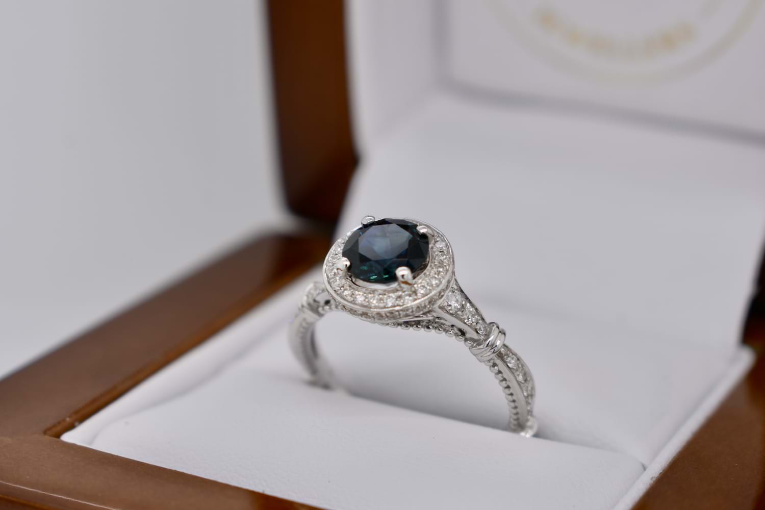 A striking 1.29ct dark blue Australian sapphire set into a decorative halo of white diamonds with beaded & carved 18ct white gold features. The ring contains a total of 70 round brilliant cut diamonds equalling 0.41cts (G/SI) and the attention to detail given to every aspect of the ring makes it even more appealing. Independent Valuation Supplied. Finger size N