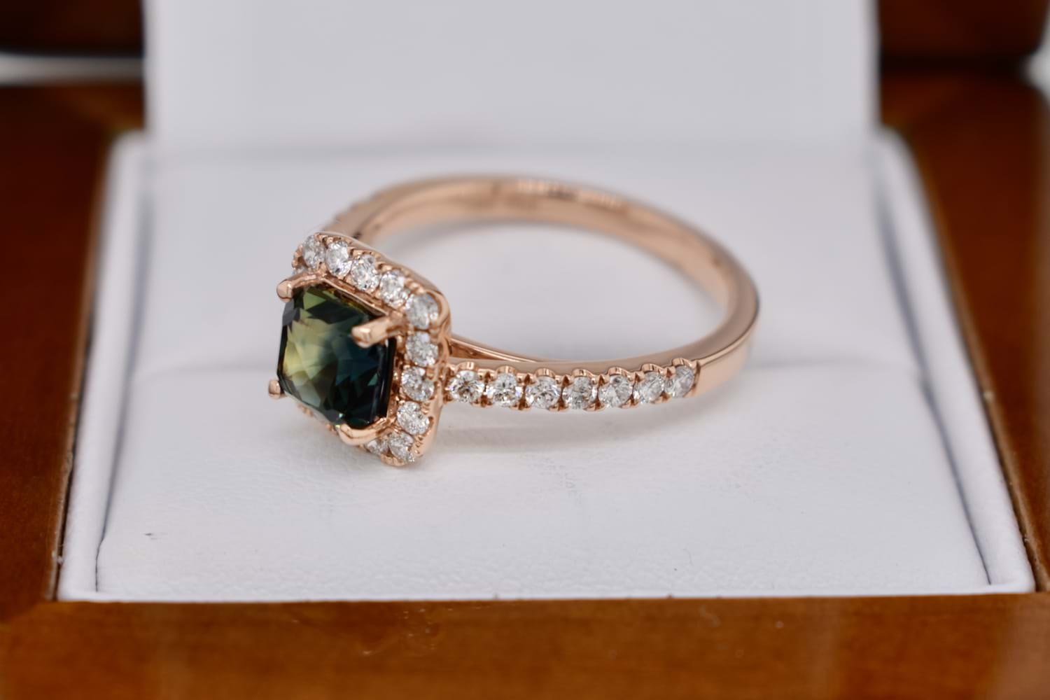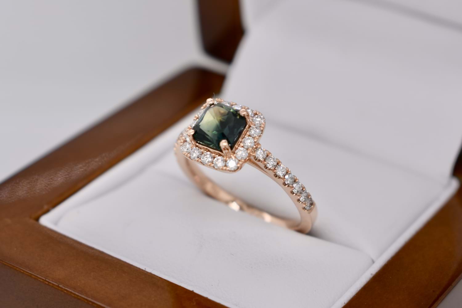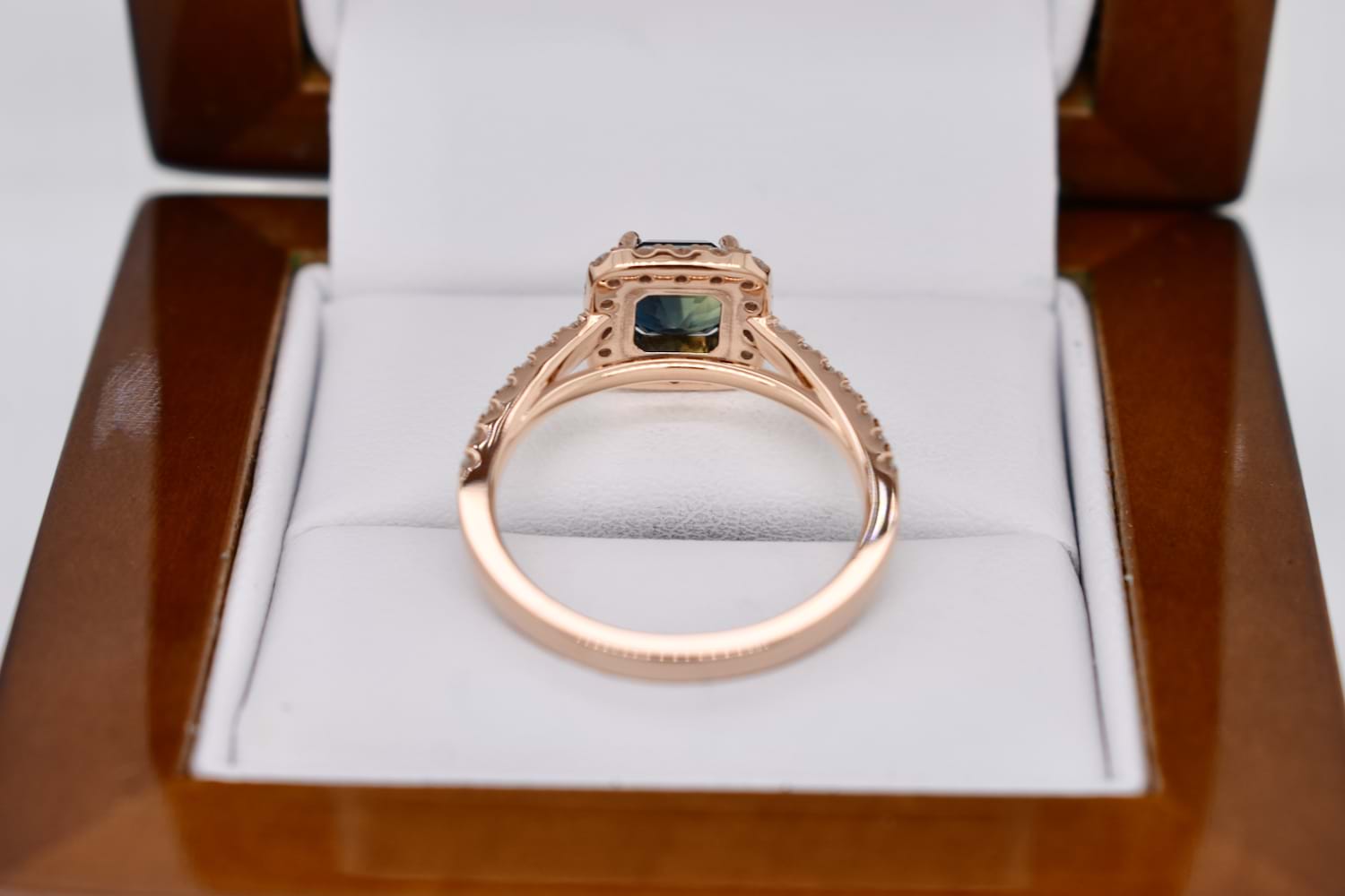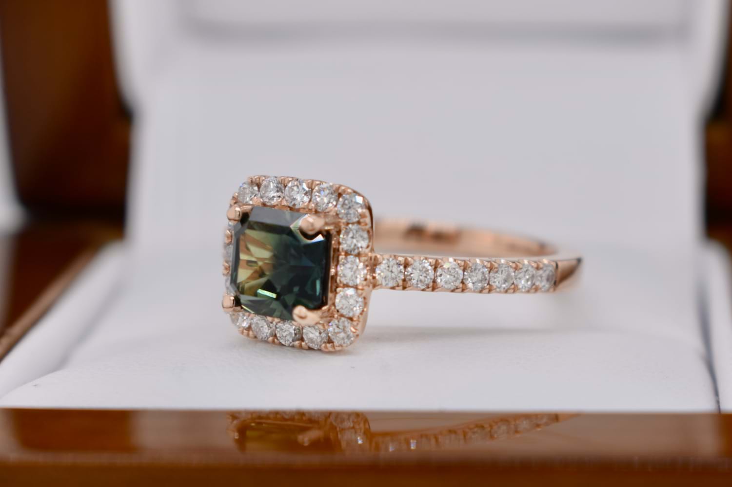This beautiful ring is crafted in 18ct rose gold, with a feature 1.51ct pointed top square emerald cut Australian green/blue sapphire in four claws, with a twinkling diamond halo which continues down the 1.96mm 1/4 round band. The diamonds in this ring equal 0.51ct FGVS-SI. This ring is designed with a gapped under rail so that it can be worn by itself or sit flush with other bands. Finger size N. Independent Valuation Supplied