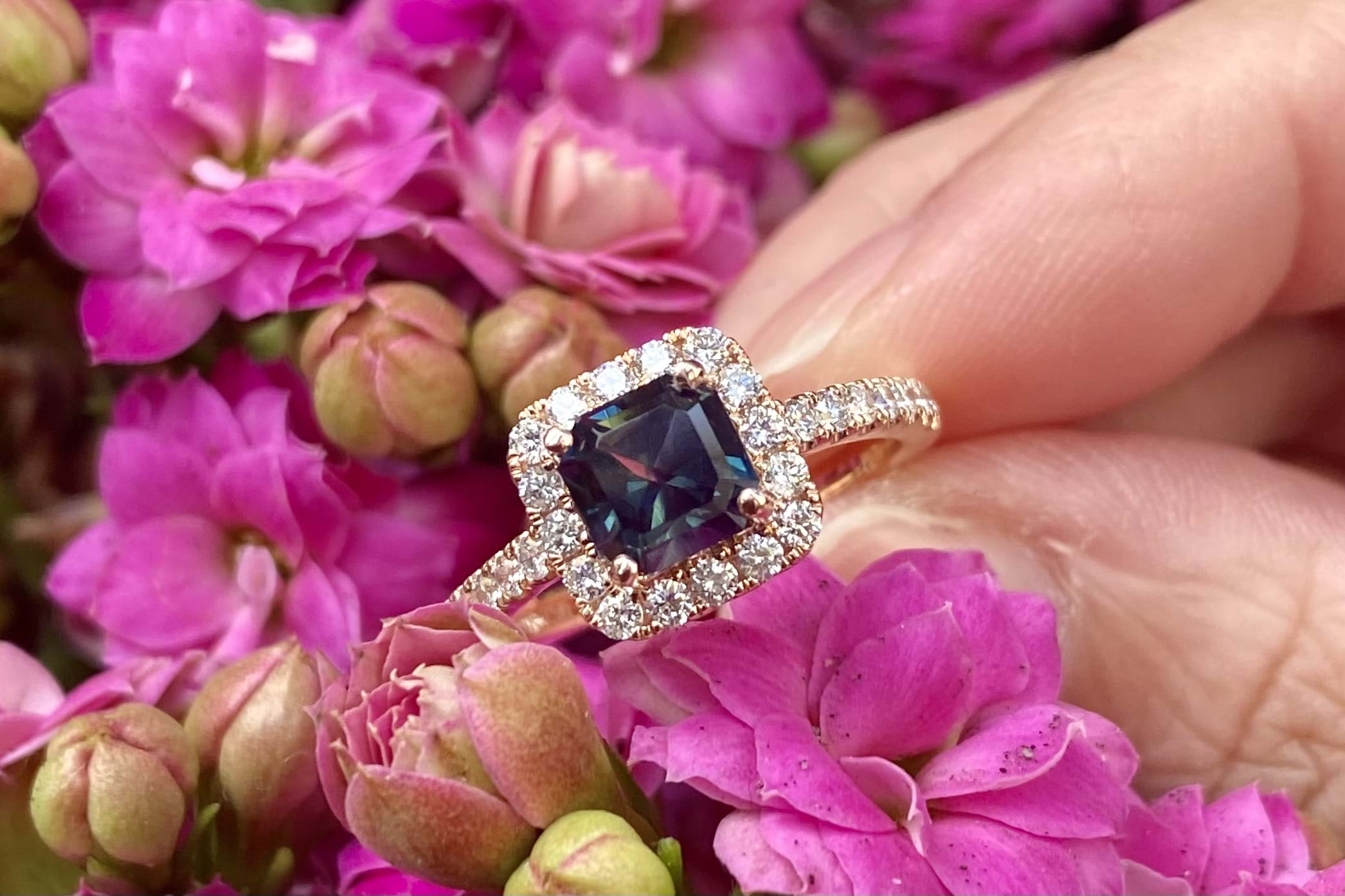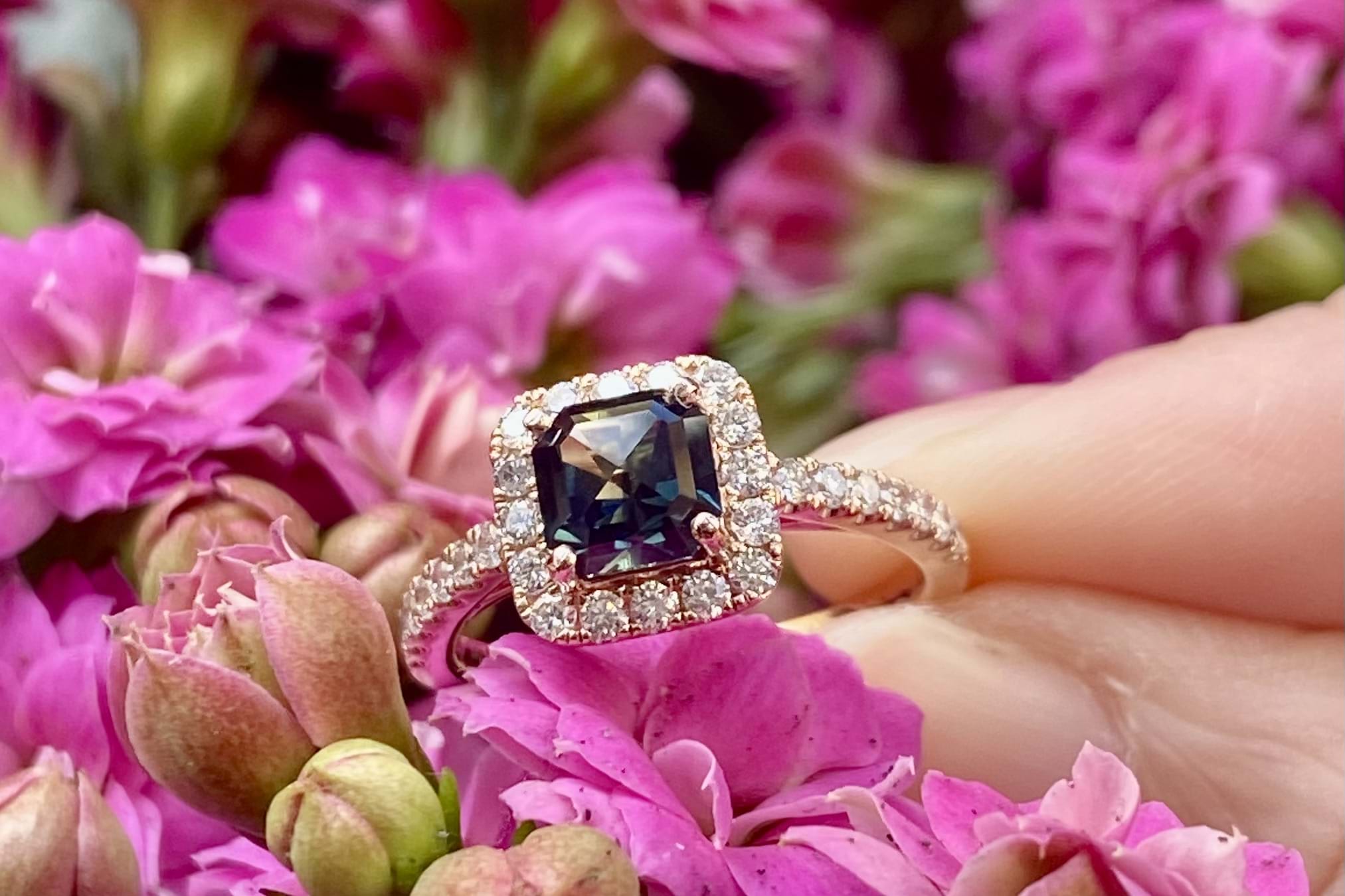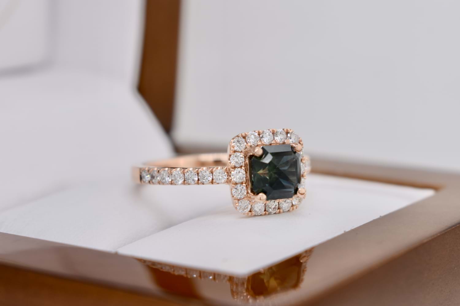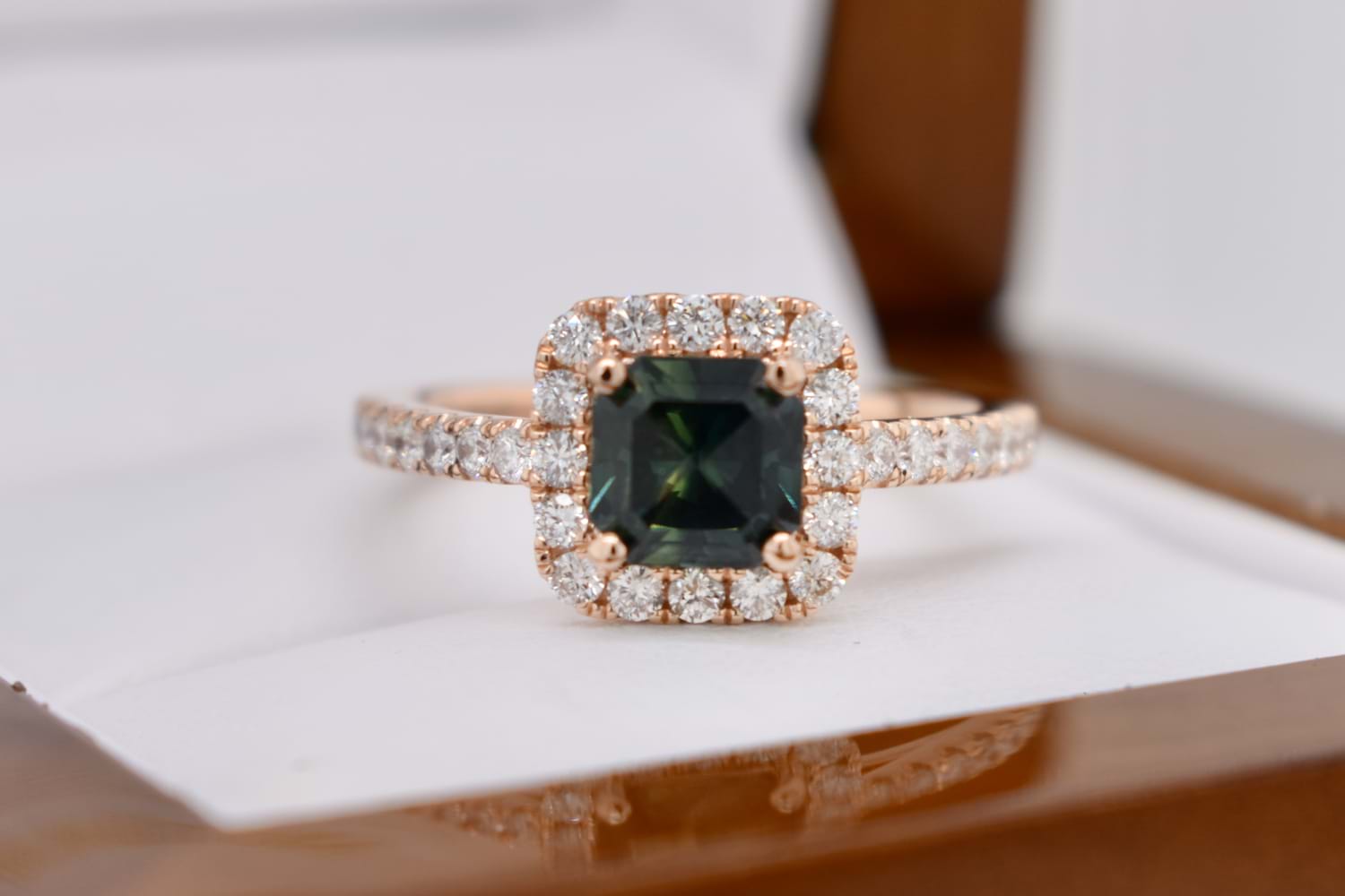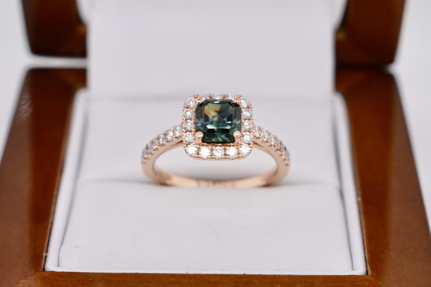 This beautiful ring is crafted in 18ct rose gold, with a feature 1.51ct pointed top square emerald cut Australian green/blue sapphire in four claws, with a twinkling diamond halo which continues down the 1.96mm 1/4 round band. The diamonds in this ring equal 0.51ct FGVS-SI. This ring is designed with a gapped under rail so that it can be worn by itself or sit flush with other bands. Finger size N. Independent Valuation Supplied