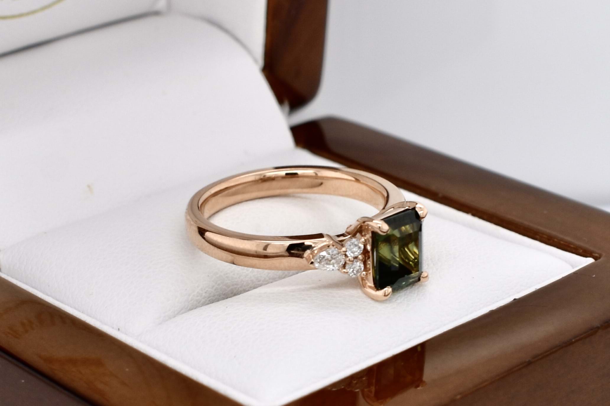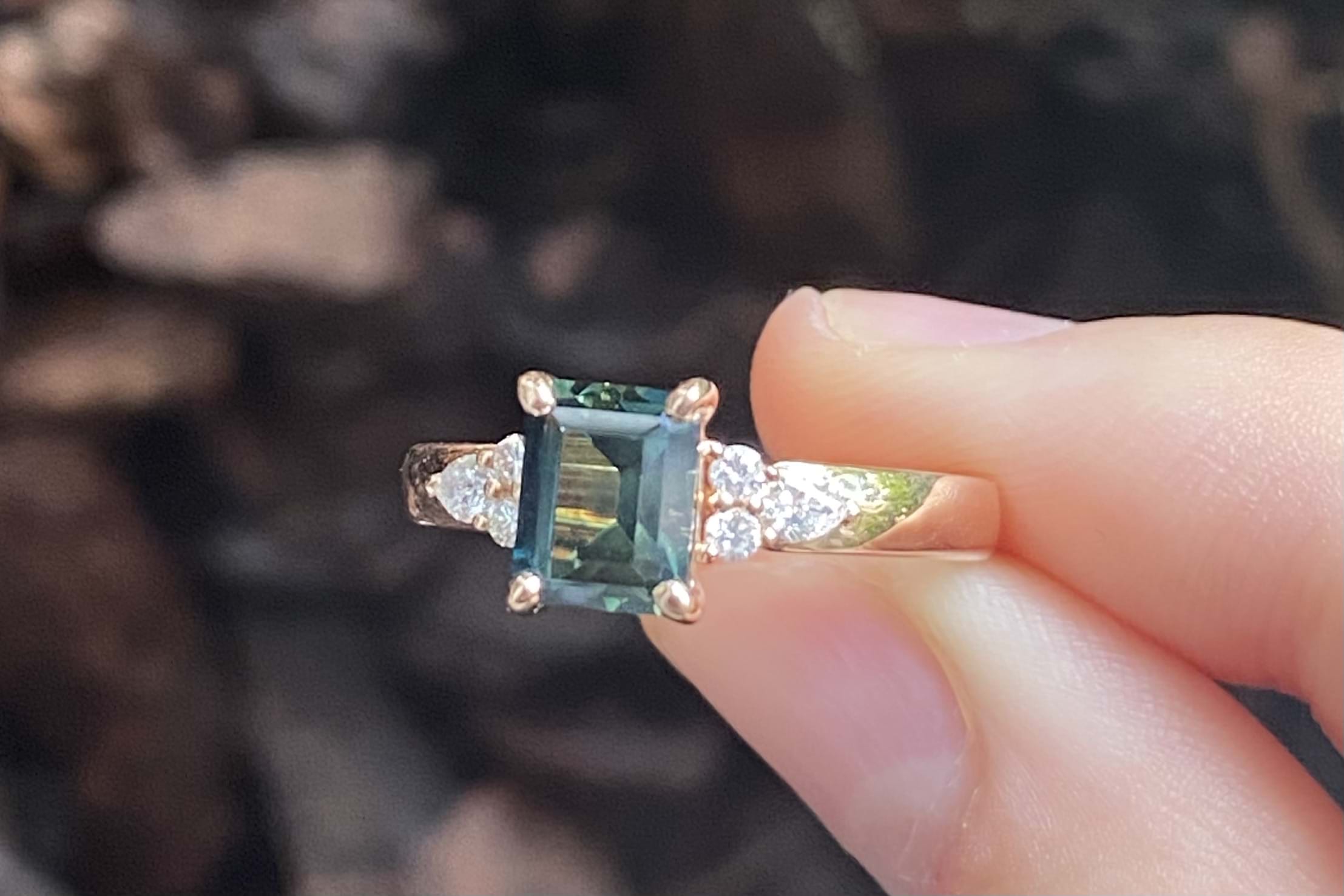 Beautiful 18ct rose gold ring, featuring a centre emerald cut teal Australian sapphire of 1.63ct, measuring 7.00x5.60x4.15mm, four claw set, paired with two round brilliant cut and one pear shaped diamond either side. Total off six diamonds equalling 0.20ct FG VS-SI, four round totalling 0.08ct and 2 pears totalling 0.12ct. Finished on a half round 2.71mm band. Finger size M+. Independent Valuation Supplied.