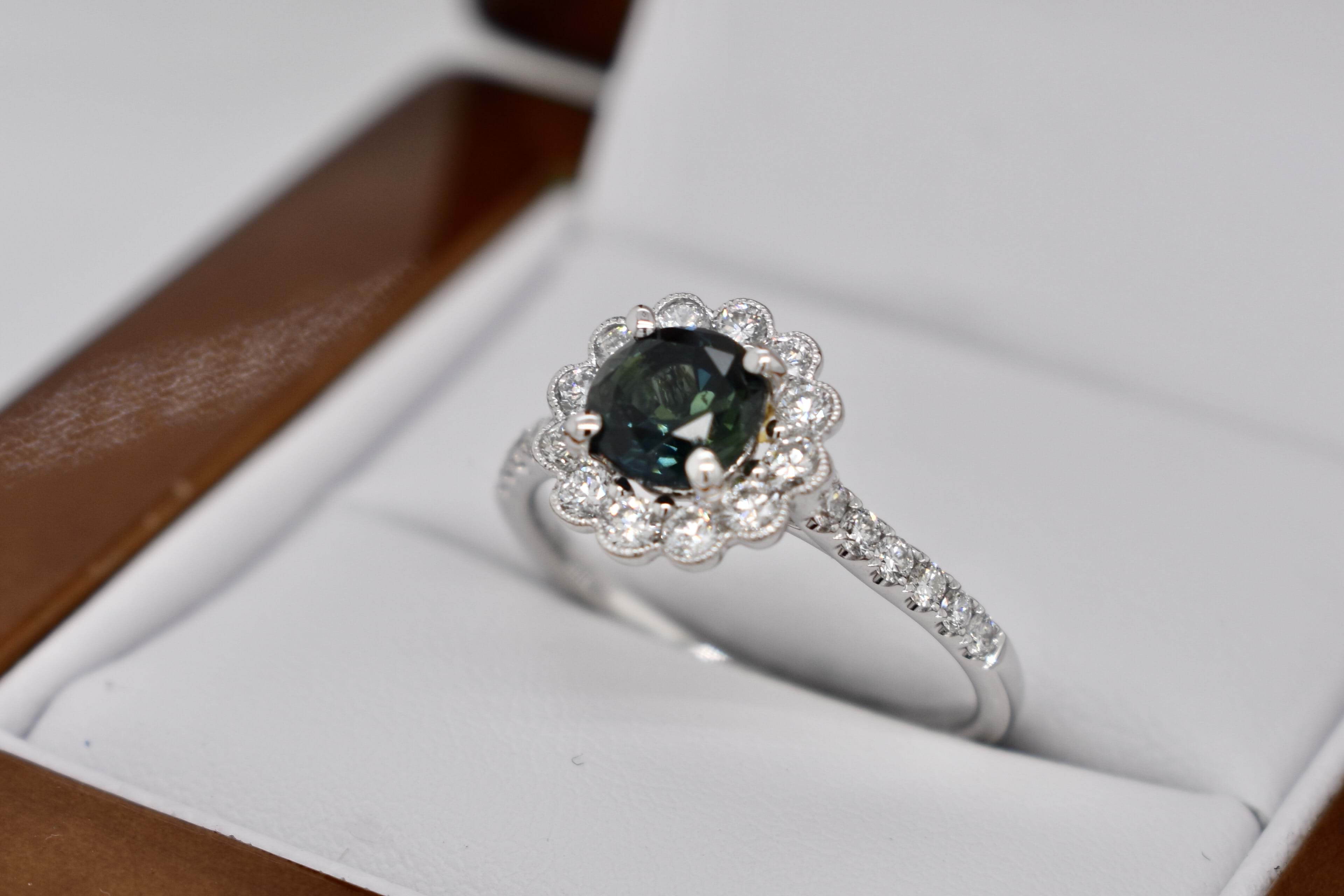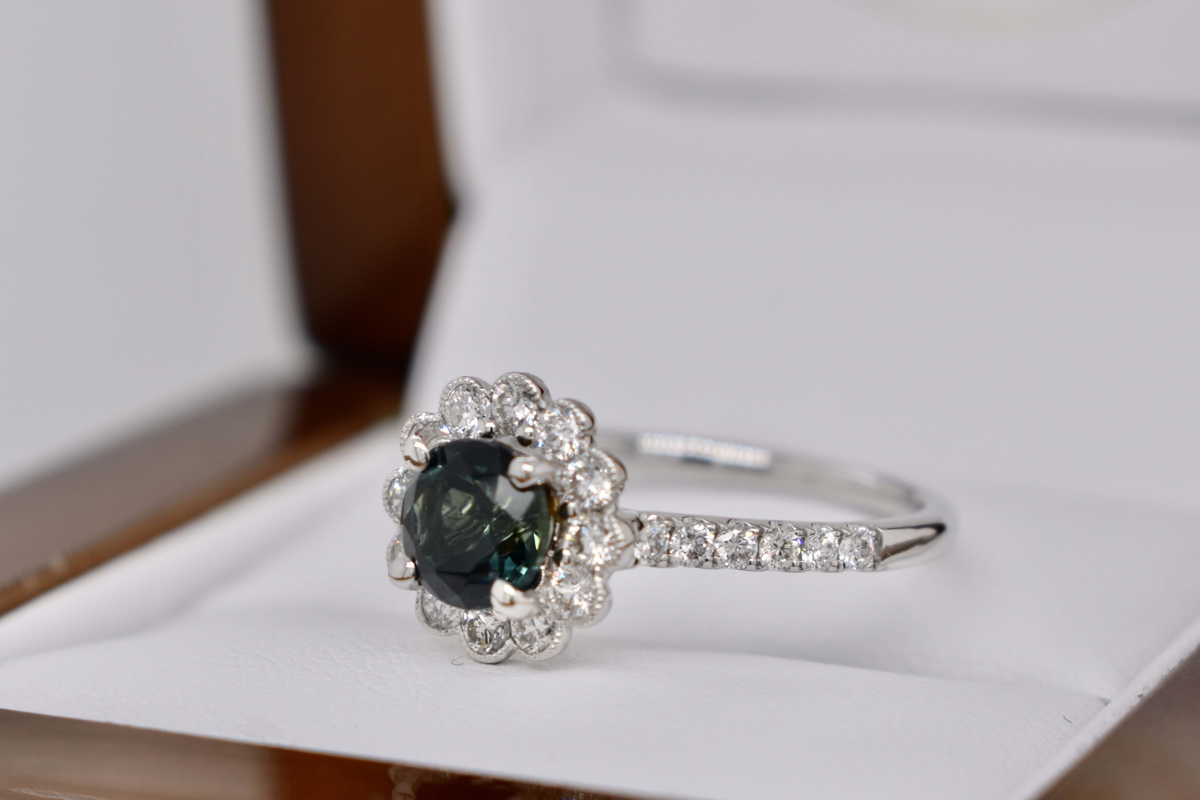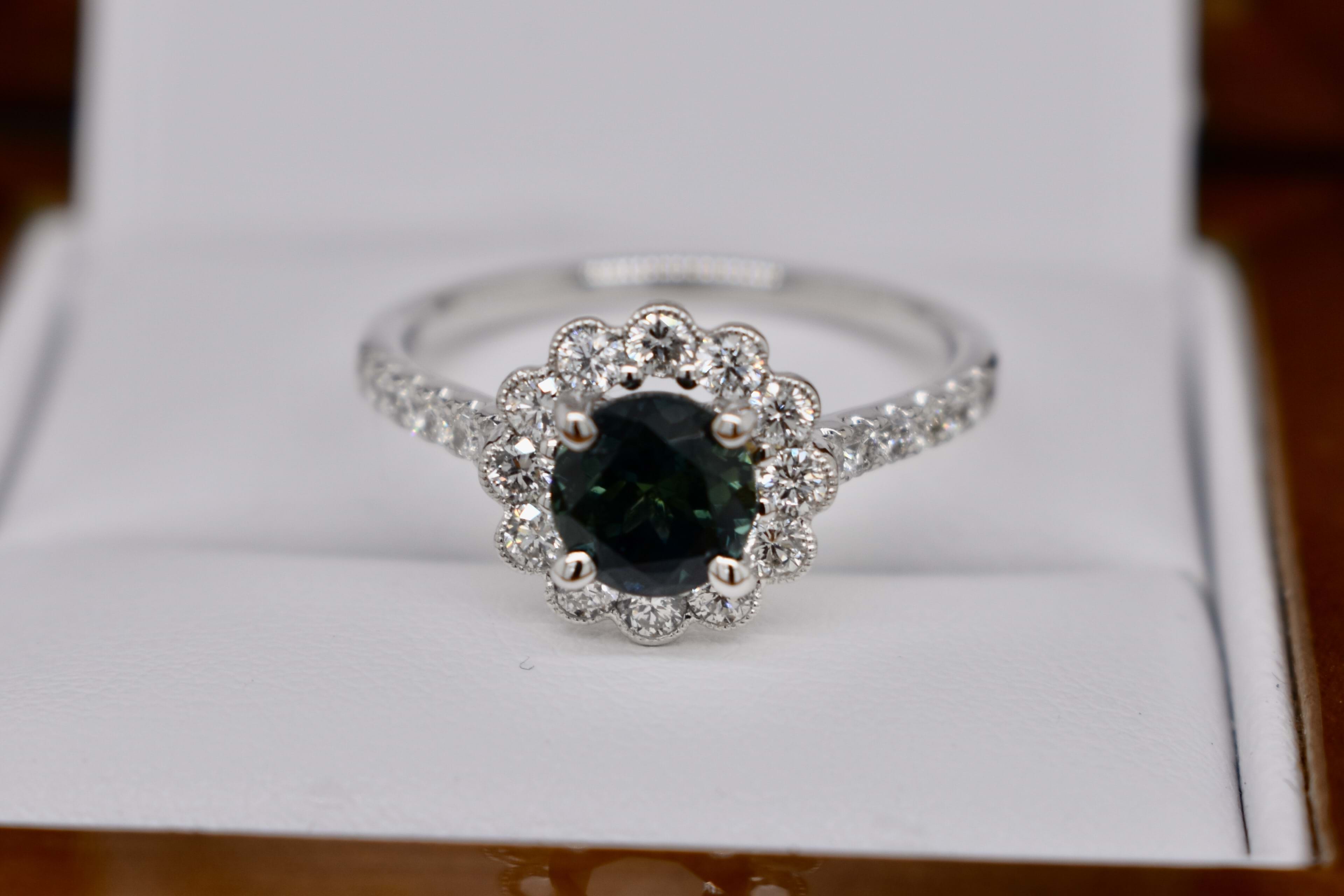 Beautiful and dainty, this ring looks like a daisy with a centre, feature 1.13ct round Australian teal sapphire, set in four claws and with a scalloped halo of shimmering white diamonds which continue down the shoulders, with charming millgrain detailing. Total of twenty four diamonds equalling 0.58ct FG/VS-SI. This ring has been designed to be worn by itself or sit flush with other bands. Finger size M+