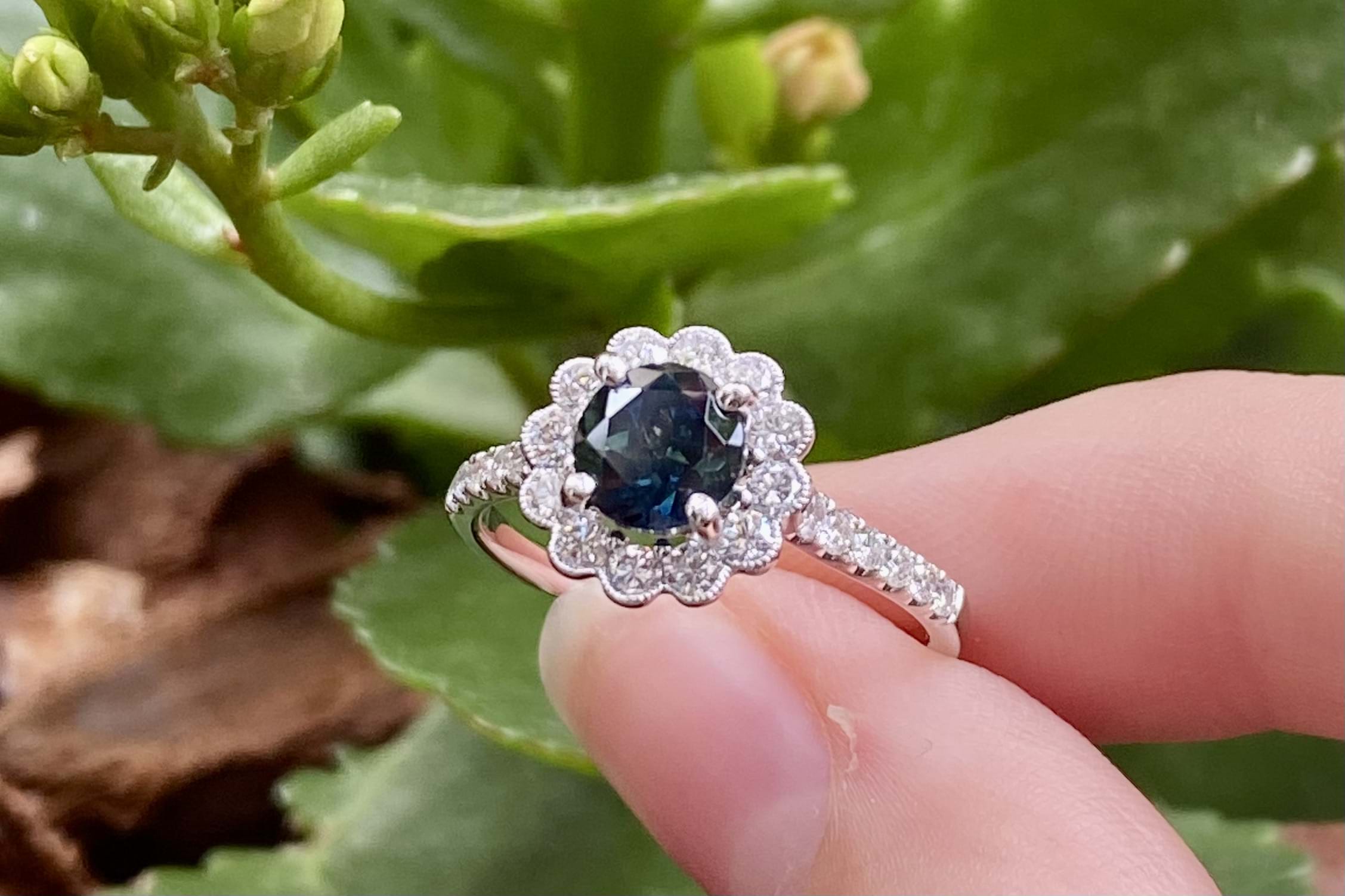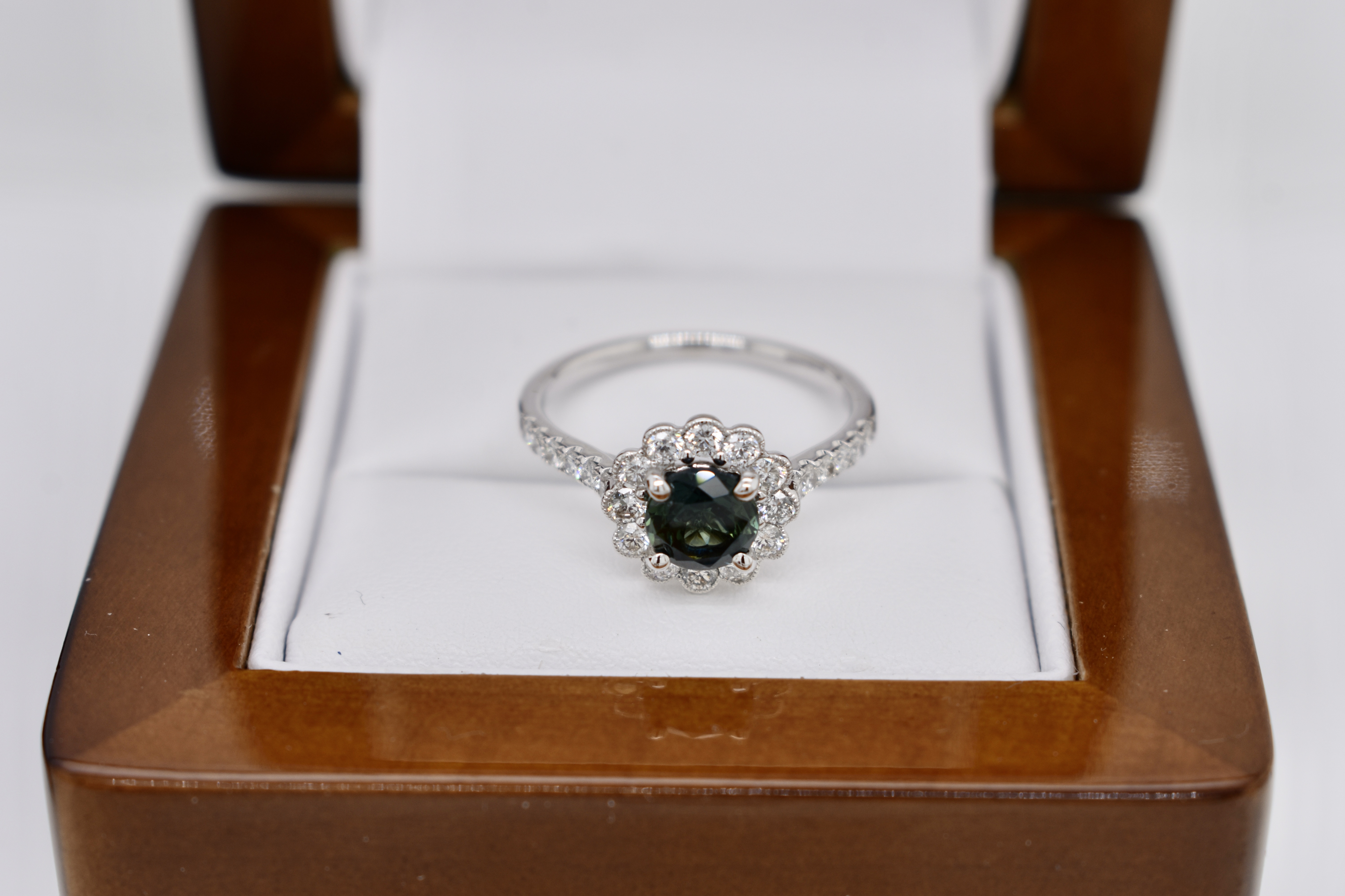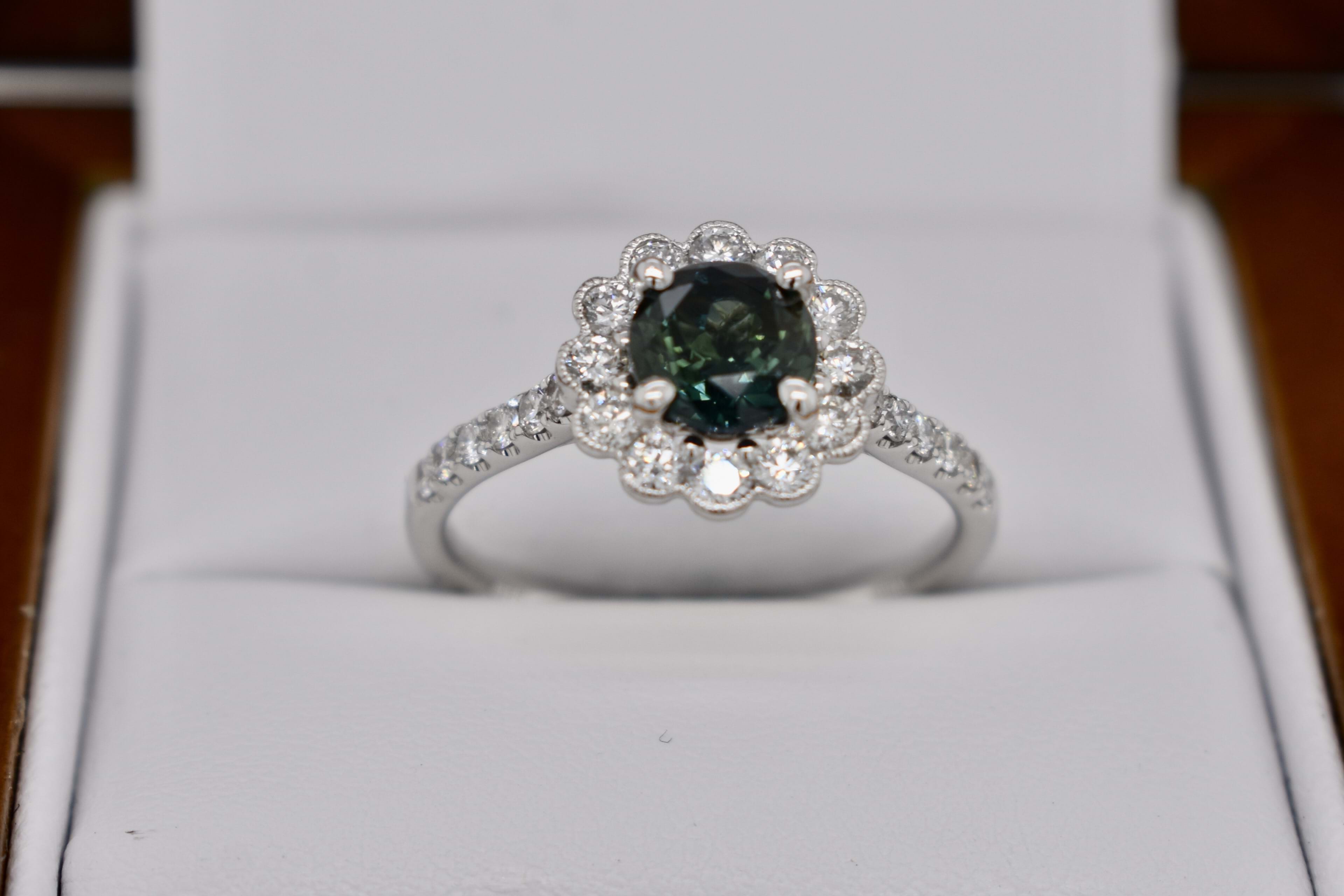 Beautiful and dainty, this ring looks like a daisy with a centre, feature 1.13ct round Australian teal sapphire, set in four claws and with a scalloped halo of shimmering white diamonds which continue down the shoulders, with charming millgrain detailing. Total of twenty four diamonds equalling 0.58ct FG/VS-SI. This ring has been designed to be worn by itself or sit flush with other bands. Finger size M+