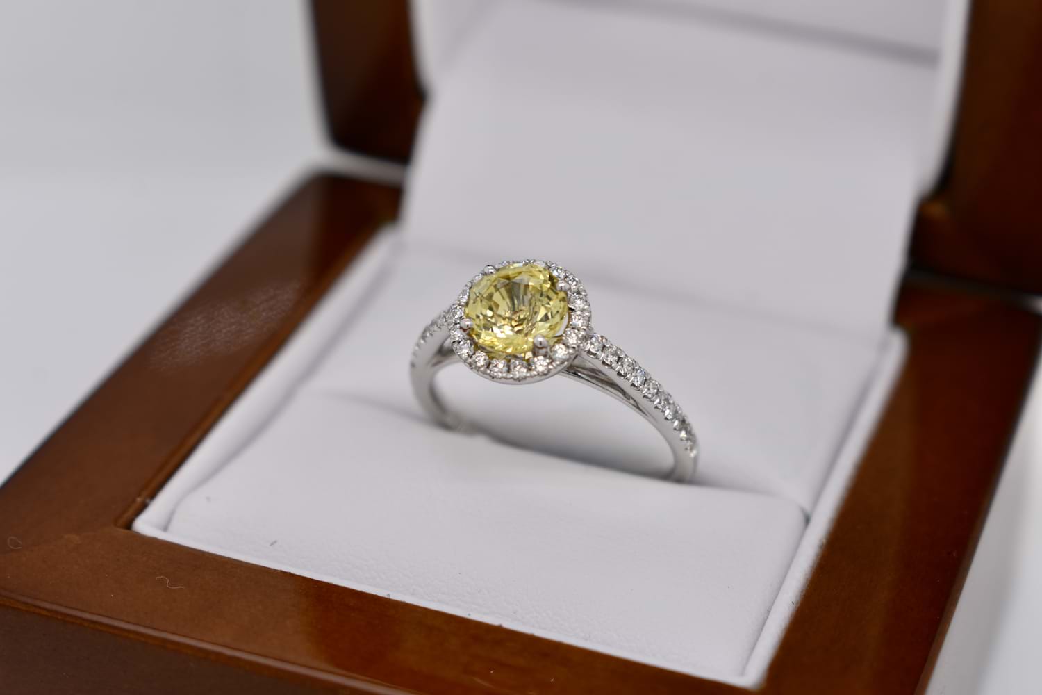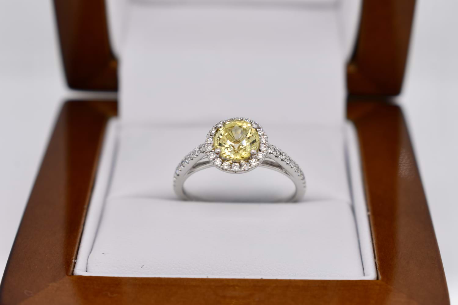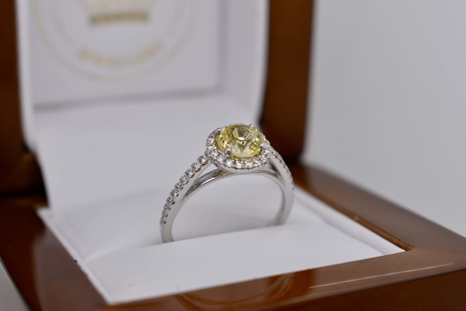 This sparkly, elegant ring is crafted in 18ct white gold and set with a centre 1.51ct round, bright yellow sapphire 4 claw set and surrounded by a scintillating halo of white FG/VS diamonds which continue down the shoulders and finish off as a plain band. This ring has been designed to sit flush with other bands. Finger size M+