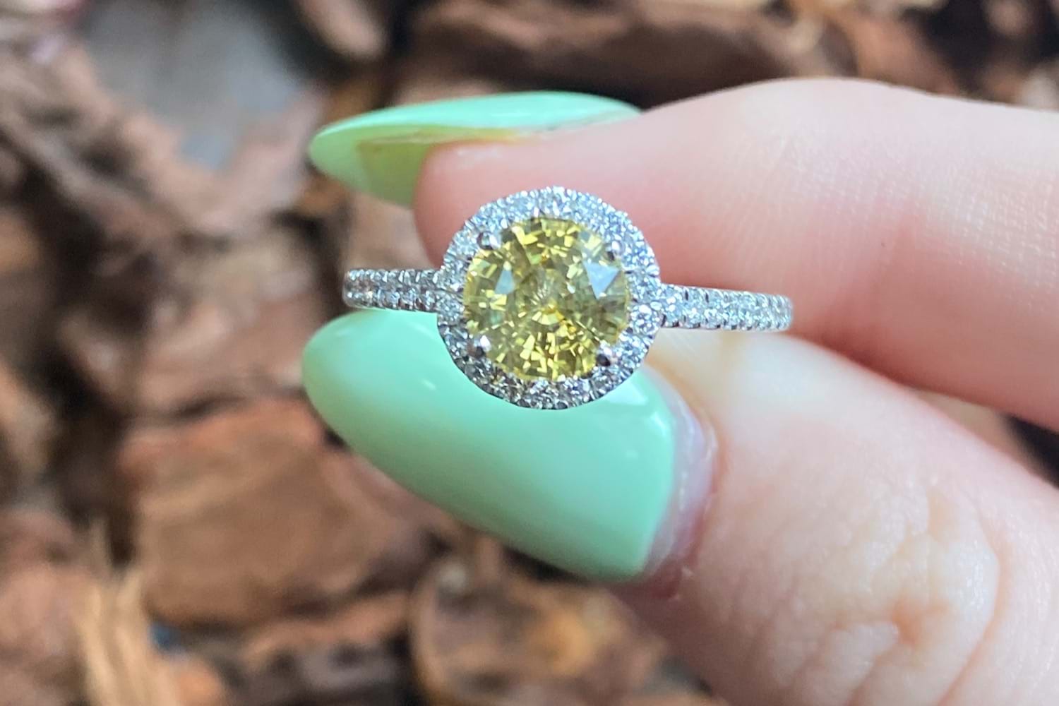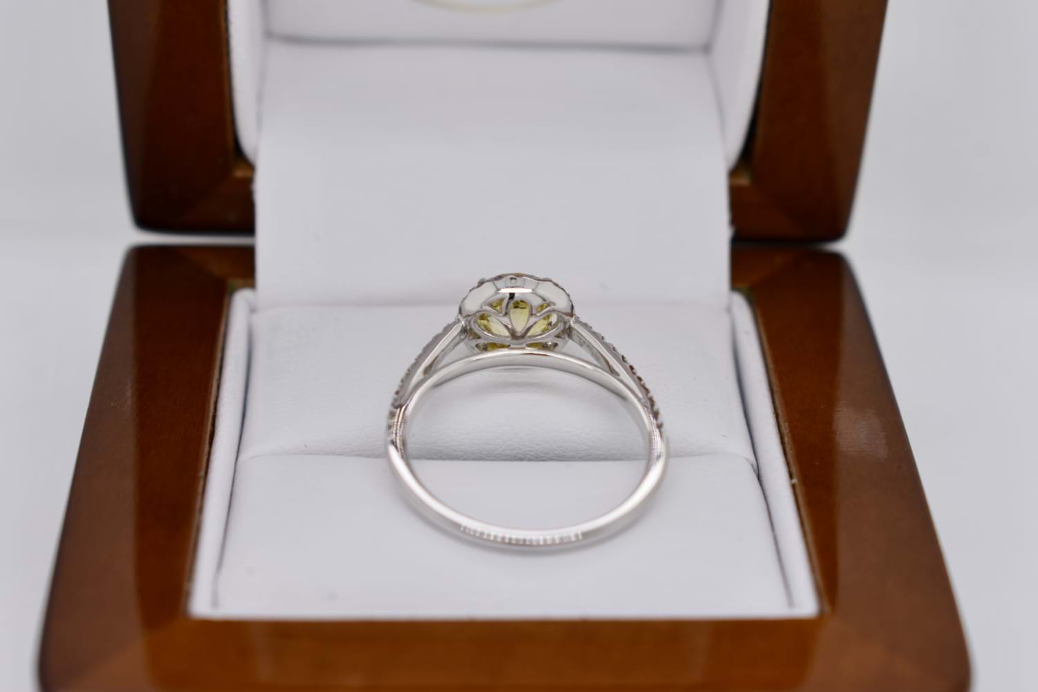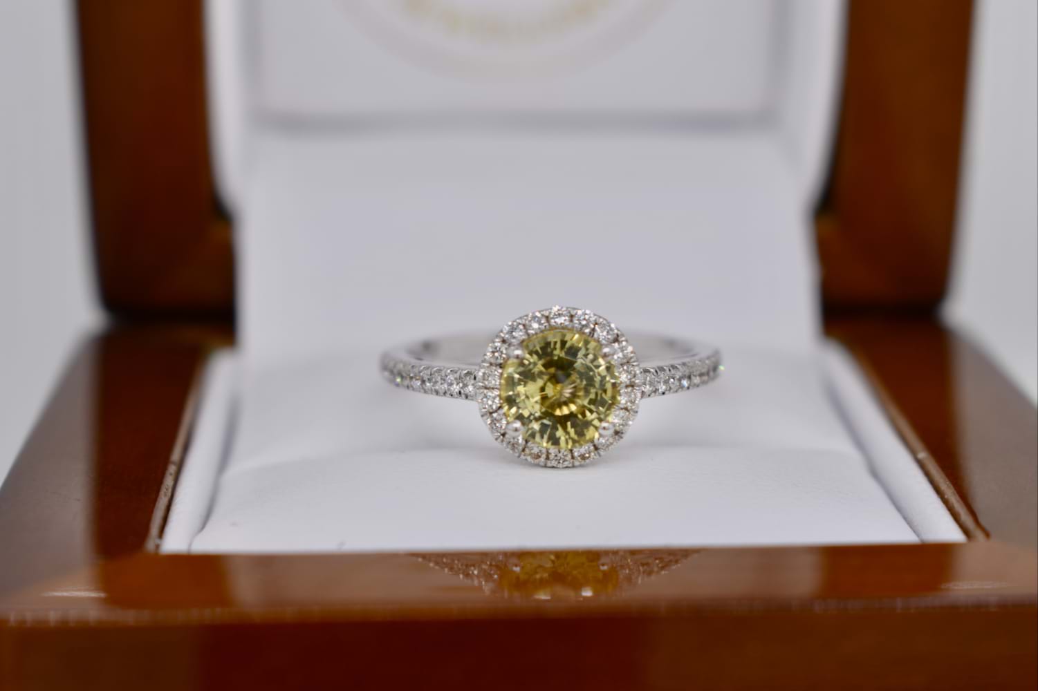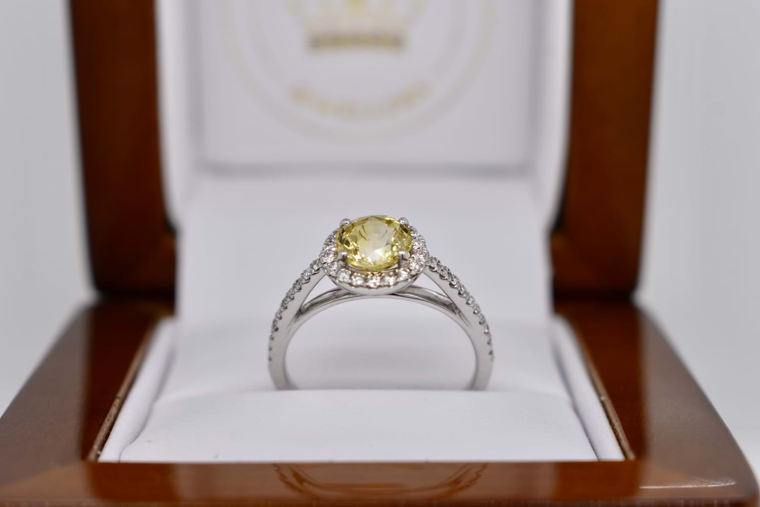 This sparkly, elegant ring is crafted in 18ct white gold and set with a centre 1.51ct round, bright yellow sapphire 4 claw set and surrounded by a scintillating halo of white FG/VS diamonds which continue down the shoulders and finish off as a plain band. This ring has been designed to sit flush with other bands. Finger size M+