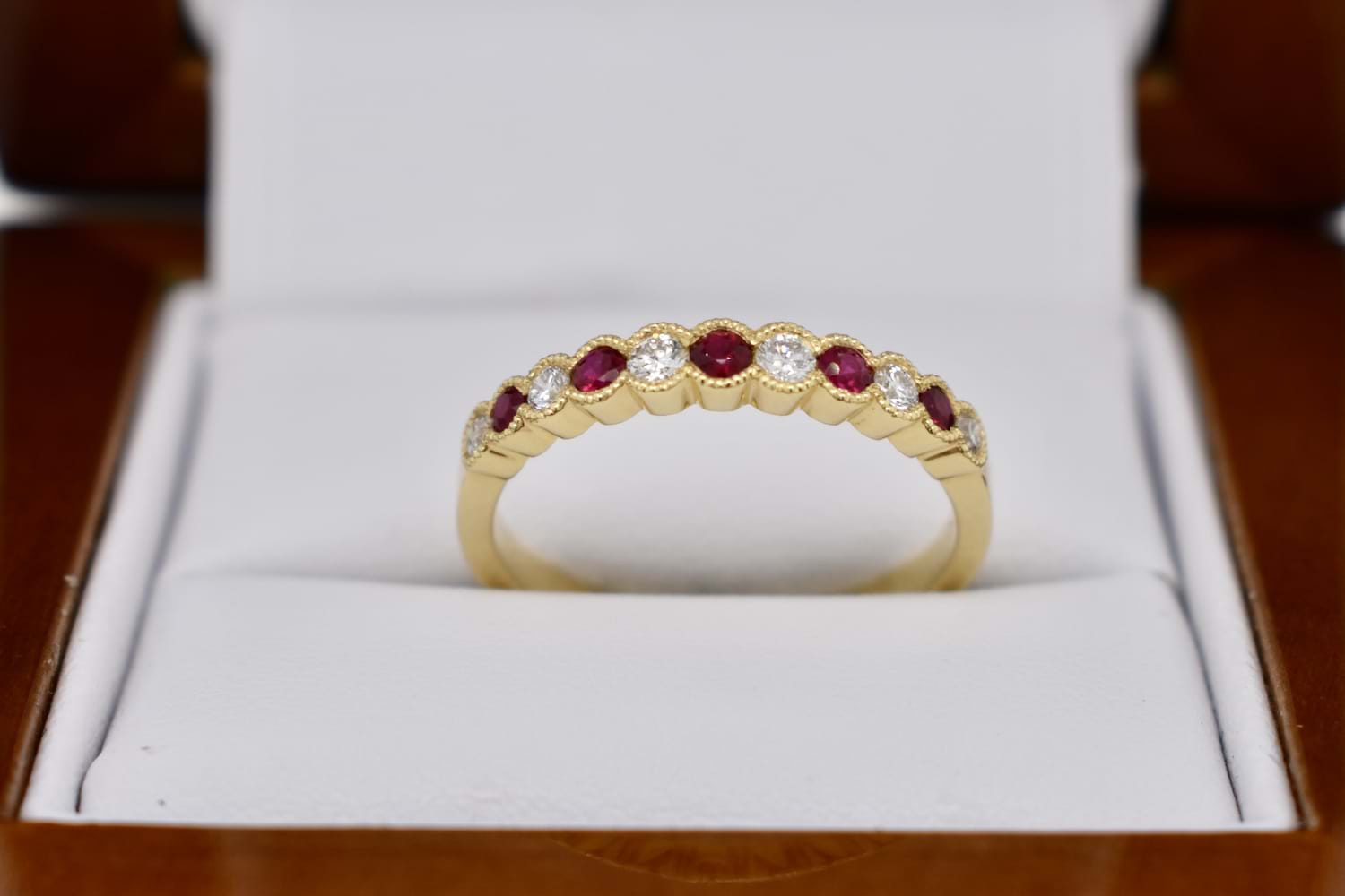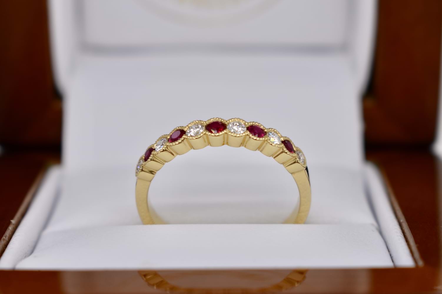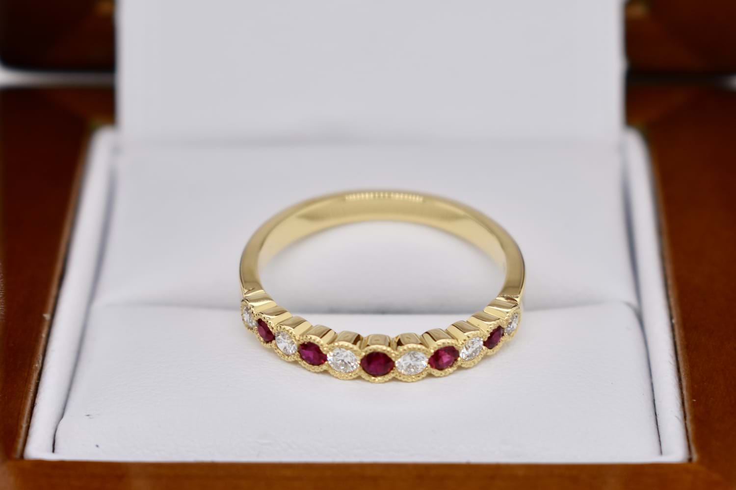 A timeless and elegant piece, this ring is crafted in 18ct yellow gold and set with a total of eleven stones. Consisting of alternating five round, bright dark red rubies equalling 0.20ct and six sparkling white RBC diamonds equalling 0.19ct FG VS-SI. This ring can be worn by itself or as a stacking piece which will fit beautifully alongside other rings. Finger size M+