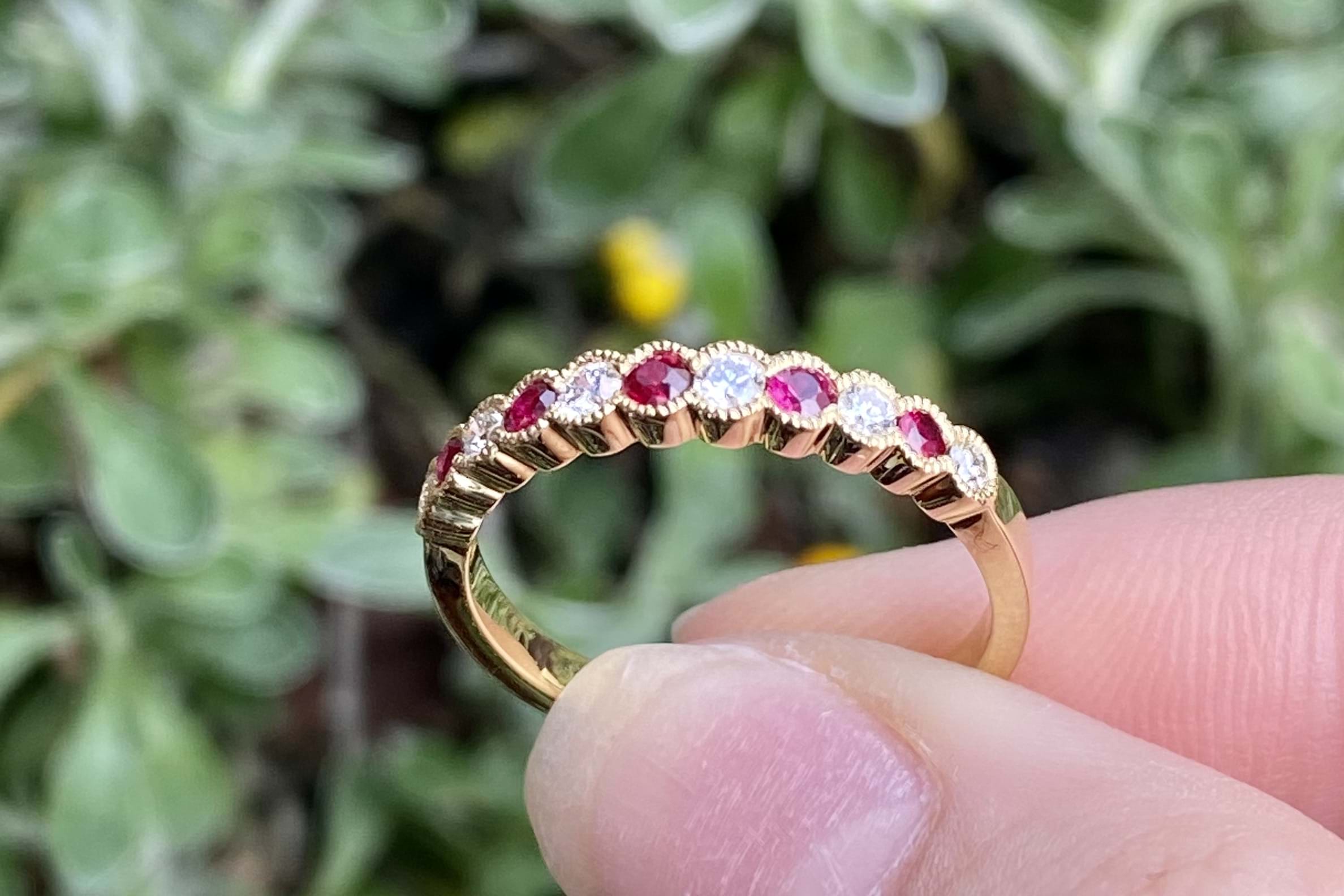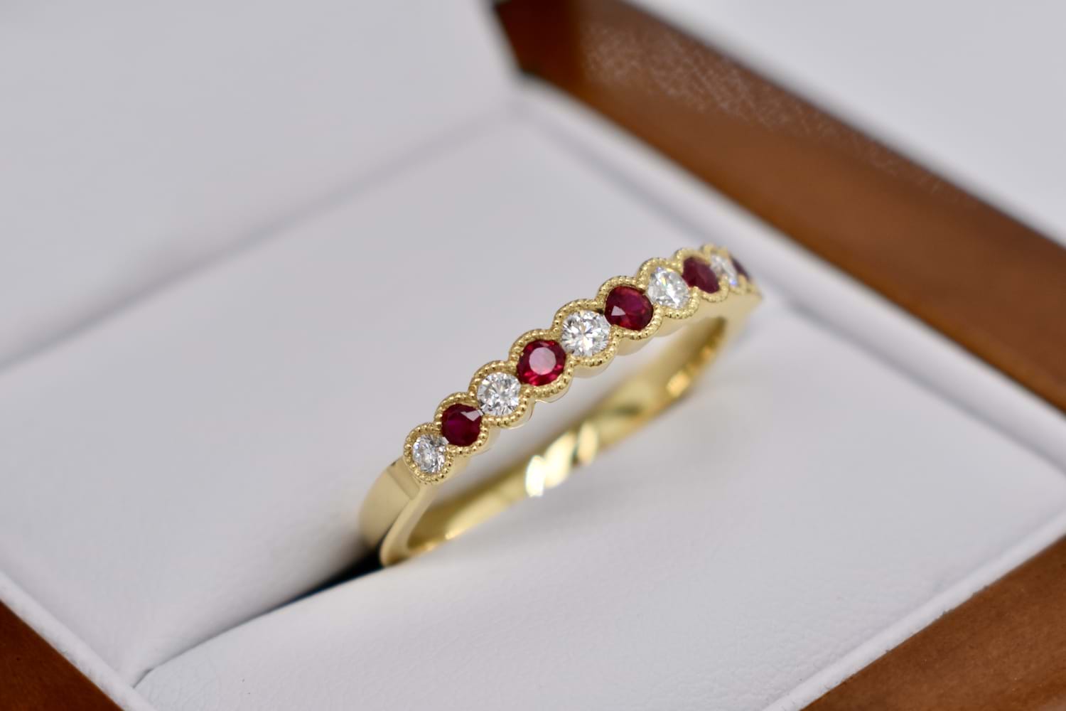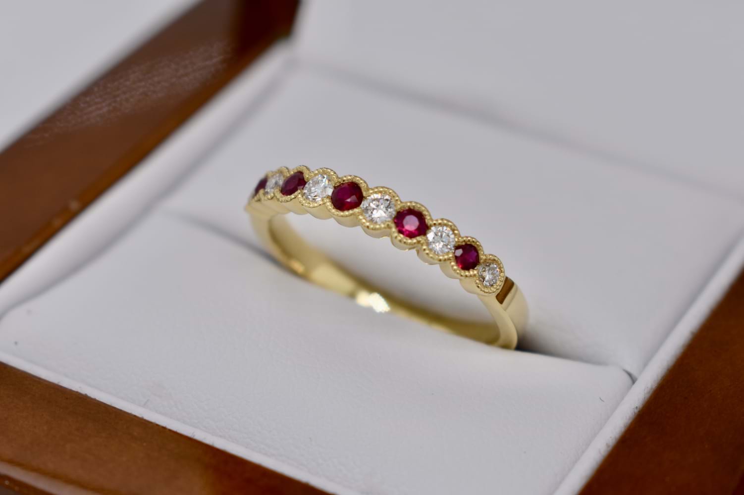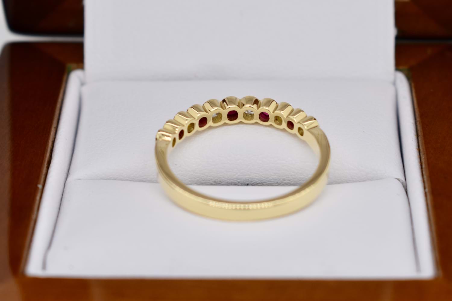 A timeless and elegant piece, this ring is crafted in 18ct yellow gold and set with a total of eleven stones. Consisting of alternating five round, bright dark red rubies equalling 0.20ct and six sparkling white RBC diamonds equalling 0.19ct FG VS-SI. This ring can be worn by itself or as a stacking piece which will fit beautifully alongside other rings. Finger size M+