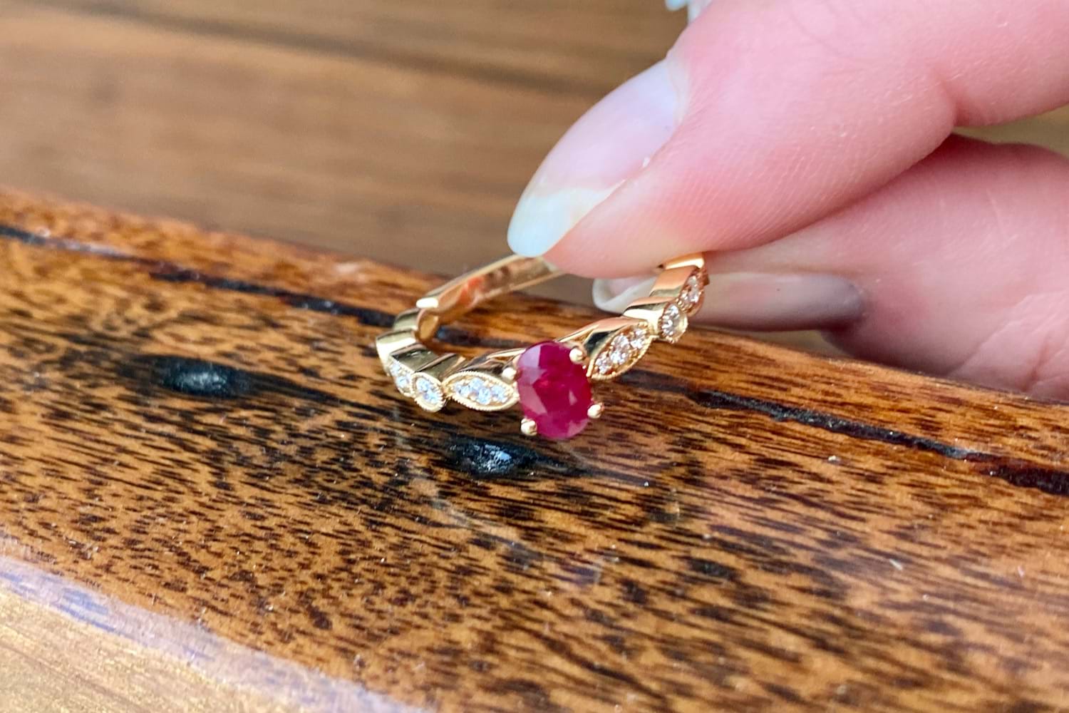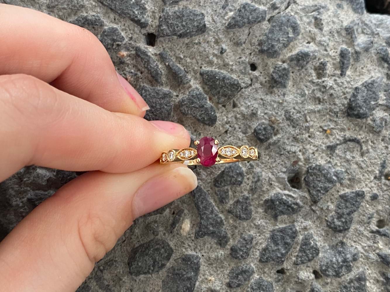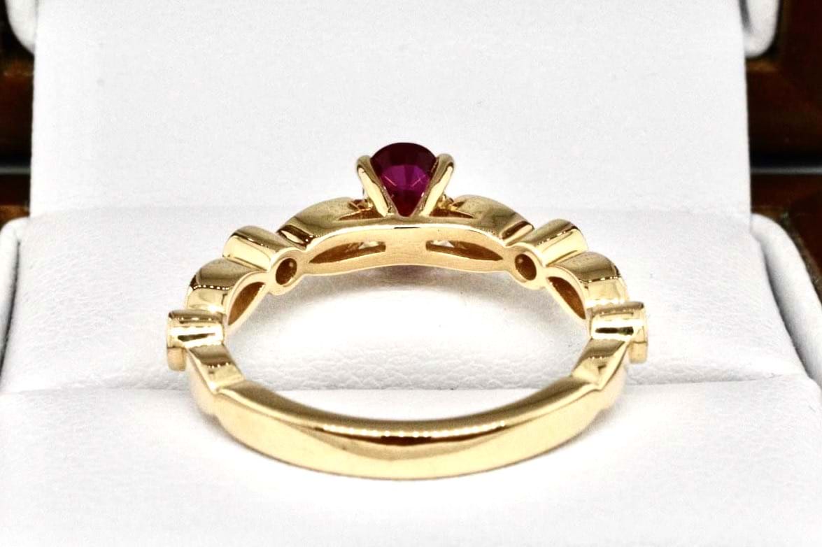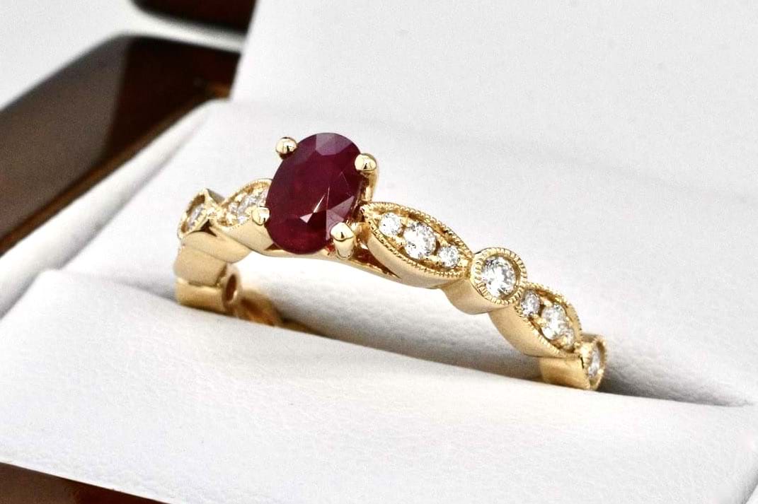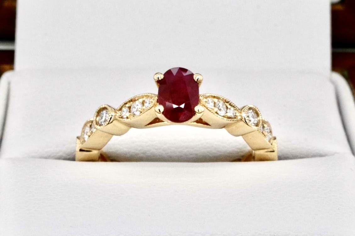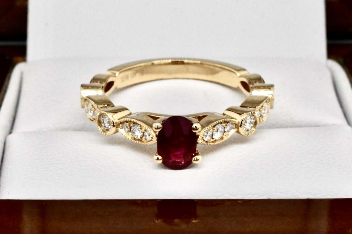 This Art Deco inspired ring has been crafted in 18ct yellow gold with an oval 0.63ct ruby four claw set and shimmering diamonds set into mill grain marquise and round shape bezels in the shoulders. Total diamond content equals 0.24cts FG/SI. Finger size M. Independent Valuation Supplied