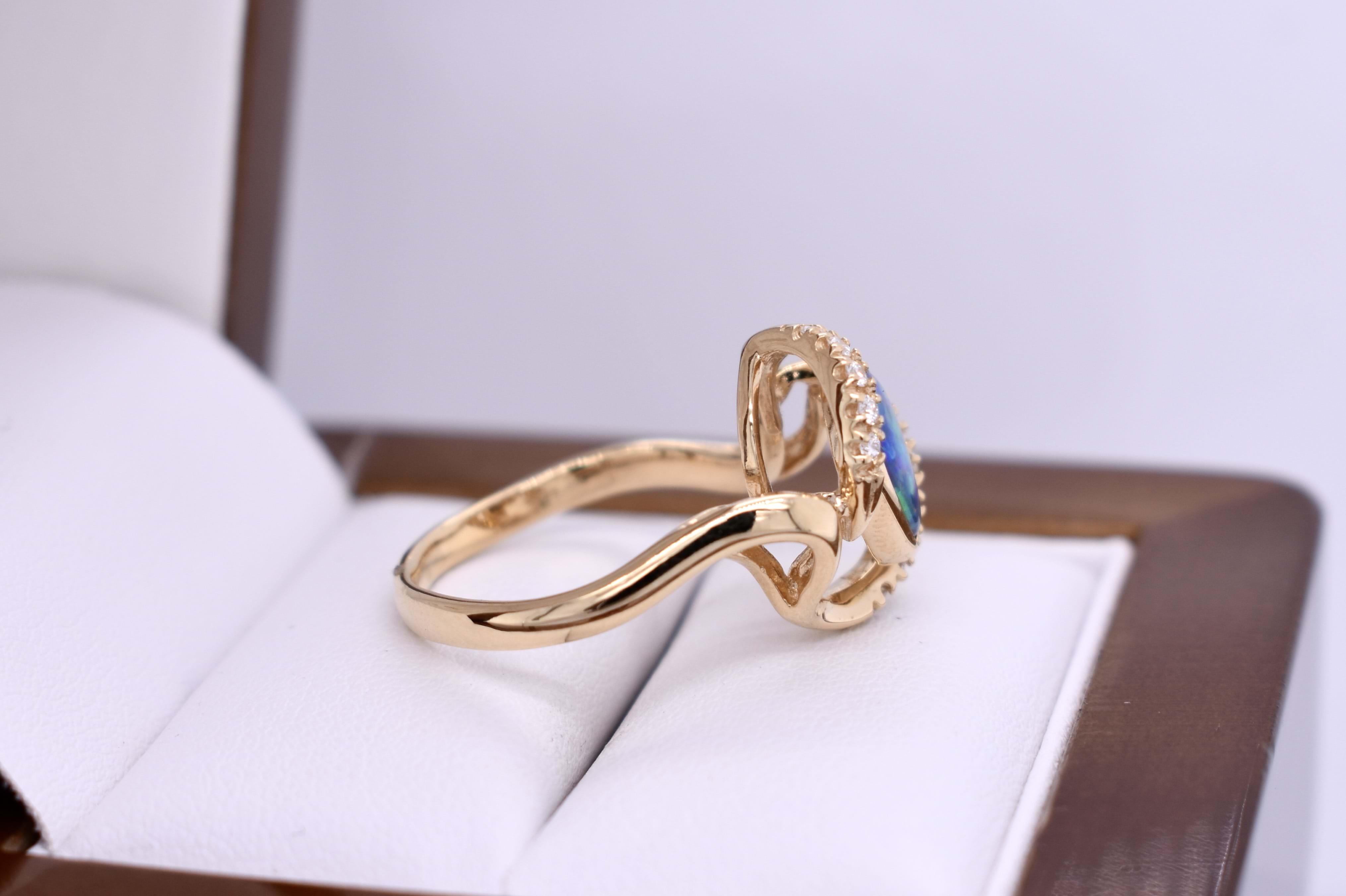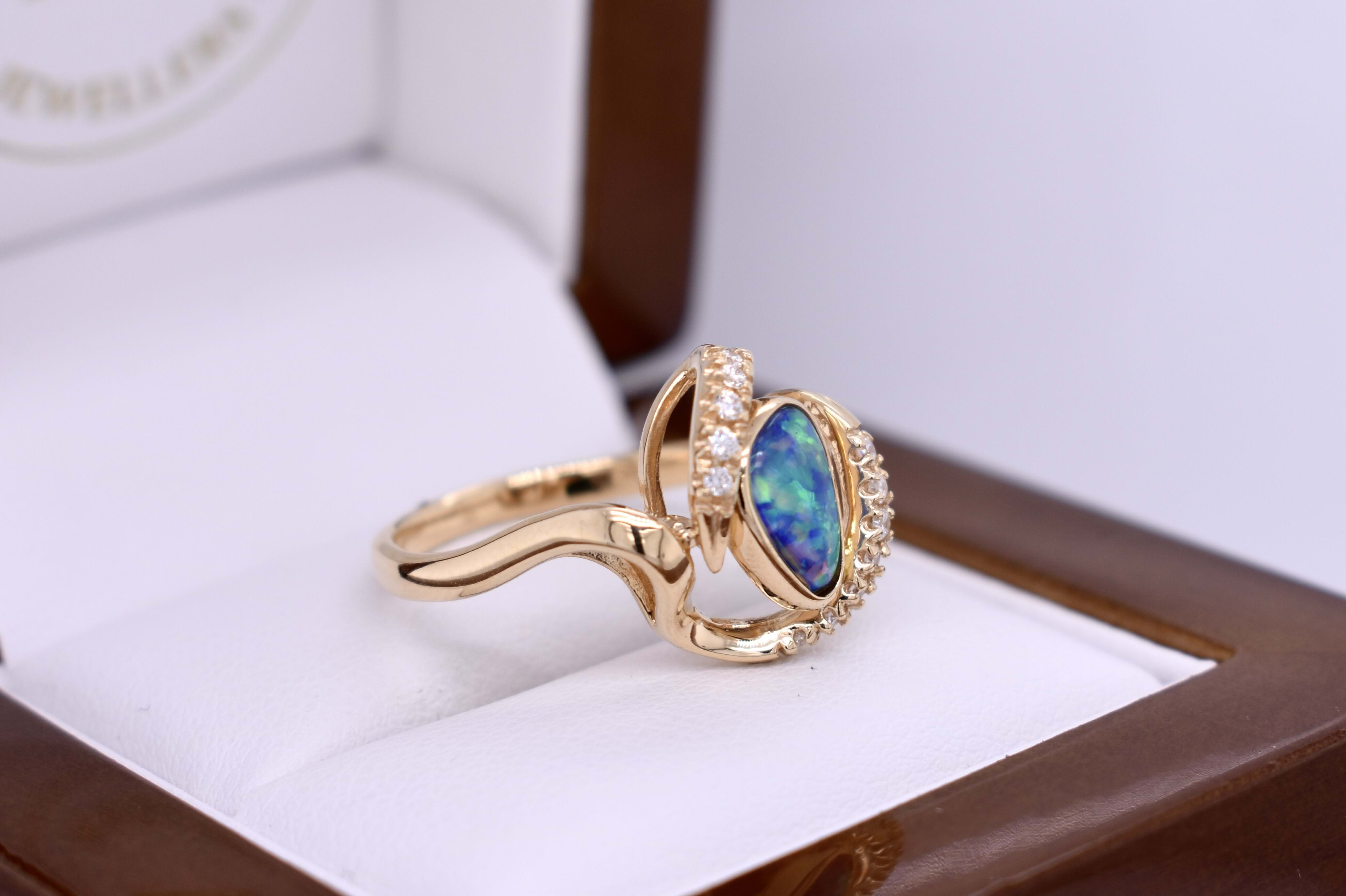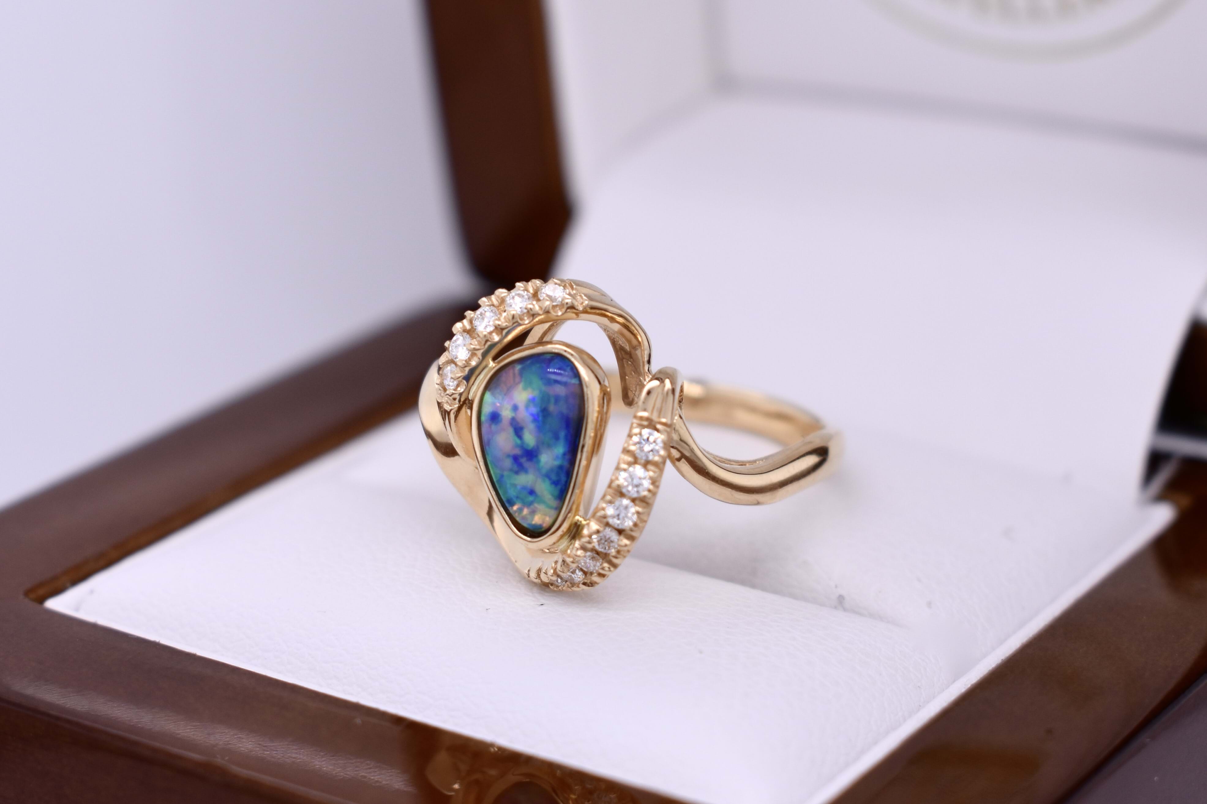 This awesome swirl ring featuring a Lightning Ridge solid opal of 0.70ct, measuring 8.75x5.41x2.25mm, translucent with a mixed pattern of bright blue and green throughout. The opal is bezel set in 18ct yellow gold, surrounded by swirl border with micro cut down claw set round brilliant cut diamonds, measuring 1.30mm, totalling 0.12ct G VS . Finished on a half round 2.08mm tapered band. Finger size N. Independent Valuation Supplied.