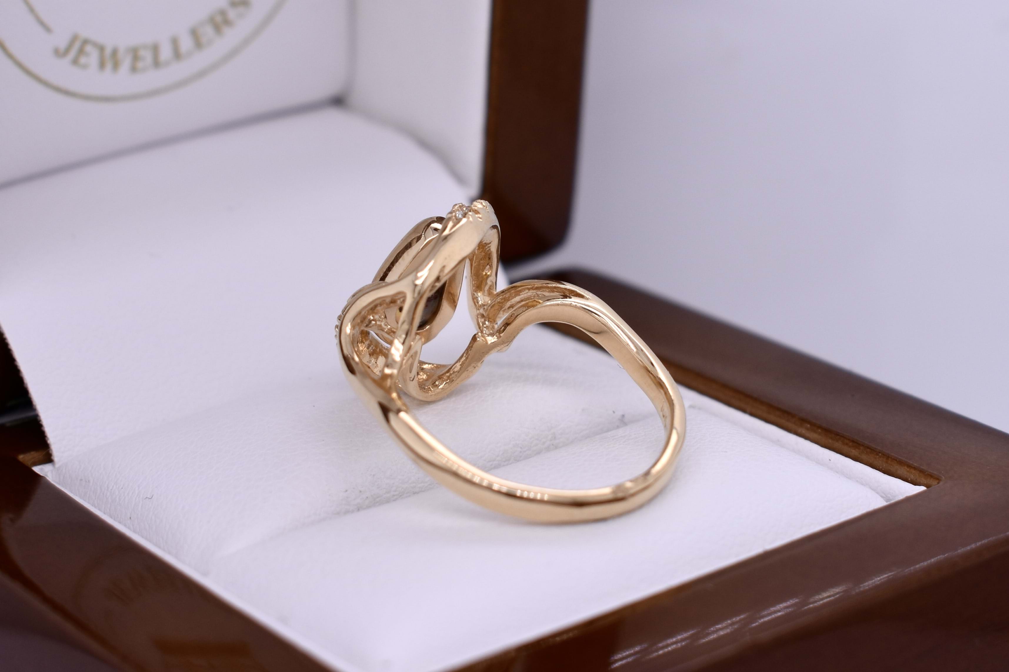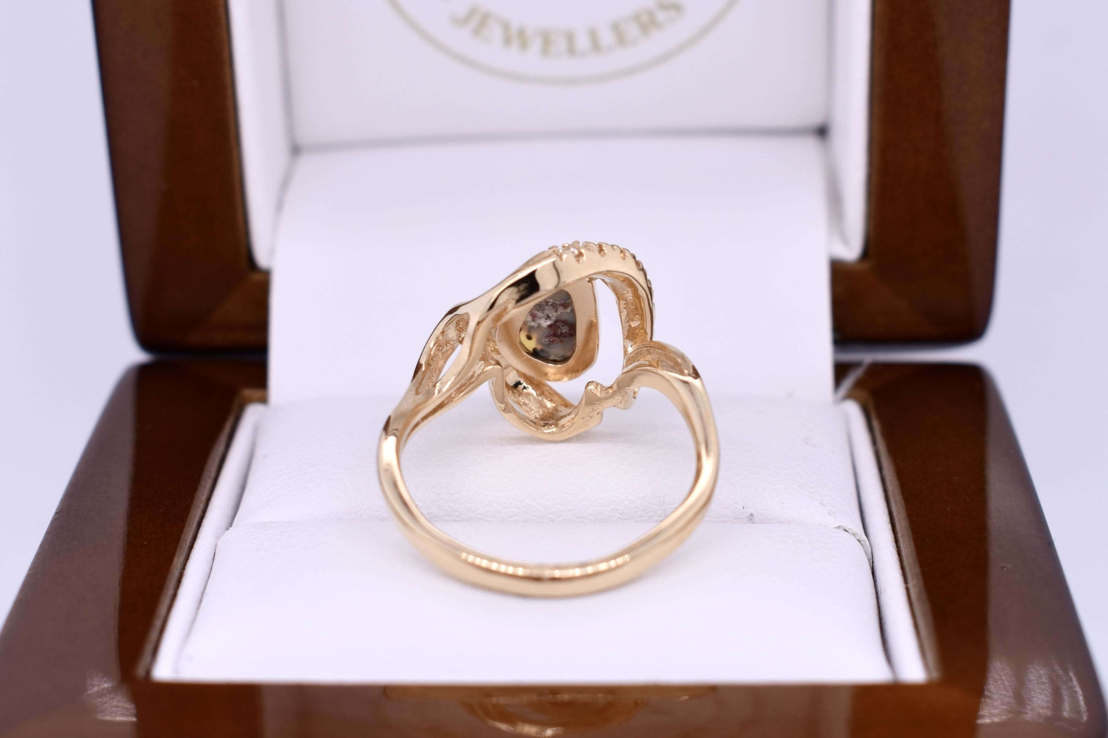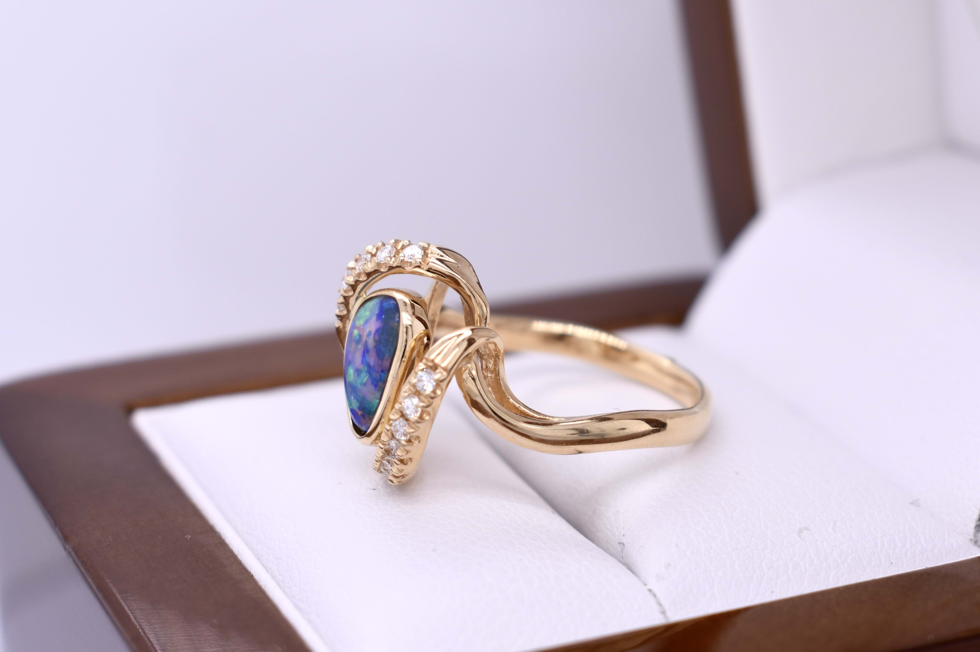 This awesome swirl ring featuring a Lightning Ridge solid opal of 0.70ct, measuring 8.75x5.41x2.25mm, translucent with a mixed pattern of bright blue and green throughout. The opal is bezel set in 18ct yellow gold, surrounded by swirl border with micro cut down claw set round brilliant cut diamonds, measuring 1.30mm, totalling 0.12ct G VS . Finished on a half round 2.08mm tapered band. Finger size N. Independent Valuation Supplied.