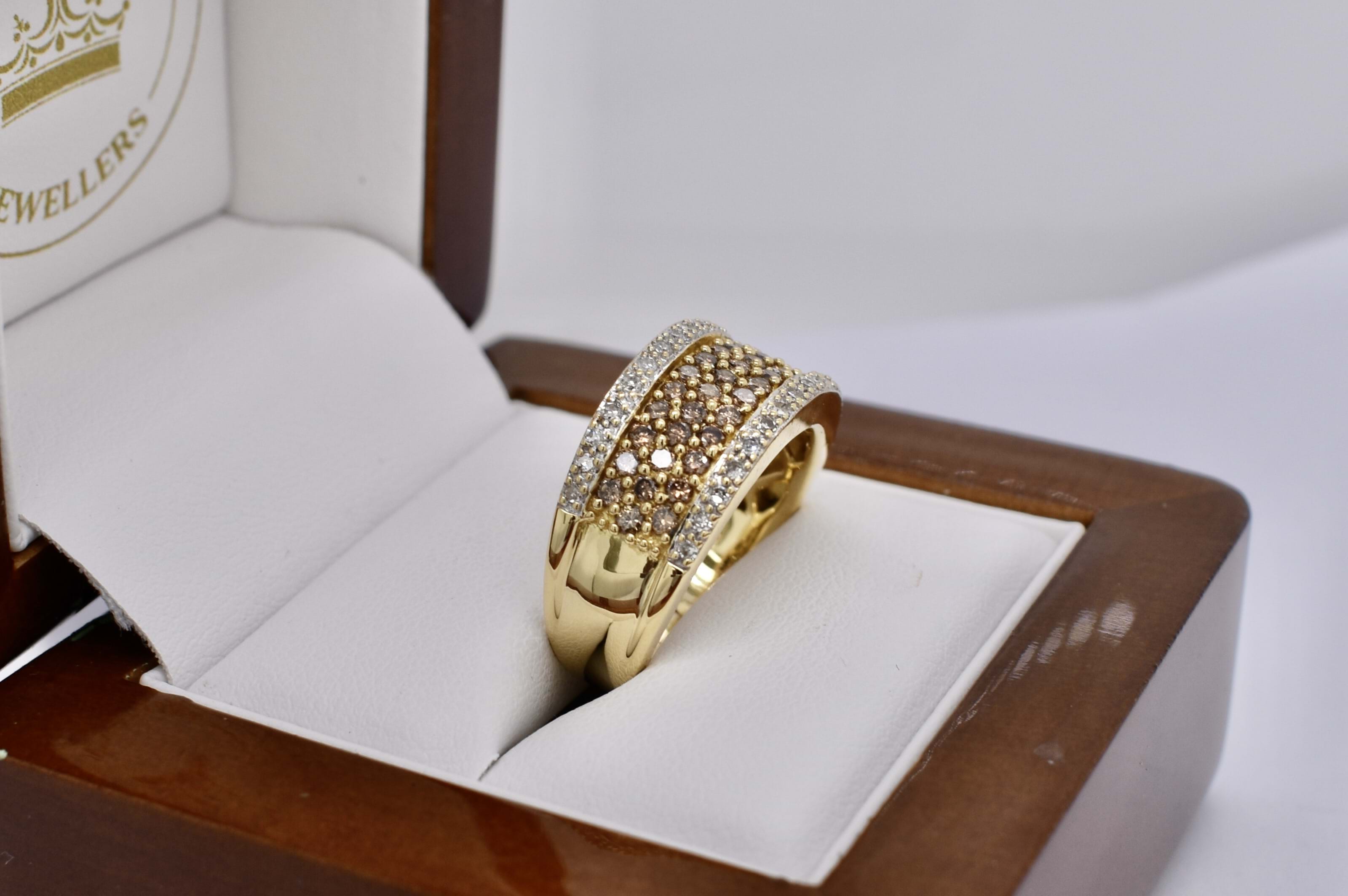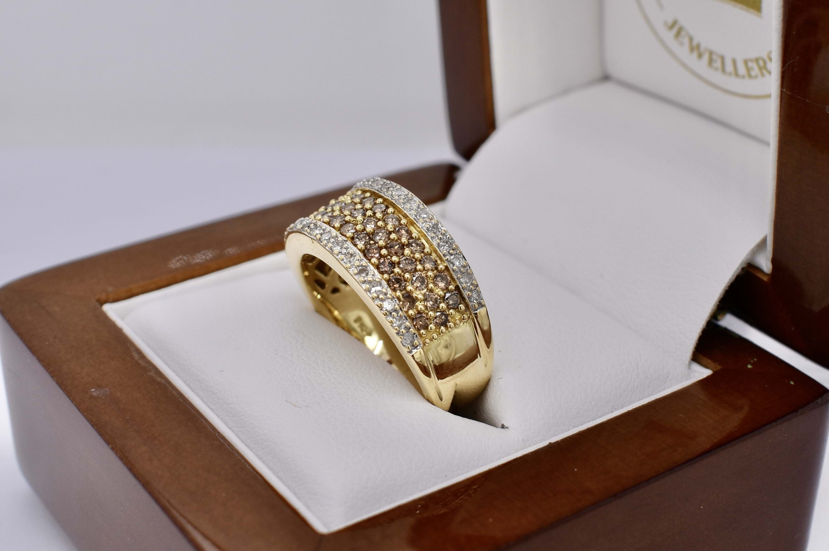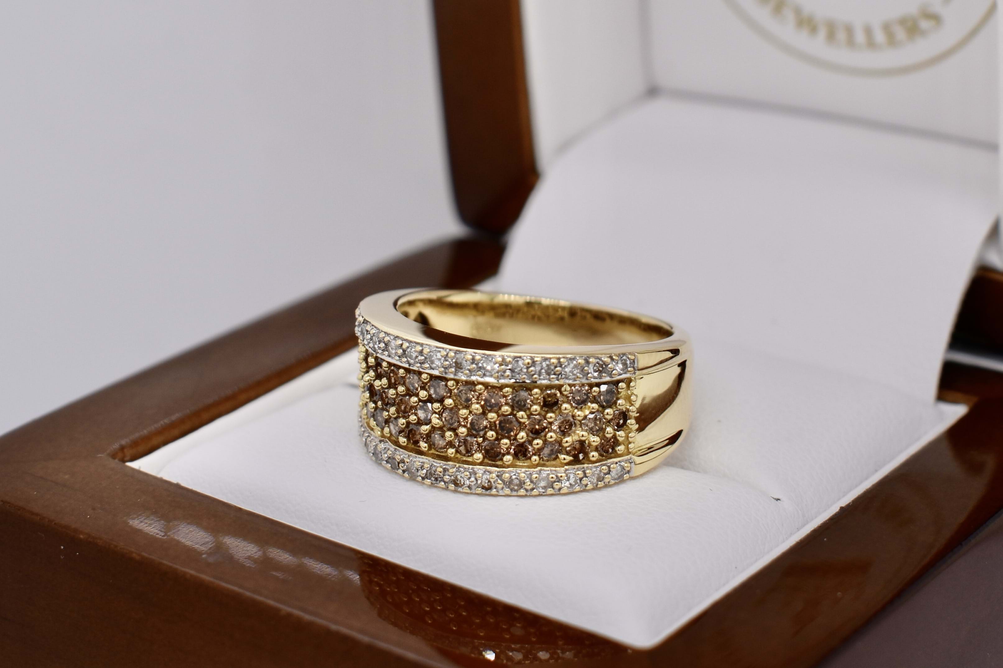 Crafted in 18ct yellow gold, this eye-catching wide diamond band, measuring 9.7-3.9mm, is set with 40 fancy brown round brilliant cut diamonds set in 3 rows. The brown diamonds measure 1.7mm round and equal 0.80ct SI1. Set above and below are a row of 15 single cut diamonds with a rhodium plated edge, a total of 30 white 1.2mm diamonds totalling 0.20ct H P1-2. Completed with a soft edge flat band. Finger size P+. Independent Valuation Supplied.