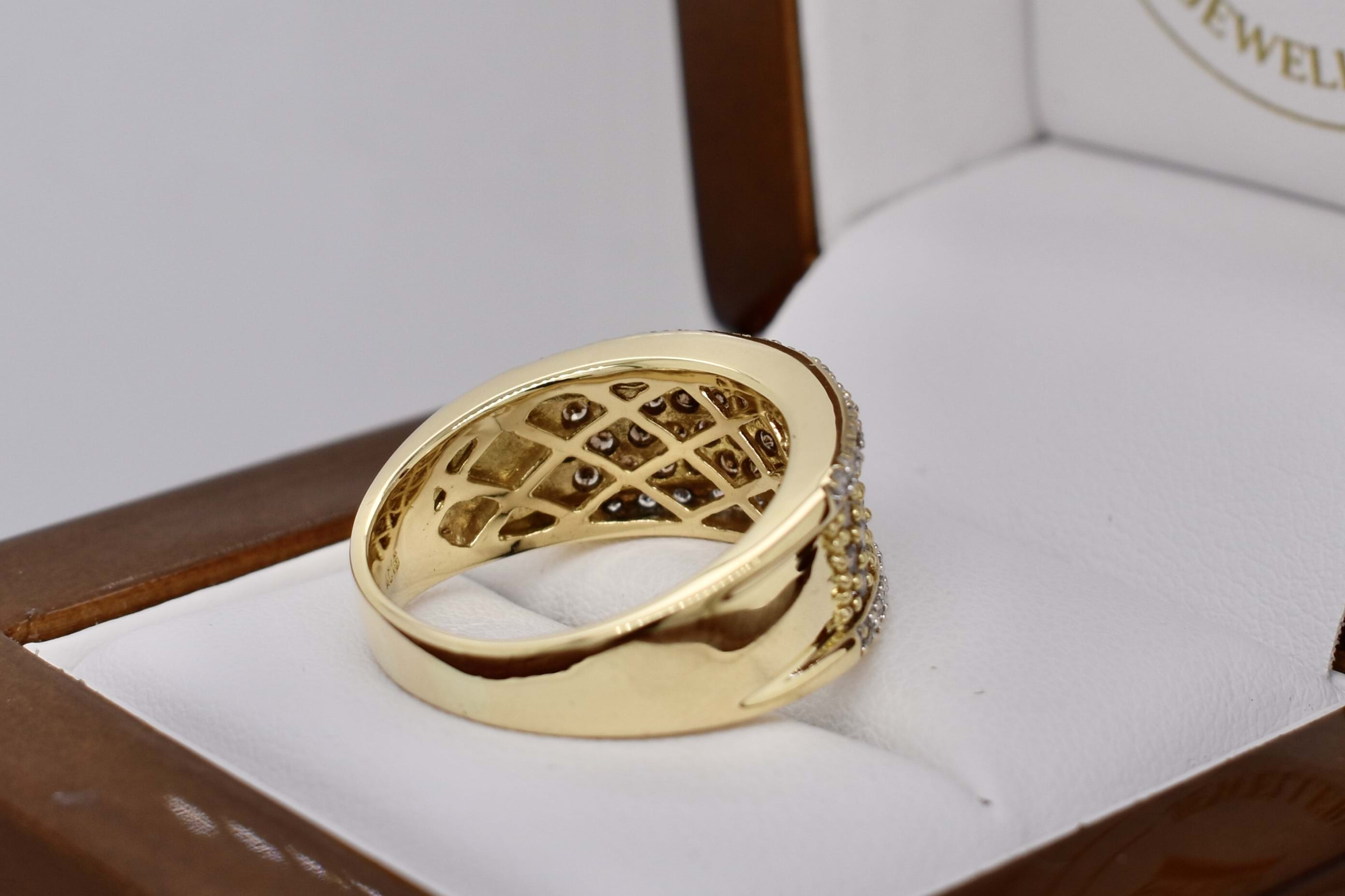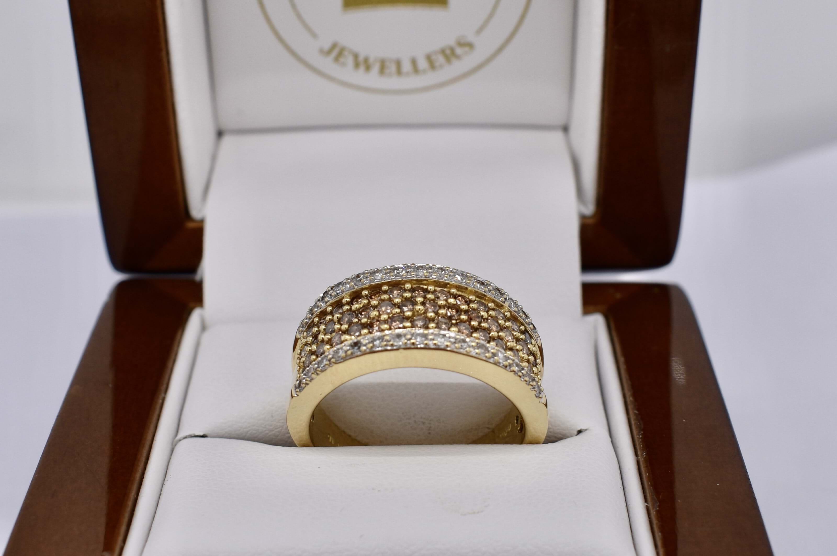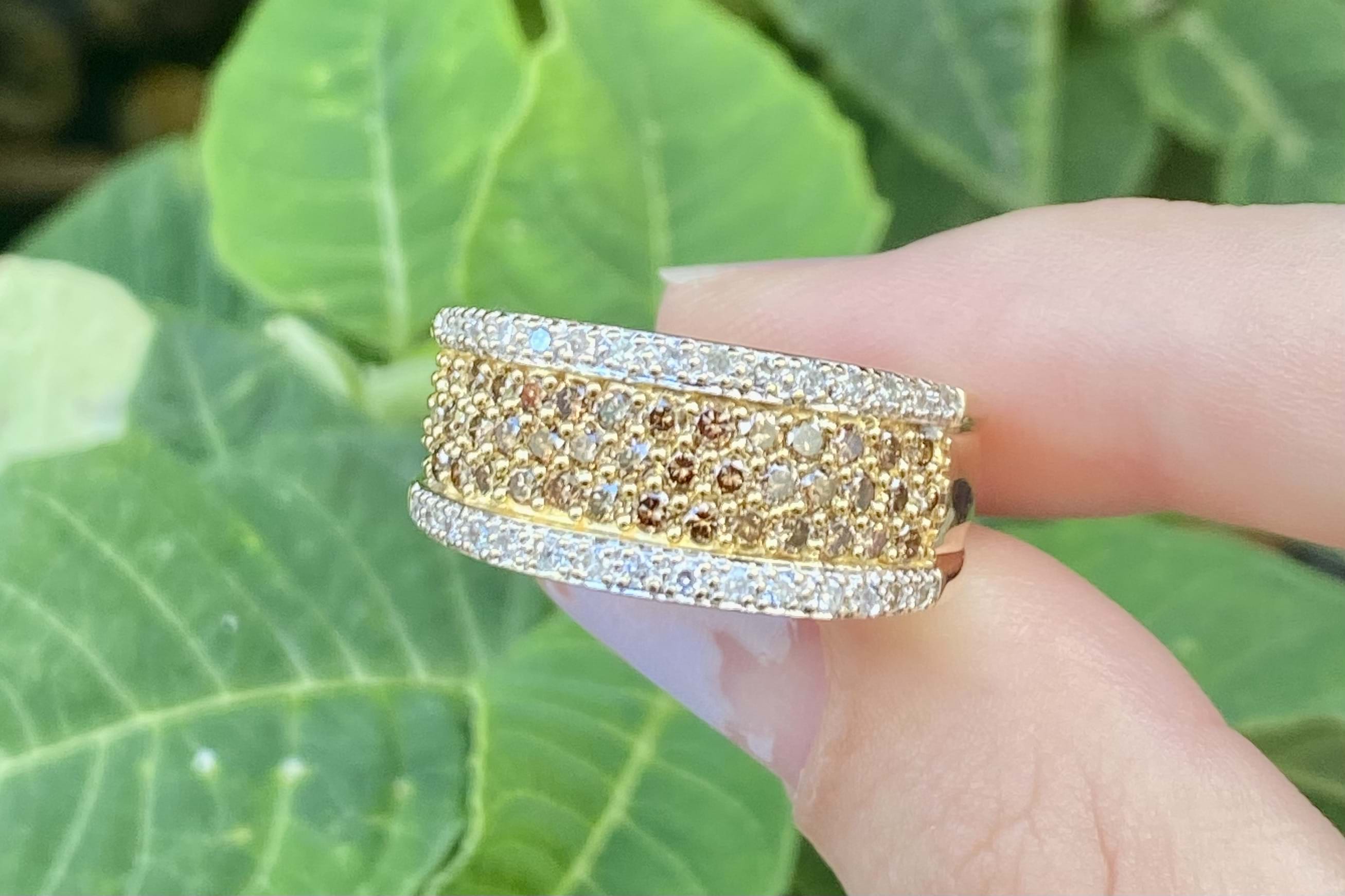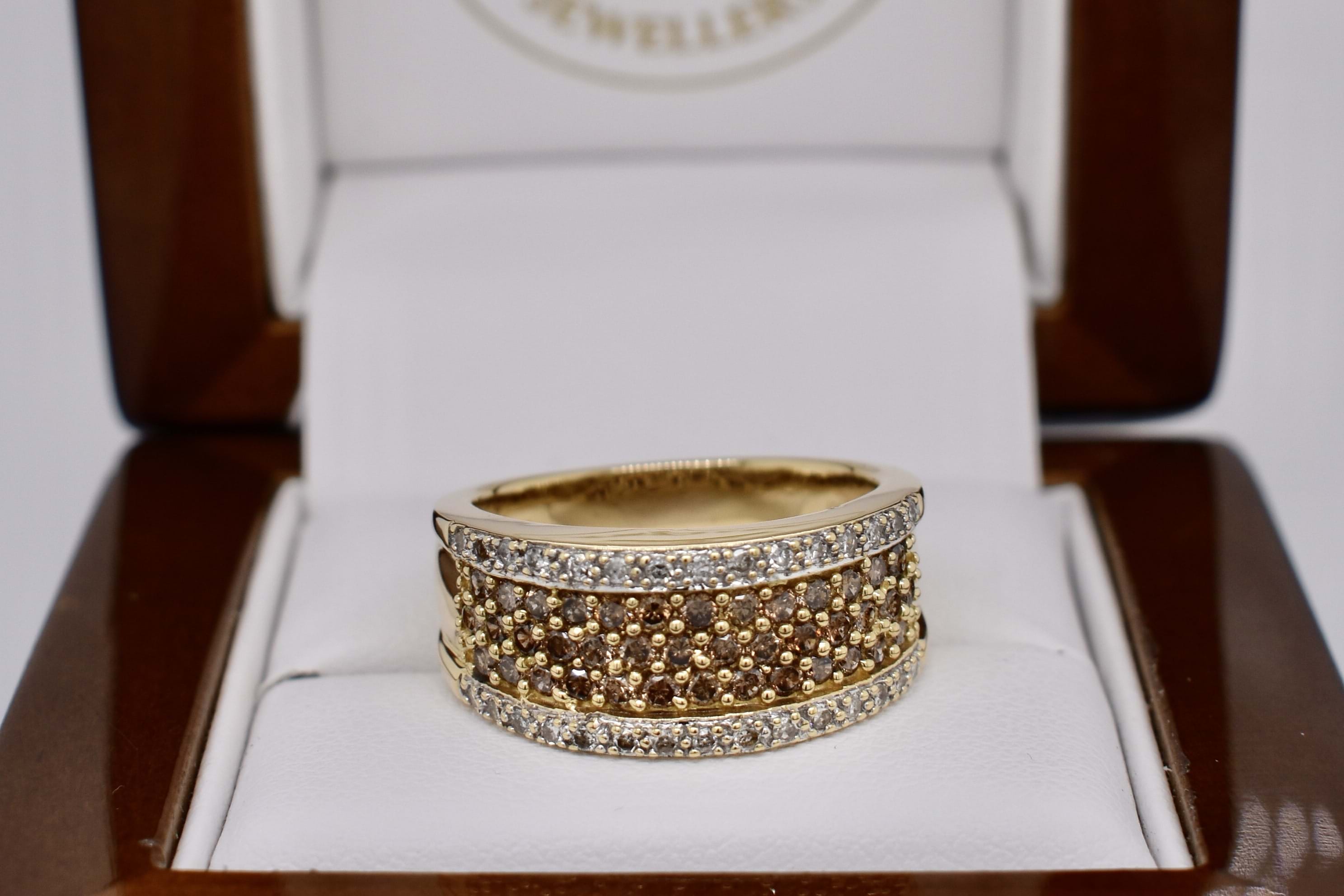 Crafted in 18ct yellow gold, this eye-catching wide diamond band, measuring 9.7-3.9mm, is set with 40 fancy brown round brilliant cut diamonds set in 3 rows. The brown diamonds measure 1.7mm round and equal 0.80ct SI1. Set above and below are a row of 15 single cut diamonds with a rhodium plated edge, a total of 30 white 1.2mm diamonds totalling 0.20ct H P1-2. Completed with a soft edge flat band. Finger size P+. Independent Valuation Supplied.