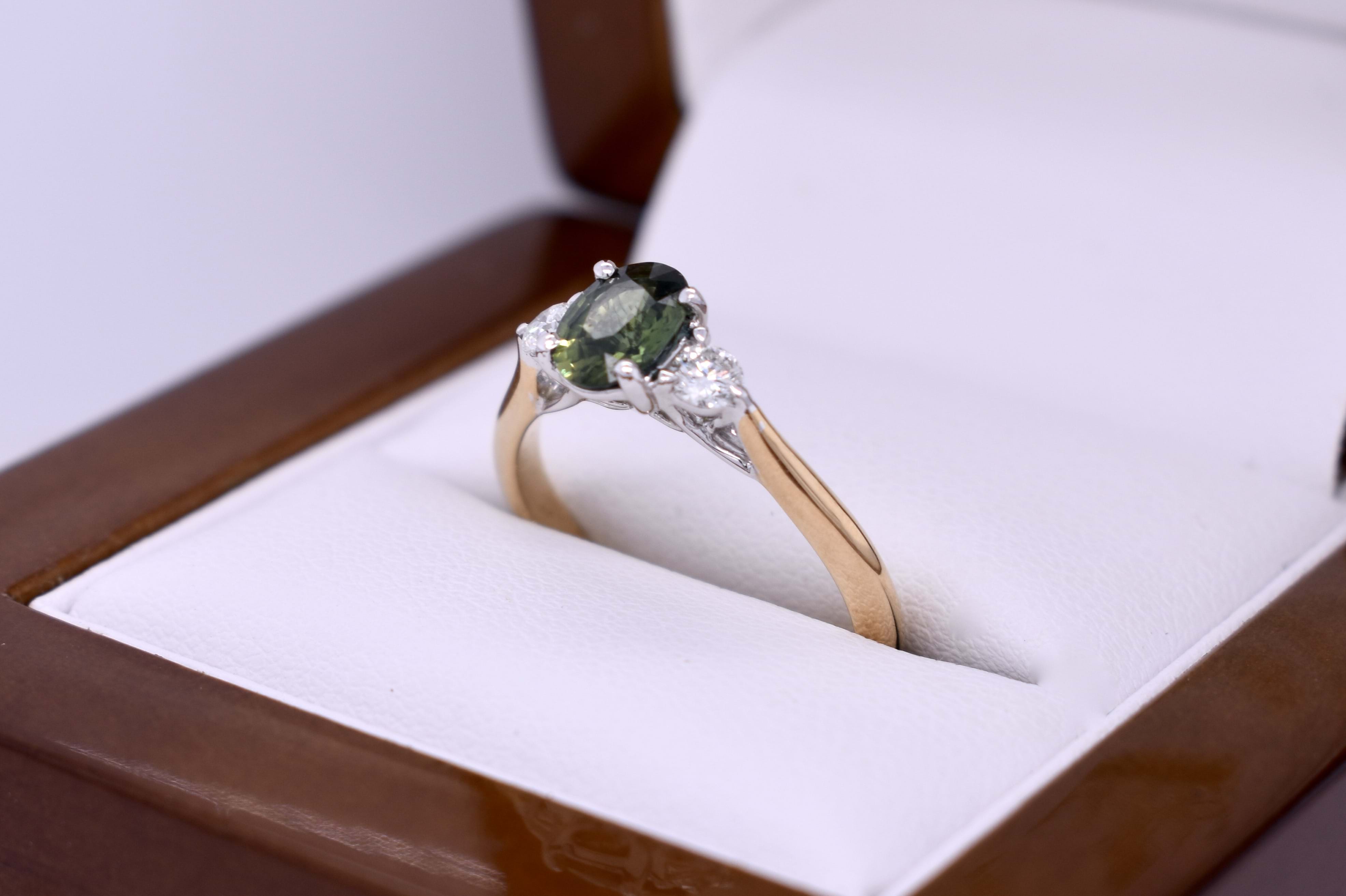 Elegant and pretty, this 18ct yellow gold ring features a 0.83ct oval shaped Australian green parti sapphire, four claw set in white gold. Further set with a shimmering round brilliant cut diamond either side, total of 2 diamonds equalling 0.20ct FG SI, also claw set. Ring has a trellis style setting and plain yellow gold band. Finger size M.