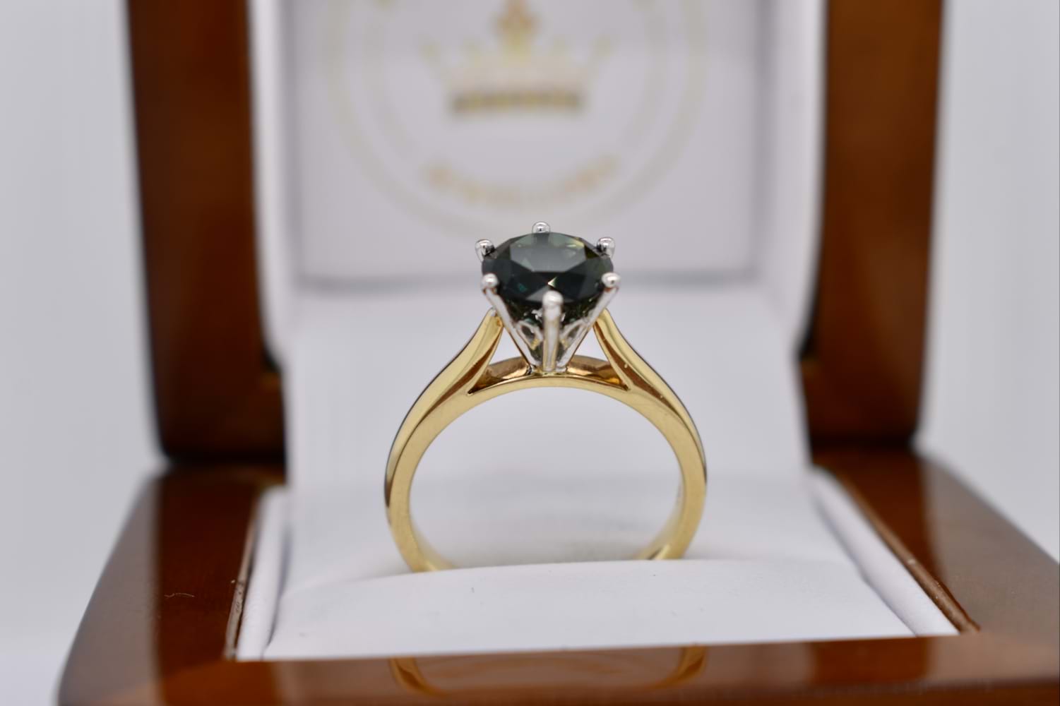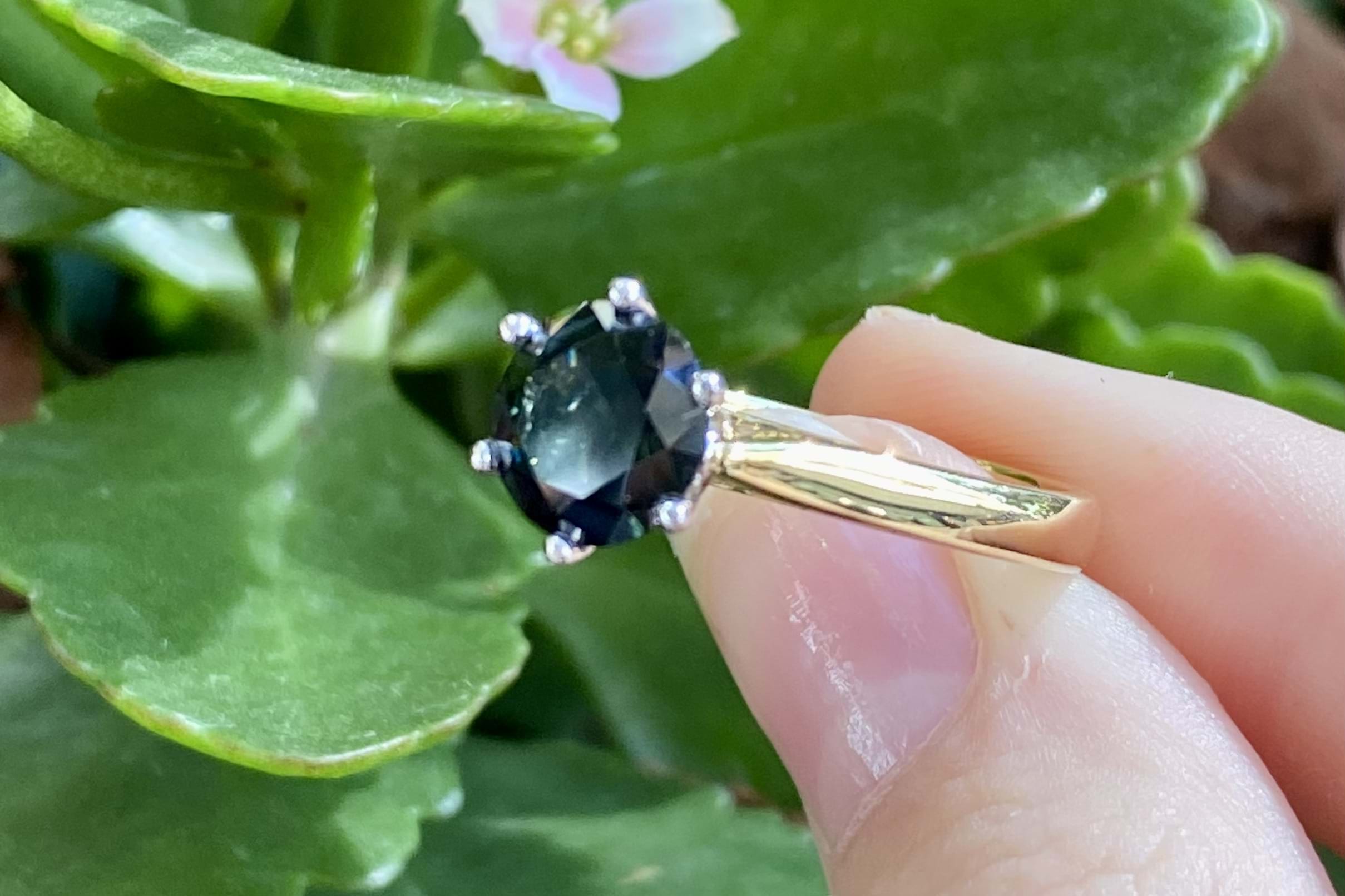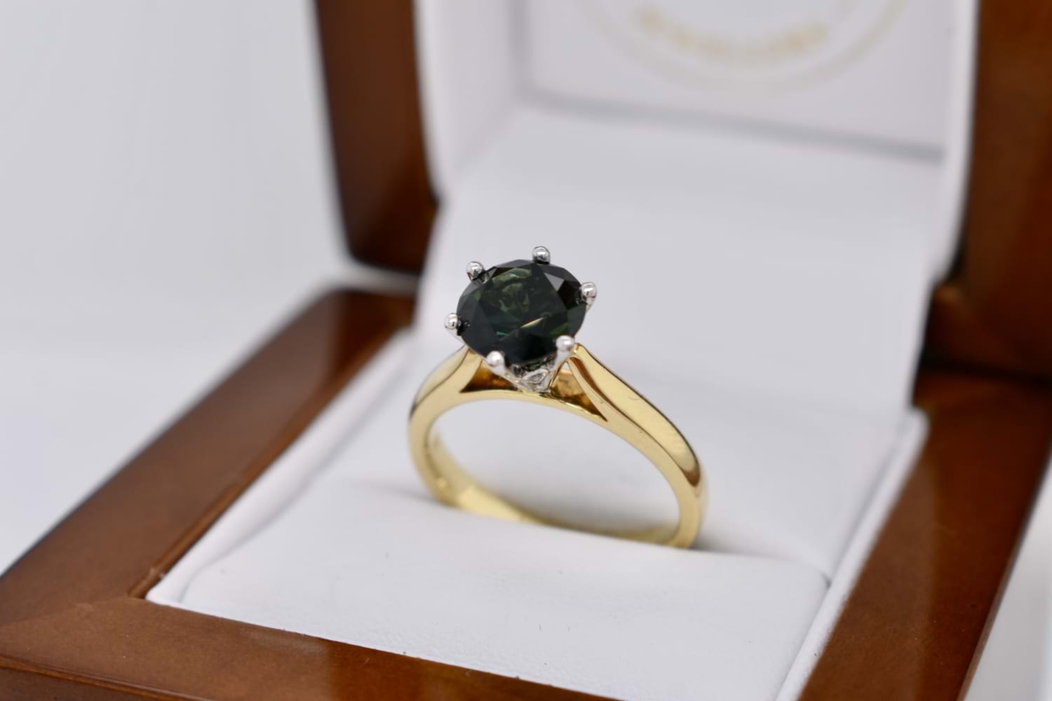 A huge 2.26ct round Australian sapphire is the feature of this ring, deep bluish green and set in 18ct gold, with six white gold claws in a striking, tall cutout style basket, on a yellow gold tapered band with flat under rail which means that this ring can be worn by itself or sit flush with other bands. Finger size N+