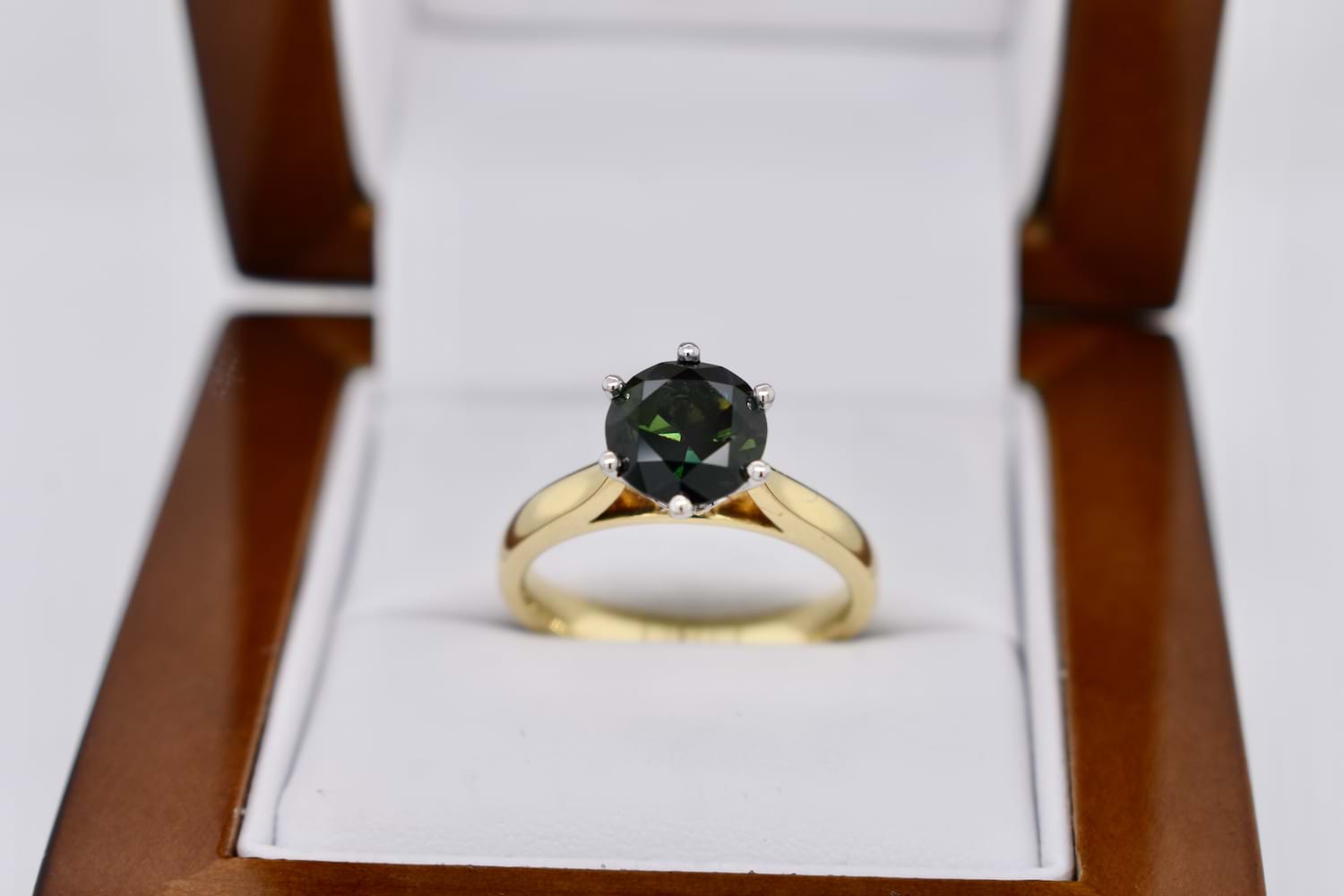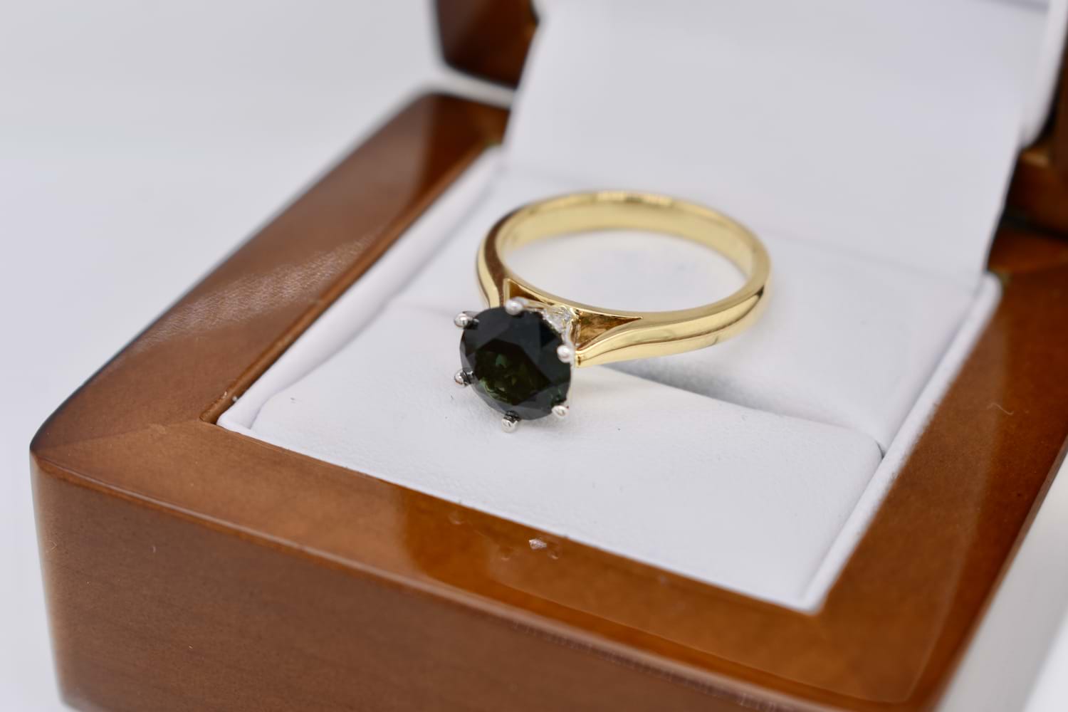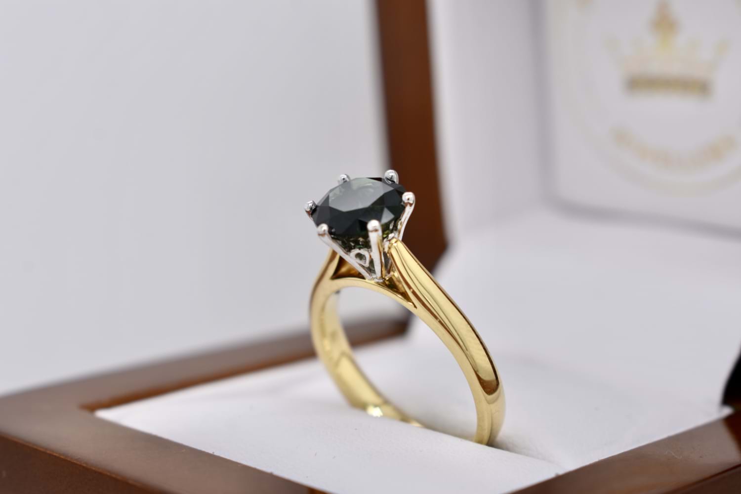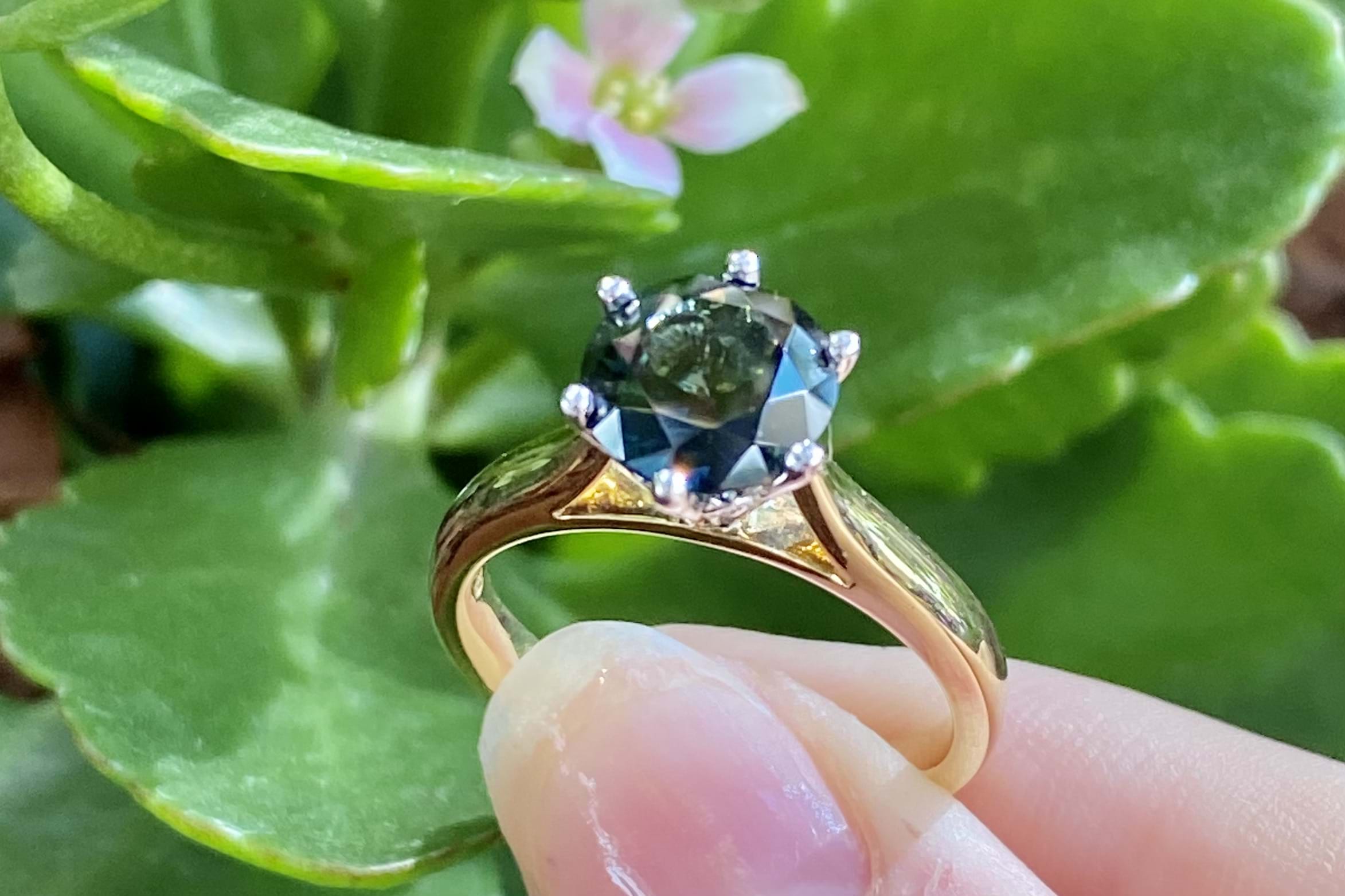 A huge 2.26ct round Australian sapphire is the feature of this ring, deep bluish green and set in 18ct gold, with six white gold claws in a striking, tall cutout style basket, on a yellow gold tapered band with flat under rail which means that this ring can be worn by itself or sit flush with other bands. Finger size N+