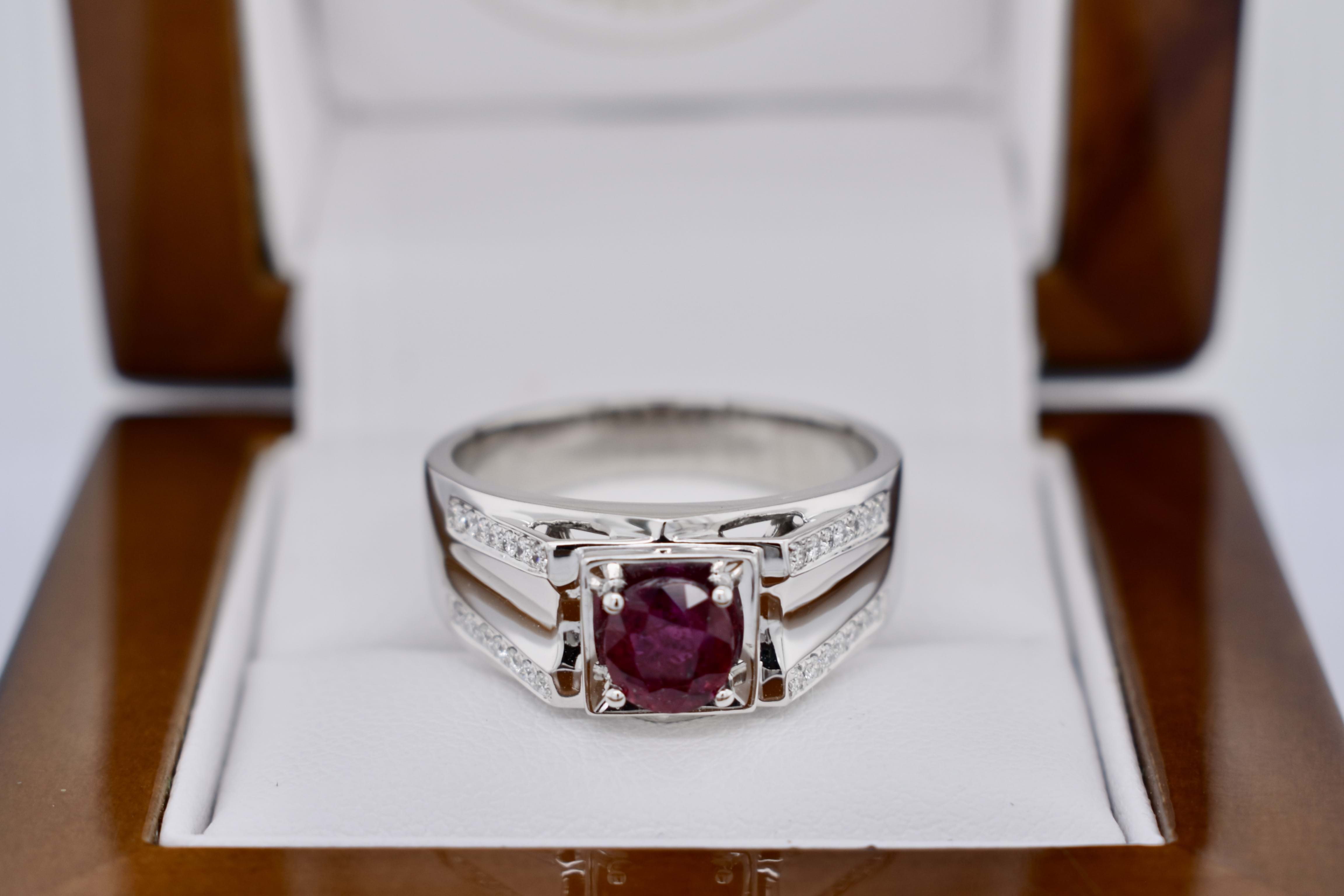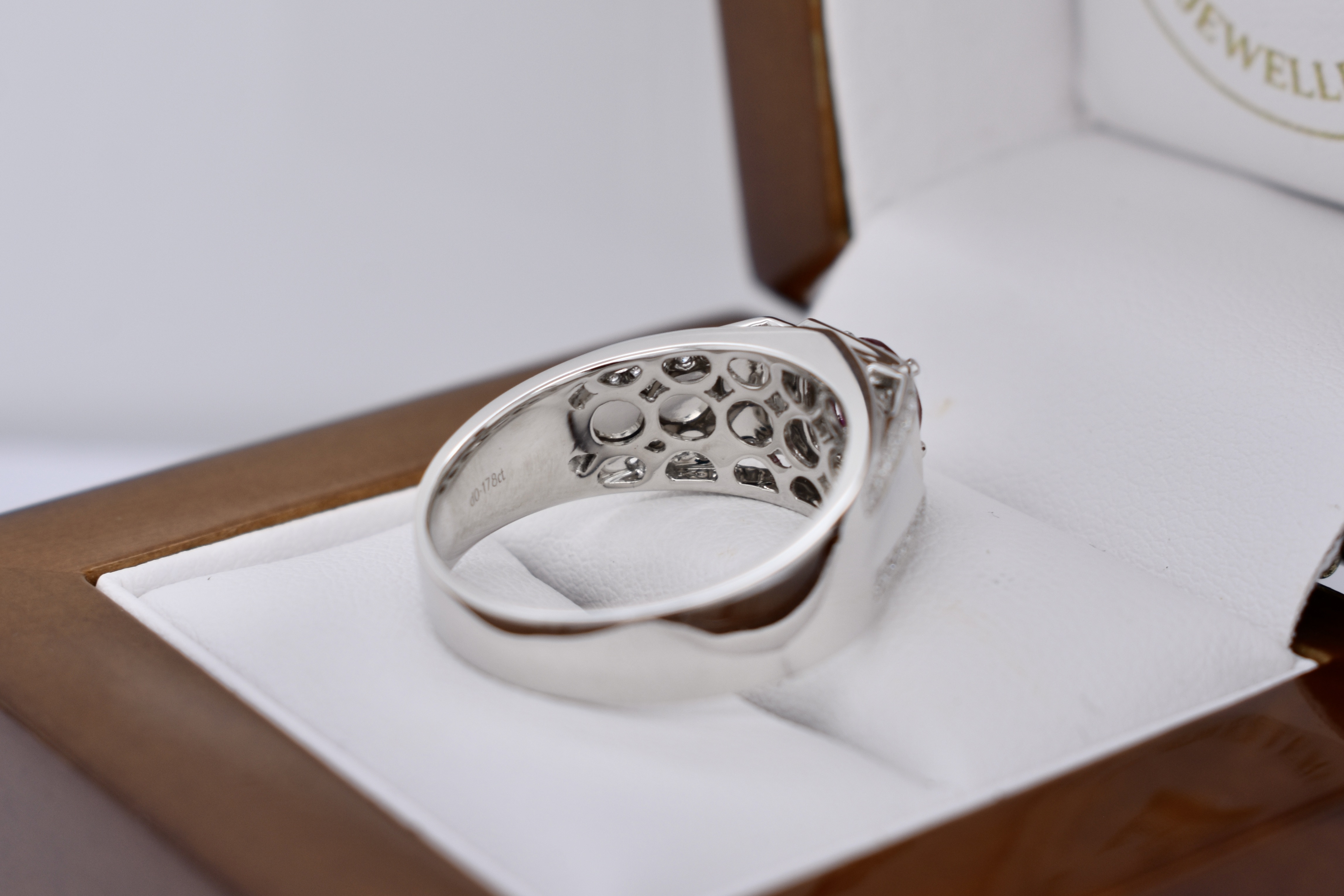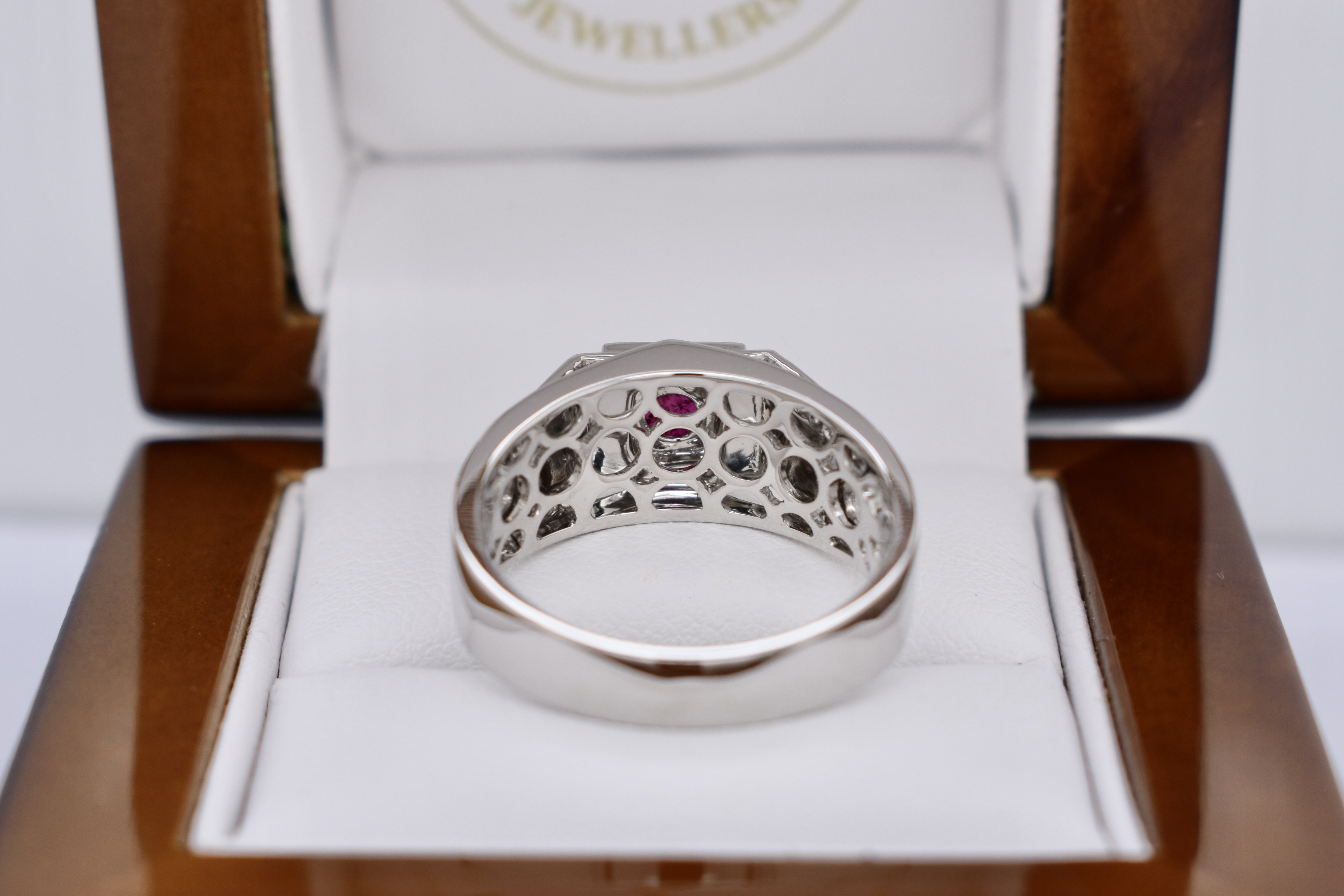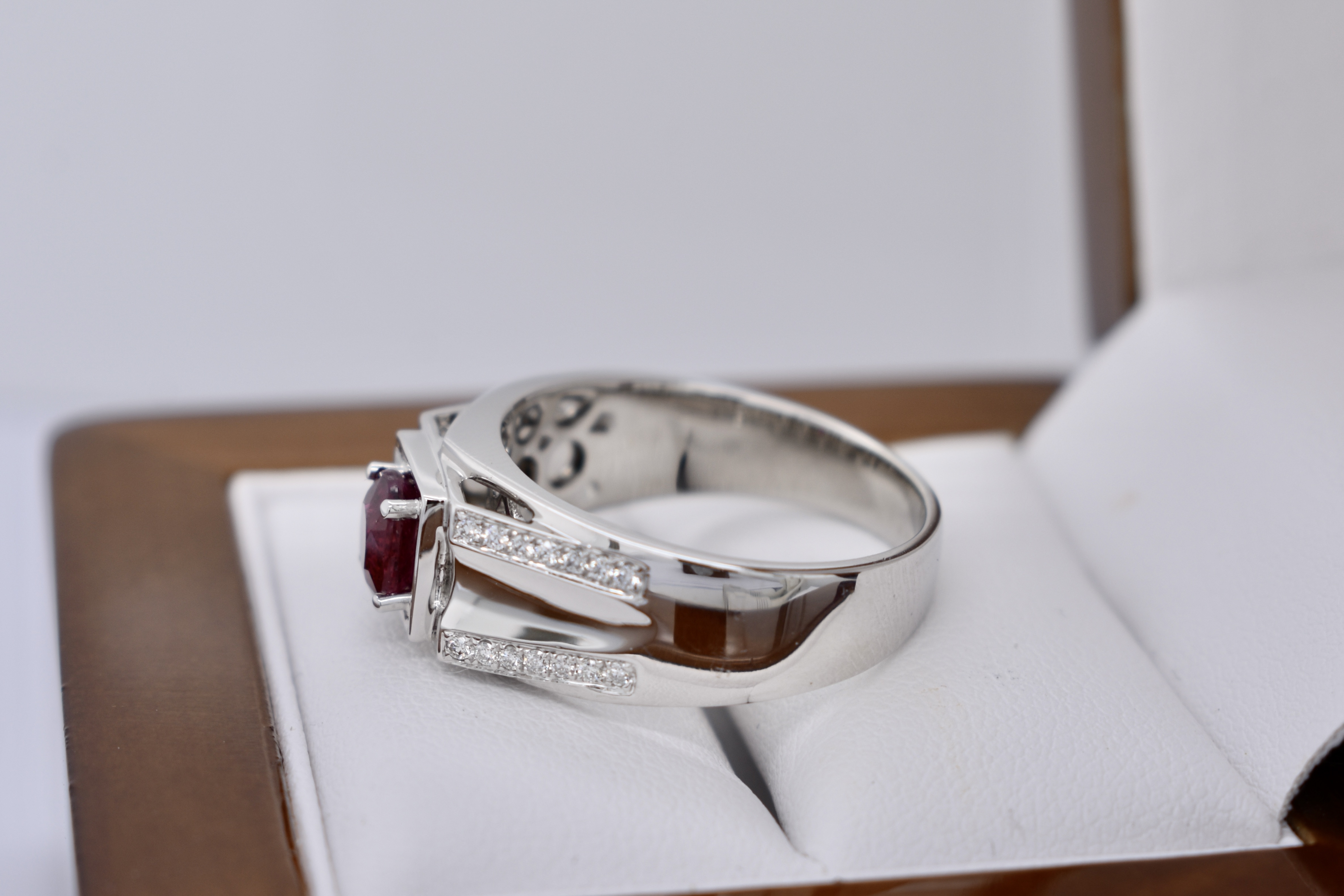 Crafted in 18ct white gold, this stunning flat top ring, features a centre bright dark red ruby measuring 6.2x6.0x2.7mm, totalling 0.96ct. The oval ruby is four claw set with a square surround, further set with 14 round brilliant cut diamonds, grain set in two rows each side of the swept up shoulder 9.35-4.16mm band. A total of twenty eight 1.1mm diamonds, equalling 0.18ct G VS. Finger size S+. Independent Valuation Supplied.