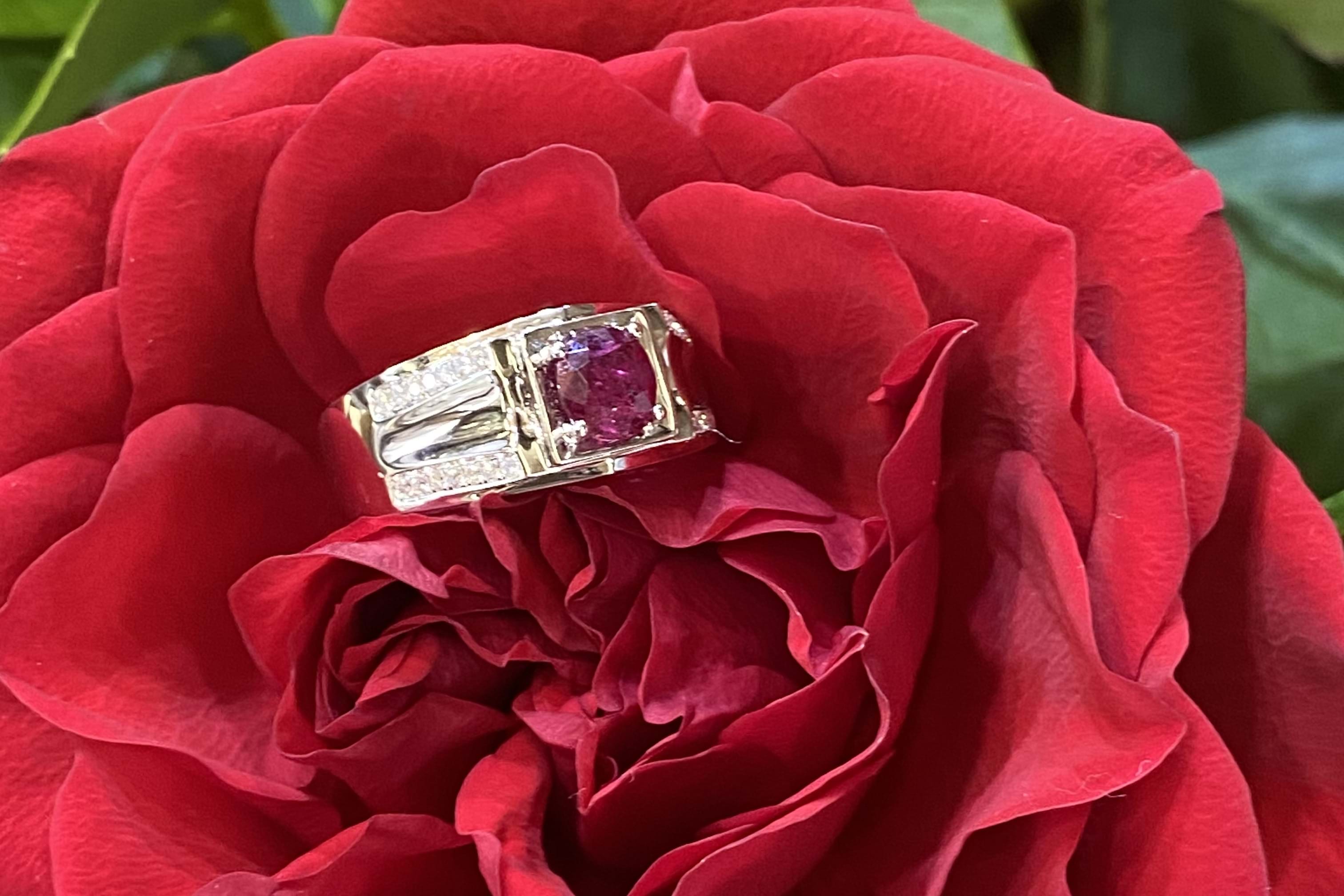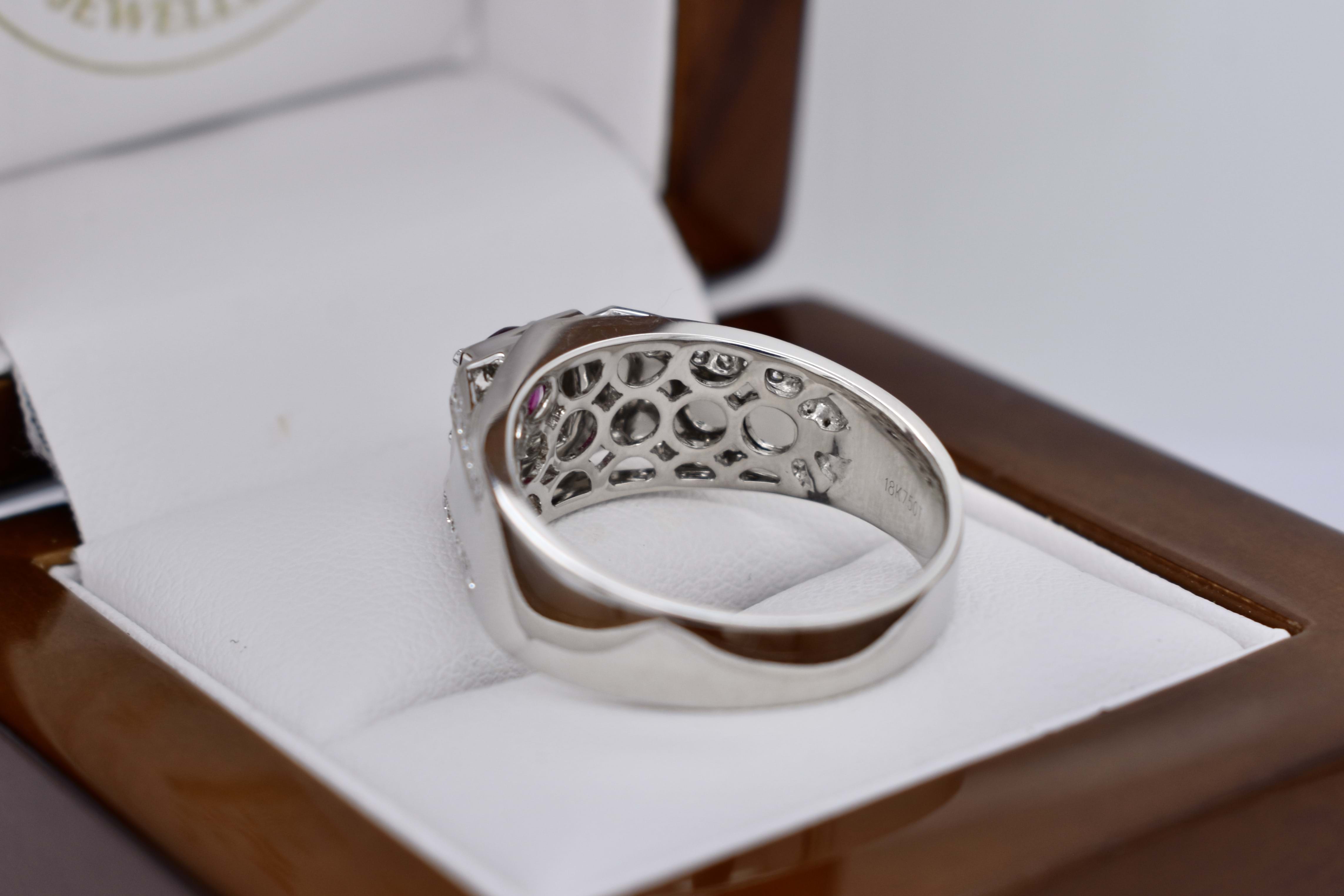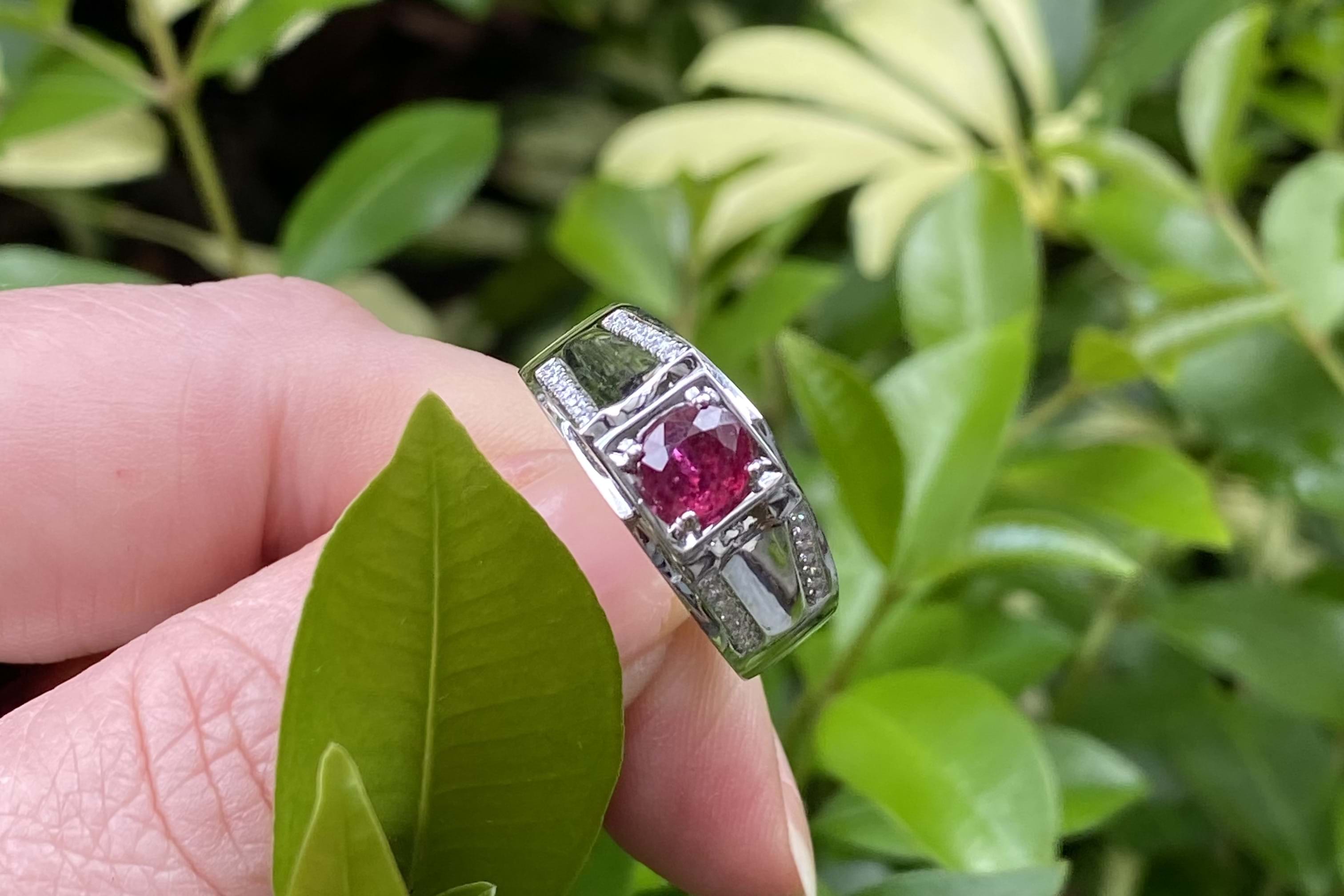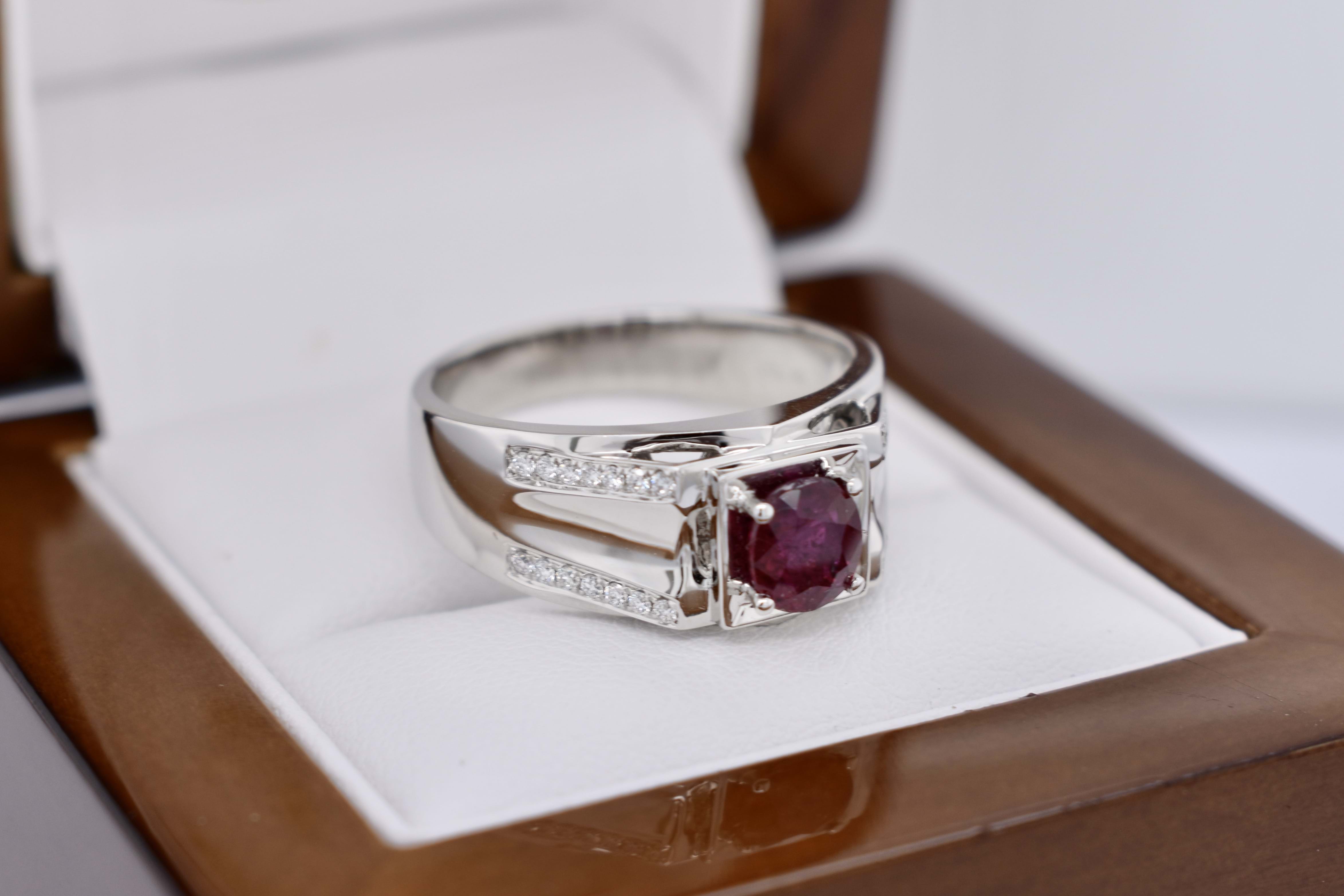 Crafted in 18ct white gold, this stunning flat top ring, features a centre bright dark red ruby measuring 6.2x6.0x2.7mm, totalling 0.96ct. The oval ruby is four claw set with a square surround, further set with 14 round brilliant cut diamonds, grain set in two rows each side of the swept up shoulder 9.35-4.16mm band. A total of twenty eight 1.1mm diamonds, equalling 0.18ct G VS. Finger size S+. Independent Valuation Supplied.