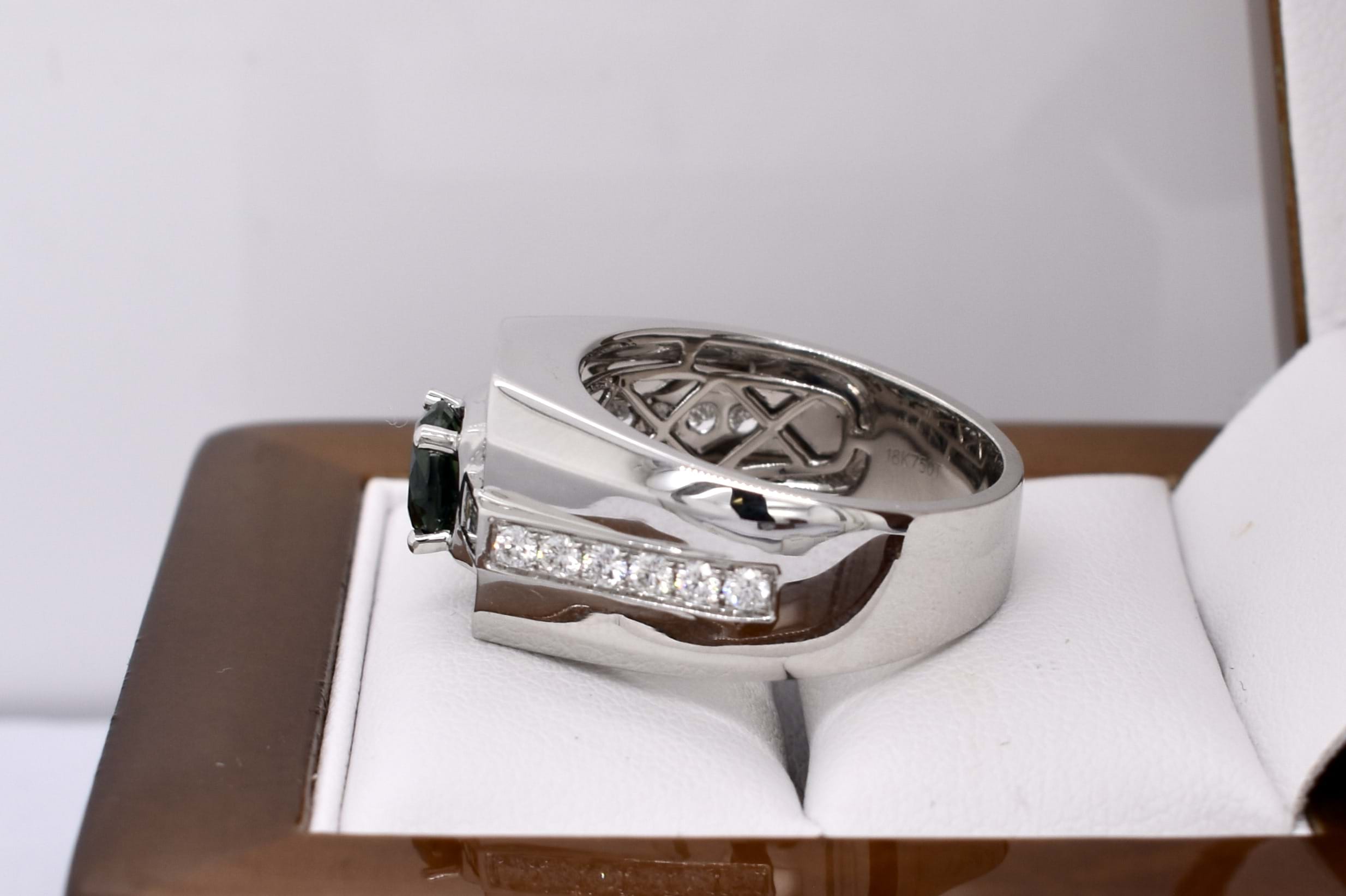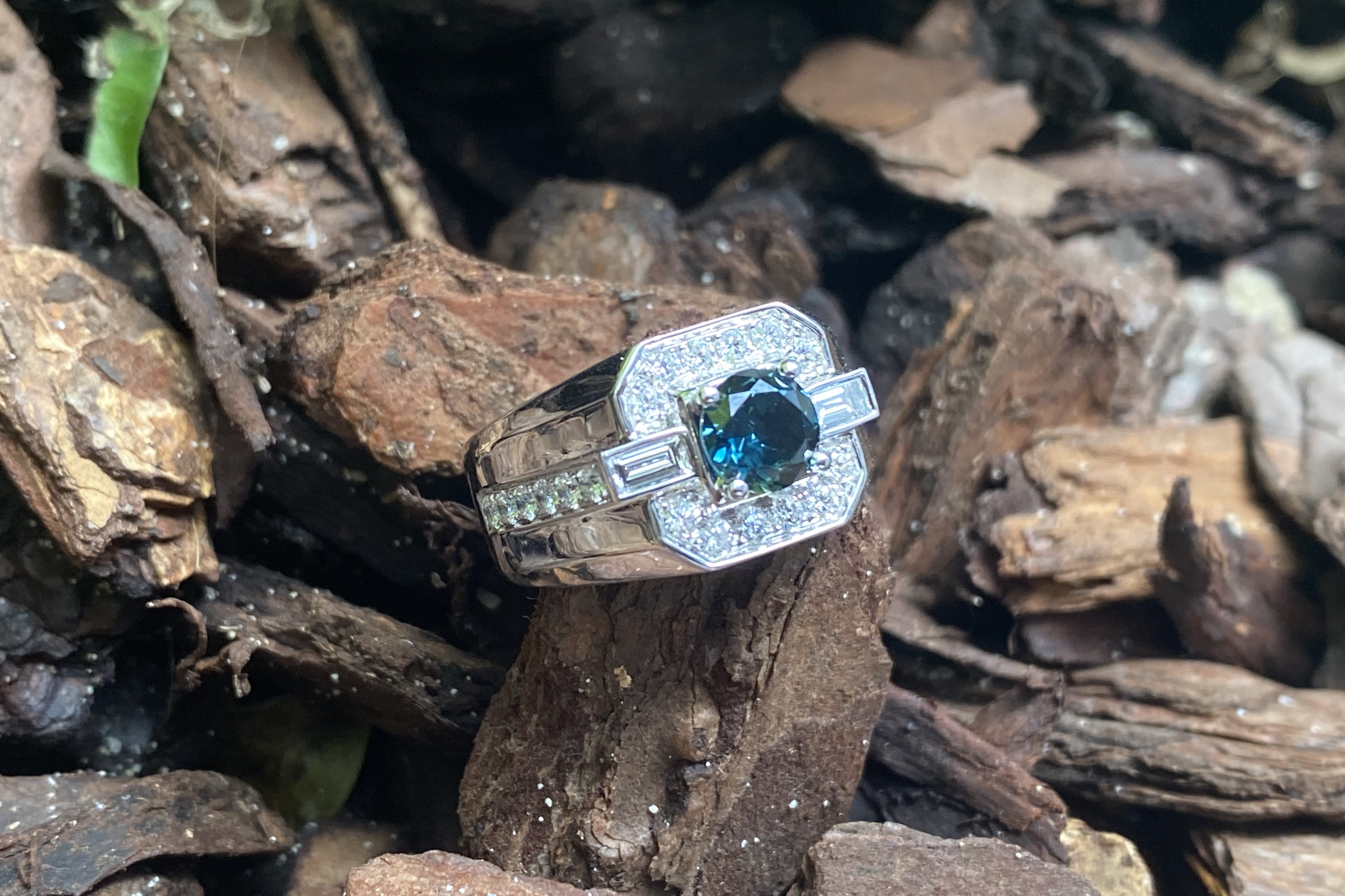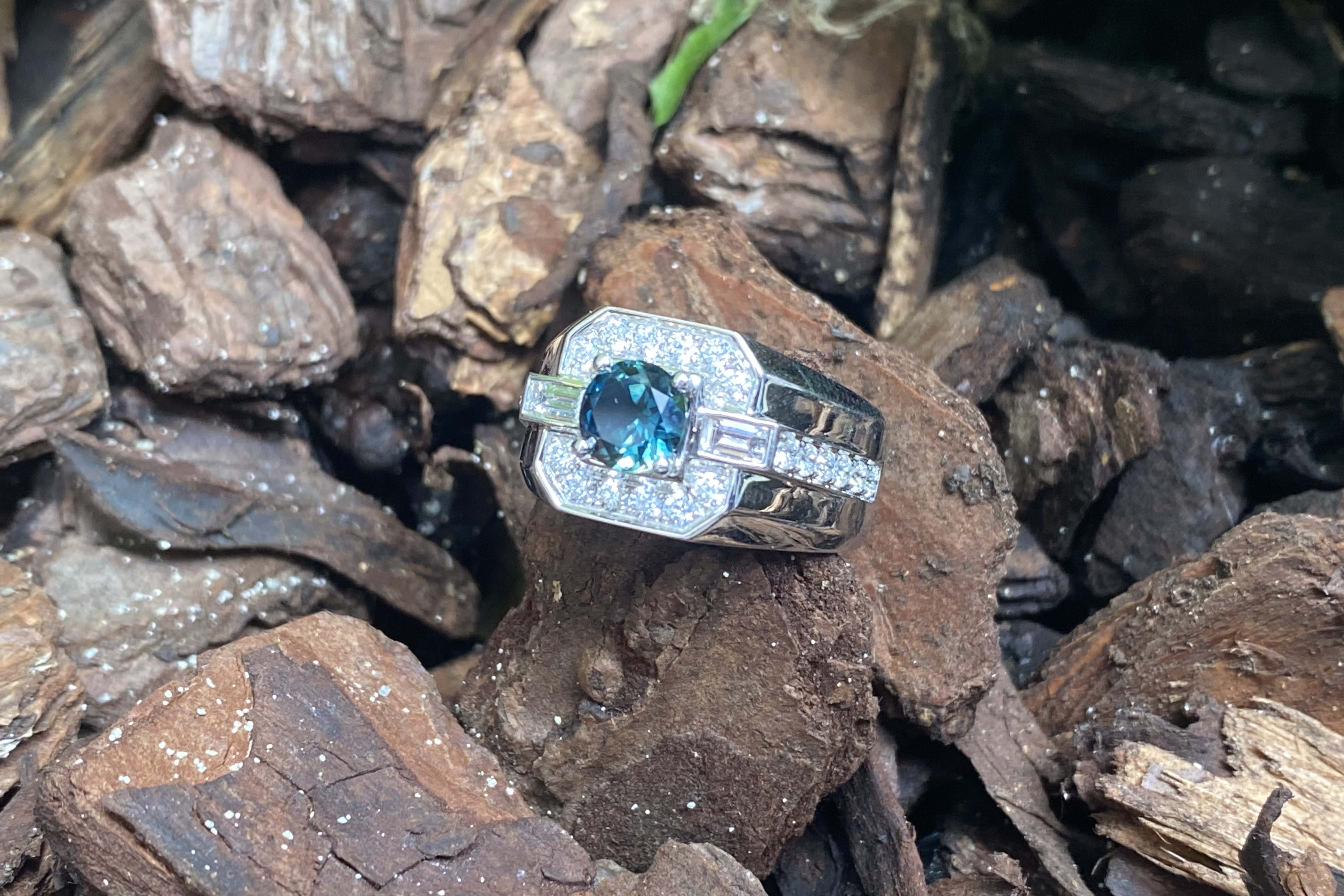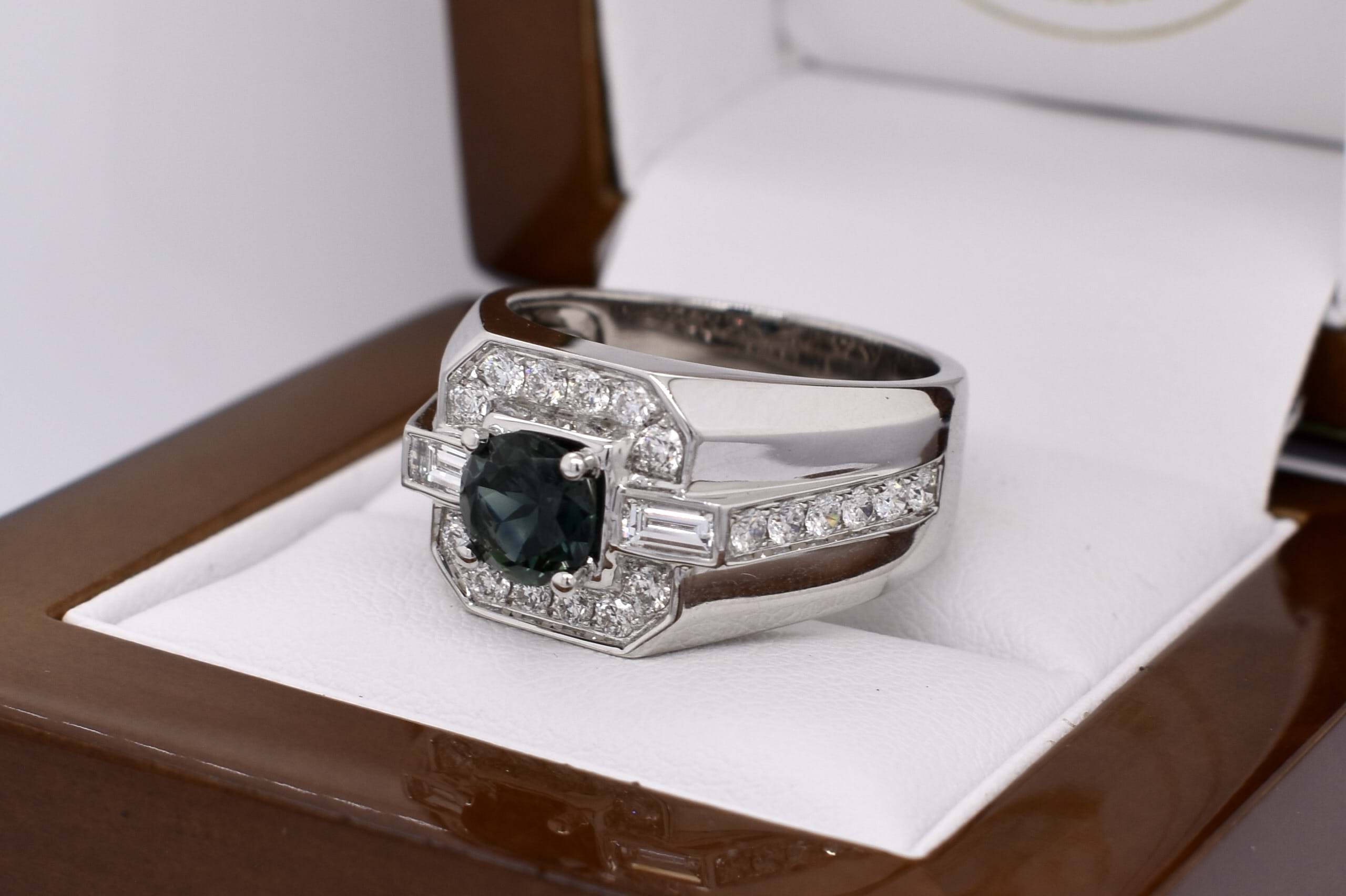 Stunning 1.37ct, Australian, greenish blue (teal) sapphire hand selected in store to be the feature of this striking 18ct white gold, diamond set, flat top ring. The signet style ring features the sapphire four claw set in the centre, surrounded by a halo of round brilliant cut diamonds with a baguette cut diamond set at East/West and a single line of round diamonds set partly down the tapering shoulders. Two baguette diamonds equal 0.27ct & 24 round diamonds equal 0.72ct FVS. Top measures 12.66mm, tapering down to 5.92mm at base. Finger size S+. Independent Valuation Supplied