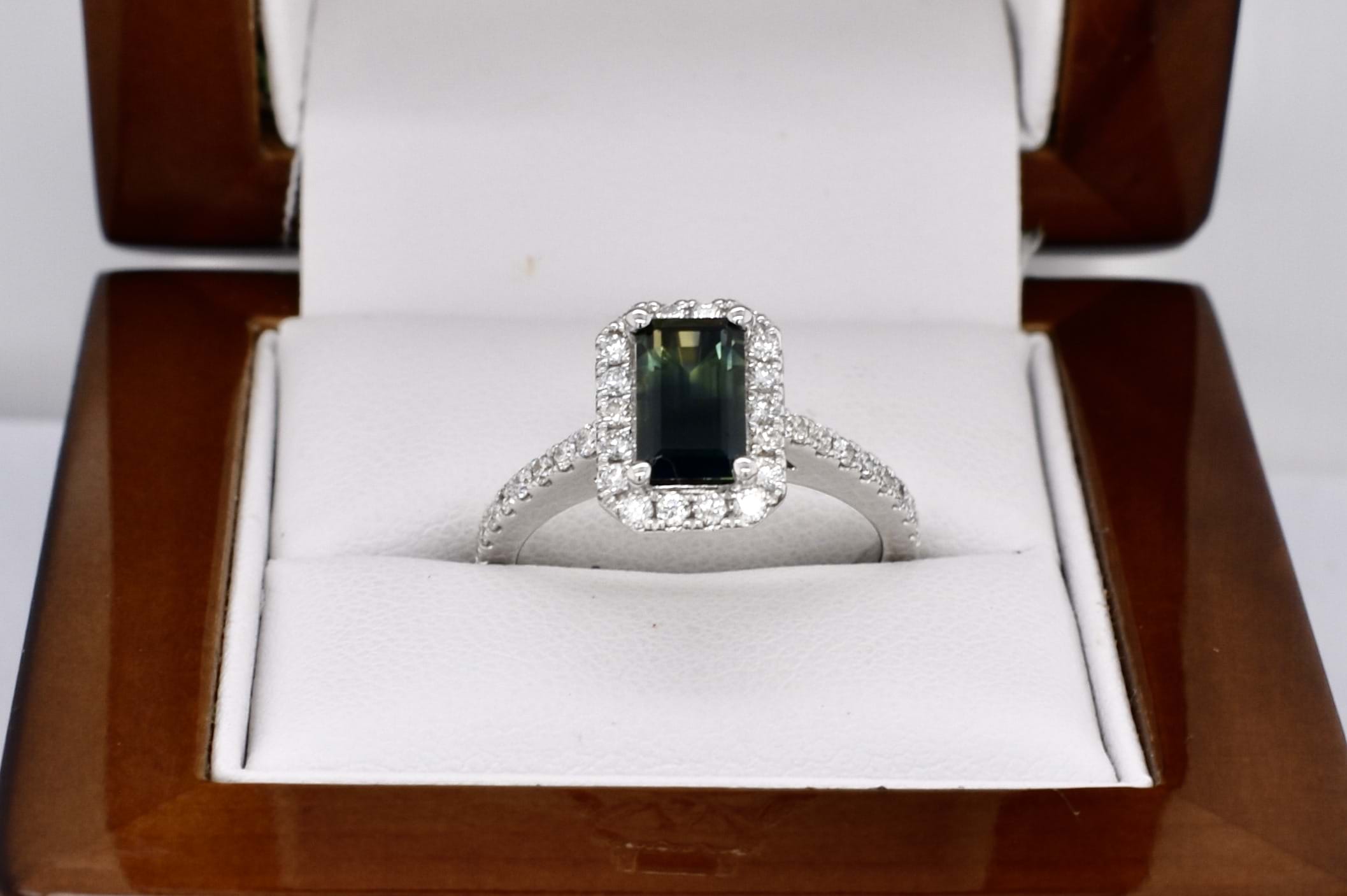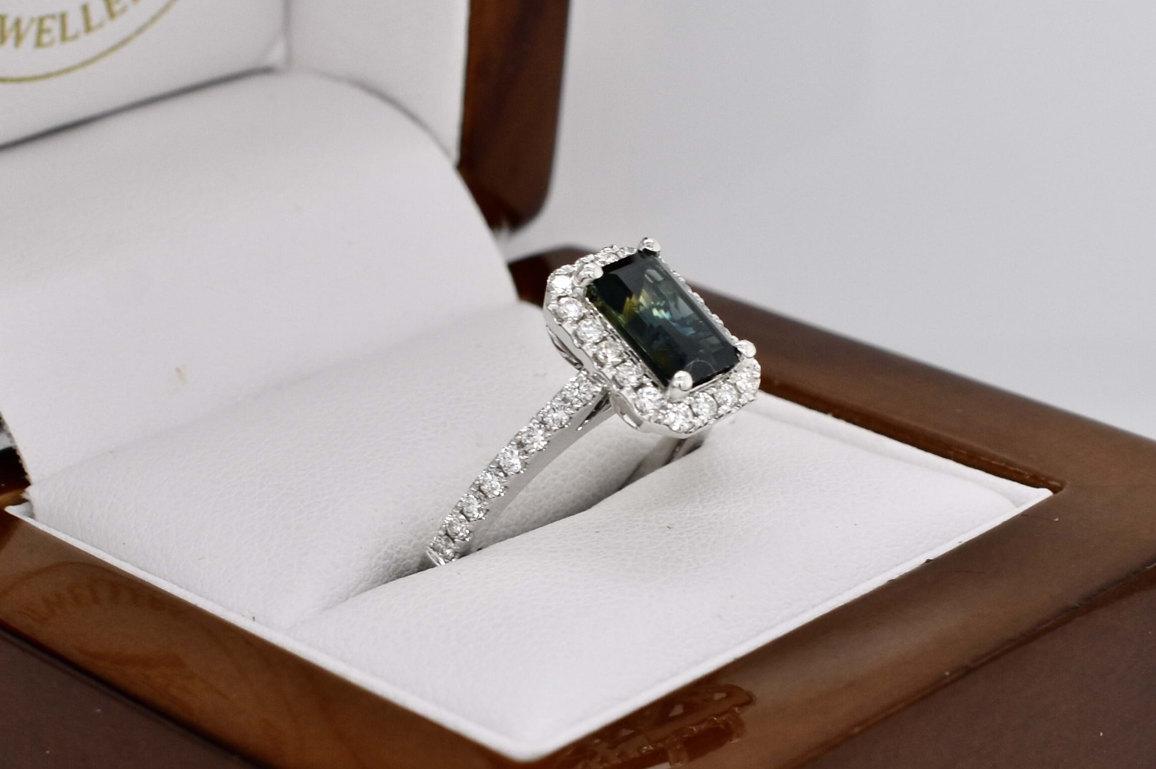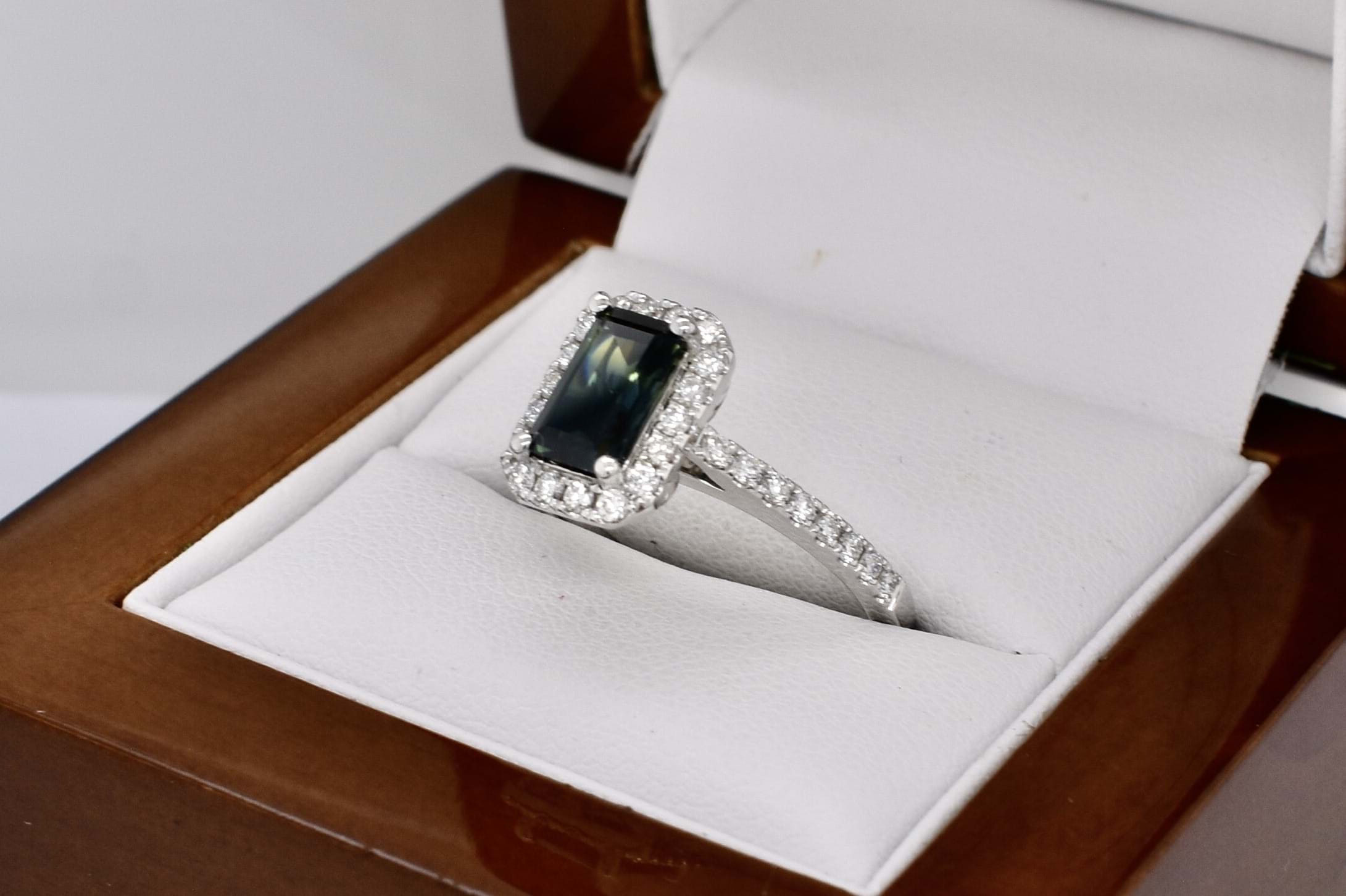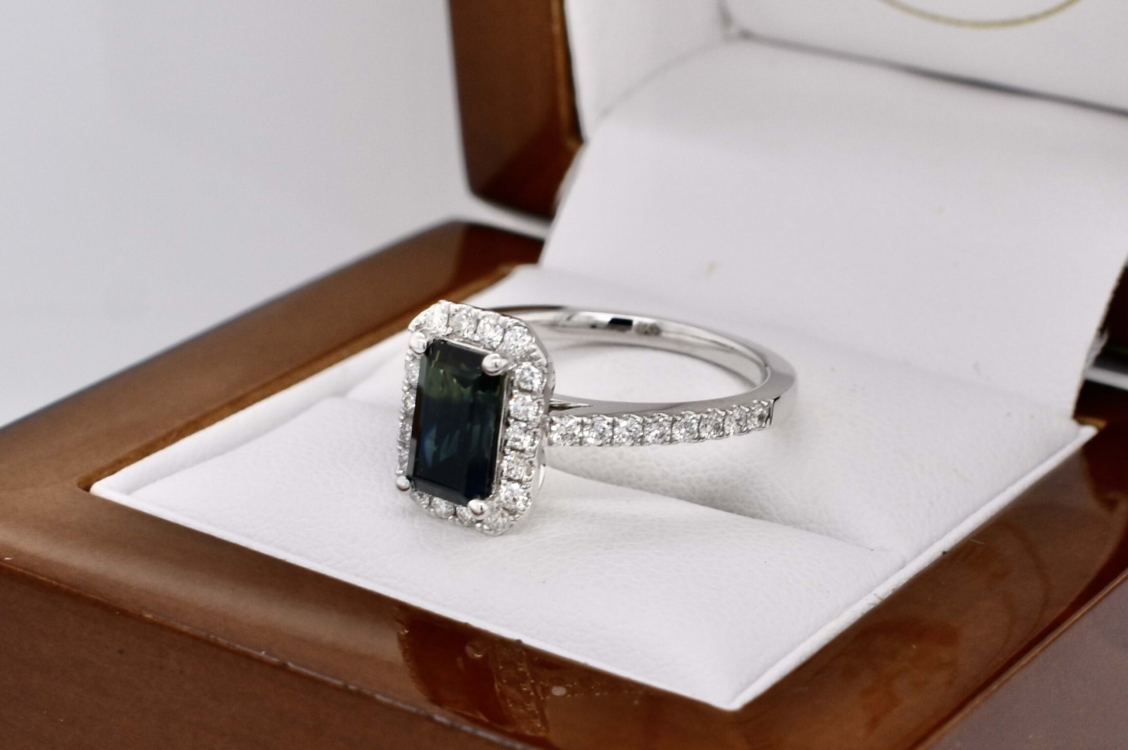 Crafted in 18ct white gold, this dazzling ring features a centre emerald cut Australian parti sapphire of 1.45ct, measuring 8.33x4.95x3.40mm, four claw set. Surrounded by eighteen round brilliant cut diamonds in an emerald cut halo, and a further sixteen diamonds down the shoulders. A total of 34 round brilliant cut diamonds, measuring 1.50-1.40mm, totalling 0.48ct FG VS-SI. Completed on a 1.86mm band. Finger size O. Independent Valuation Supplied.