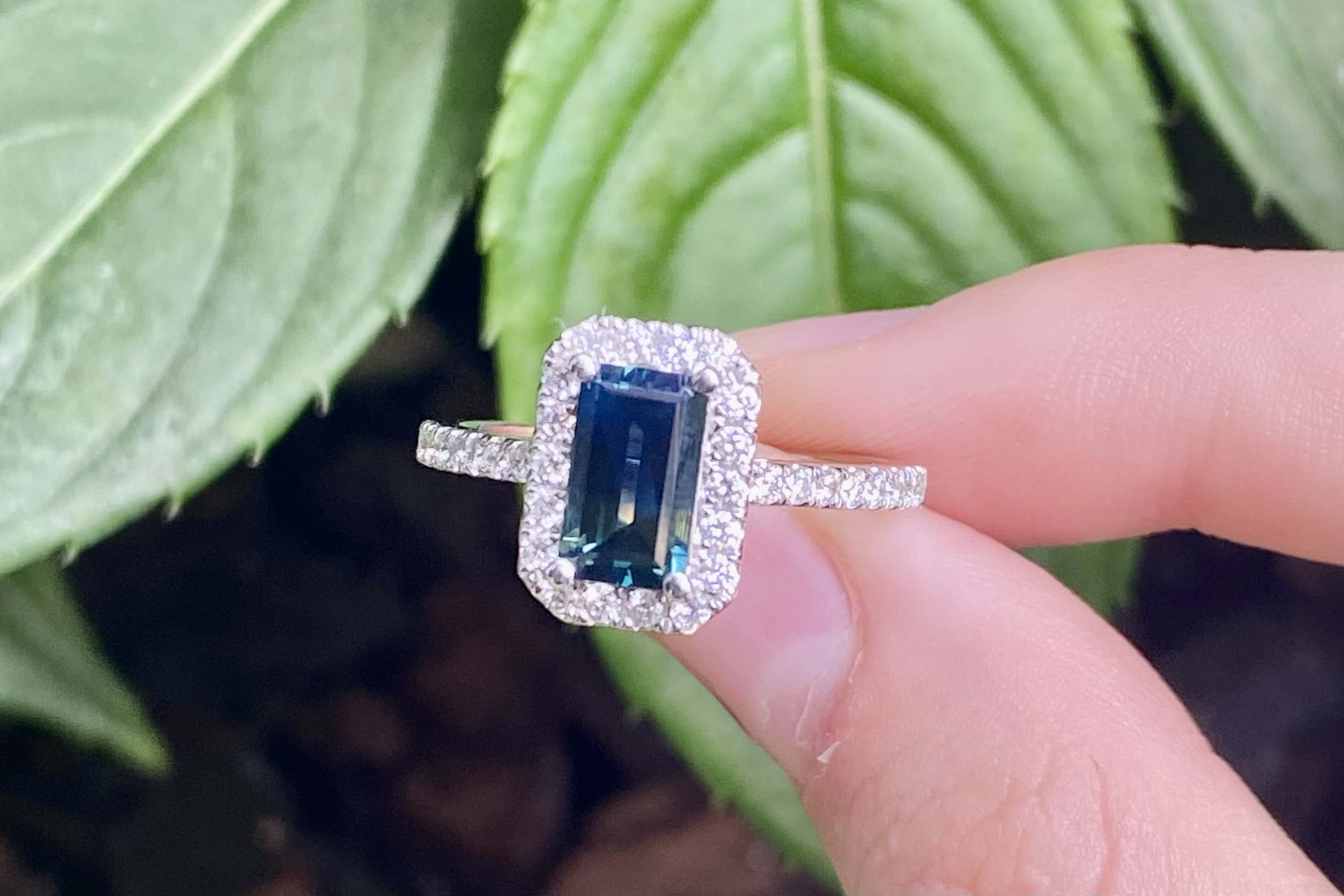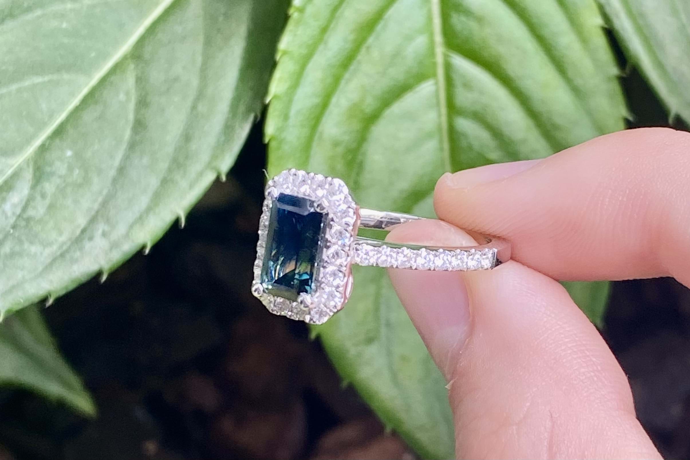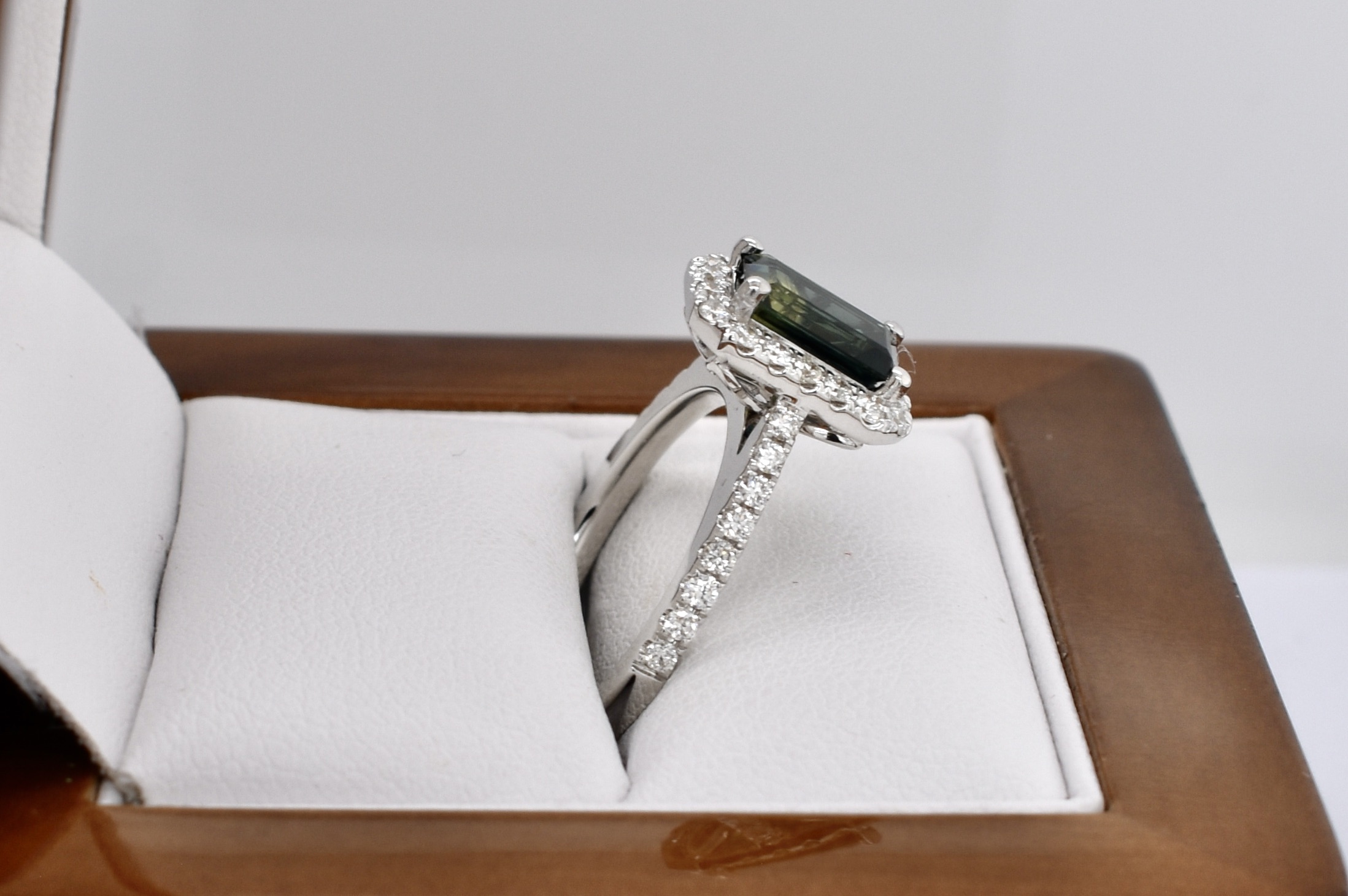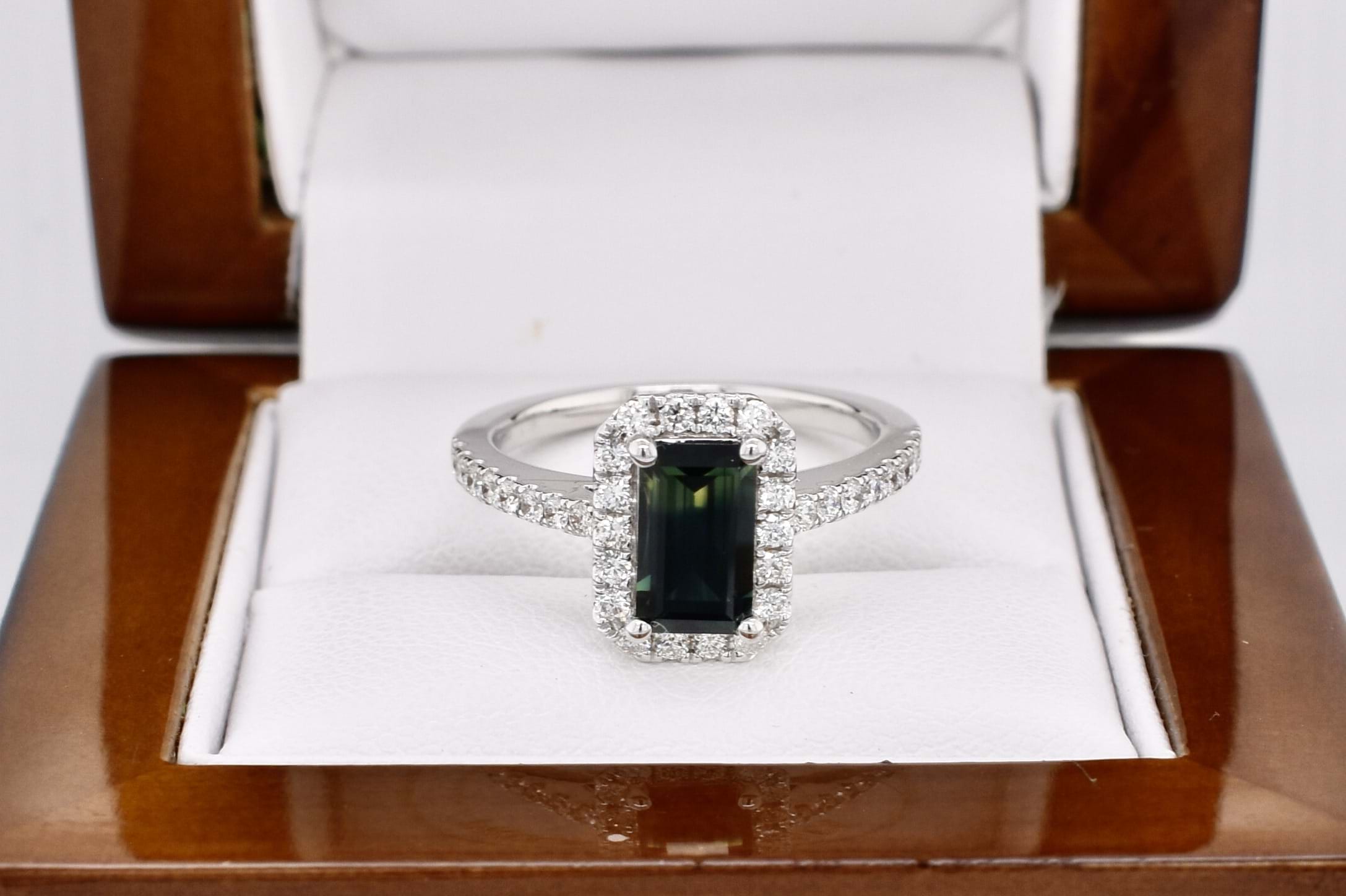Crafted in 18ct white gold, this dazzling ring features a centre emerald cut Australian parti sapphire of 1.45ct, measuring 8.33x4.95x3.40mm, four claw set. Surrounded by eighteen round brilliant cut diamonds in an emerald cut halo, and a further sixteen diamonds down the shoulders. A total of 34 round brilliant cut diamonds, measuring 1.50-1.40mm, totalling 0.48ct FG VS-SI. Completed on a 1.86mm band. Finger size O. Independent Valuation Supplied.