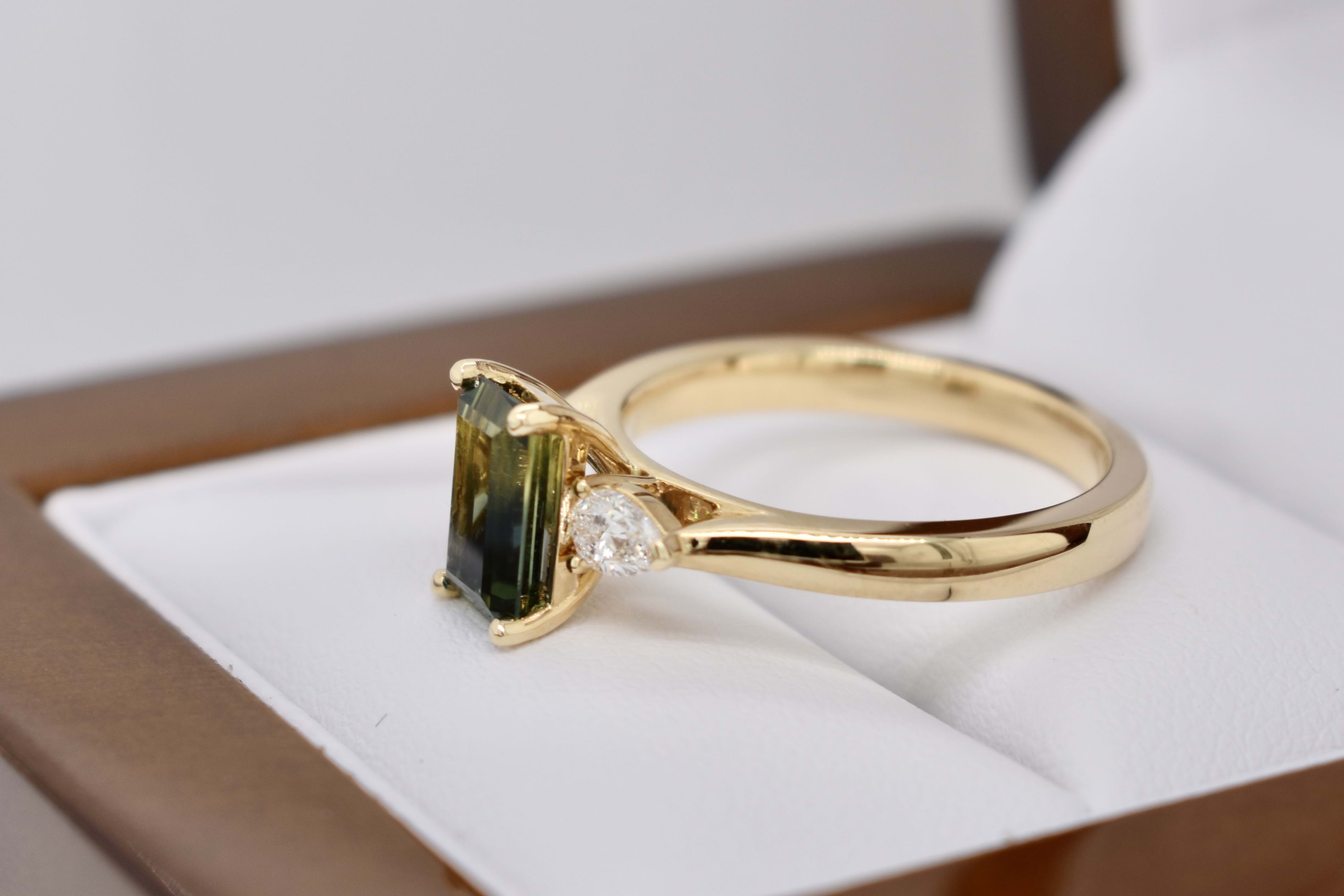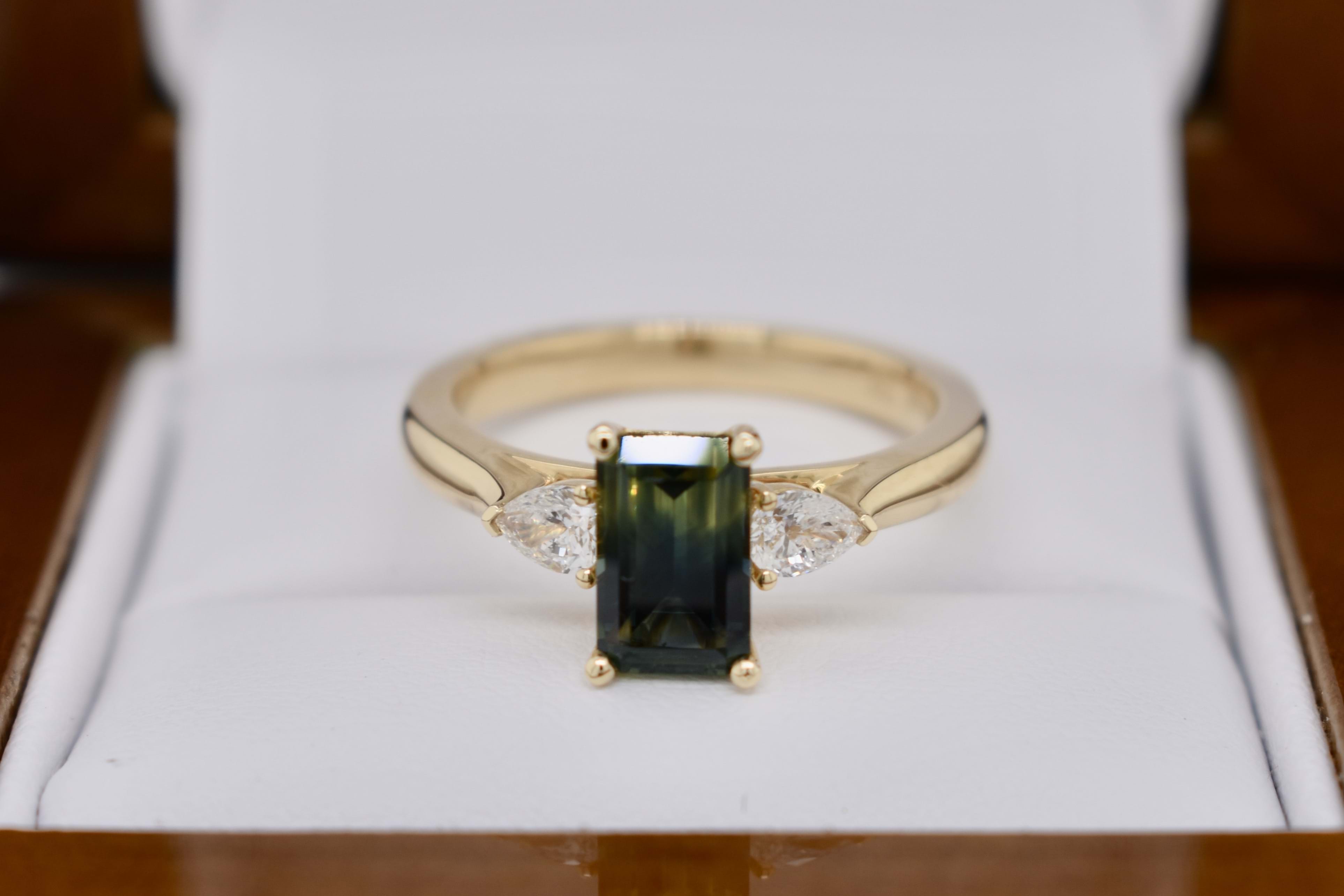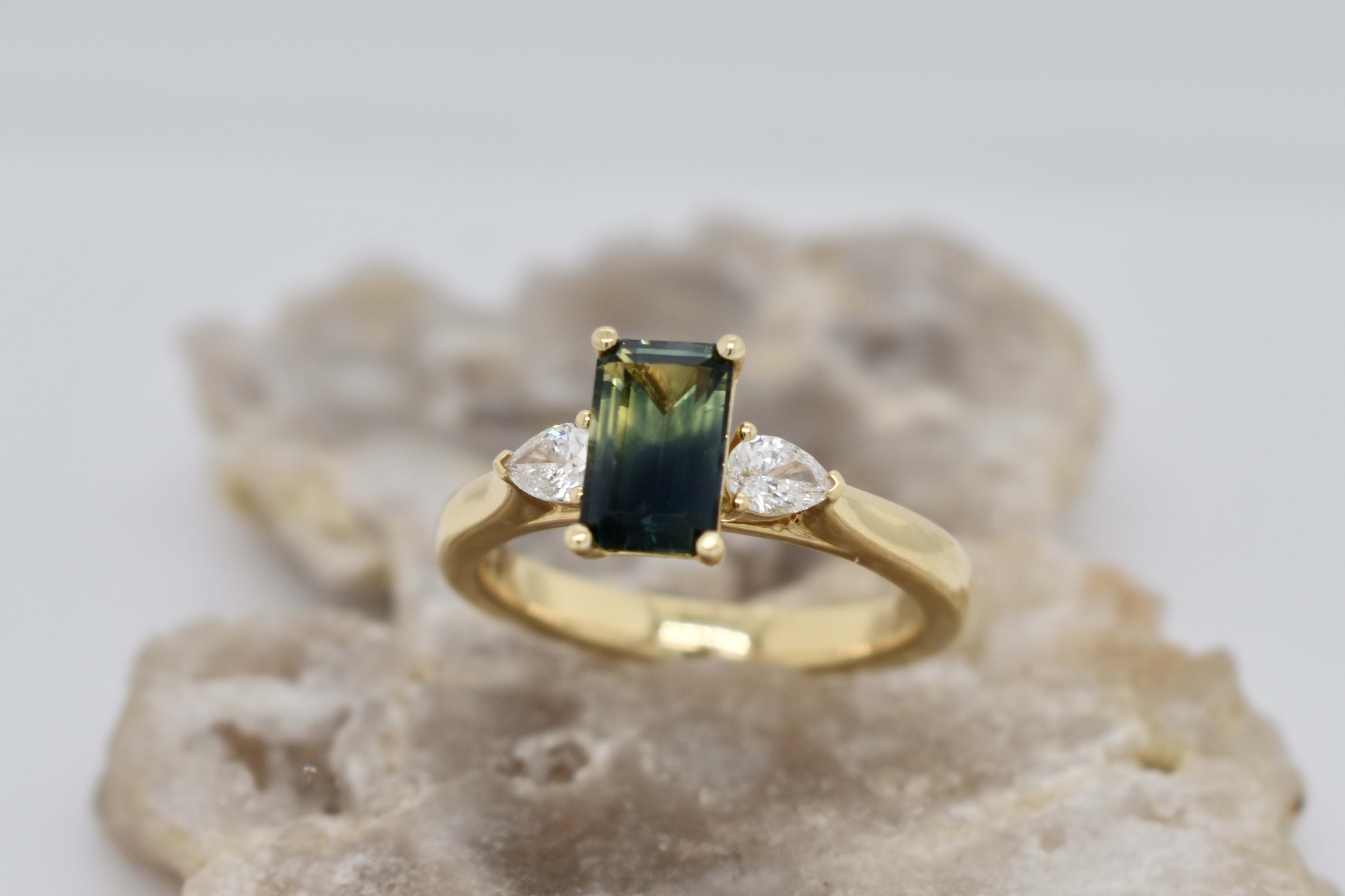 A beautiful, dark blue/light yellow Australian (Queensland) parti sapphire, of 1.49ct emerald cut, is the feature of this ring. Set in 18ct yellow gold with one pear shaped diamond on each side, for a classy yet simplistic look. Diamonds equalling 0.29ct FG/VS-SI, finished with pointed swept up shoulders on a 1/2 round 2.58mm band this ring is designed so that it can be worn by itself or sit flush with other bands. Finger size M. Independent Valuation Supplied