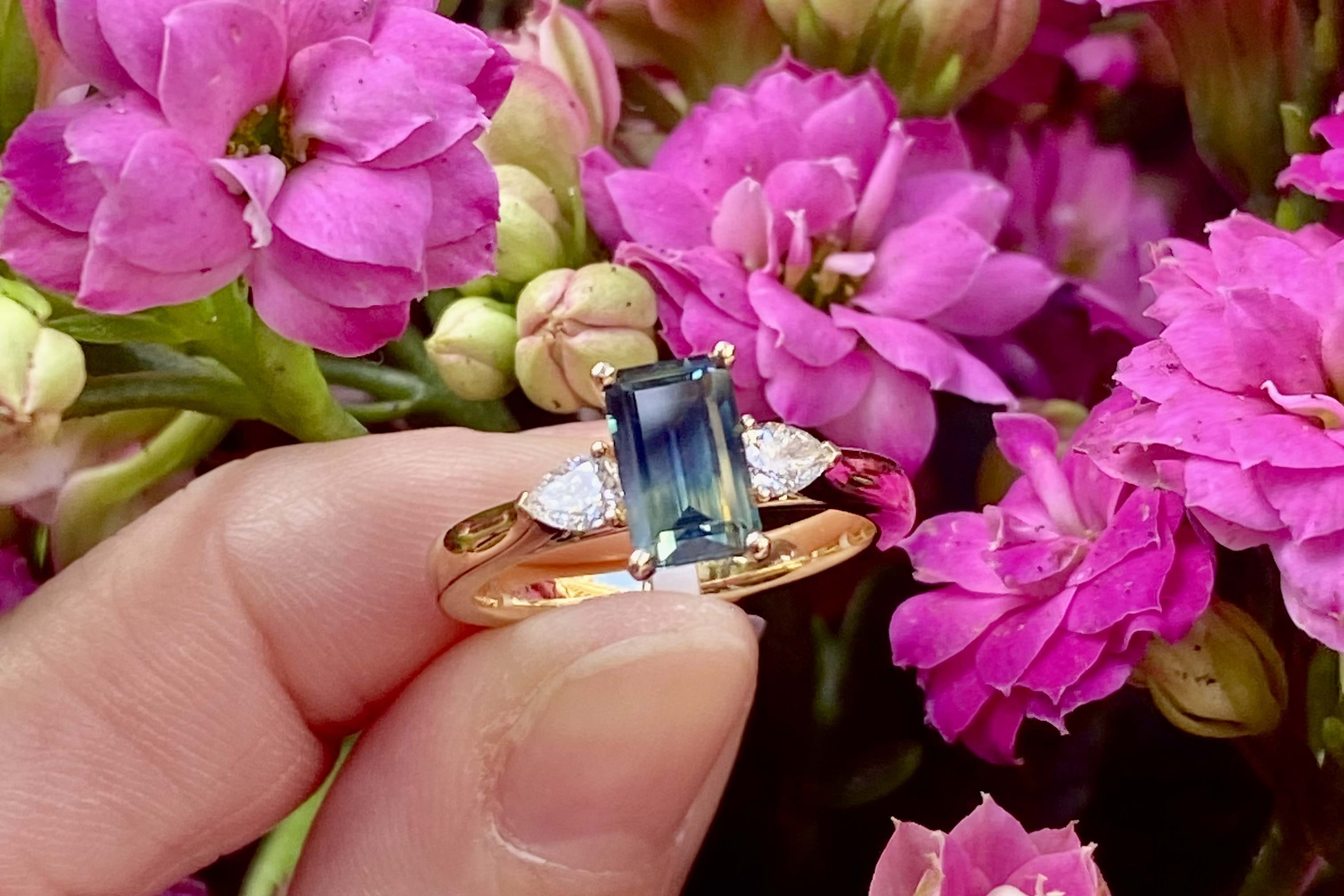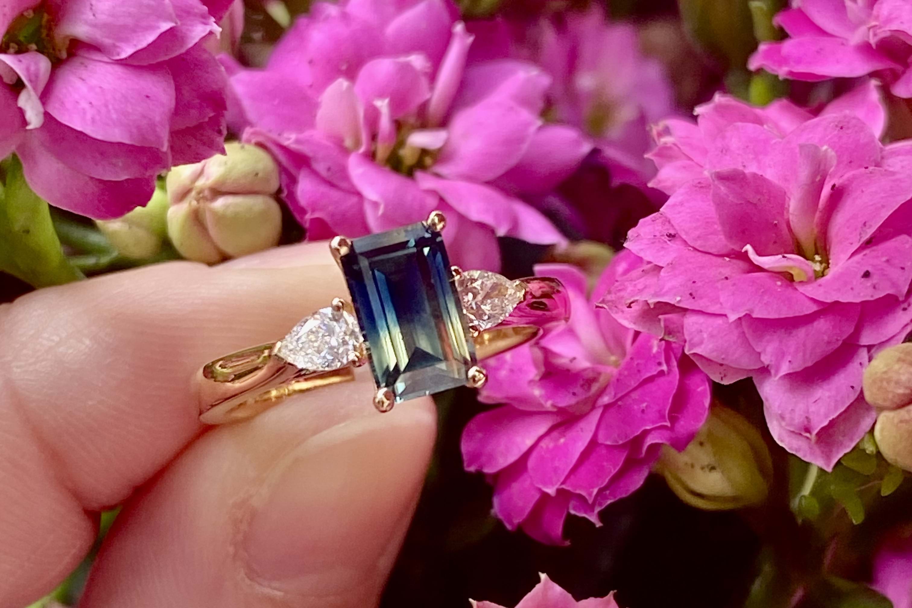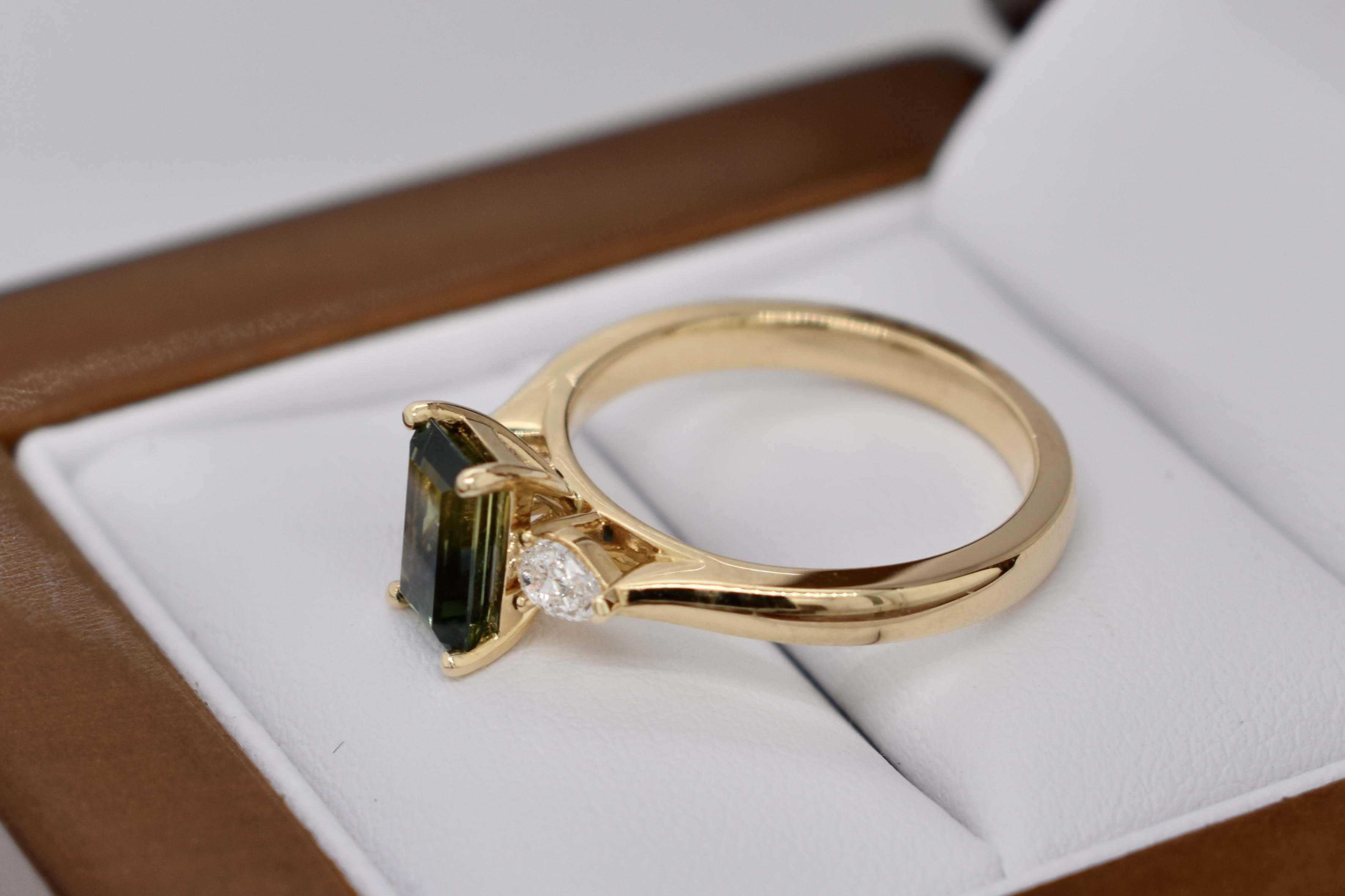 A beautiful, dark blue/light yellow Australian (Queensland) parti sapphire, of 1.49ct emerald cut, is the feature of this ring. Set in 18ct yellow gold with one pear shaped diamond on each side, for a classy yet simplistic look. Diamonds equalling 0.29ct FG/VS-SI, finished with pointed swept up shoulders on a 1/2 round 2.58mm band this ring is designed so that it can be worn by itself or sit flush with other bands. Finger size M. Independent Valuation Supplied