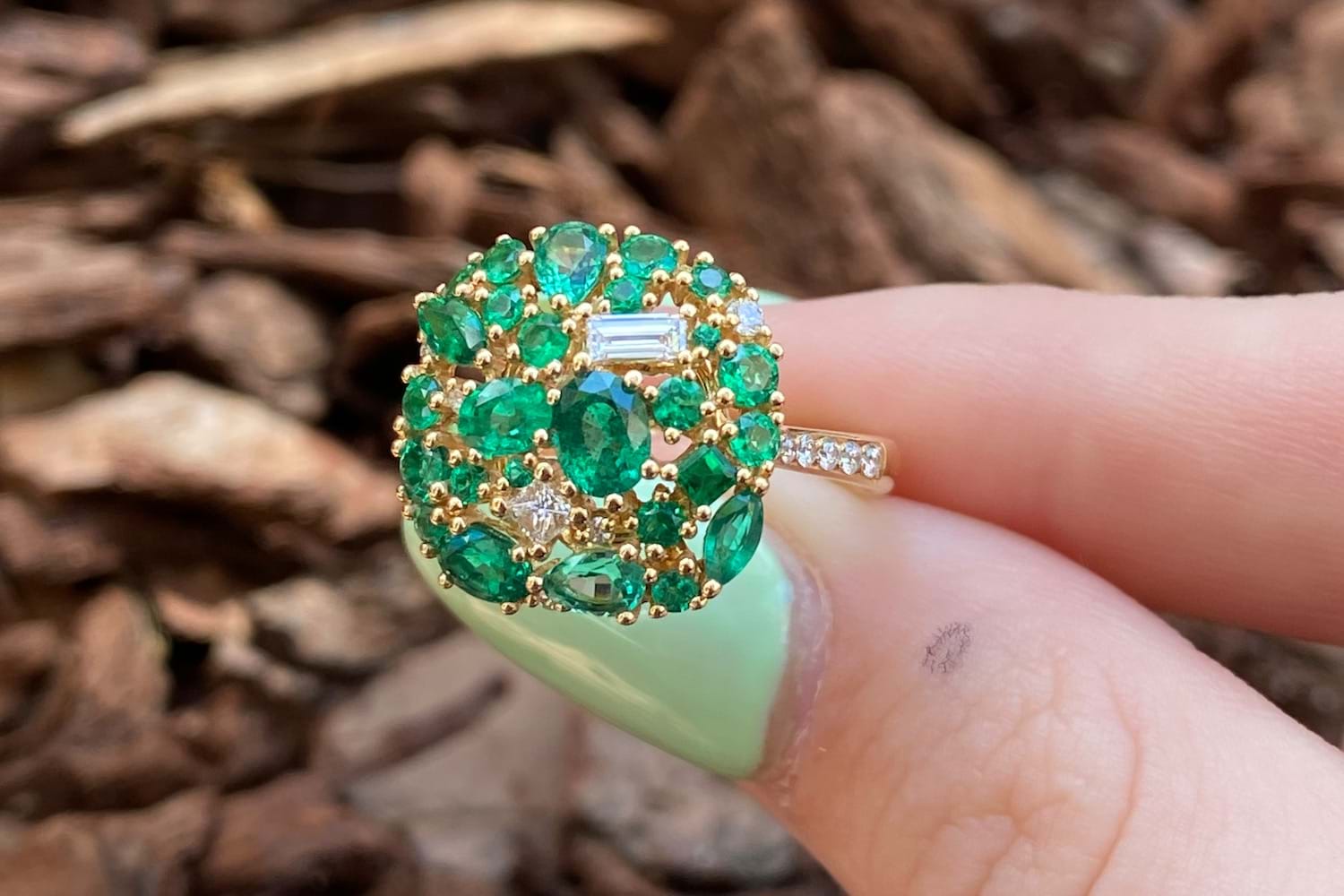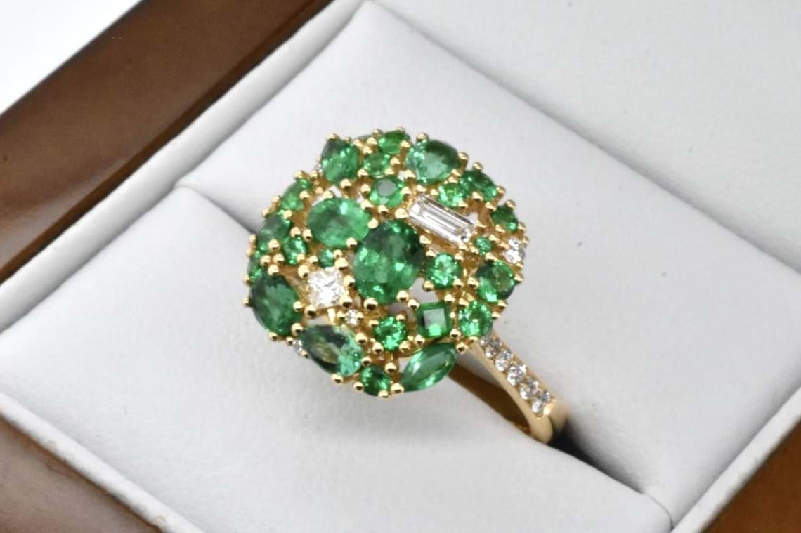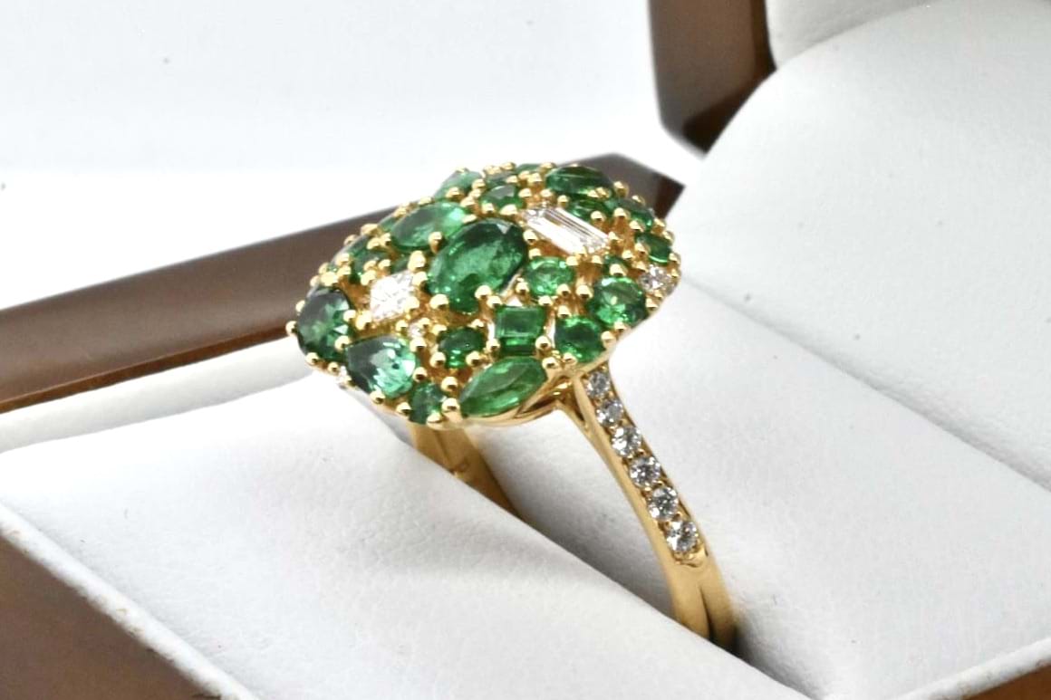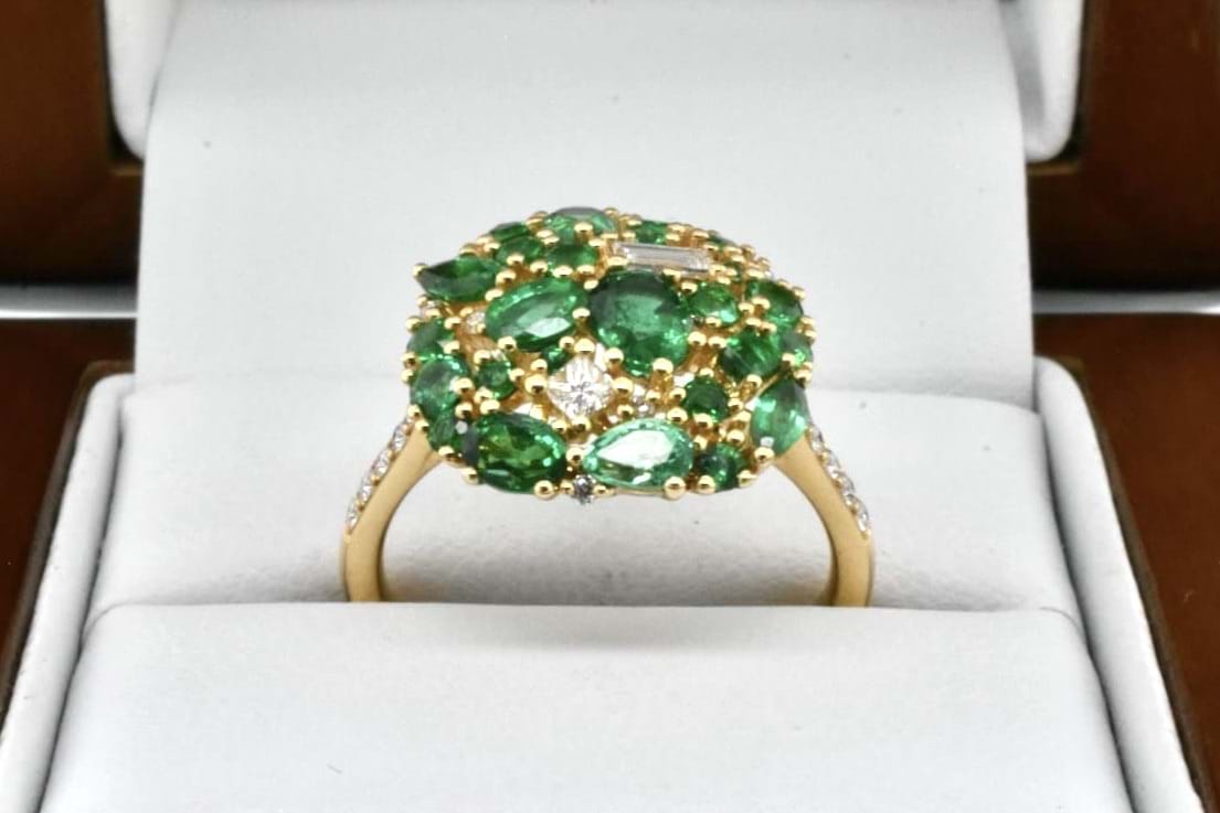 An absolutely gorgeous, contemporary Italian made cluster crafted from 18ct yellow gold with a total of 26 equalling 1.65ct natural mid to dark green emeralds in round, oval, pear and marquise shapes with a scattering of 7 sparkling, white diamonds in baguette, princess and round brilliant cuts with additional diamonds down the shoulders for a shimmering finishing detail, with a plain tapered band. Total diamond content is 19=0.28ct F/SI. Finger size N