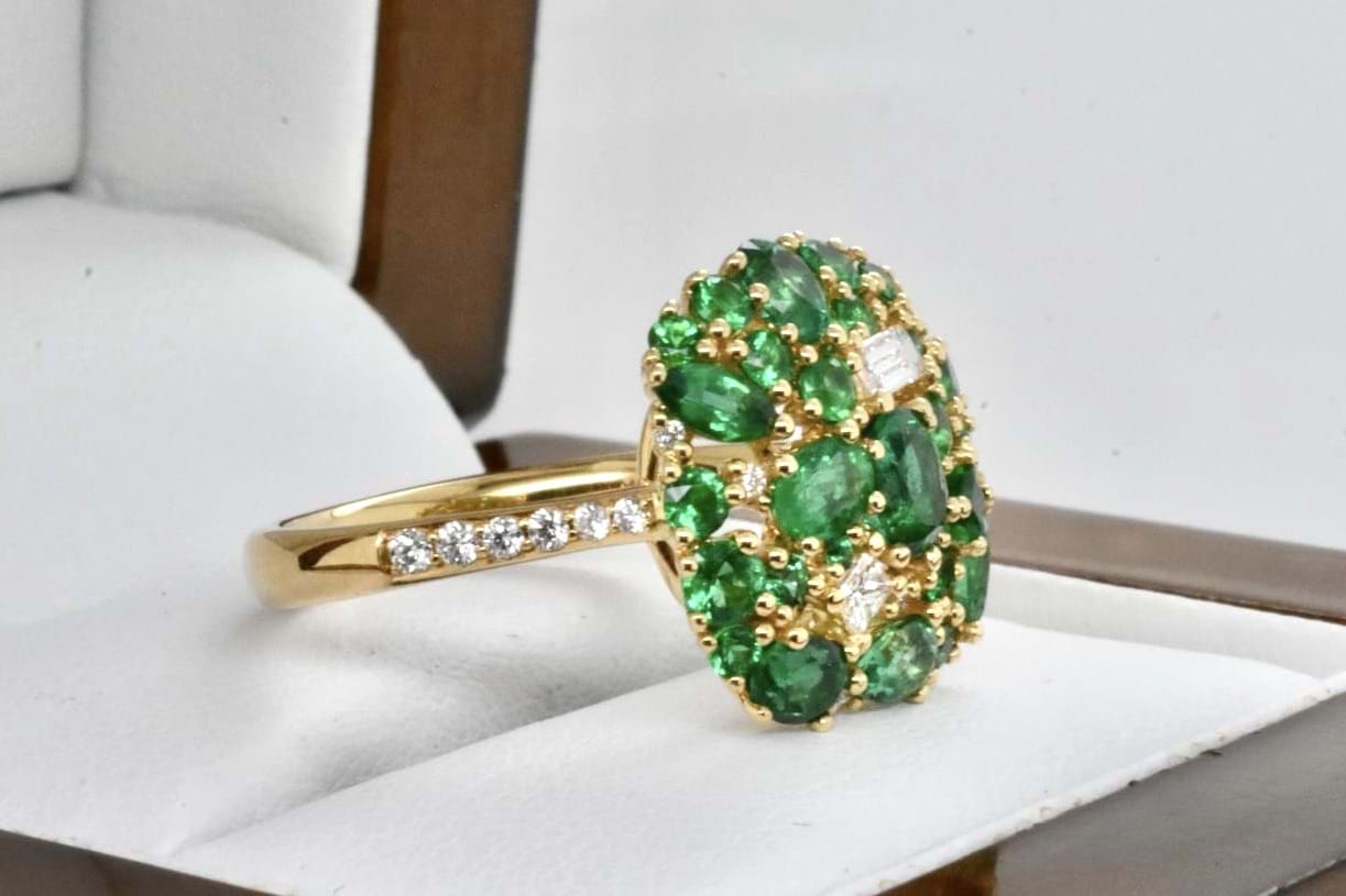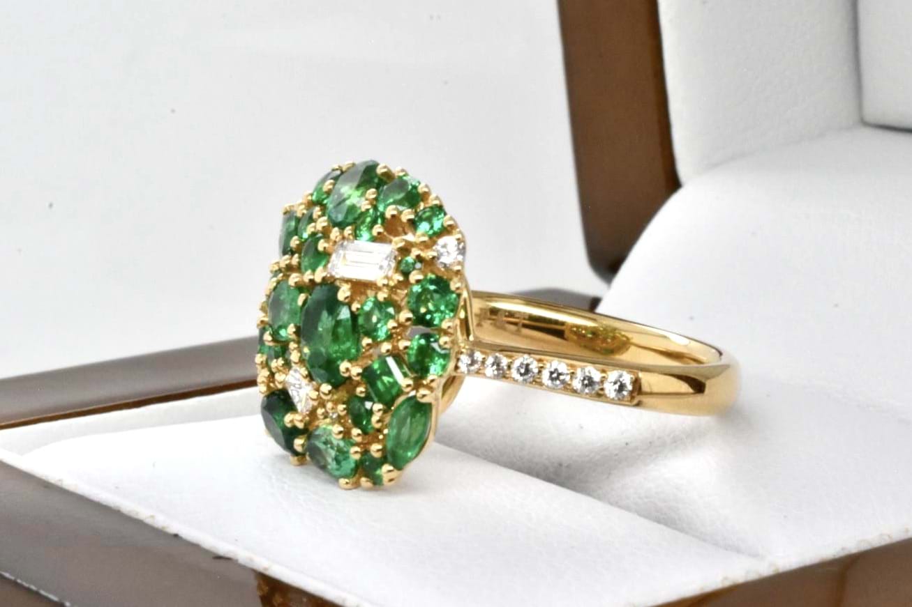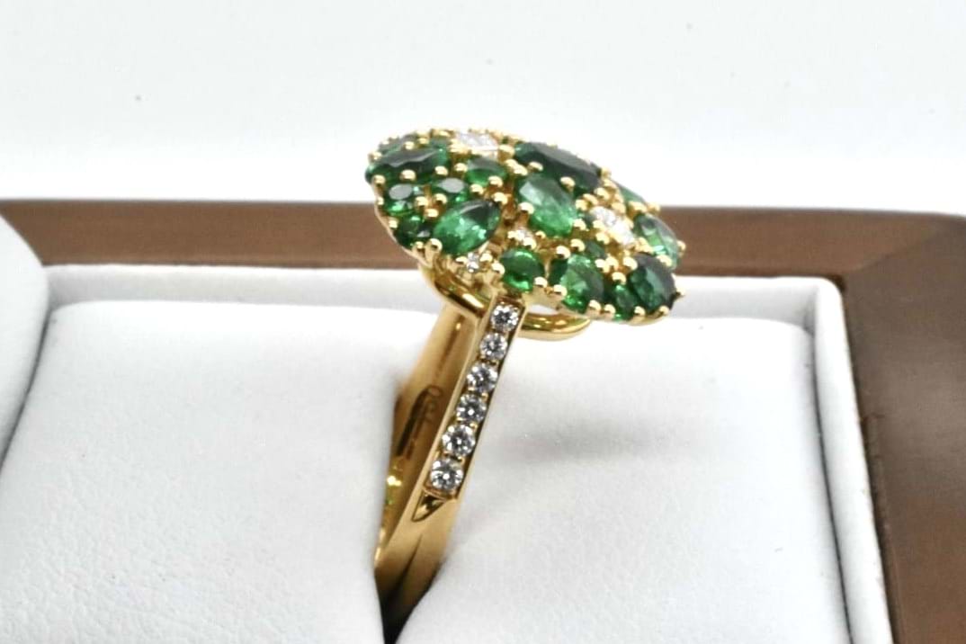 An absolutely gorgeous, contemporary Italian made cluster crafted from 18ct yellow gold with a total of 26 equalling 1.65ct natural mid to dark green emeralds in round, oval, pear and marquise shapes with a scattering of 7 sparkling, white diamonds in baguette, princess and round brilliant cuts with additional diamonds down the shoulders for a shimmering finishing detail, with a plain tapered band. Total diamond content is 19=0.28ct F/SI. Finger size N