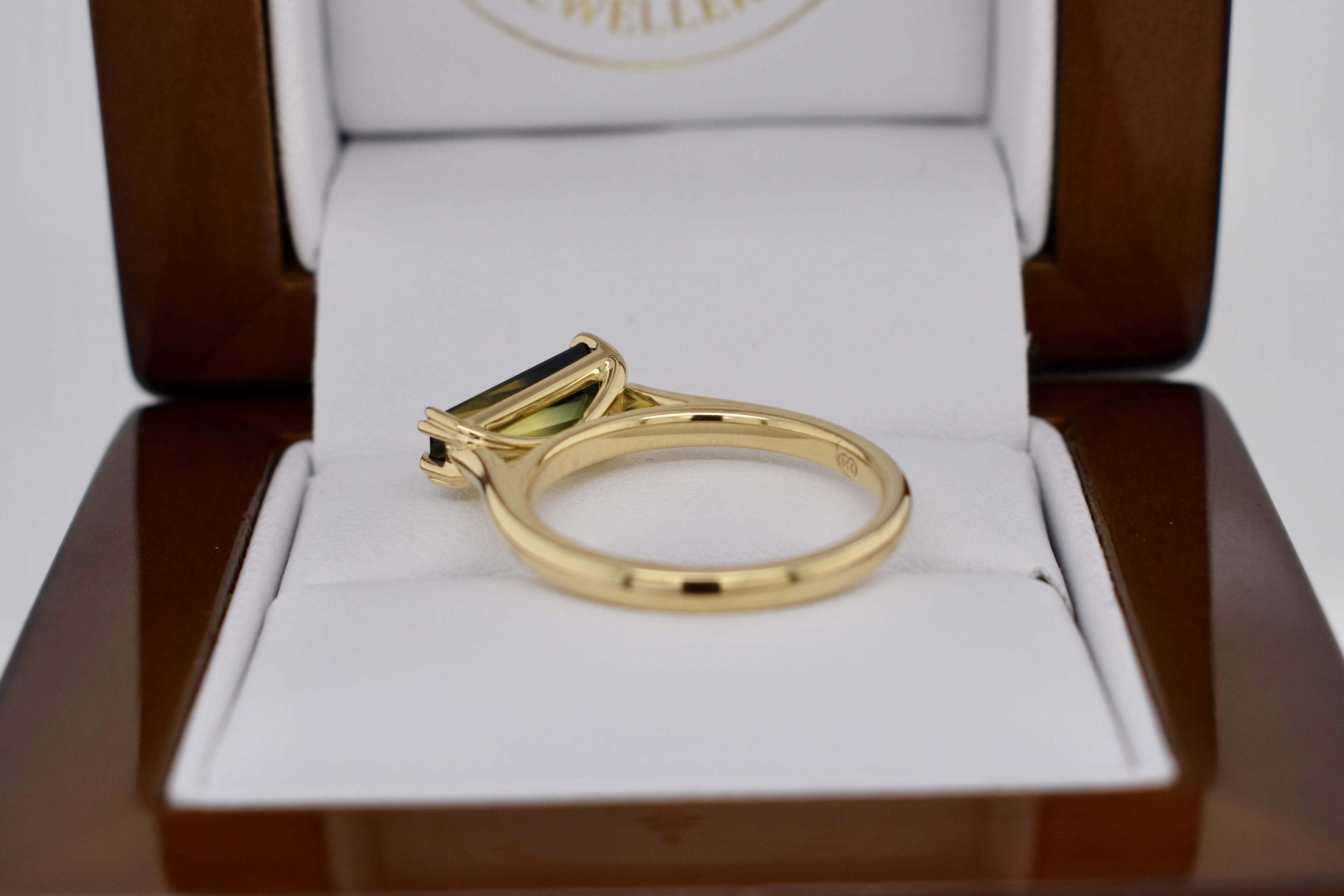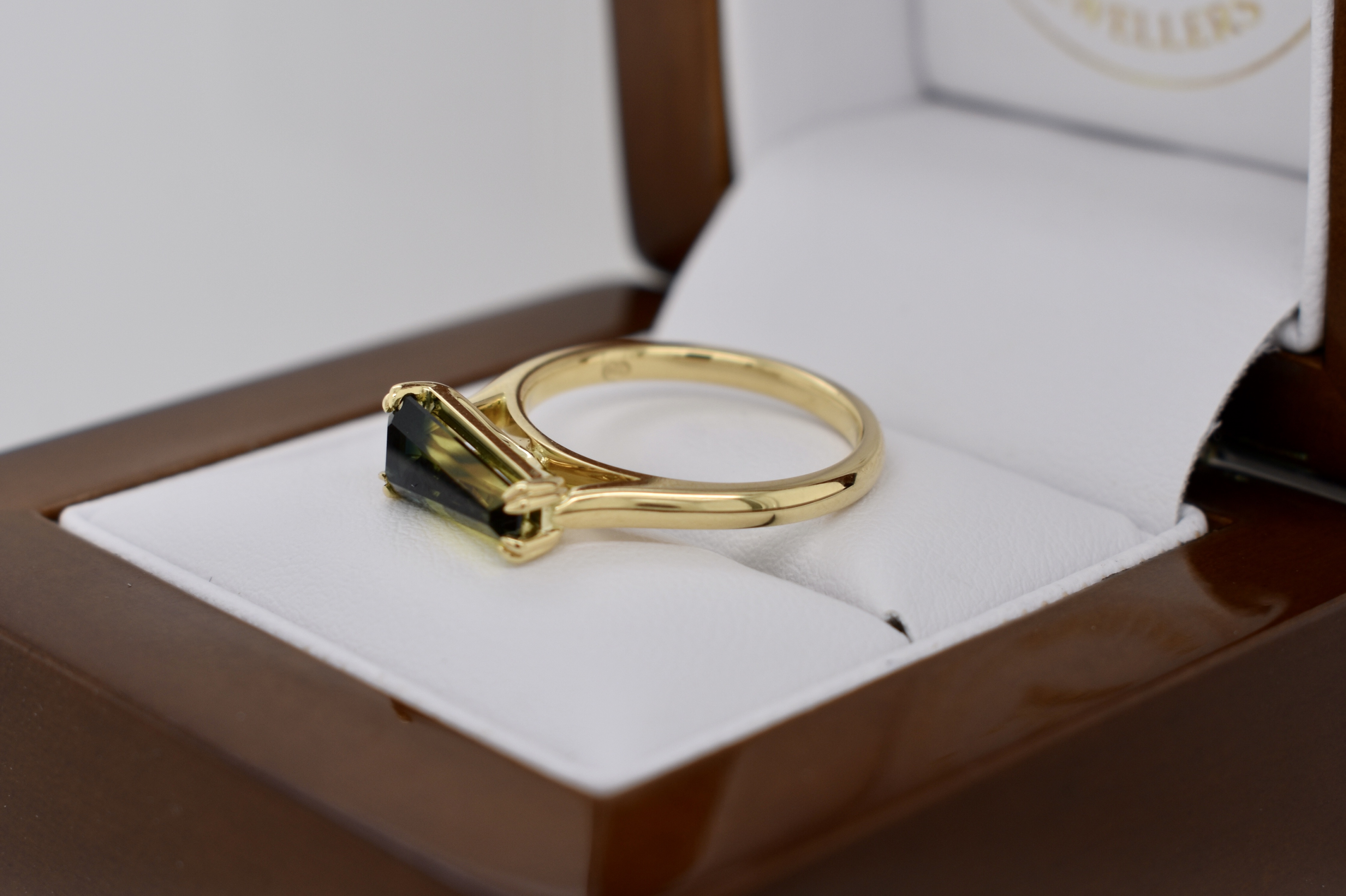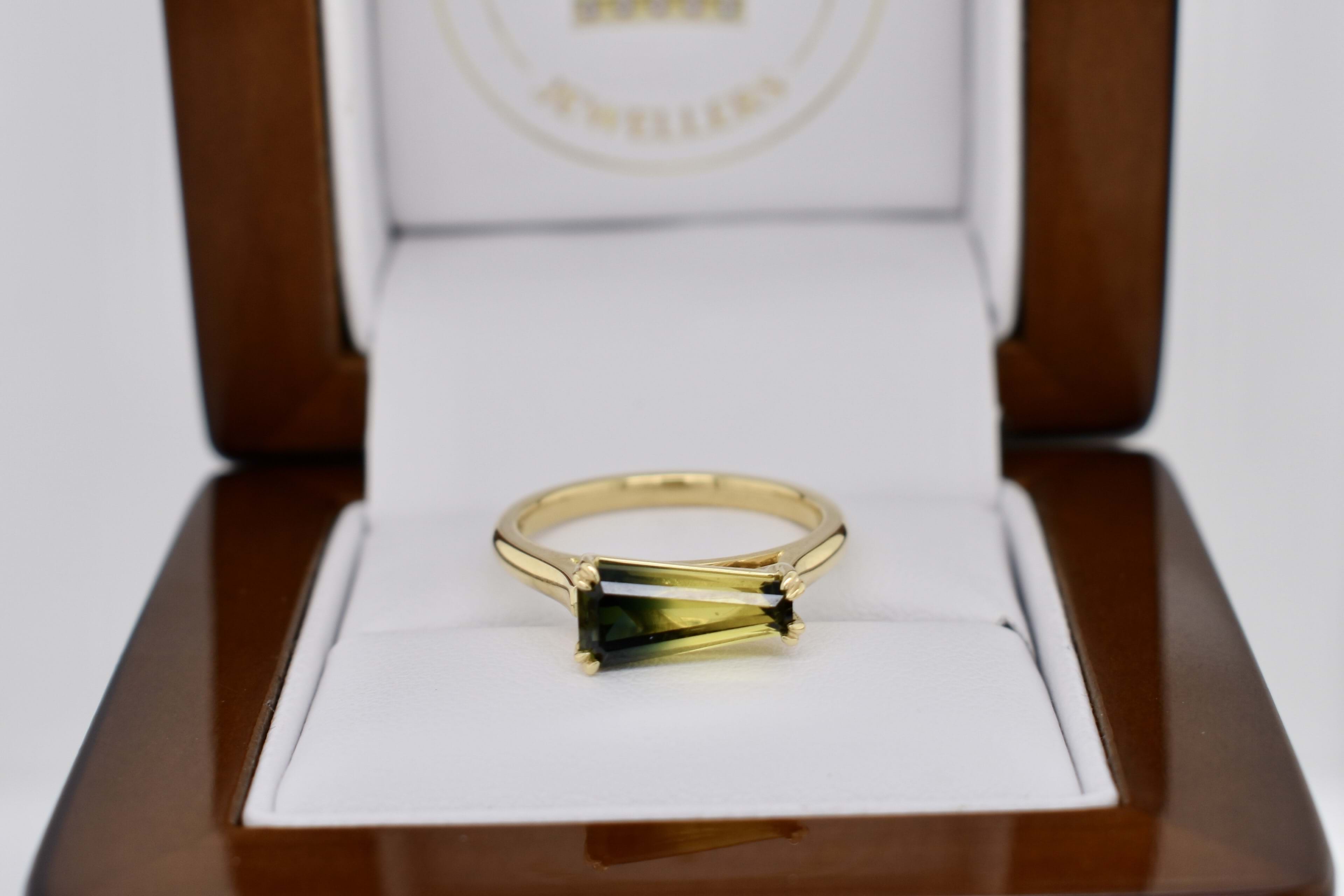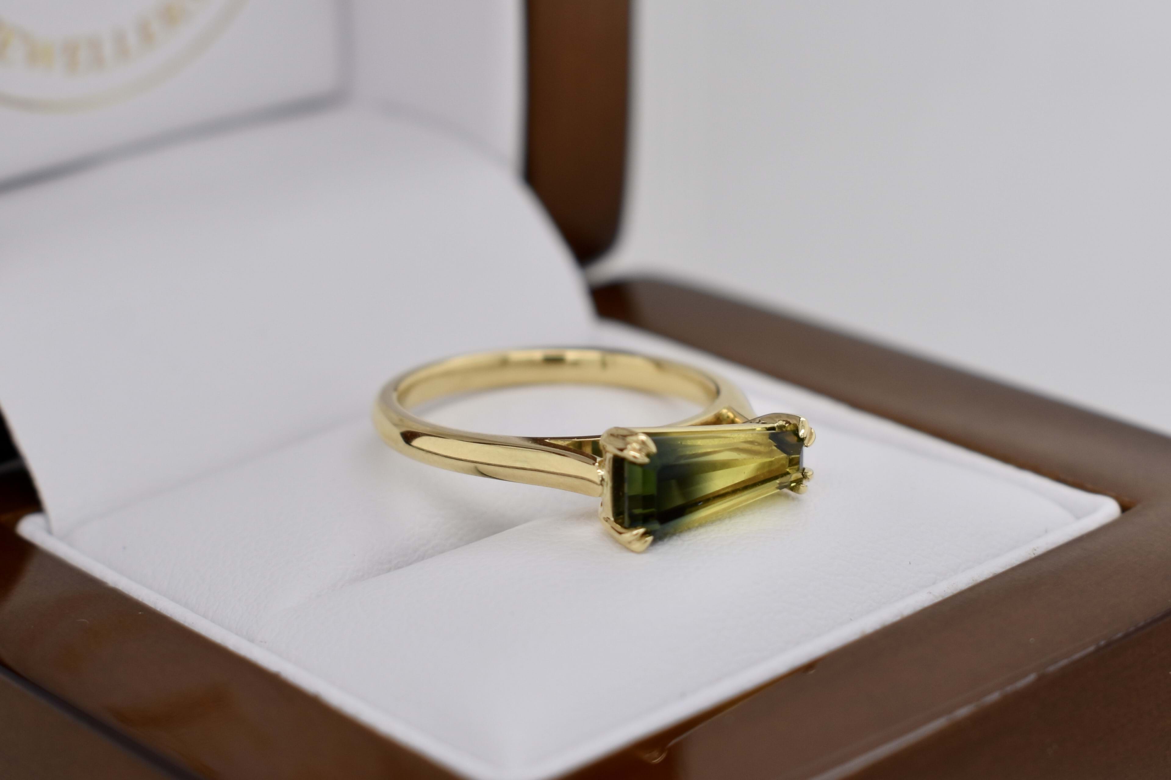 This super unusual and unique Australian parti sapphire was hand selected and designed in store to be the feature of this east/west 18ct yellow gold ring. The sapphire is a 1.70ct cut cornered tapered baguette that graduates in colour from blue to yellow. The sapphire has four double talon claws to secure it and an under-rail allowing it to sit perfectly with wedding bands. Finger size M. Independent Valuation Supplied