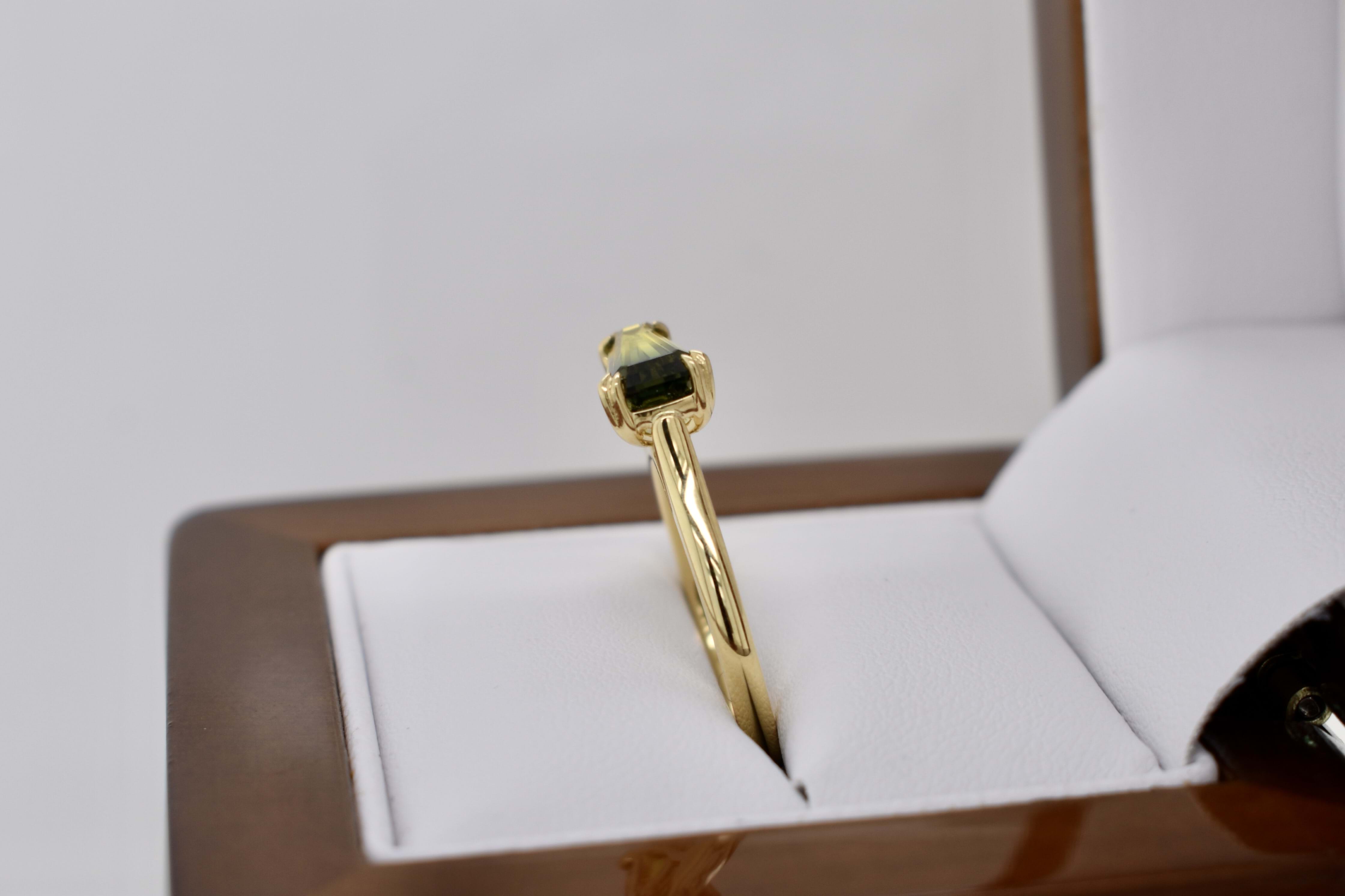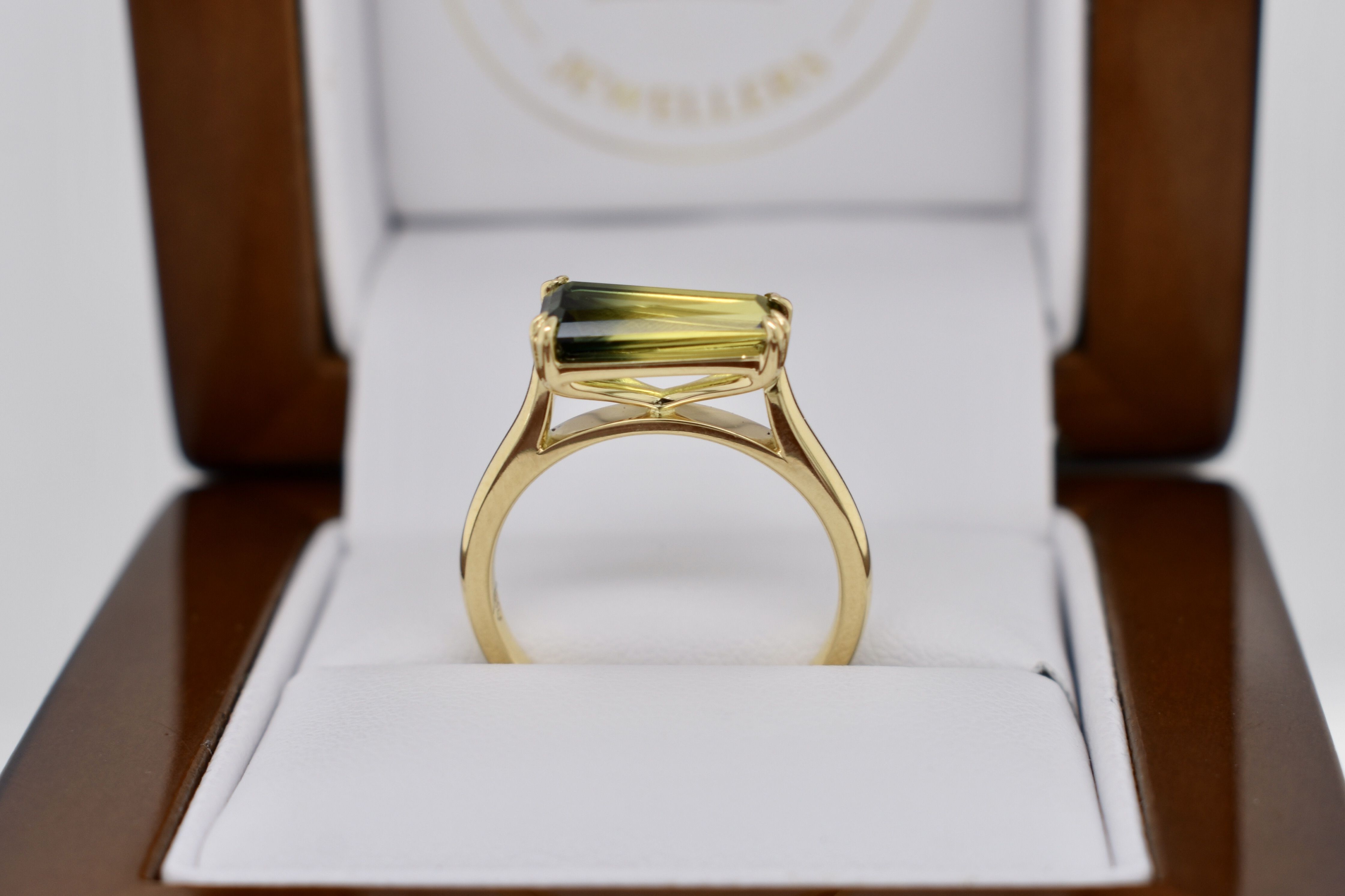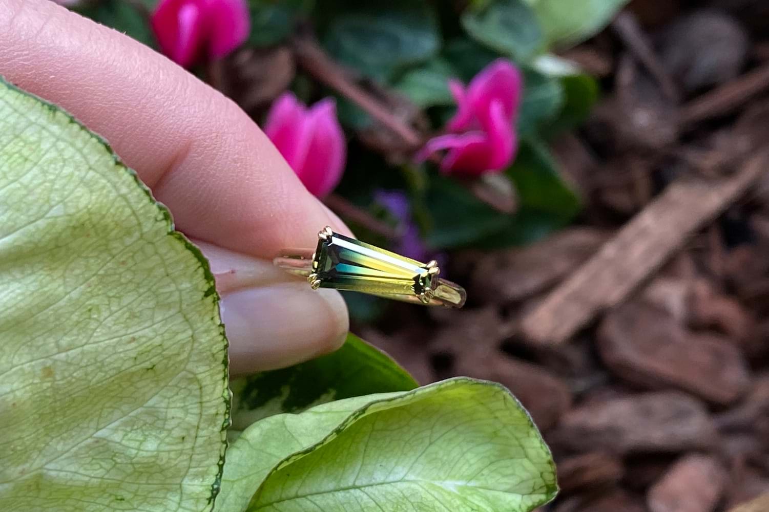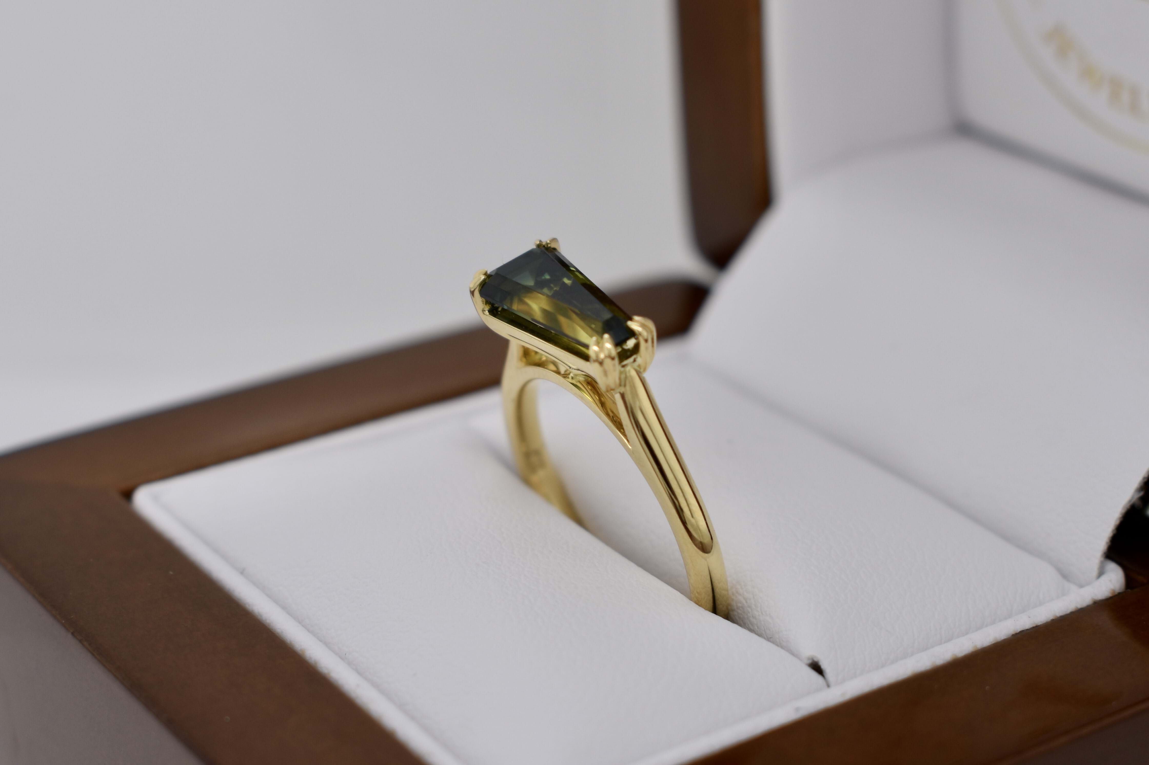 This super unusual and unique Australian parti sapphire was hand selected and designed in store to be the feature of this east/west 18ct yellow gold ring. The sapphire is a 1.70ct cut cornered tapered baguette that graduates in colour from blue to yellow. The sapphire has four double talon claws to secure it and an under-rail allowing it to sit perfectly with wedding bands. Finger size M. Independent Valuation Supplied