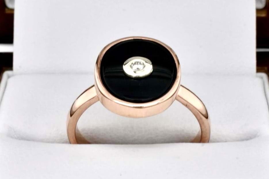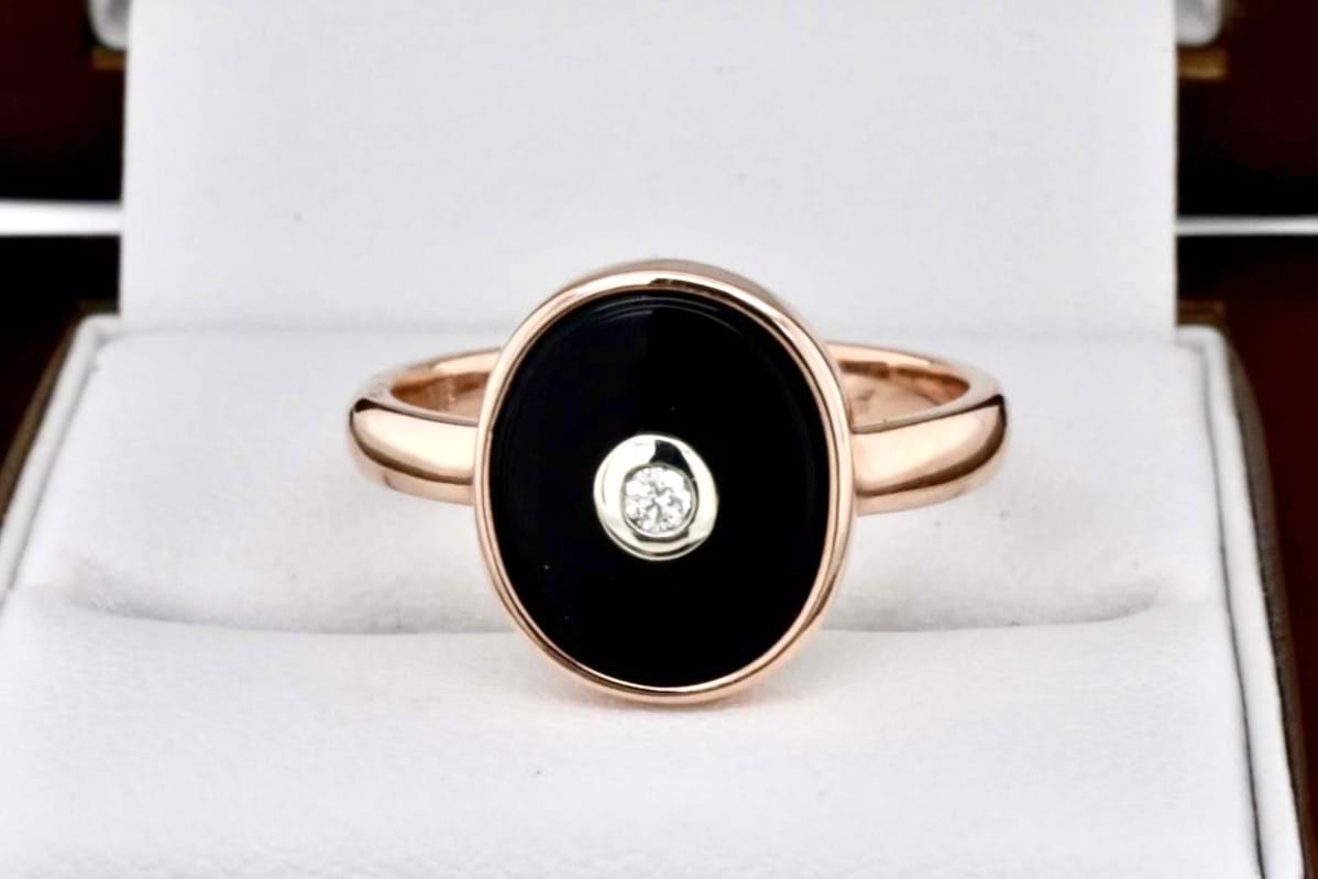 Simple and classic. 9ct rose gold ring featuring an oval panel of black onyx bezel set with a sparkling round diamond white gold bezel set in the centre and a plain band. Finger size N