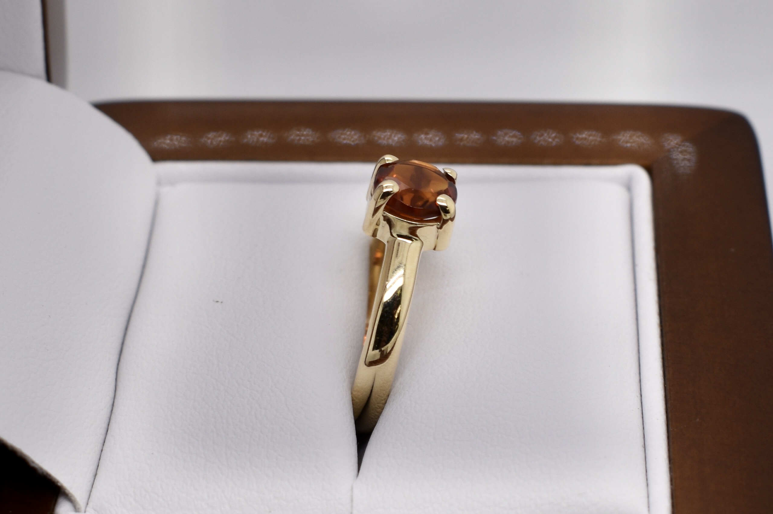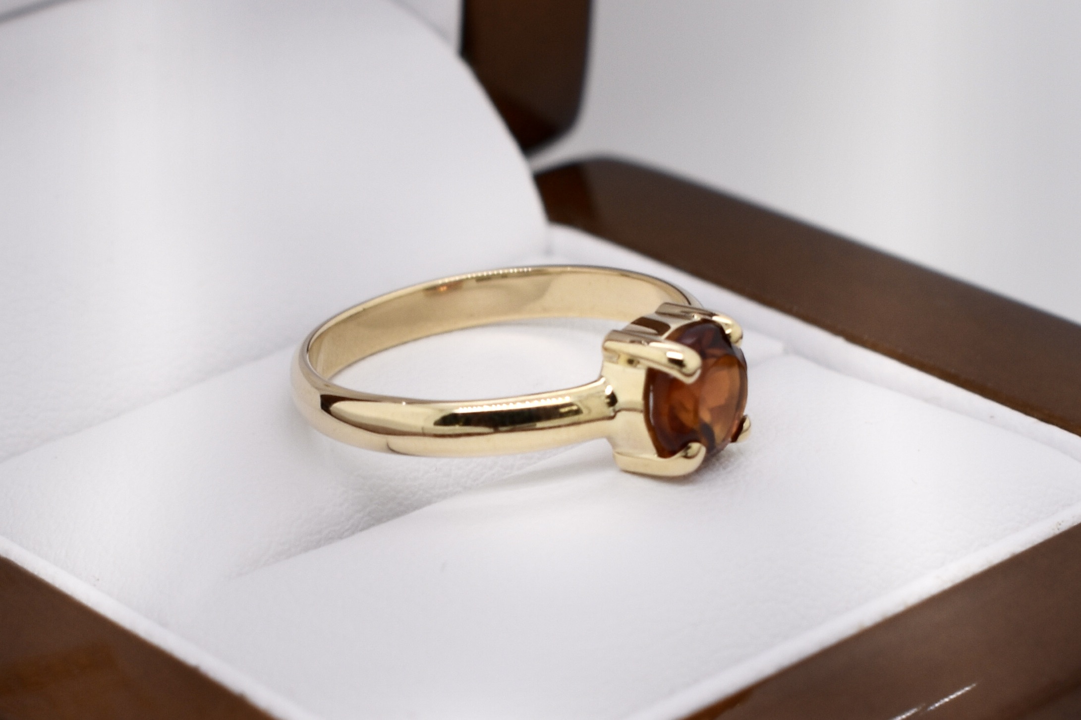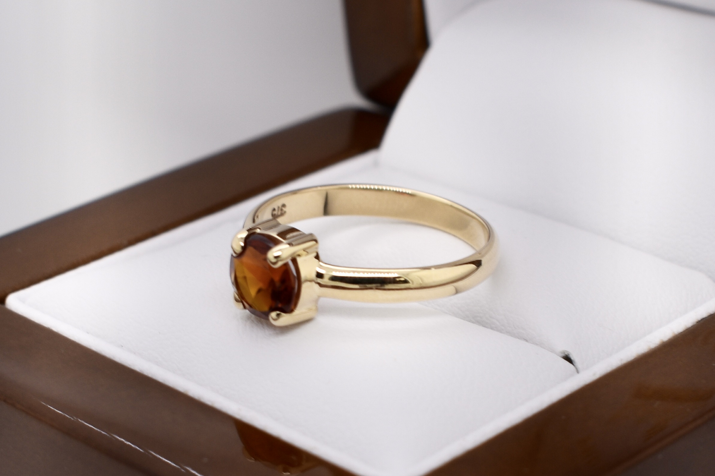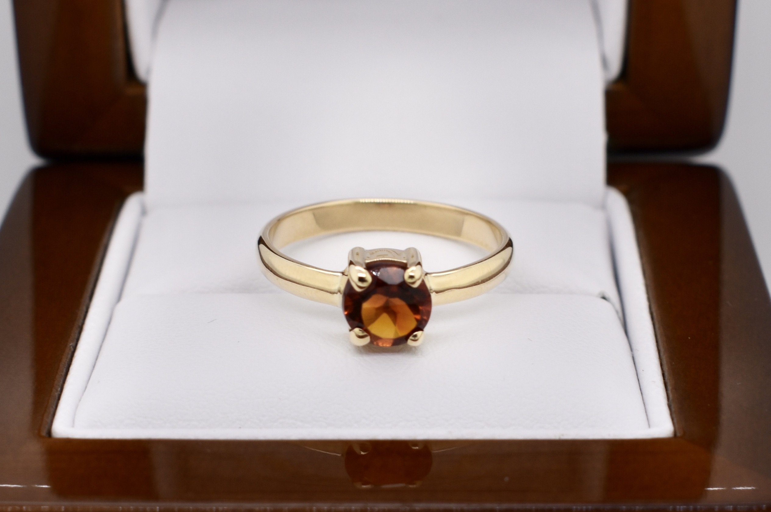 Crafted in 9ct yellow gold, one round citrine, dark orange in colour, four claw set, measuring 6.5mm. Finished with a plain gold band. Finger size M+.