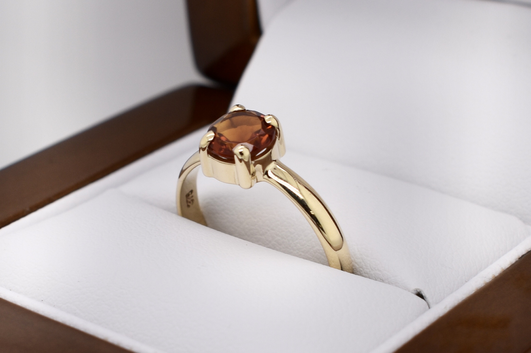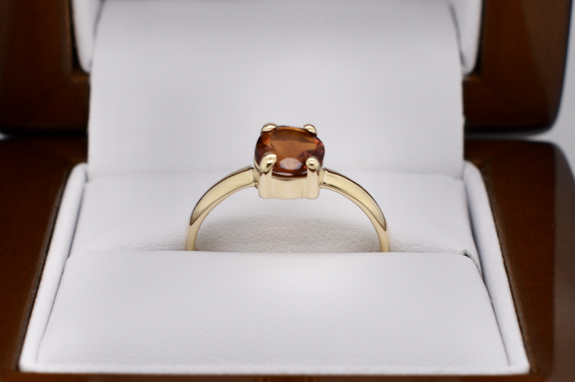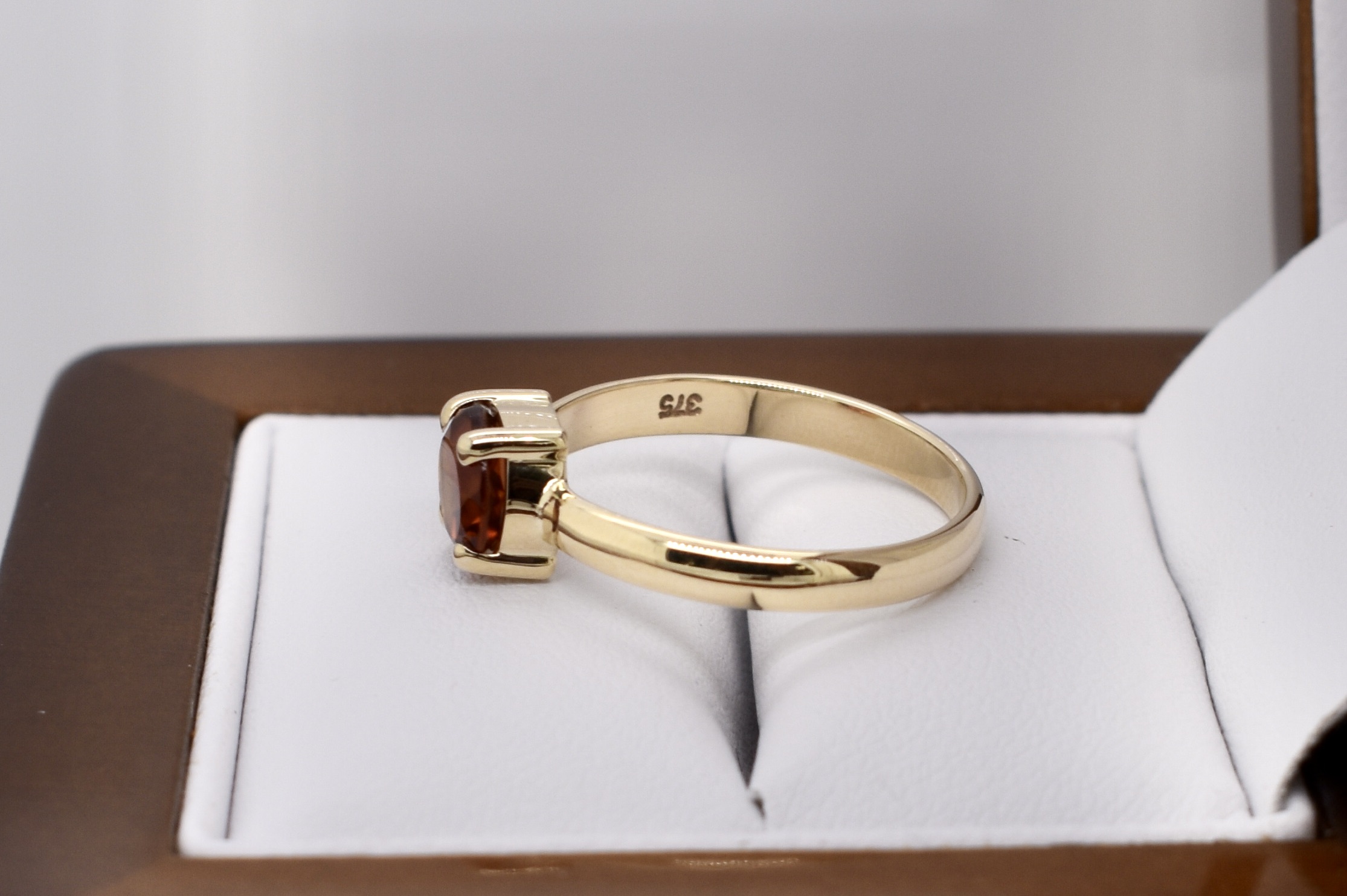 Crafted in 9ct yellow gold, one round citrine, dark orange in colour, four claw set, measuring 6.5mm. Finished with a plain gold band. Finger size M+.