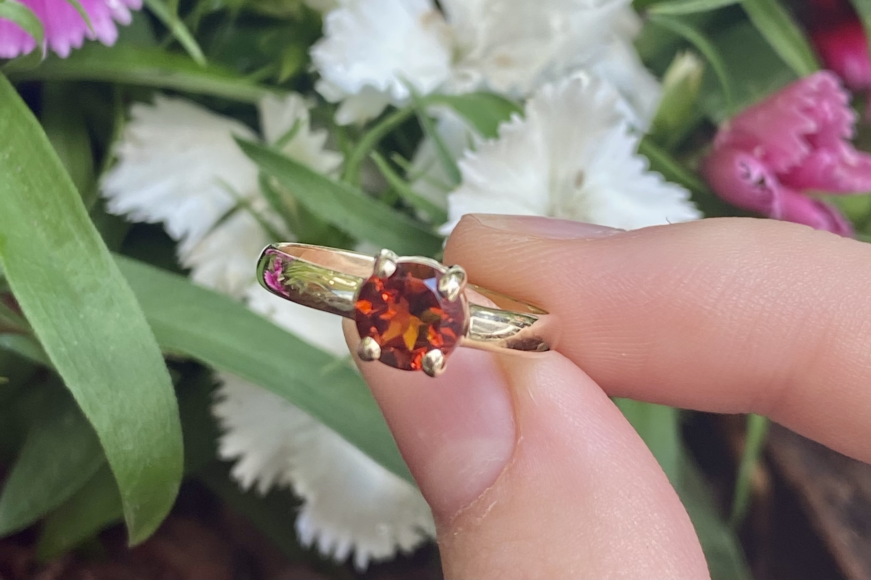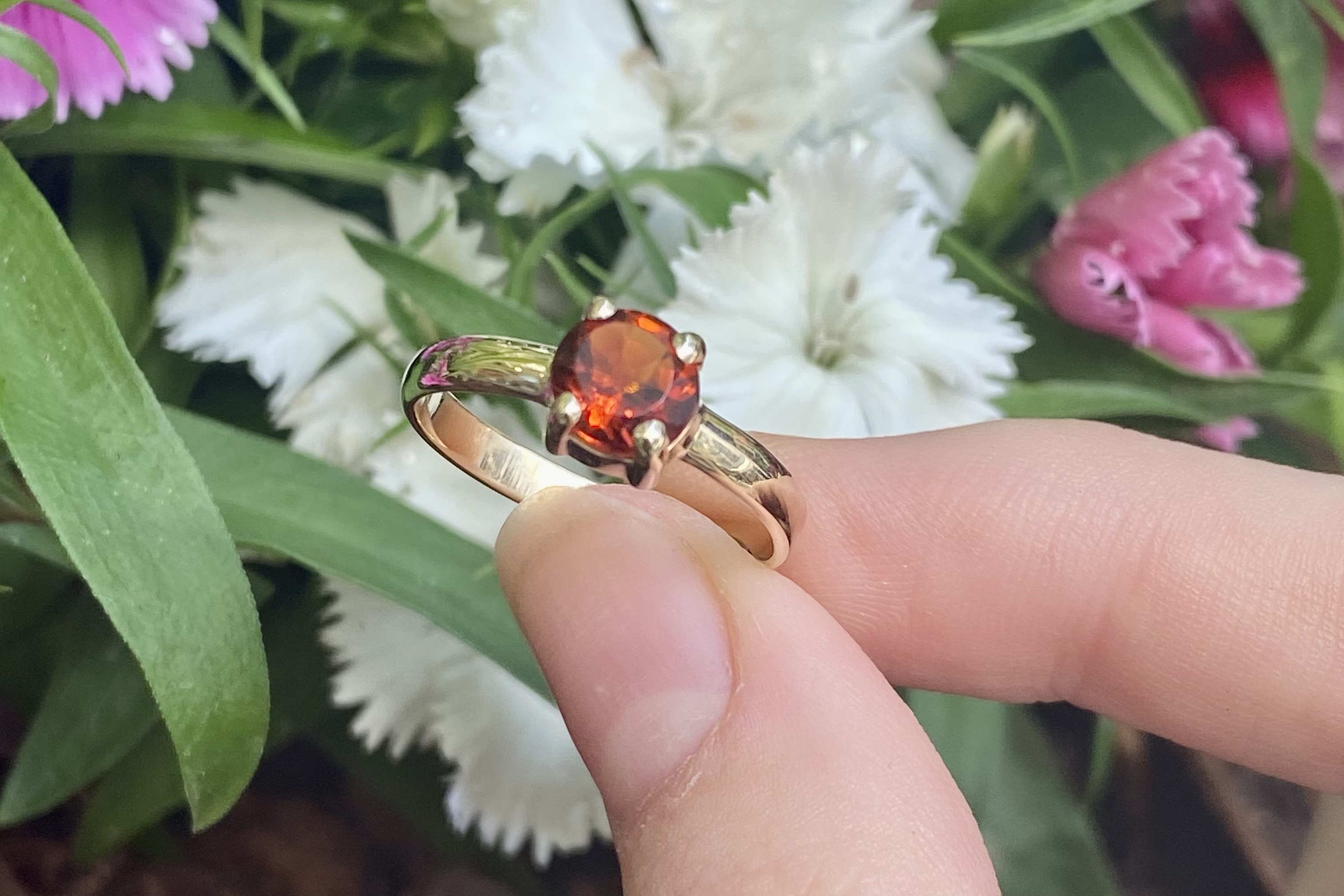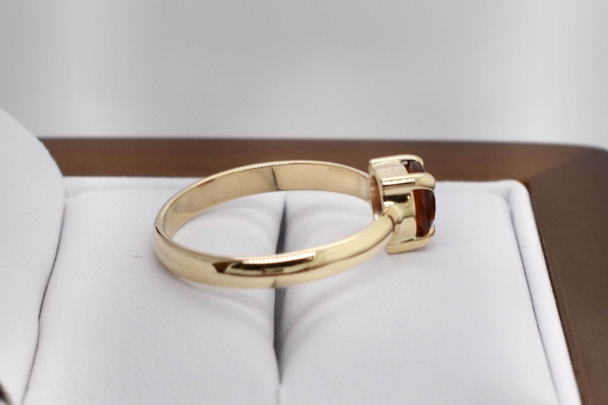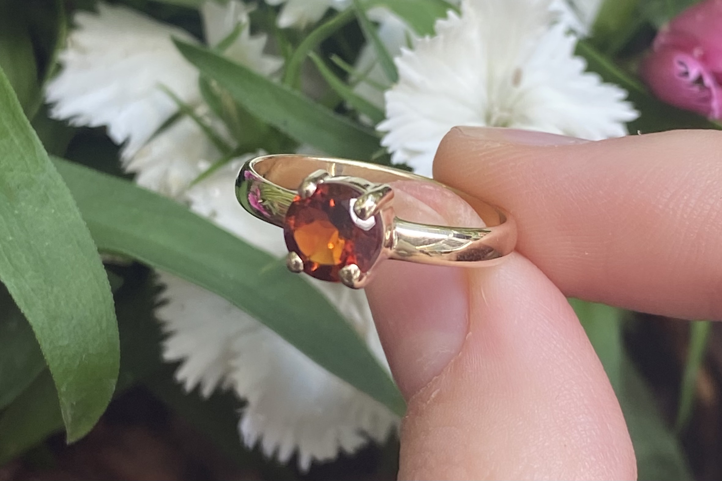 Crafted in 9ct yellow gold, one round citrine, dark orange in colour, four claw set, measuring 6.5mm. Finished with a plain gold band. Finger size M+.