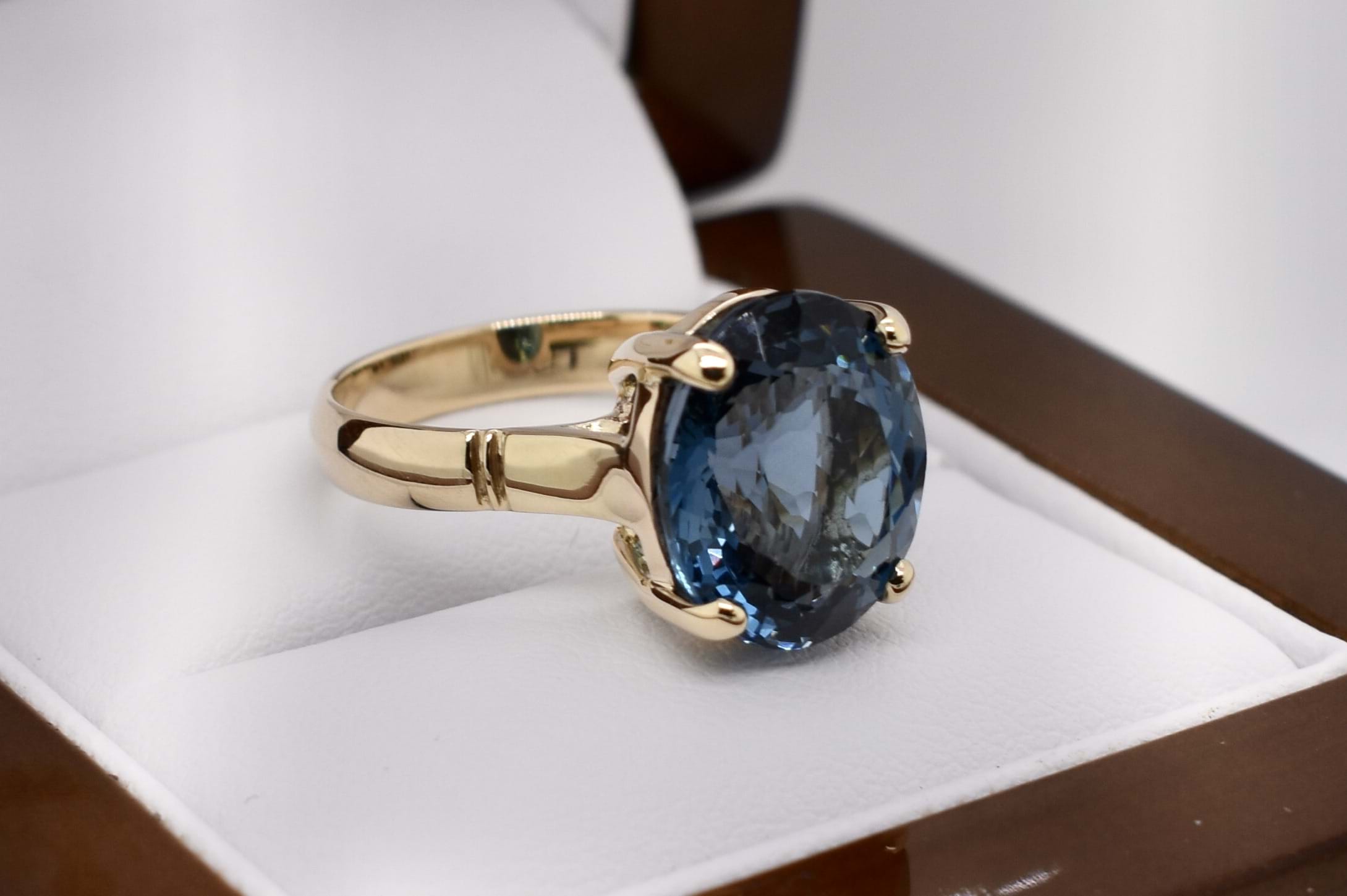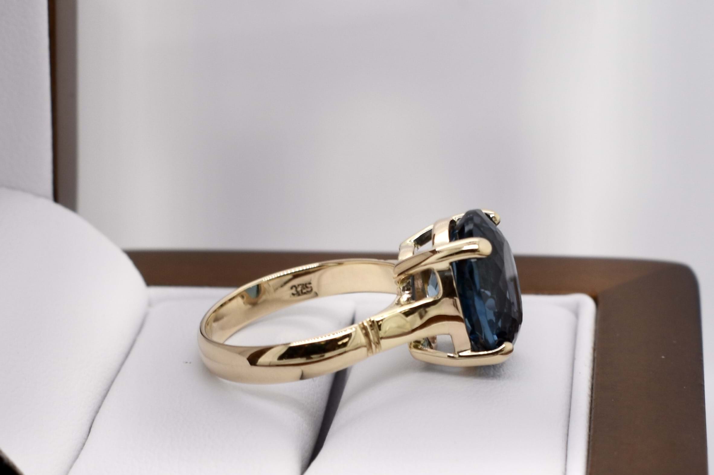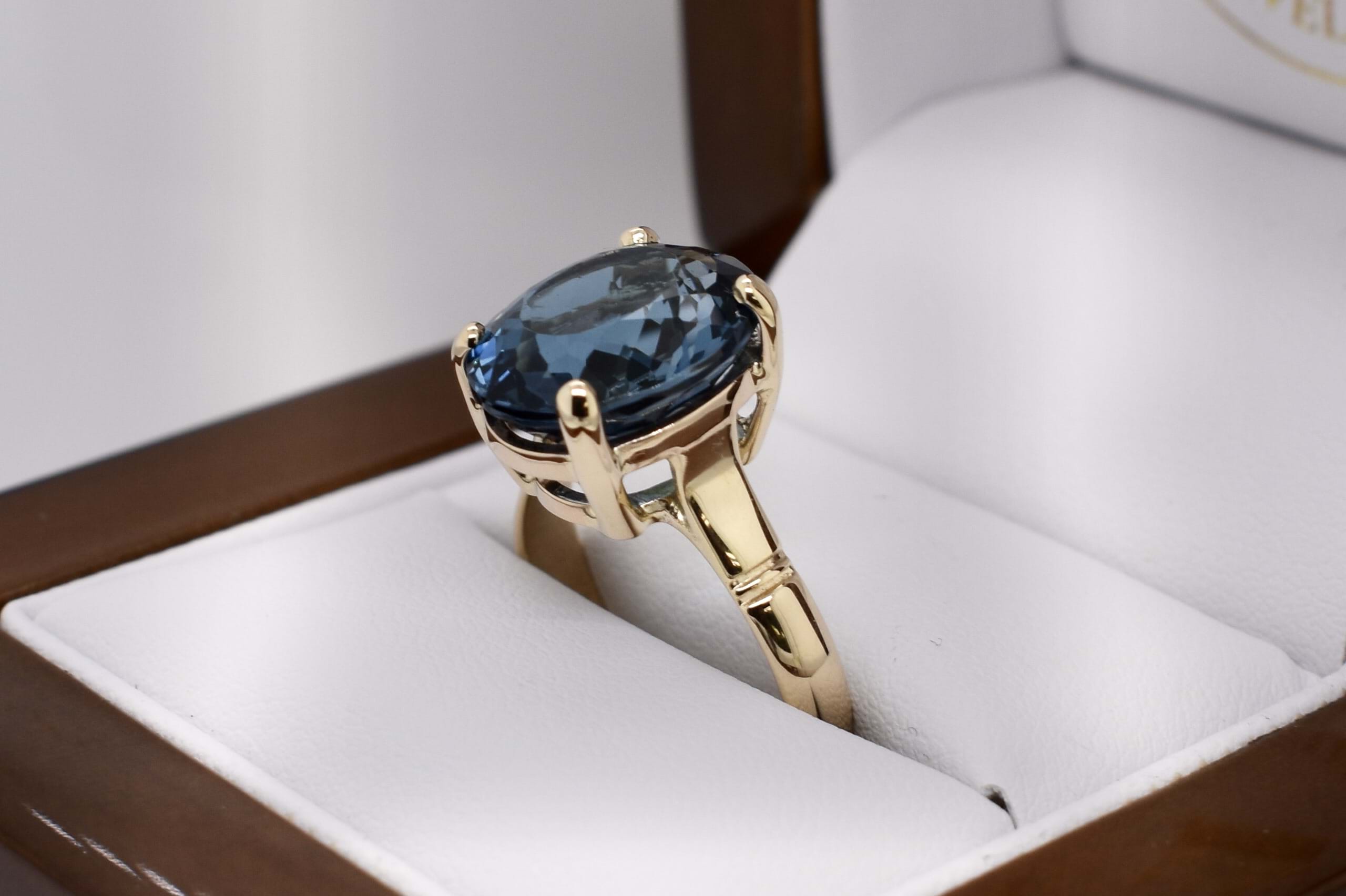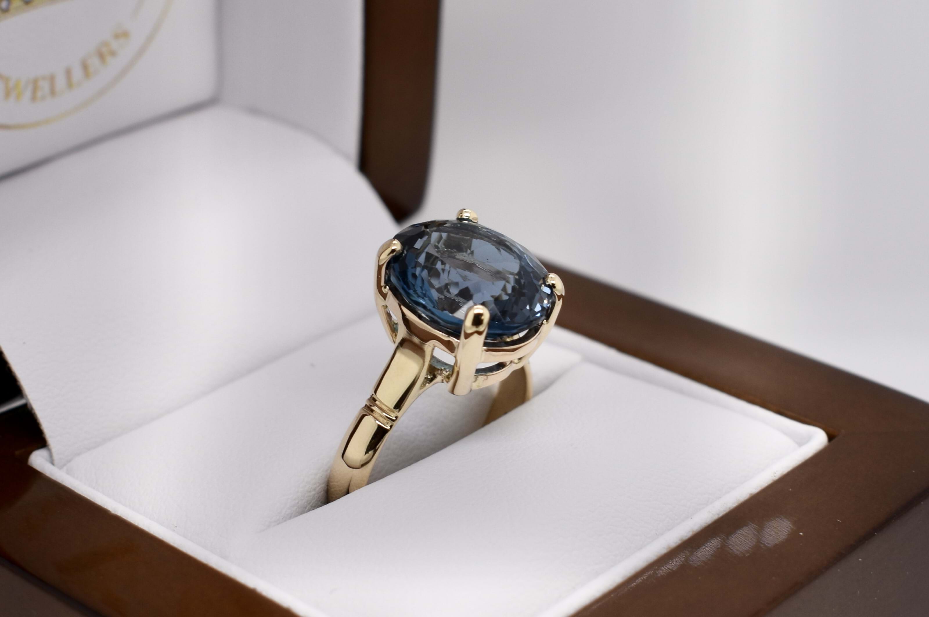 Crafted in 9ct yellow gold, a beautiful oval london blue topaz, measuring 12.7x10.7mm. Four claw set and finished with a plain gold band. Finger size M.