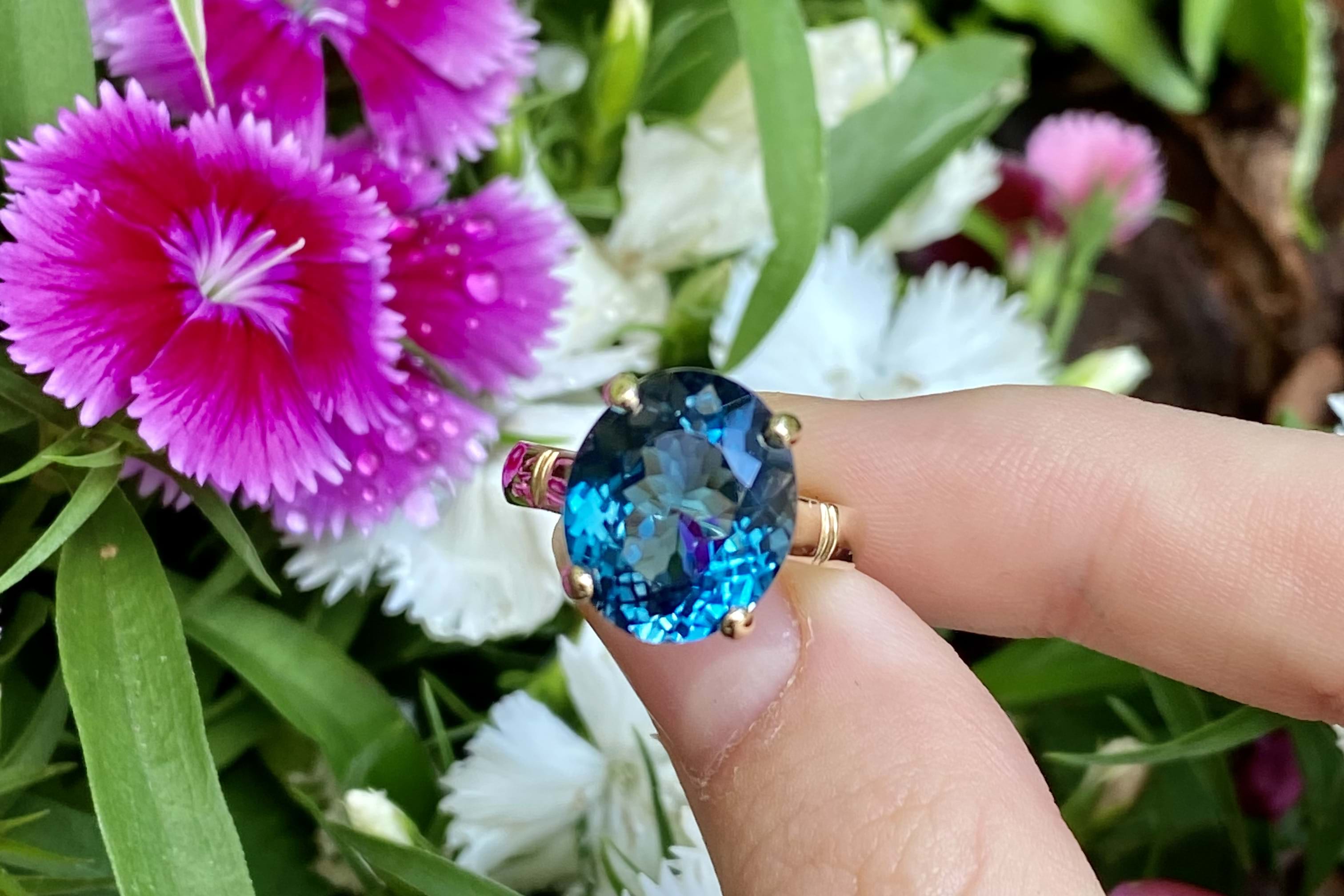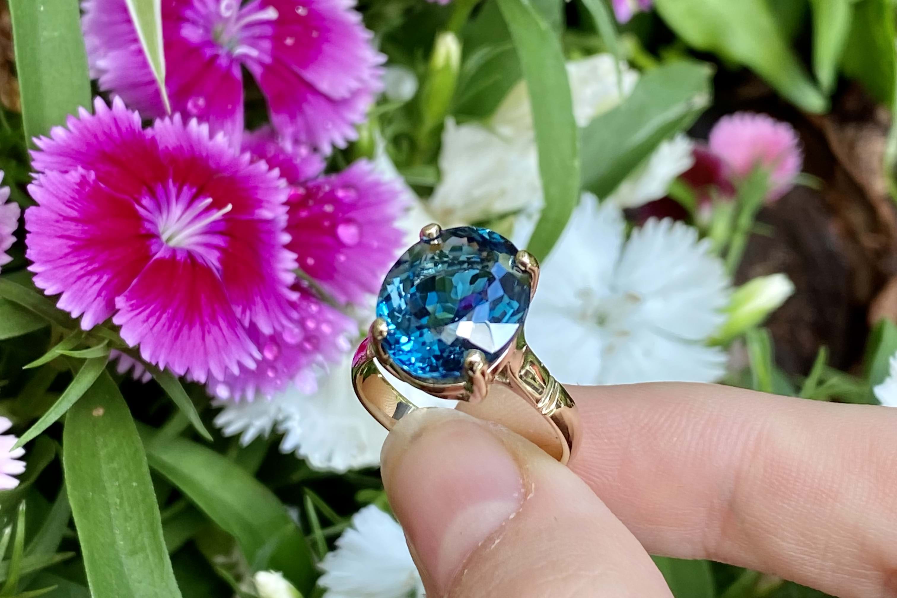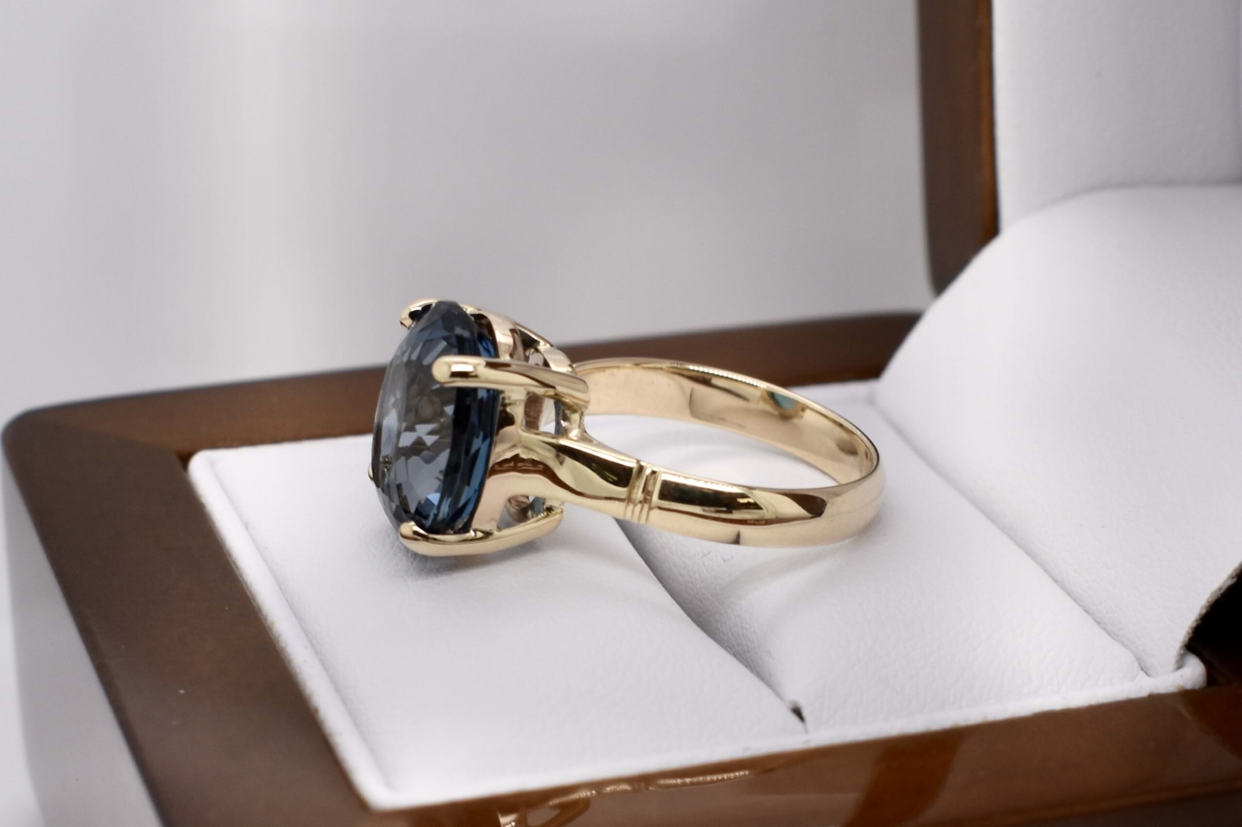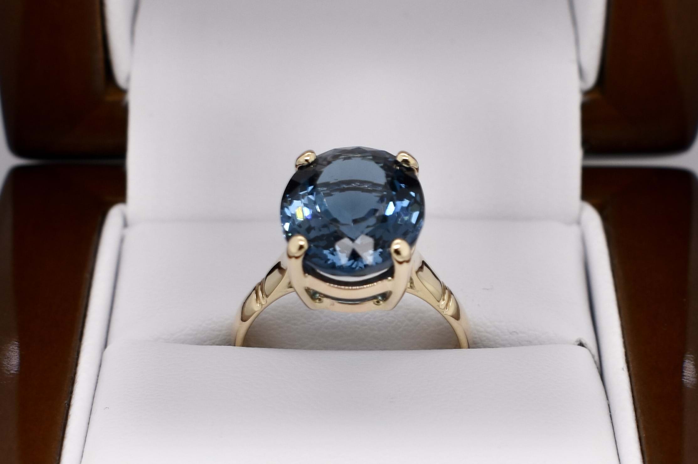 Crafted in 9ct yellow gold, a beautiful oval london blue topaz, measuring 12.7x10.7mm. Four claw set and finished with a plain gold band. Finger size M.
