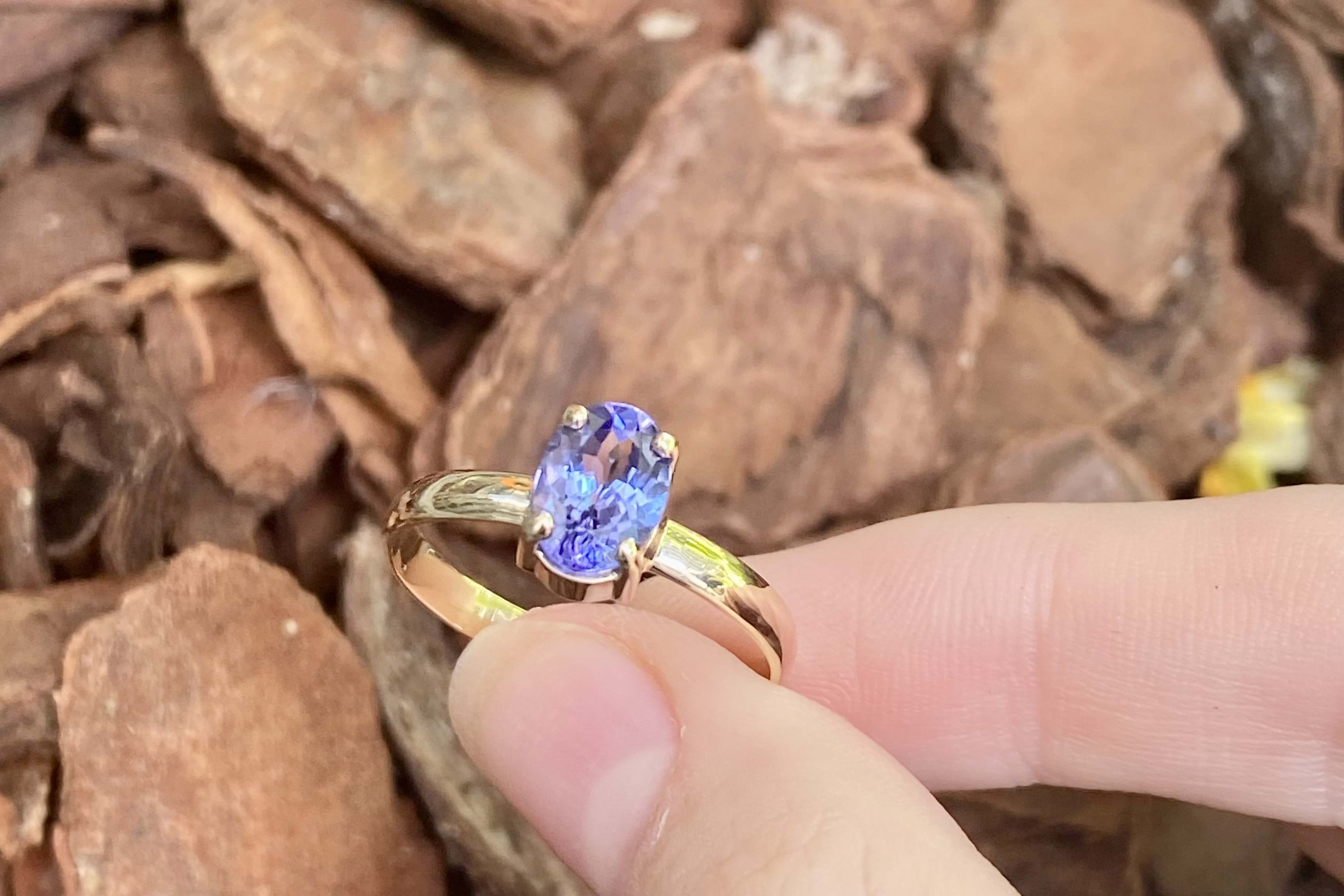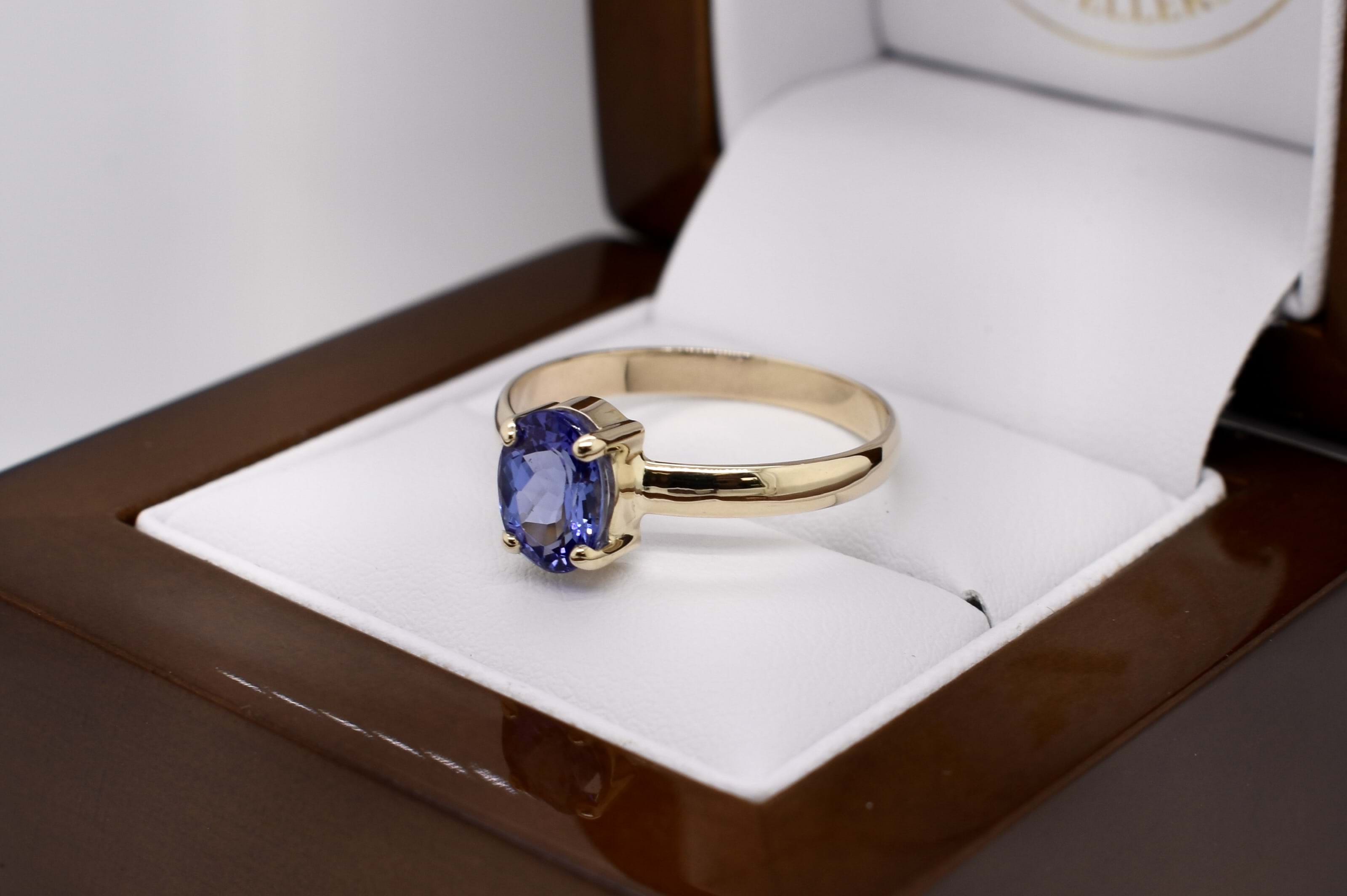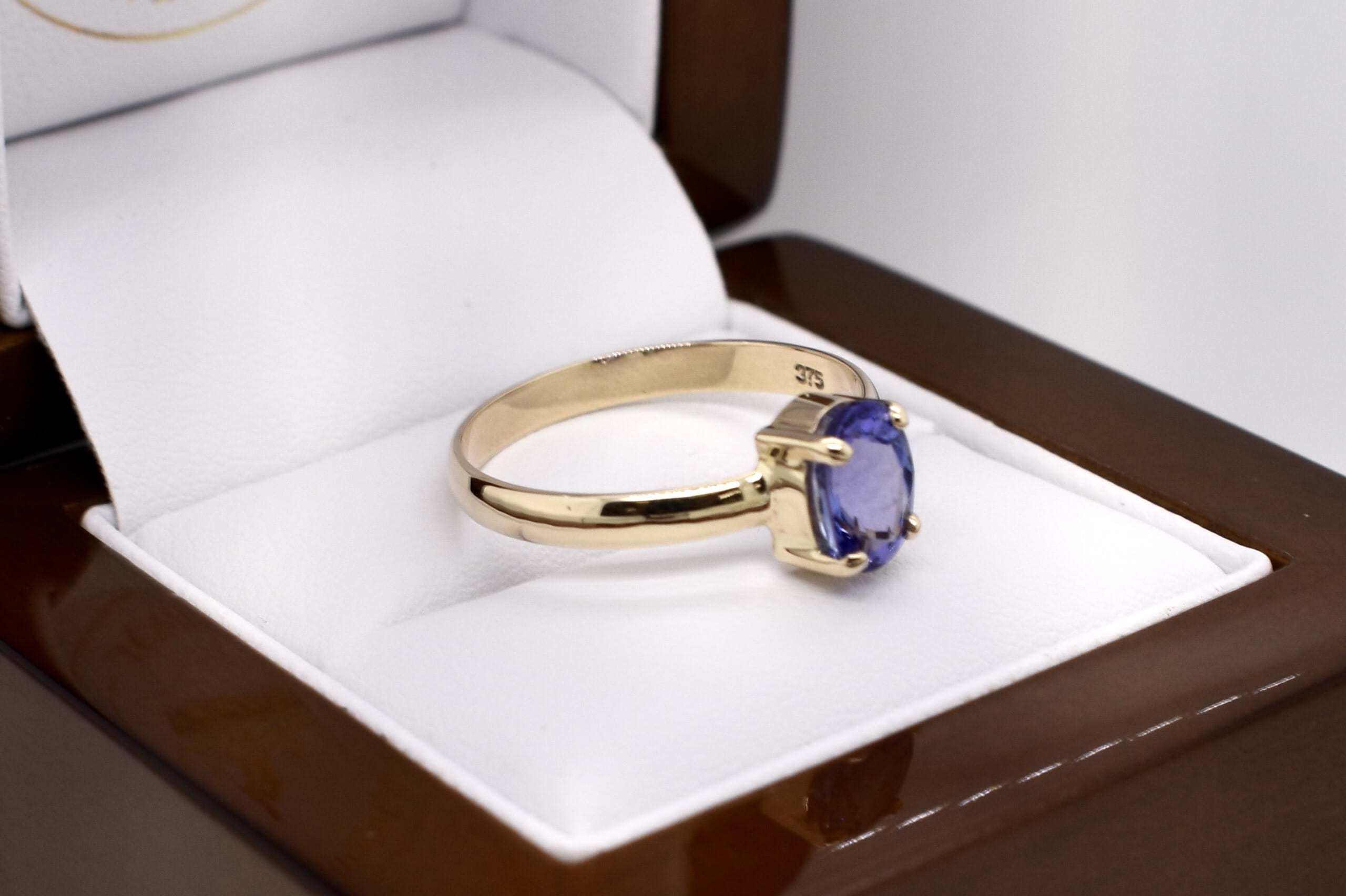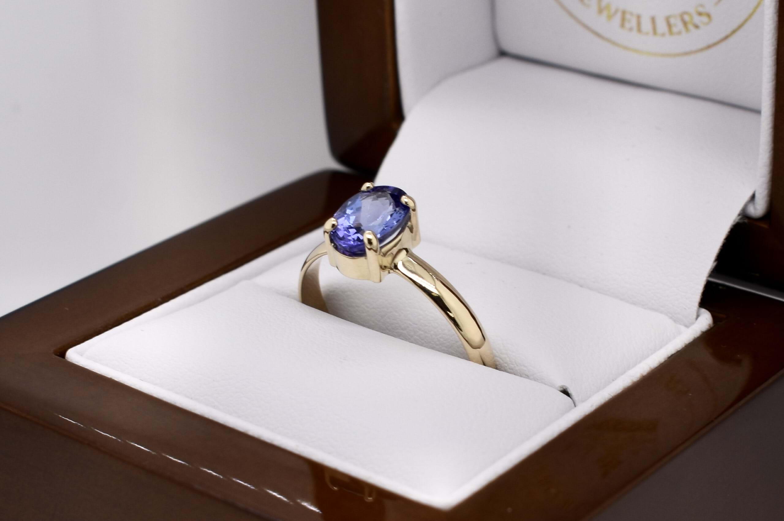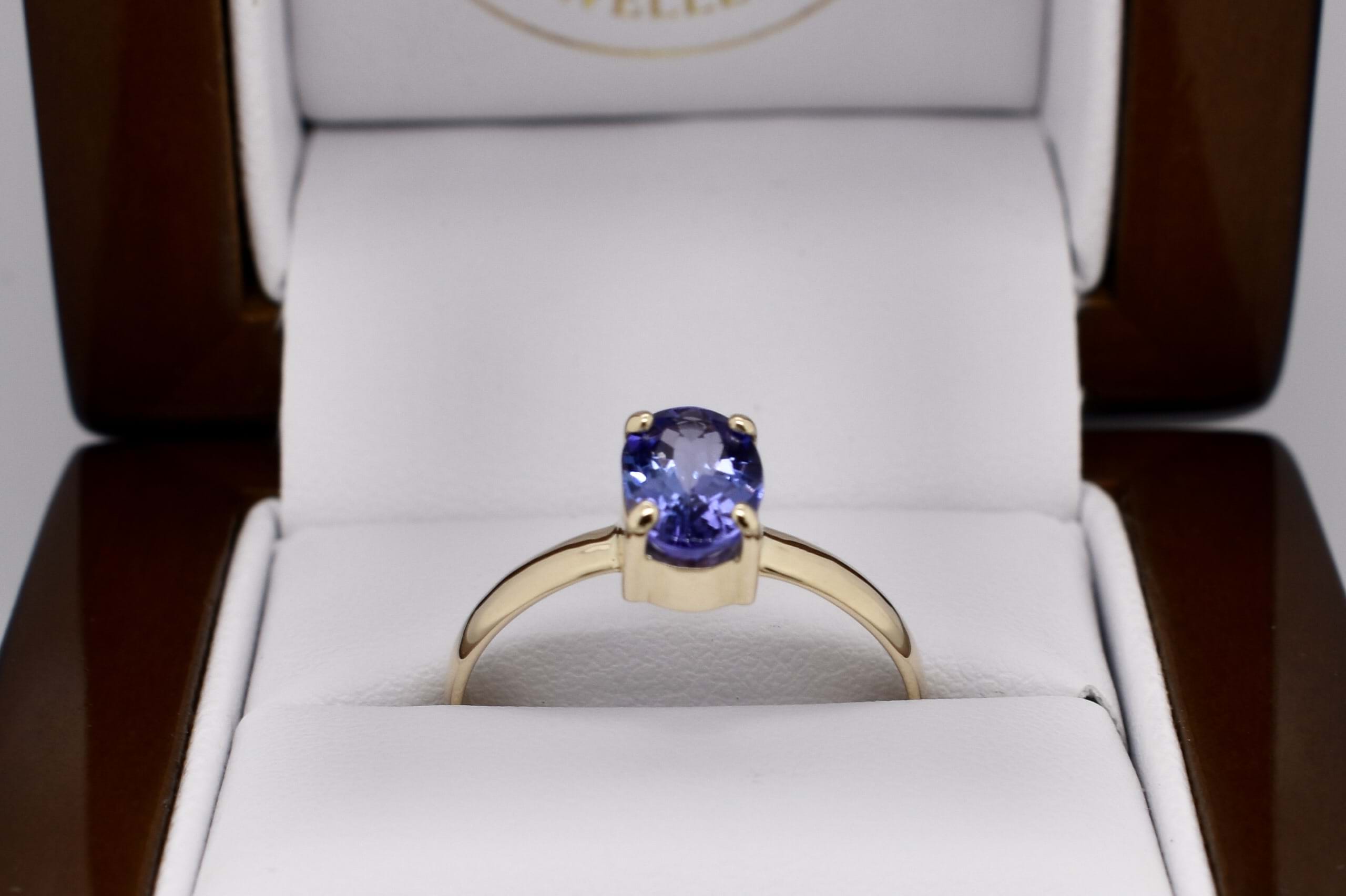 Crafted in 9ct yellow gold, one oval tanzanite, four claw, measuring 8.3x5.9mm. Finished with a plain gold band. Finger size S+.